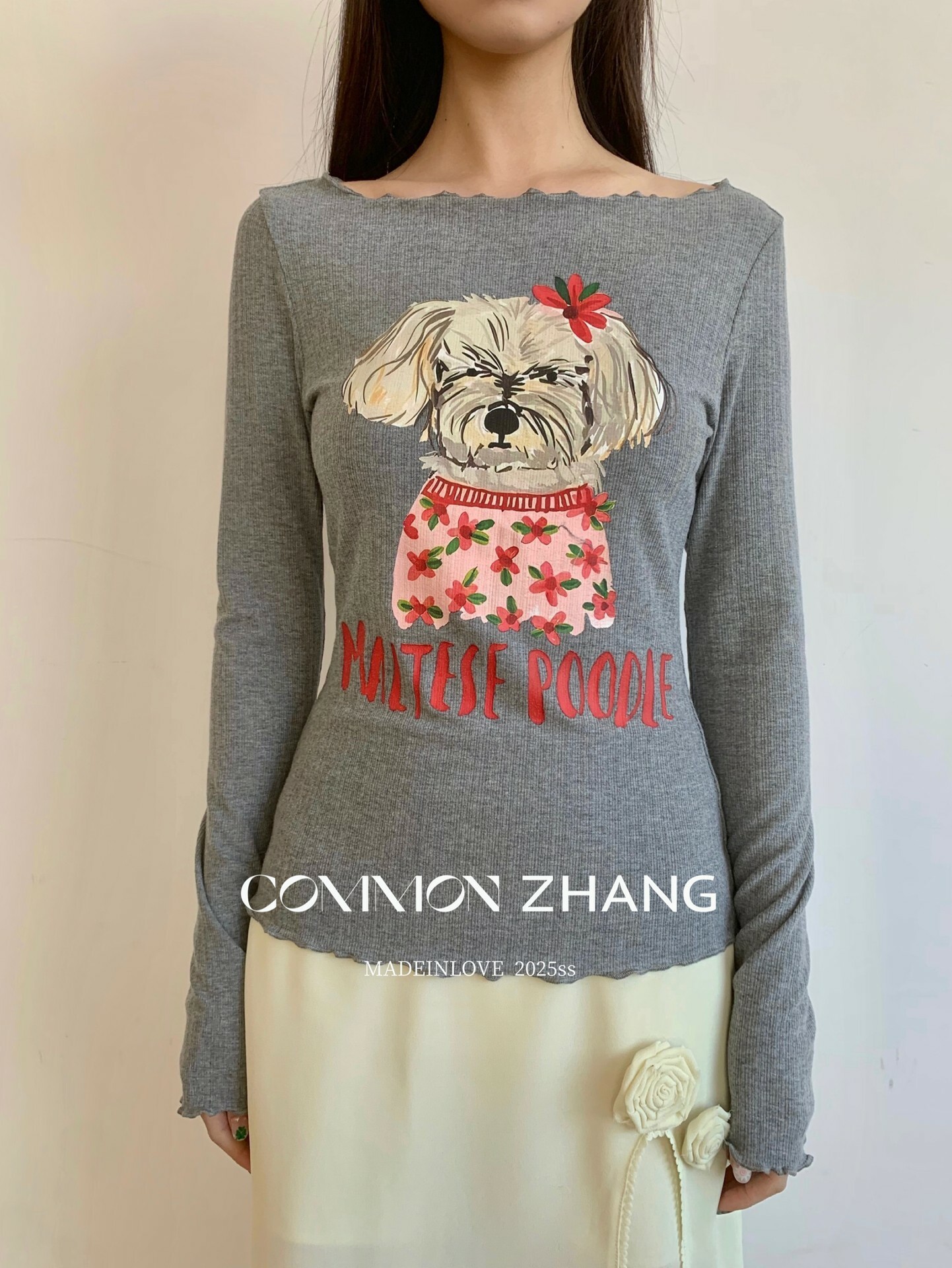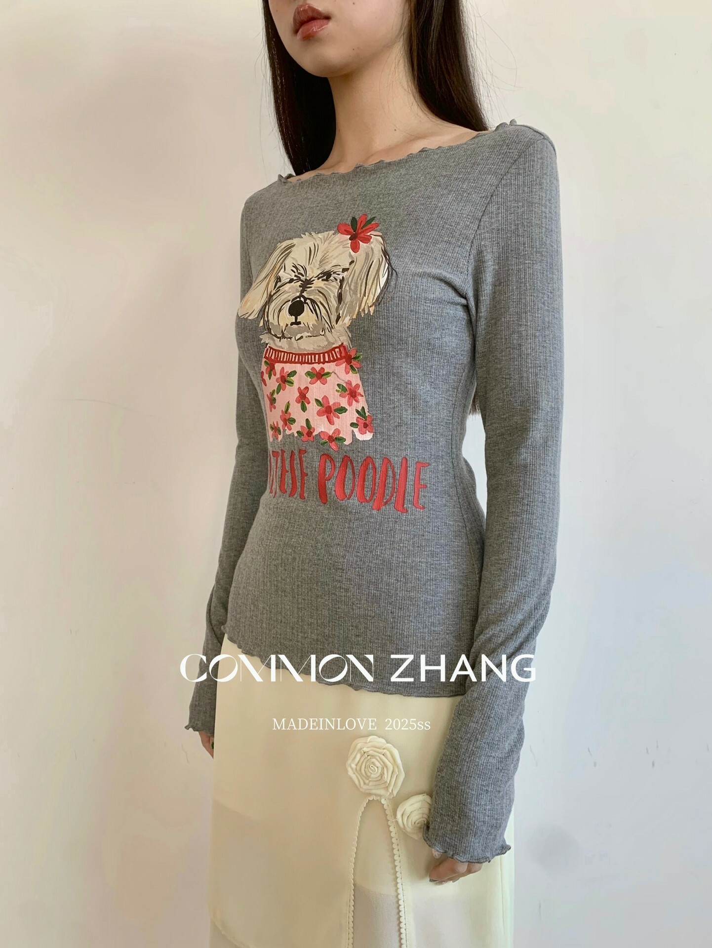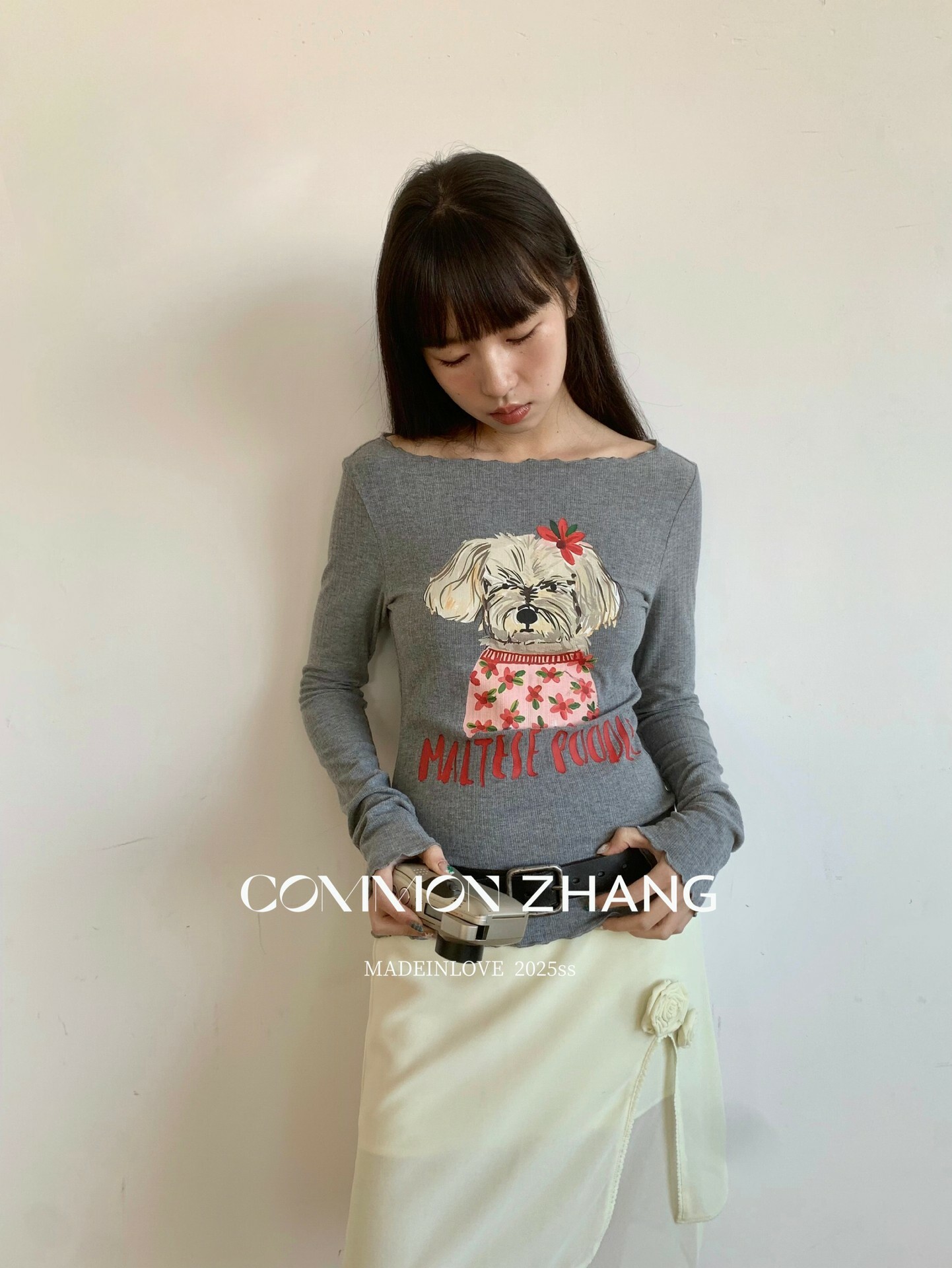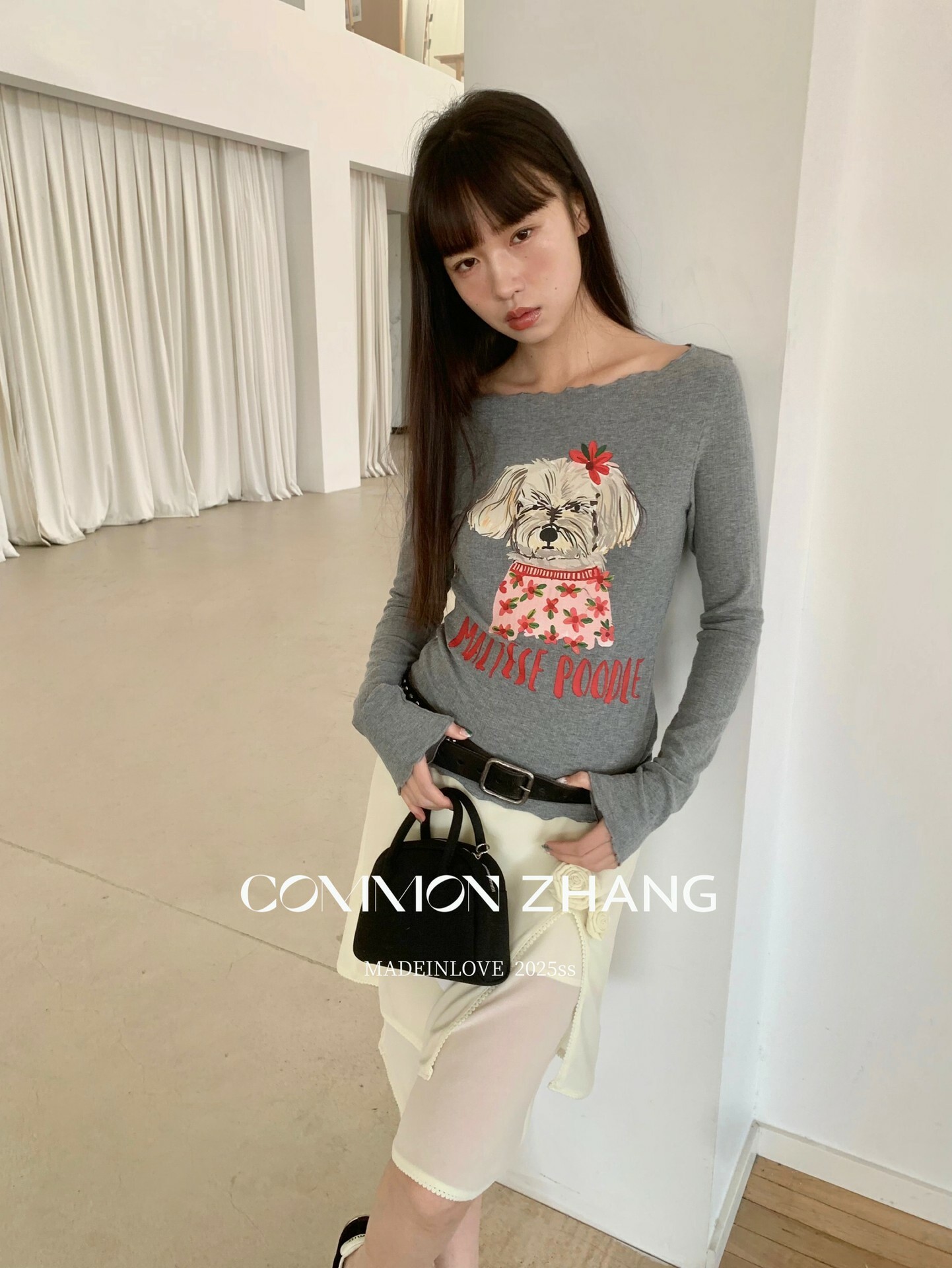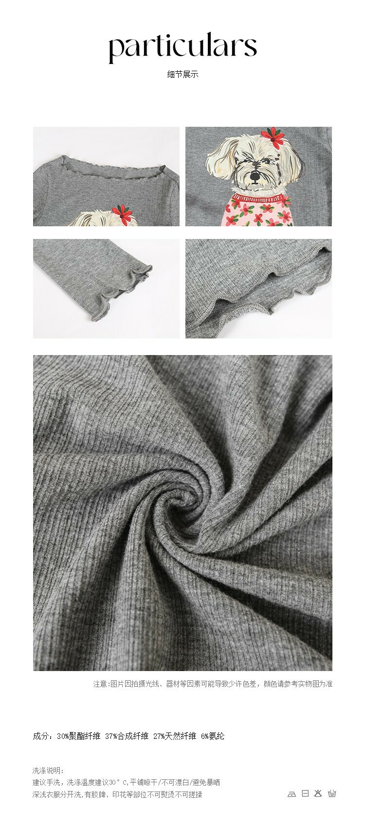 *o-ha-you*【FCZ100011】可愛少女感字母小狗印花木耳邊圓領修身顯瘦長袖T恤-2色-如有需要請先諮詢