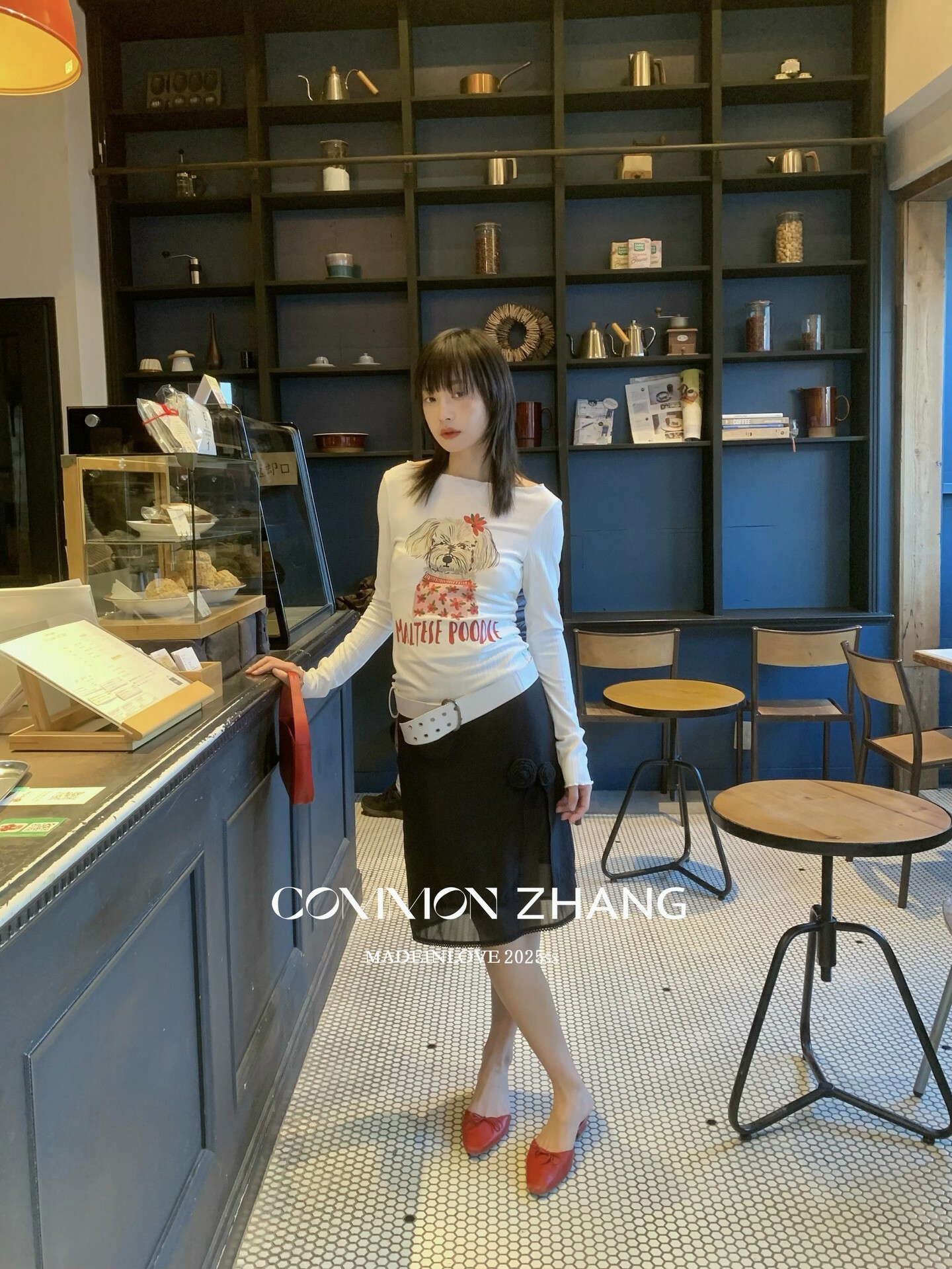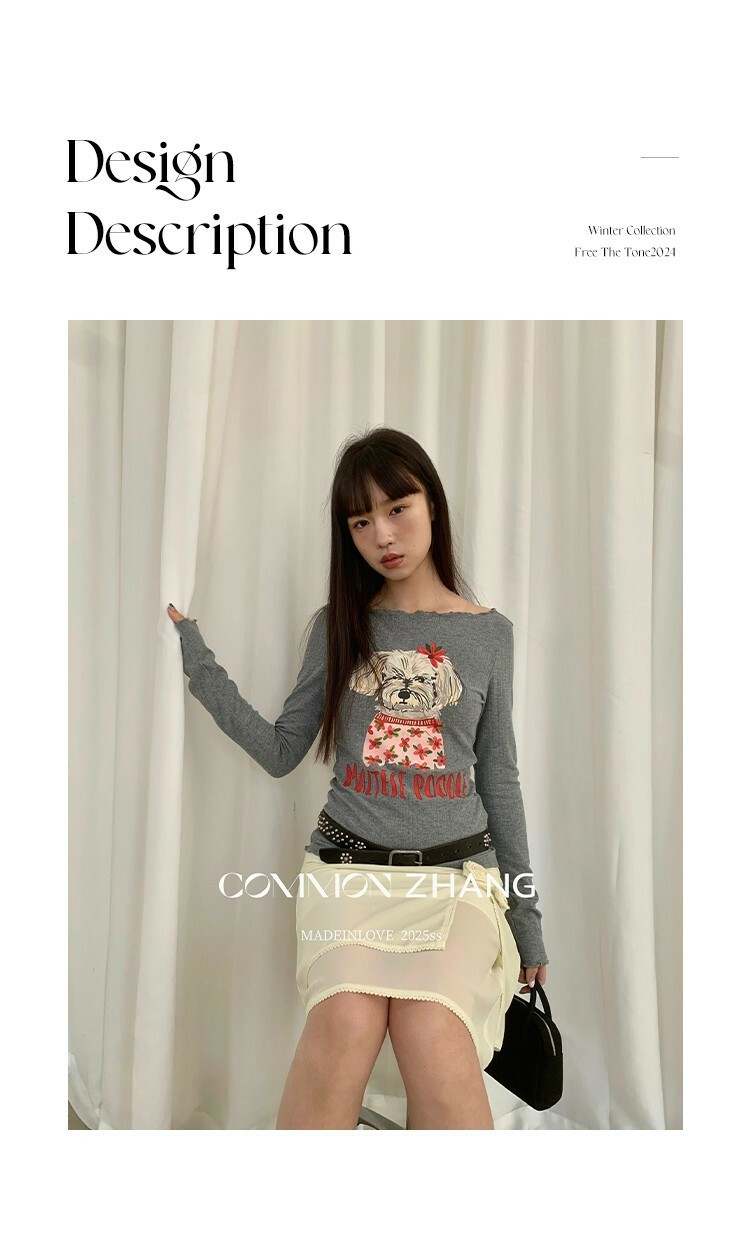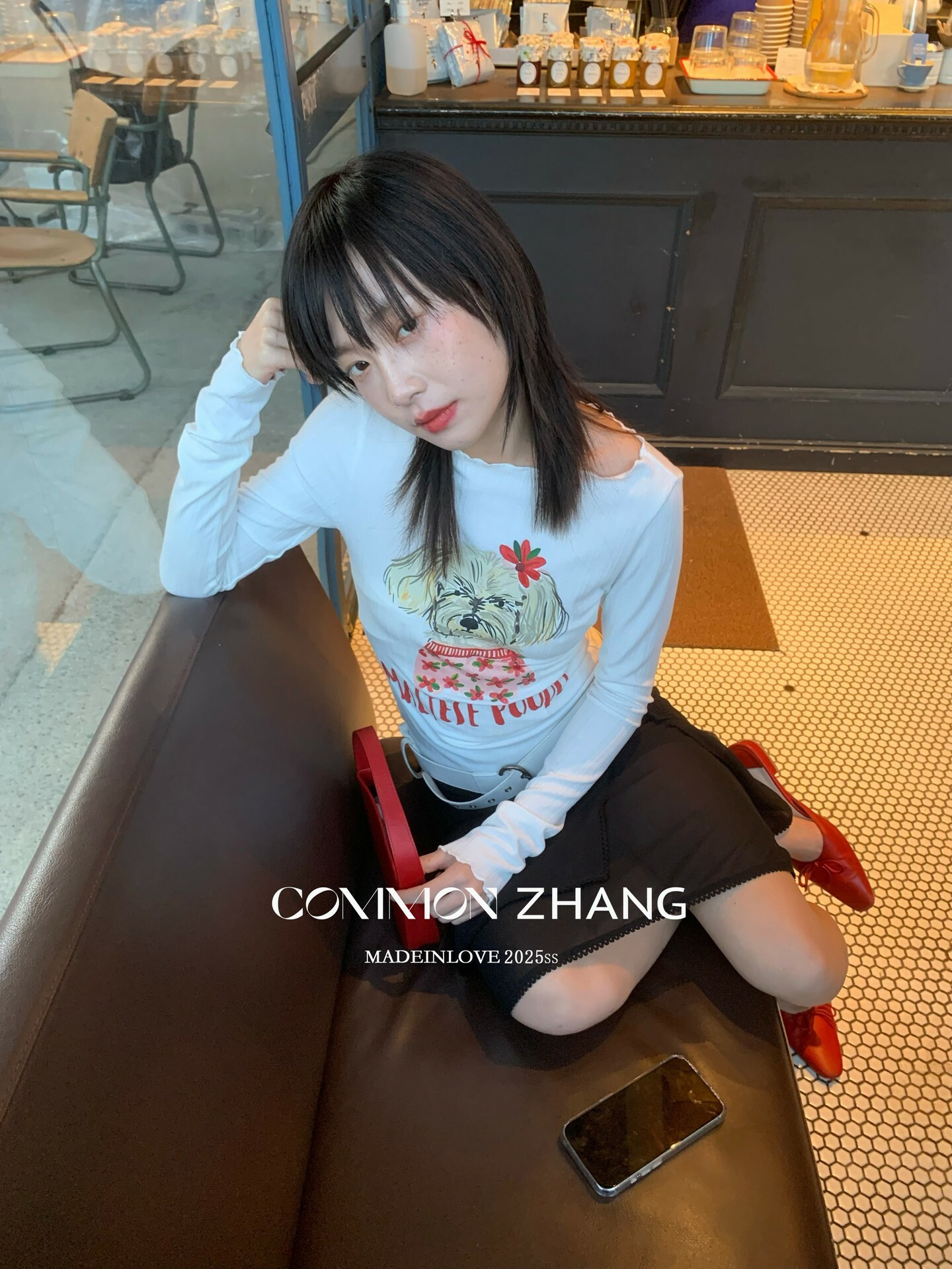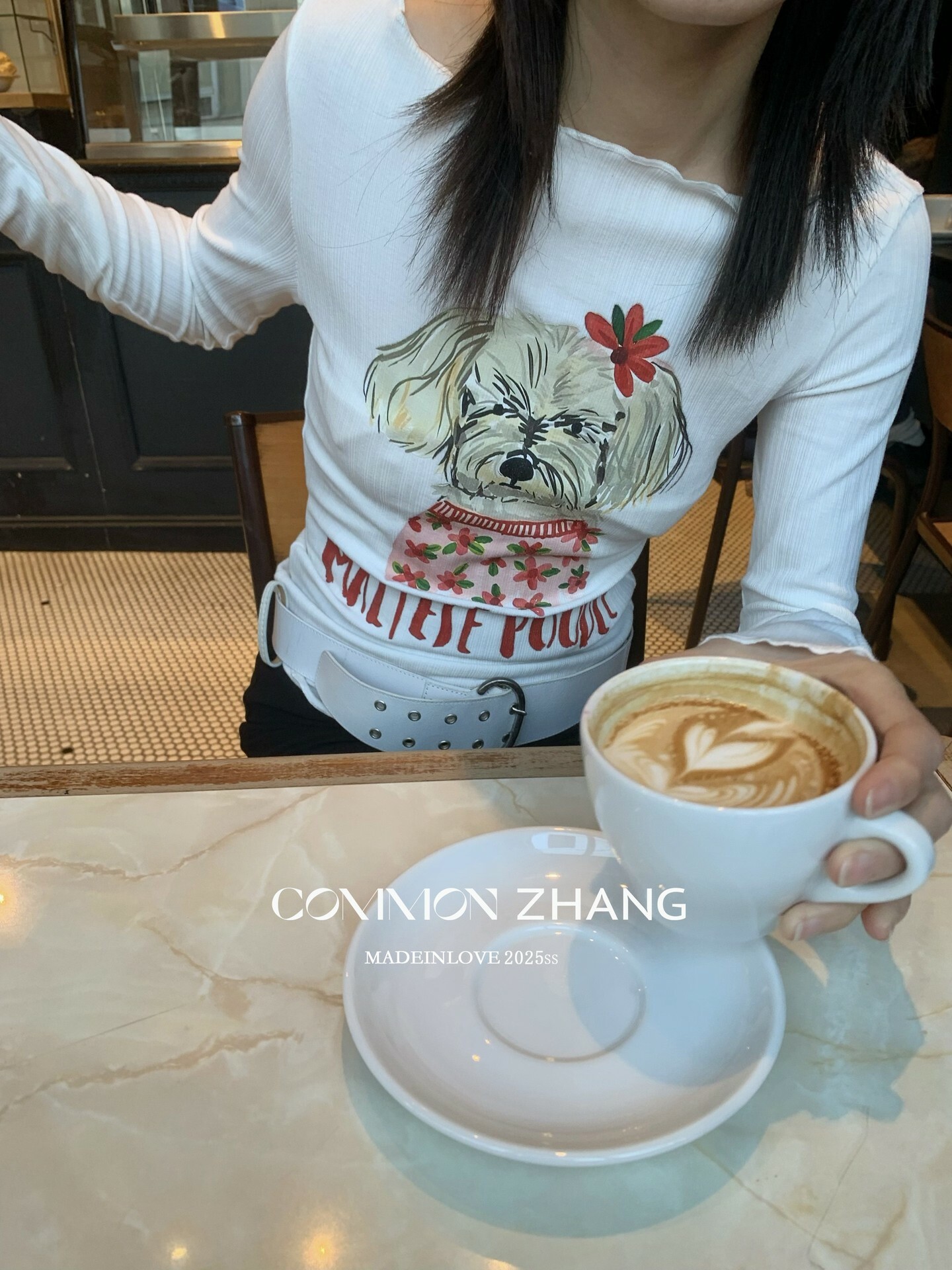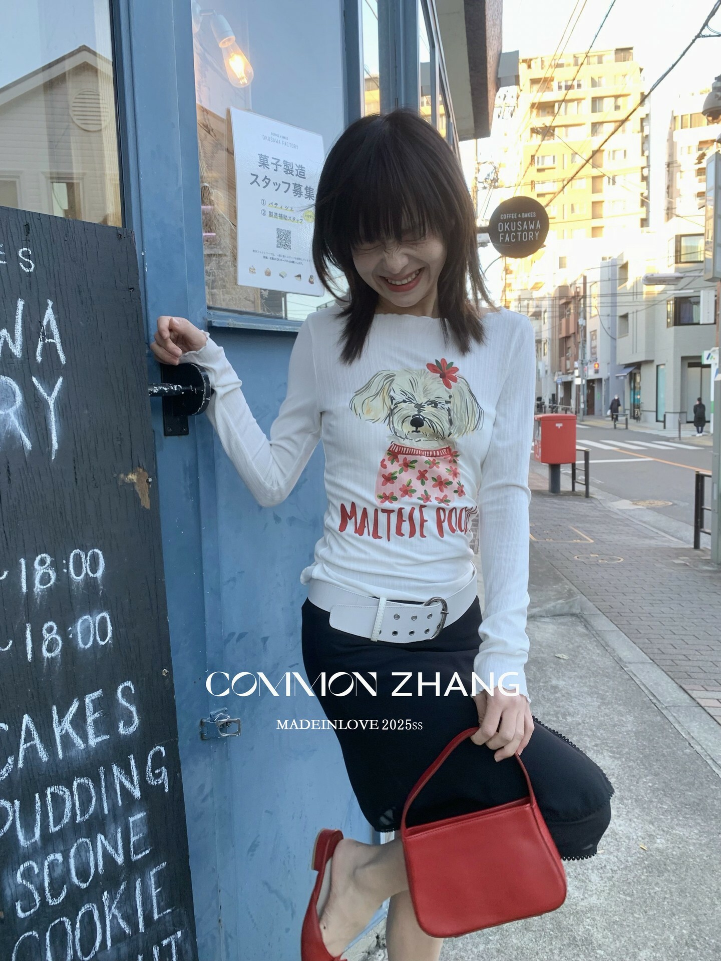 *o-ha-you*【FCZ100011】可愛少女感字母小狗印花木耳邊圓領修身顯瘦長袖T恤-2色-如有需要請先諮詢