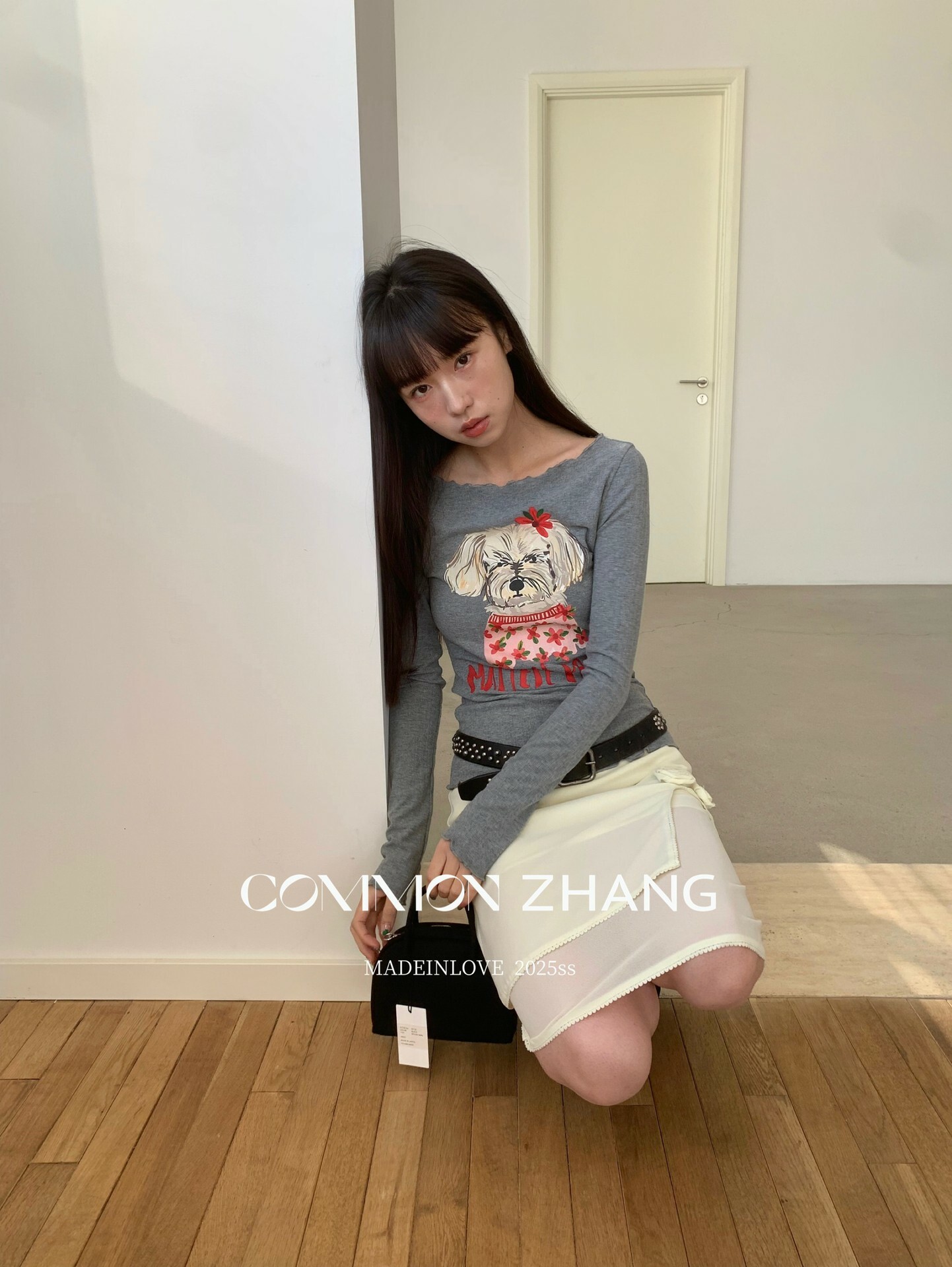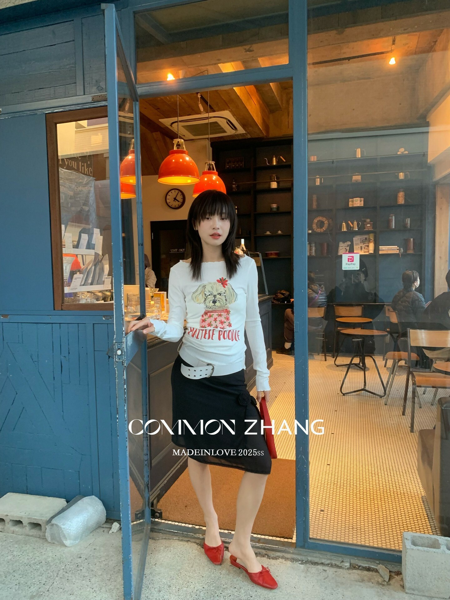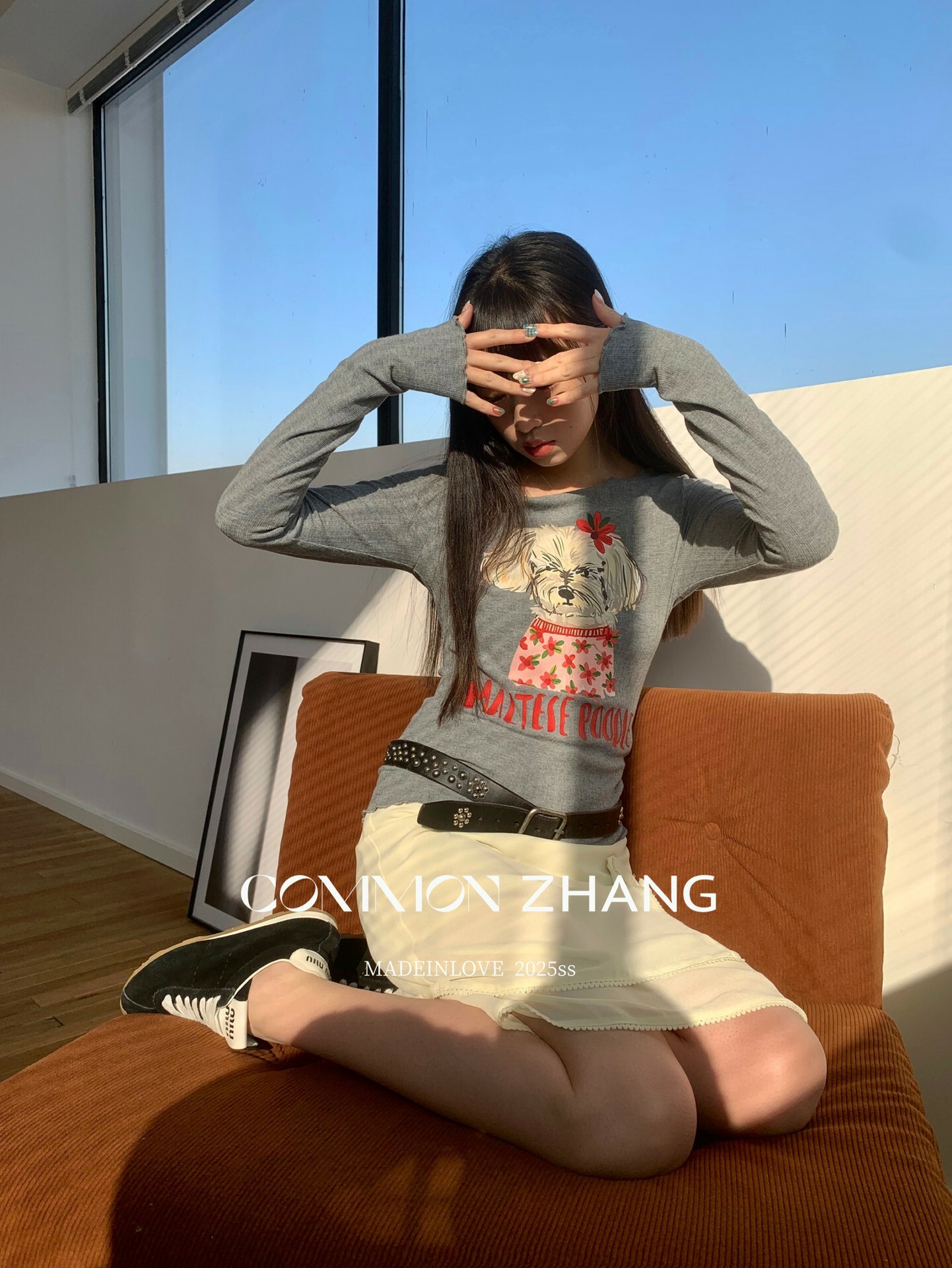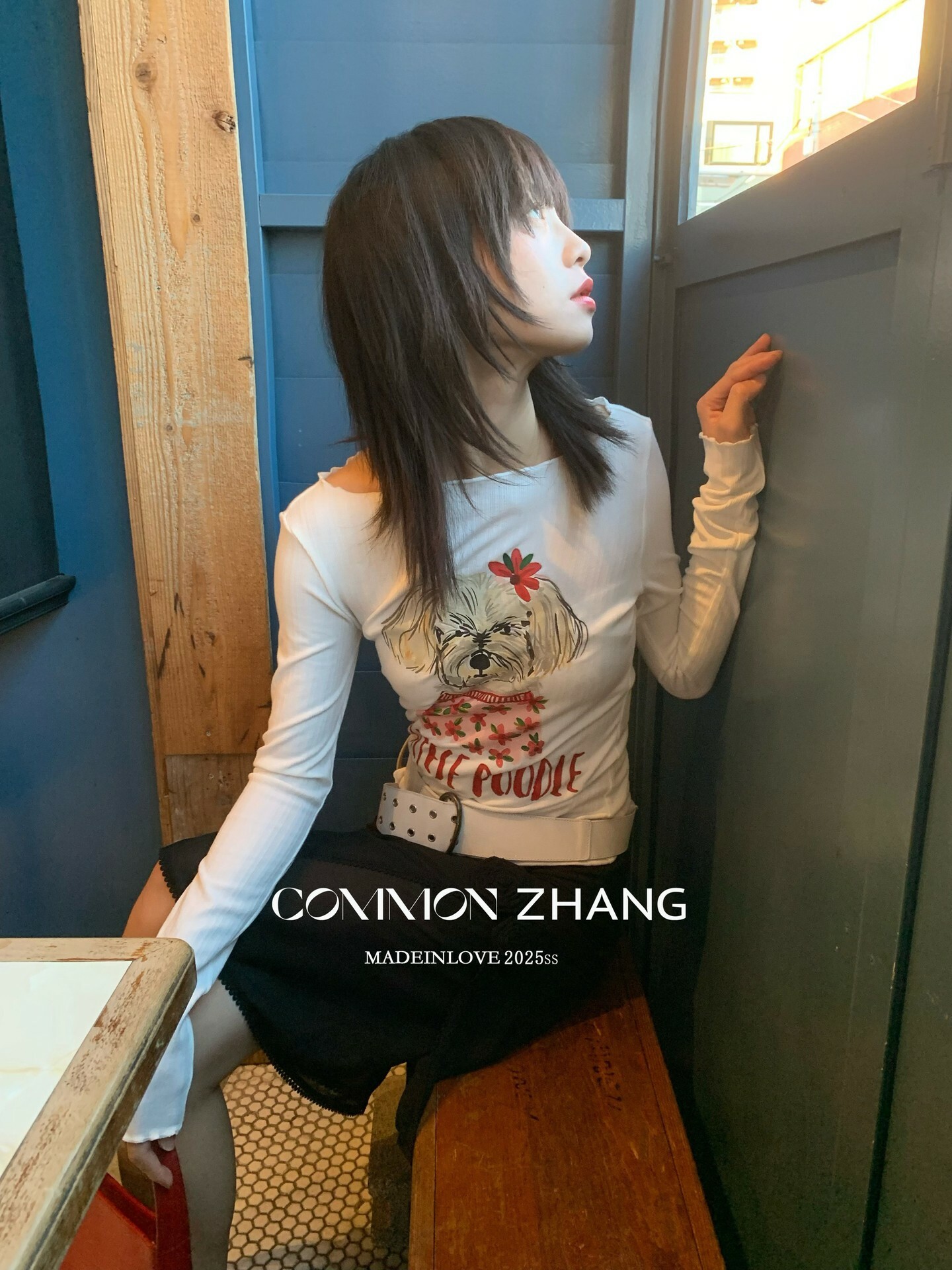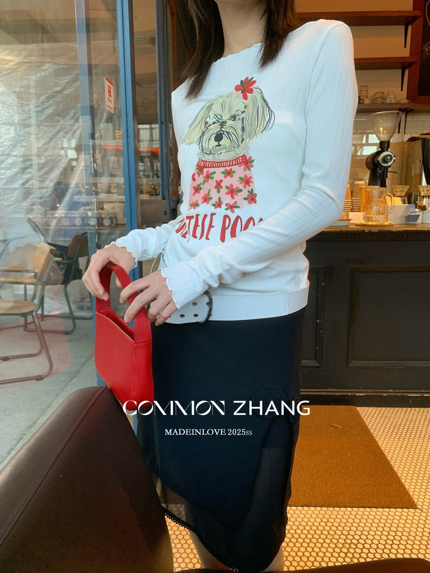 *o-ha-you*【FCZ100011】可愛少女感字母小狗印花木耳邊圓領修身顯瘦長袖T恤-2色-如有需要請先諮詢
