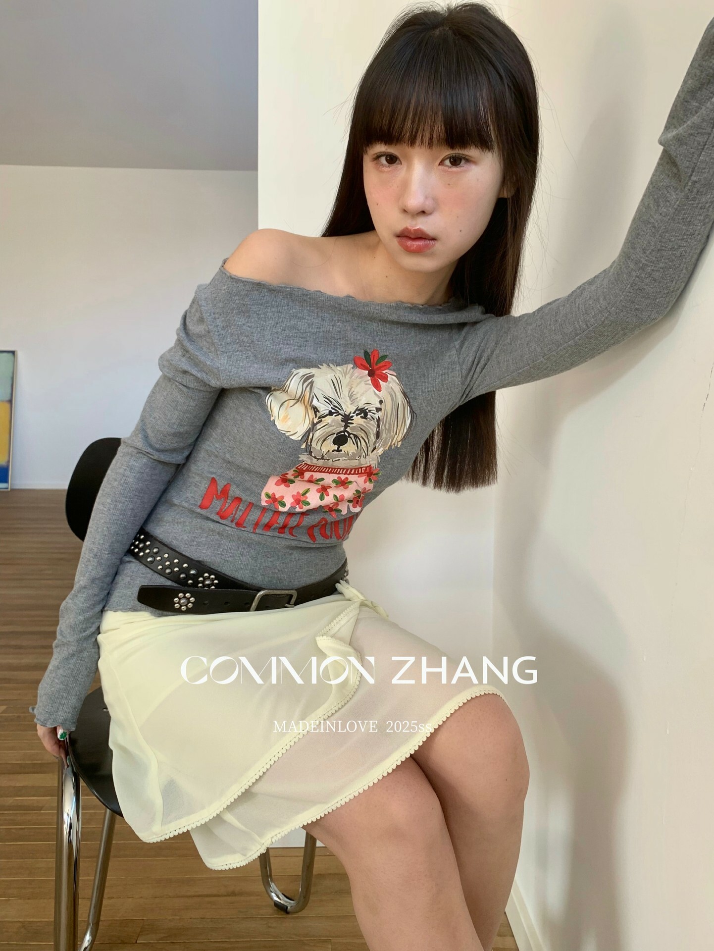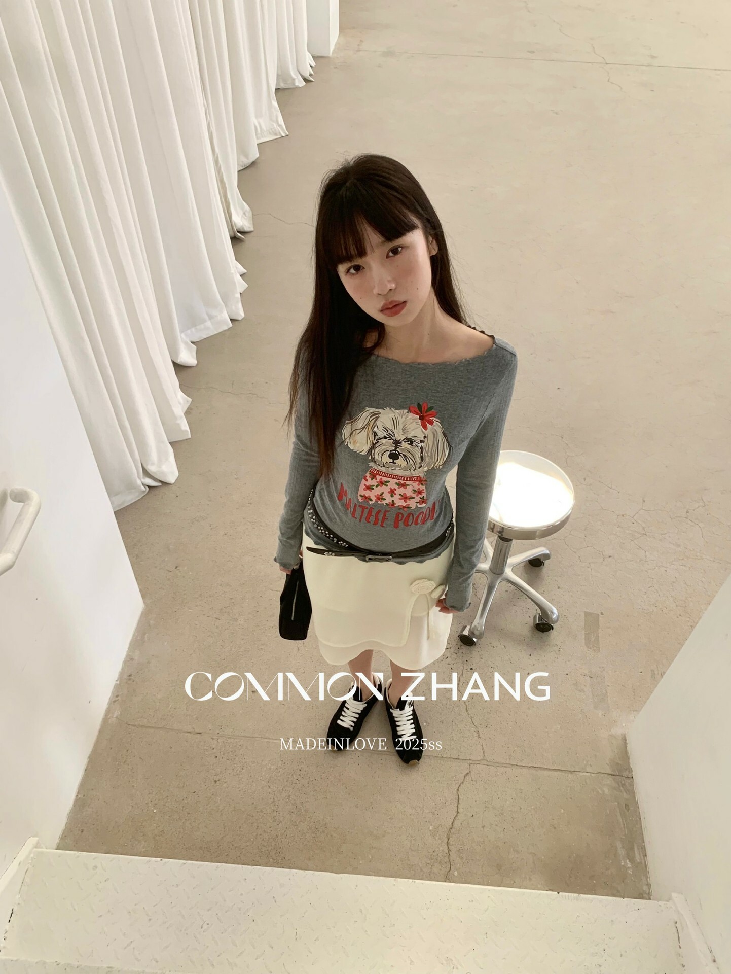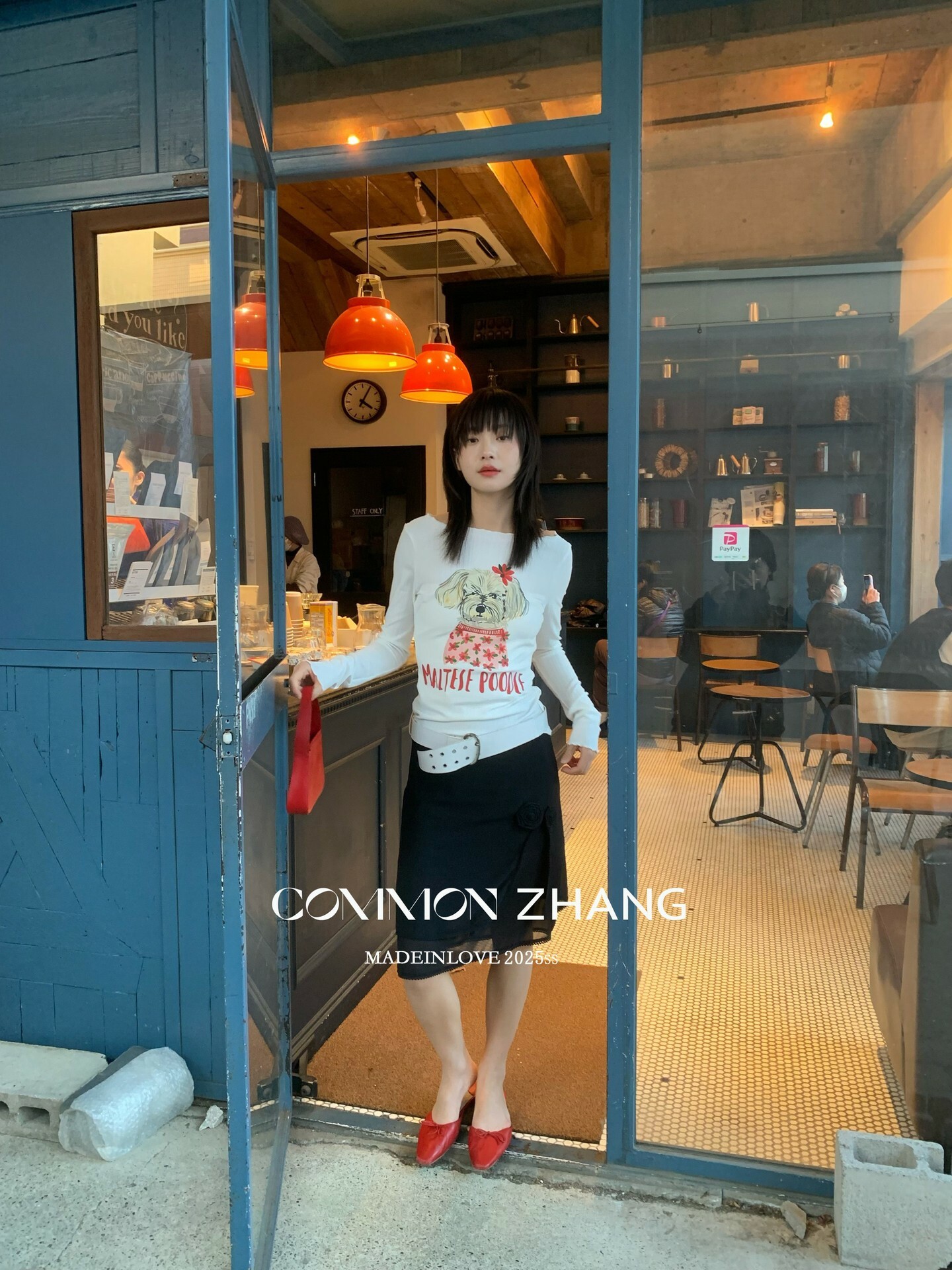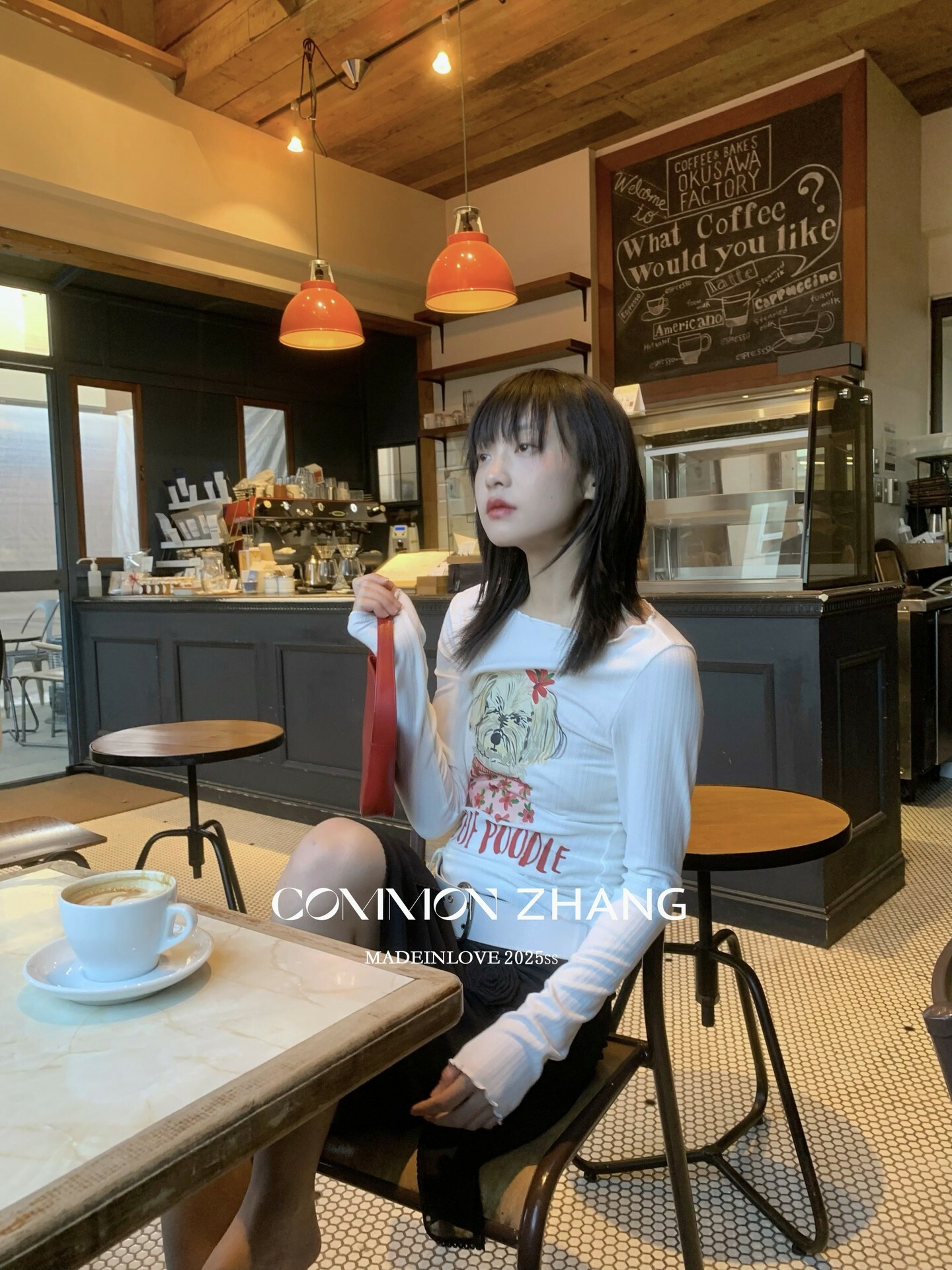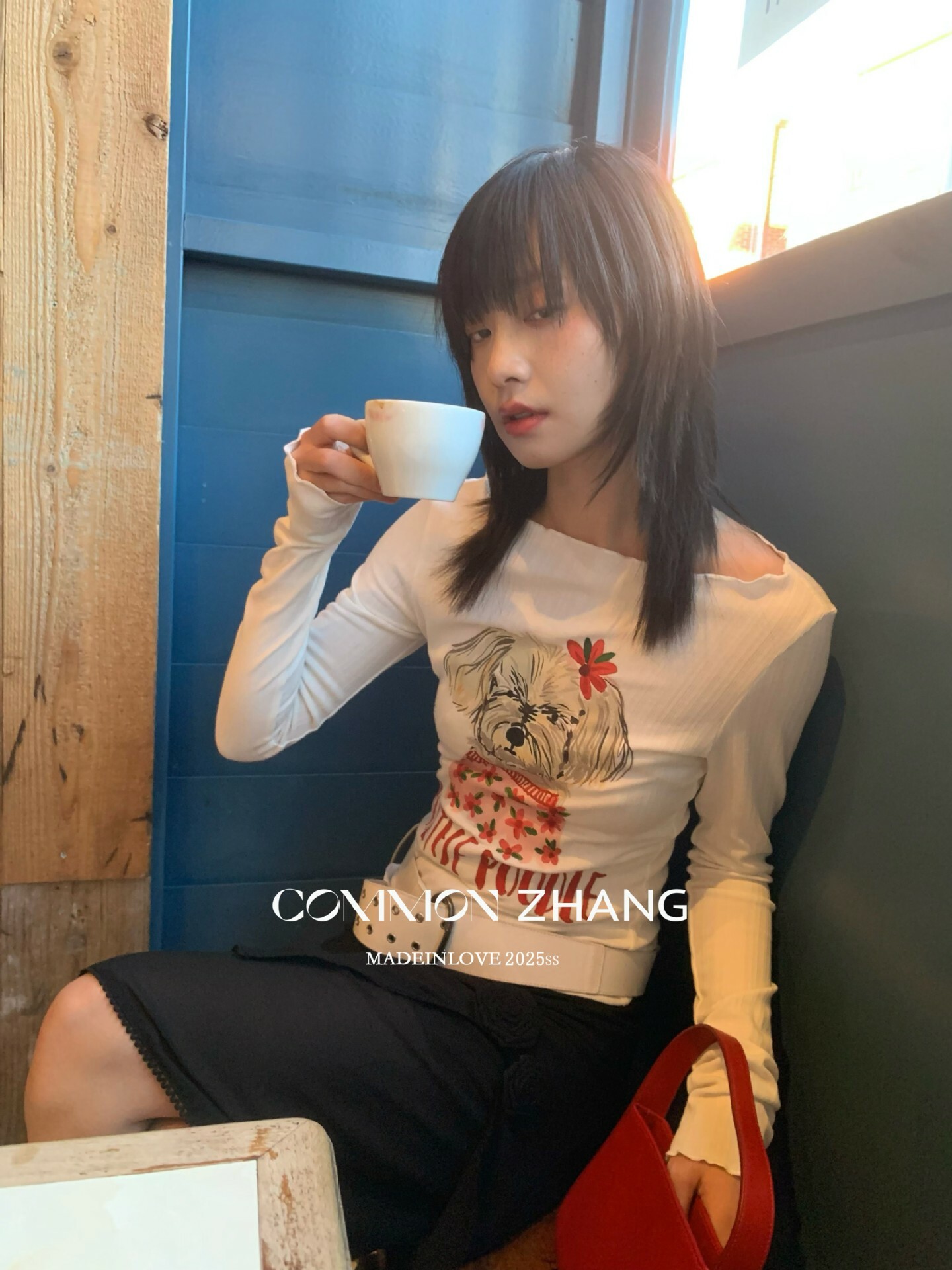 *o-ha-you*【FCZ100011】可愛少女感字母小狗印花木耳邊圓領修身顯瘦長袖T恤-2色-如有需要請先諮詢