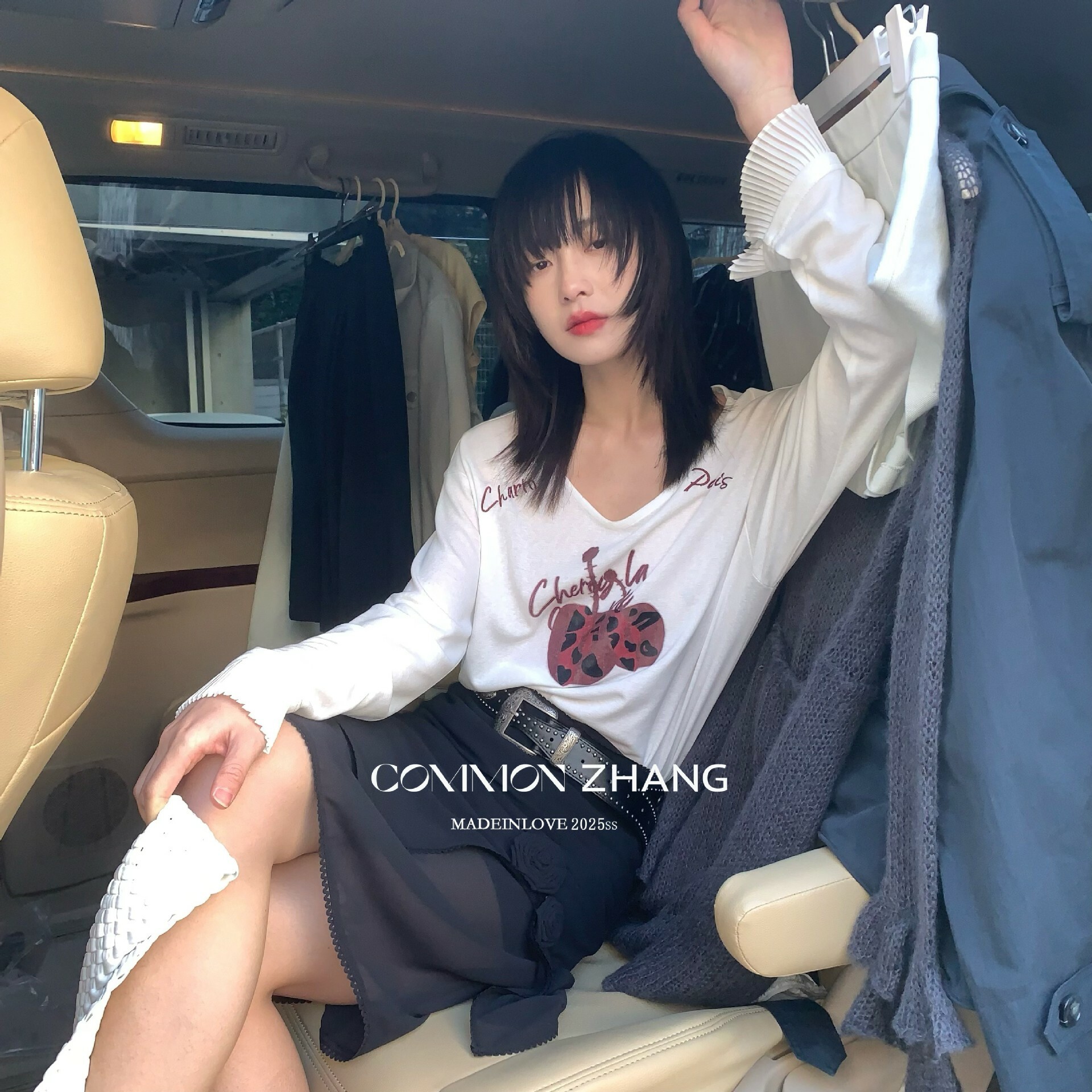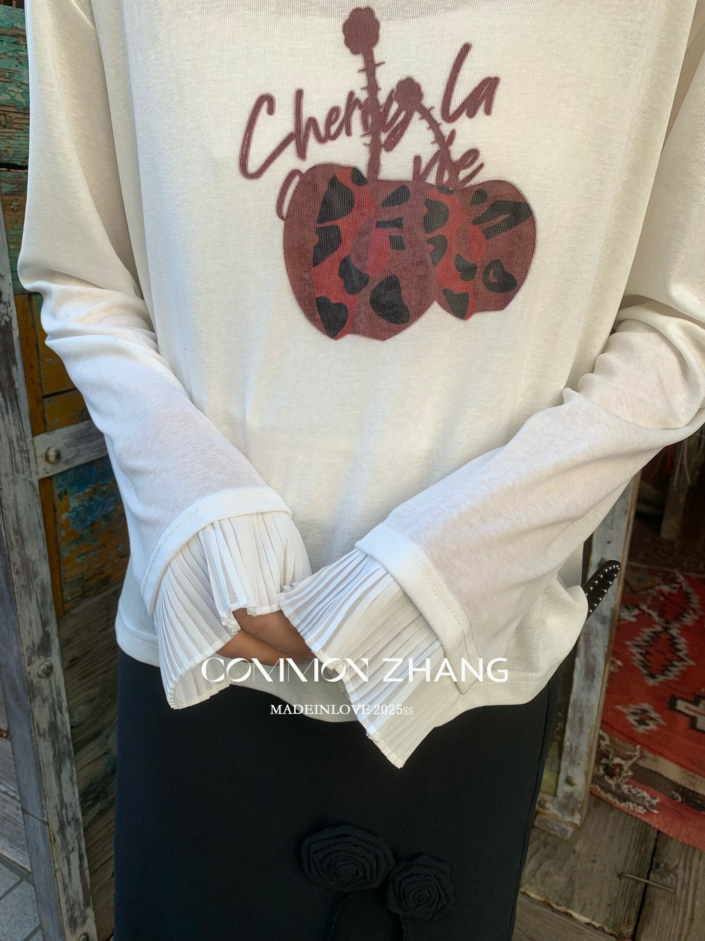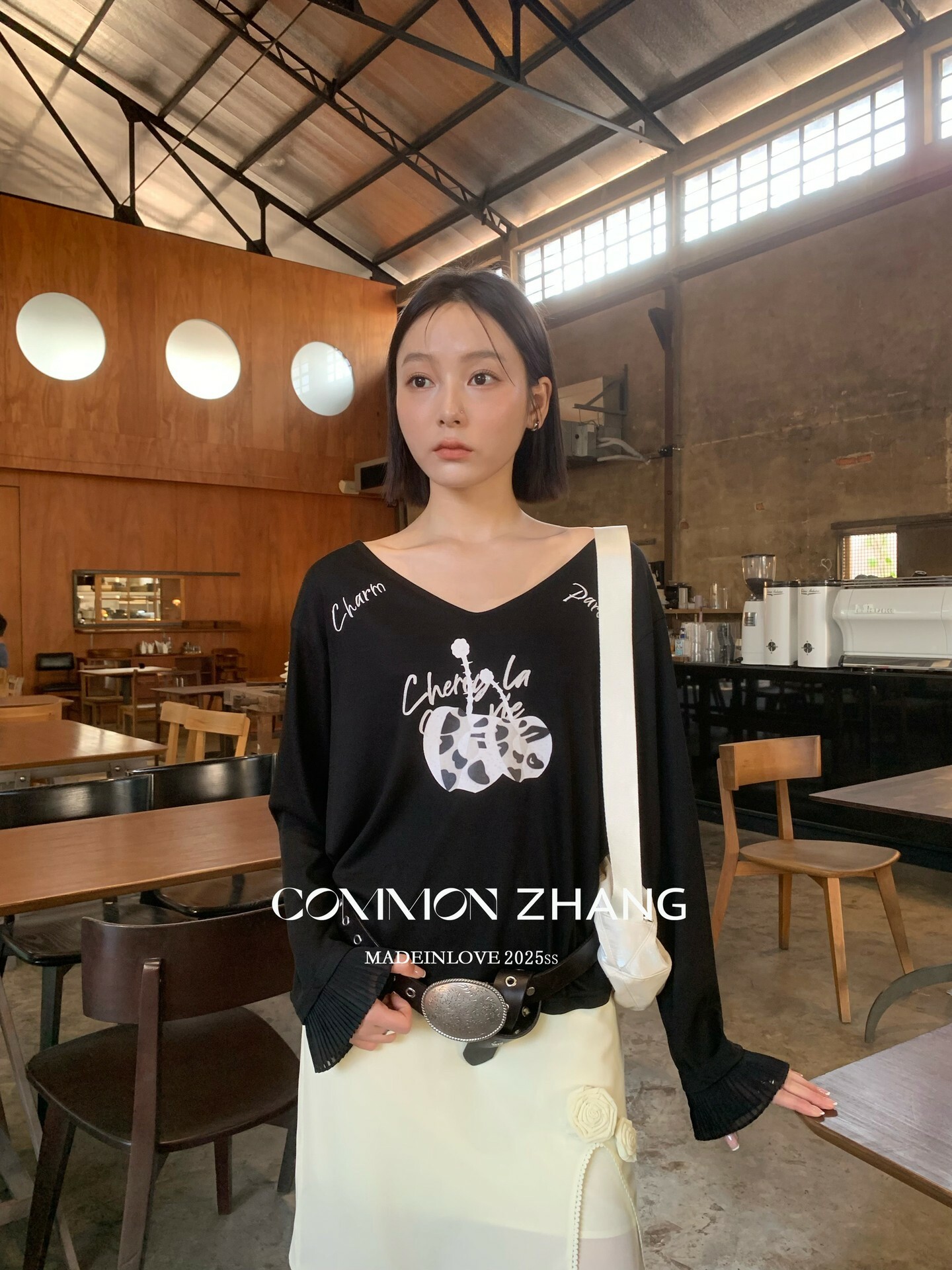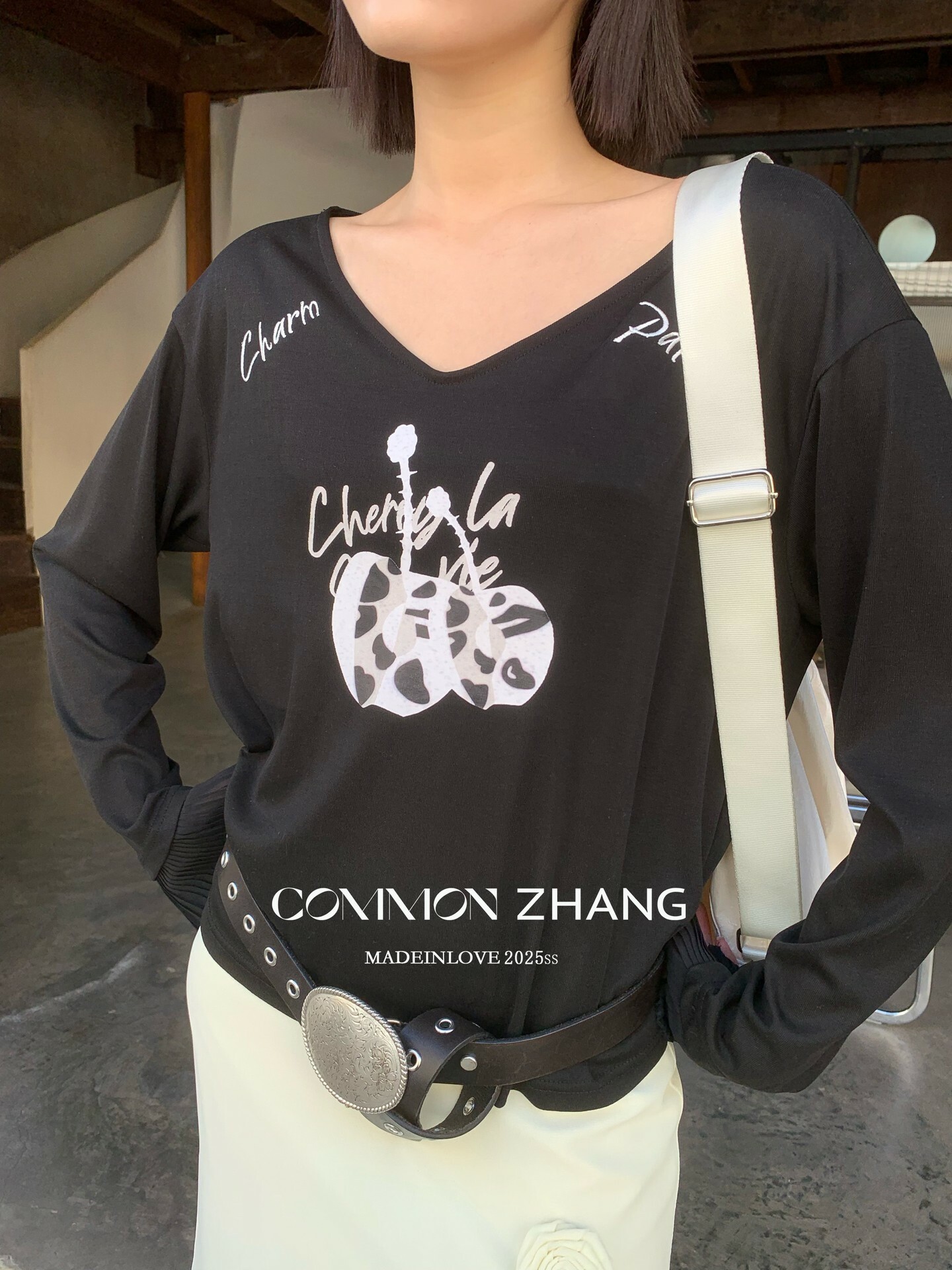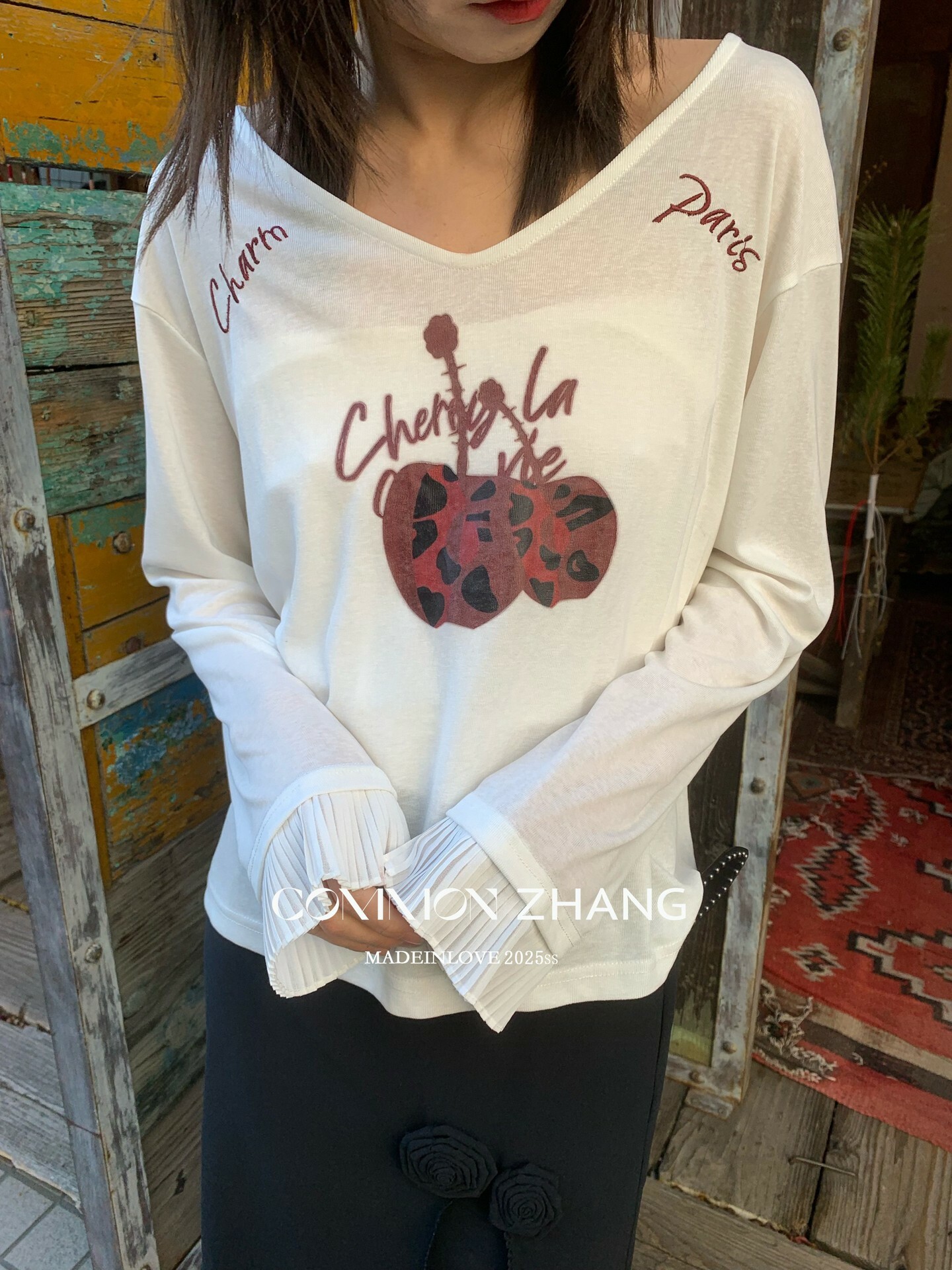 *o-ha-you*【FCZ100240】春季新款復古櫻桃字母印花百褶袖天絲寬V領短袖T恤-2色-如有需要請先諮詢