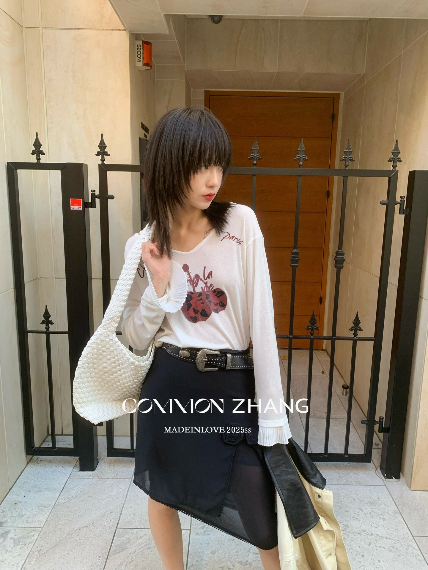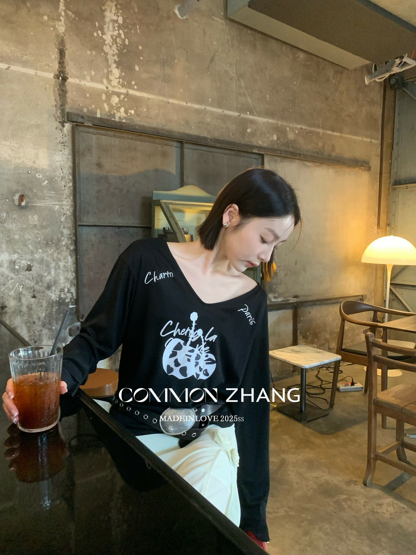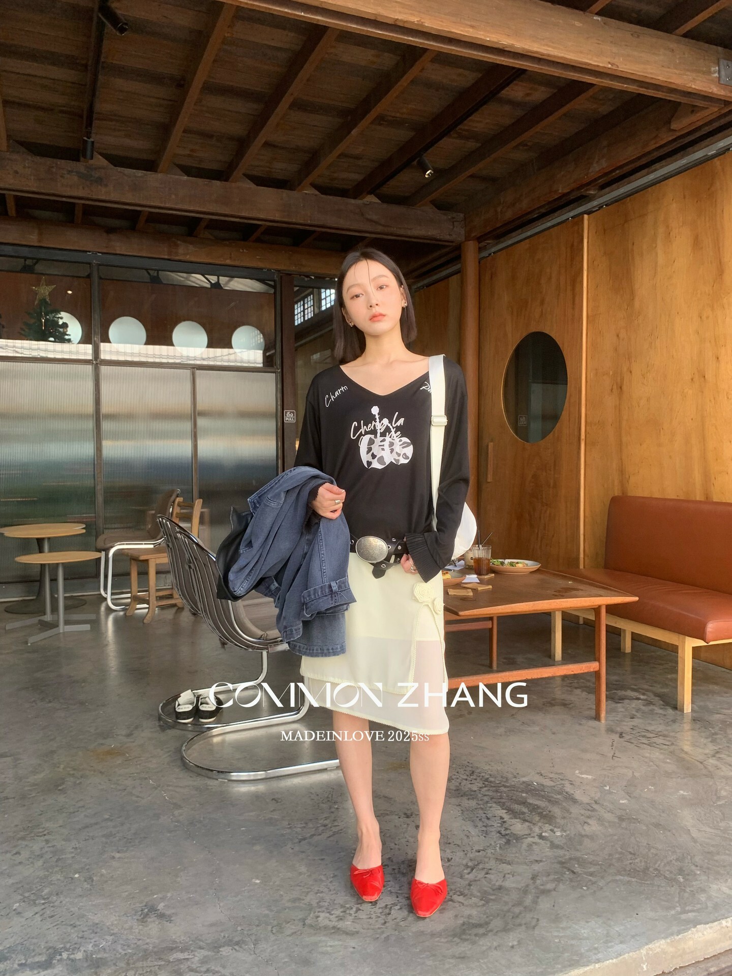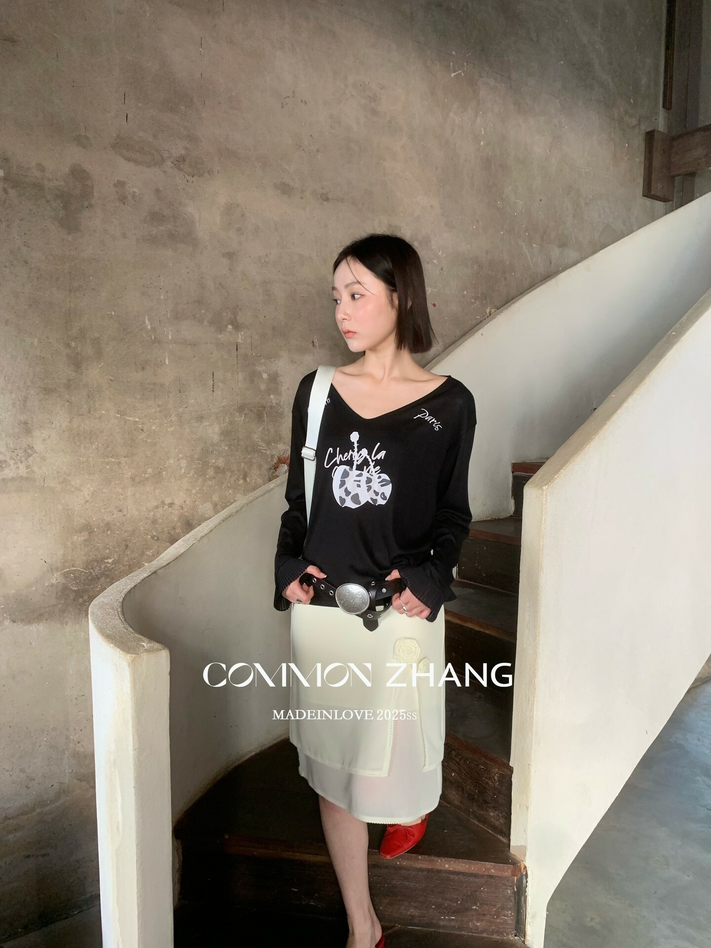 *o-ha-you*【FCZ100240】春季新款復古櫻桃字母印花百褶袖天絲寬V領短袖T恤-2色-如有需要請先諮詢