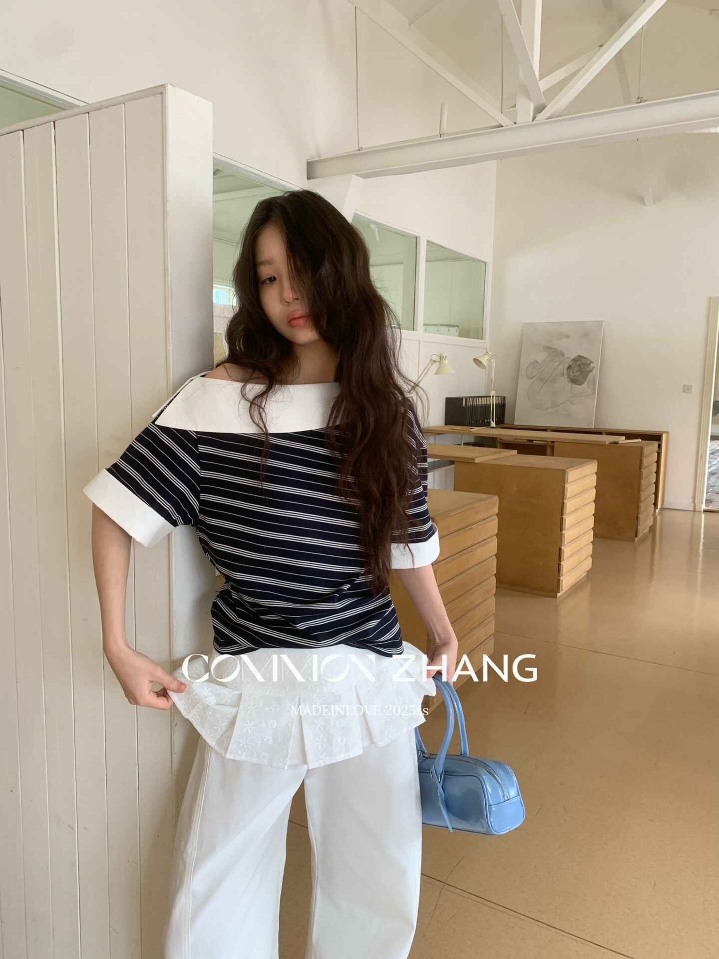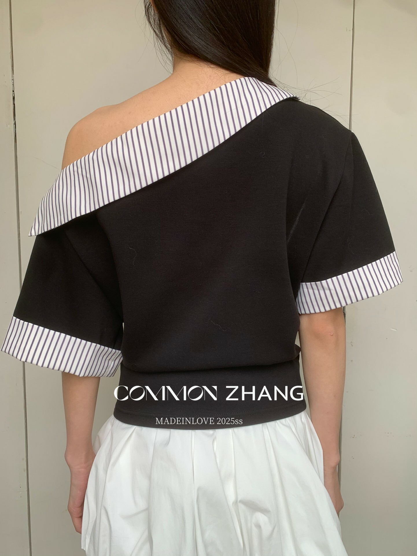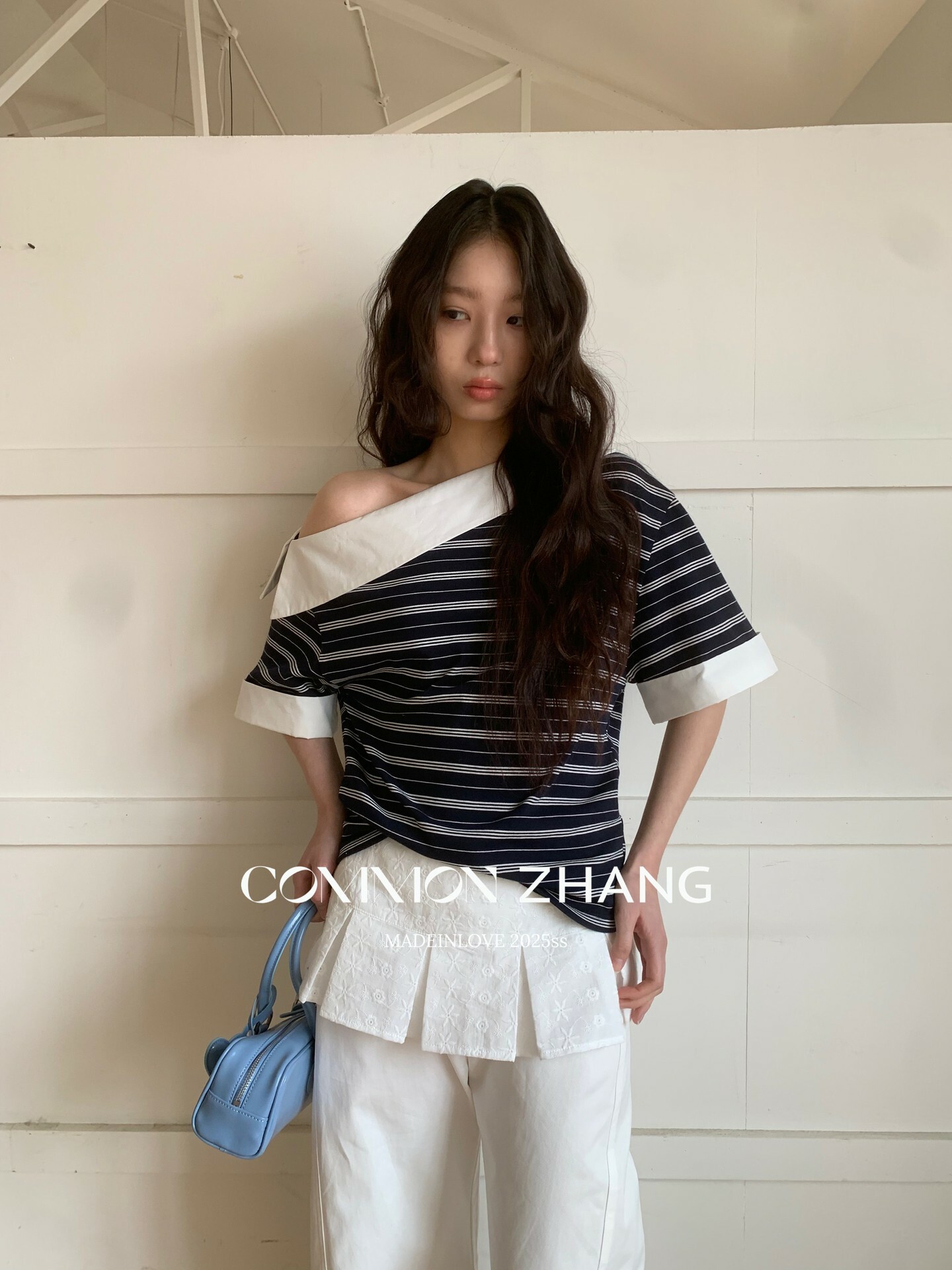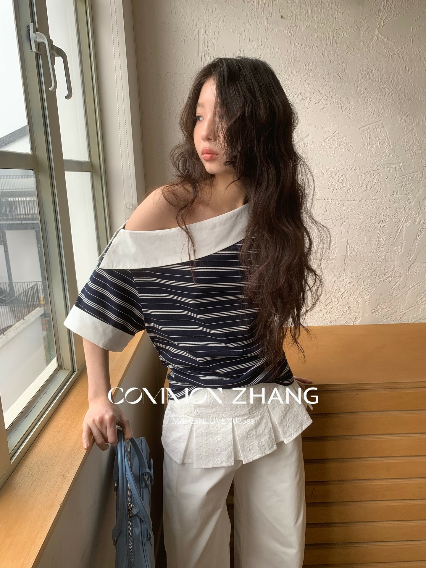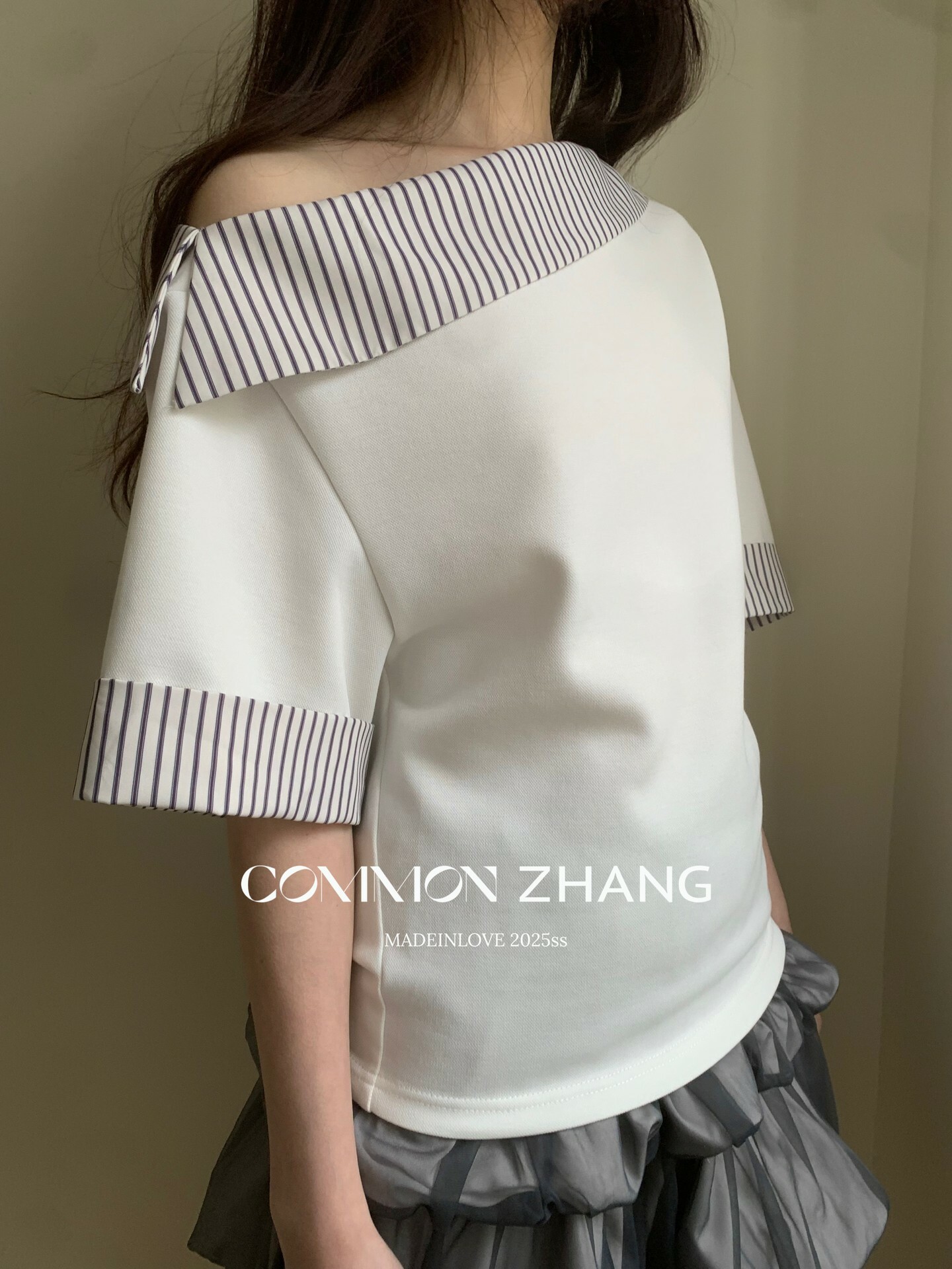 *o-ha-you*【FCZ100486】夏季新款斜領條紋半袖短袖T恤-3色-如有需要請先諮詢