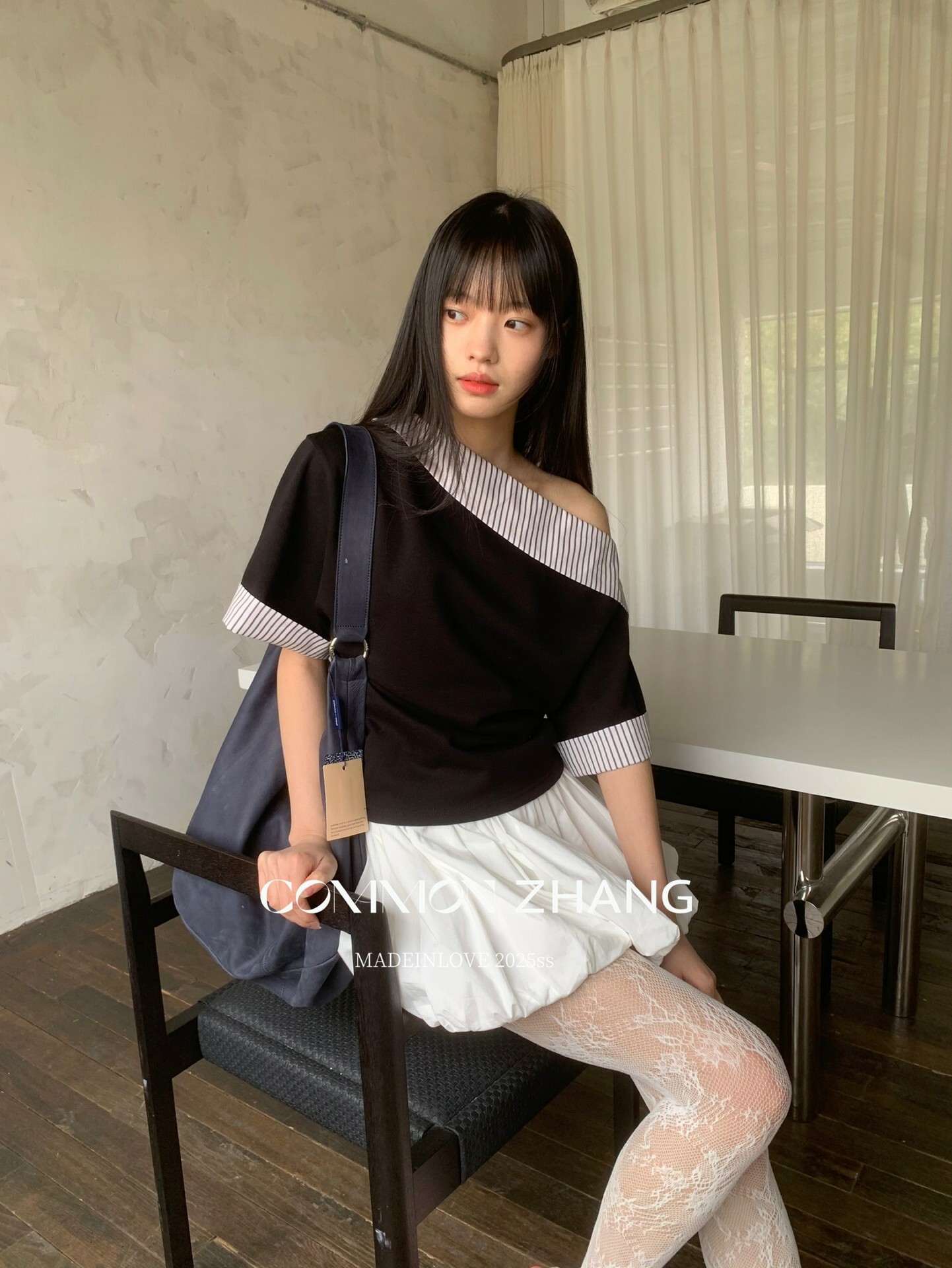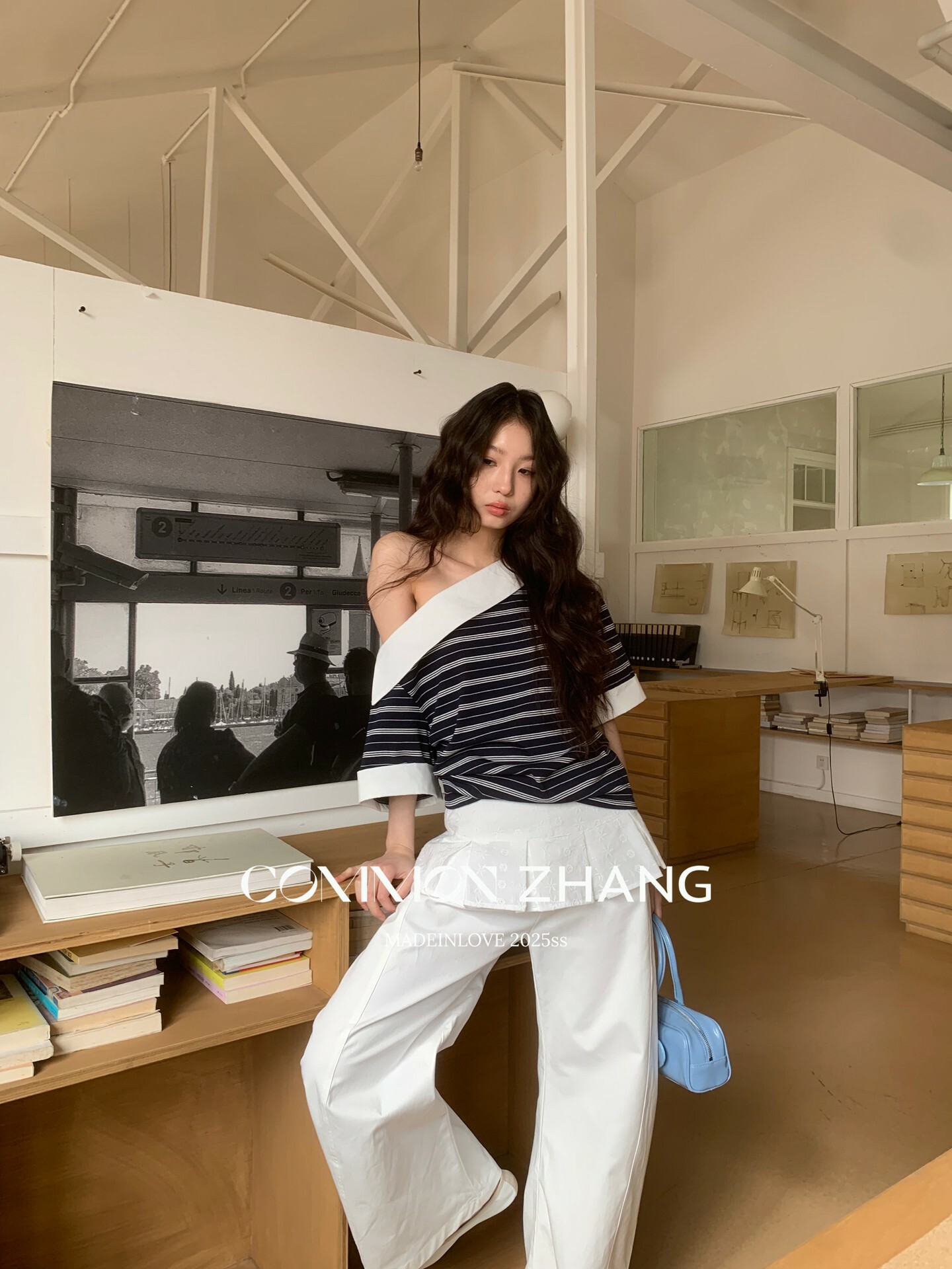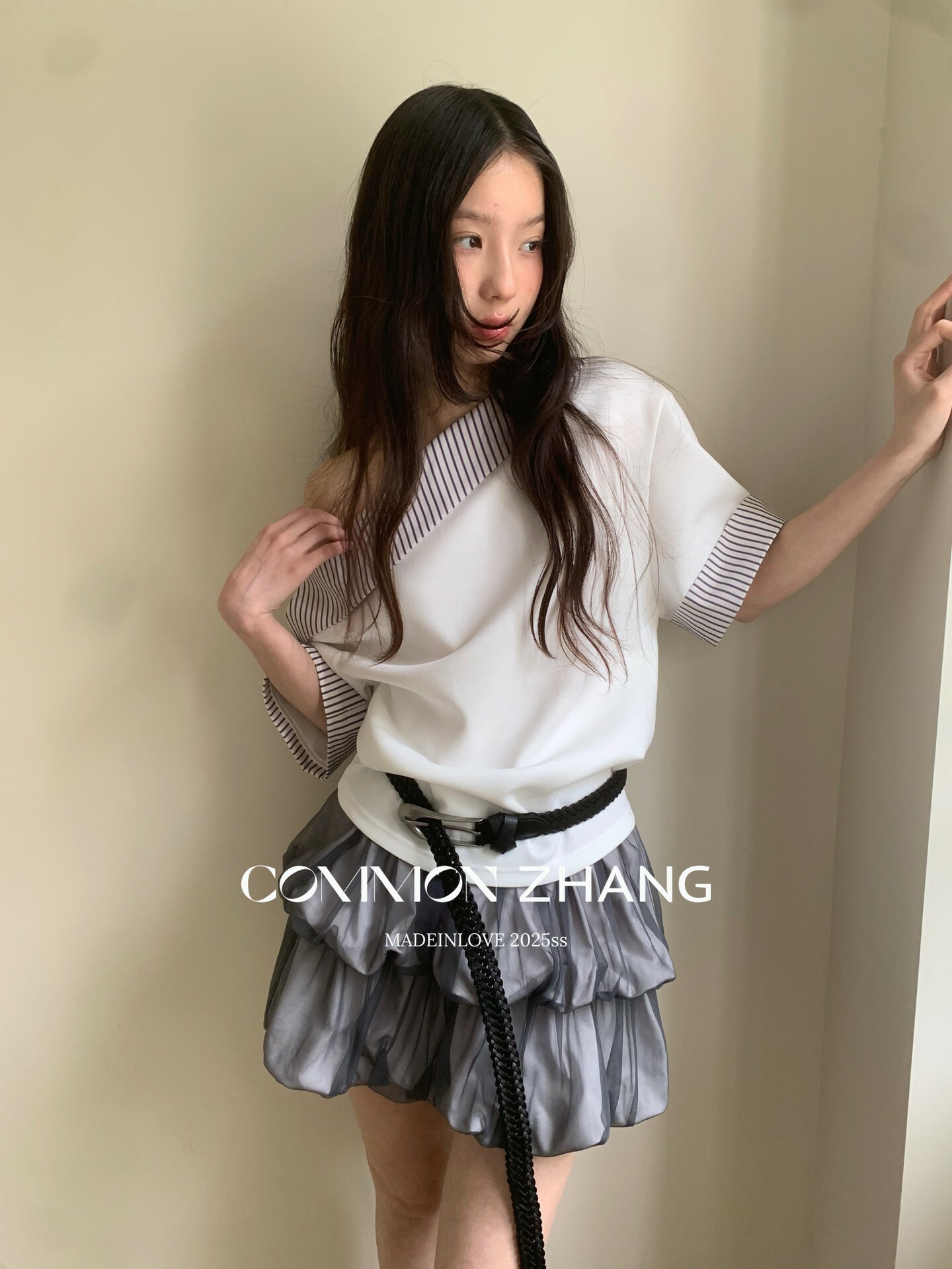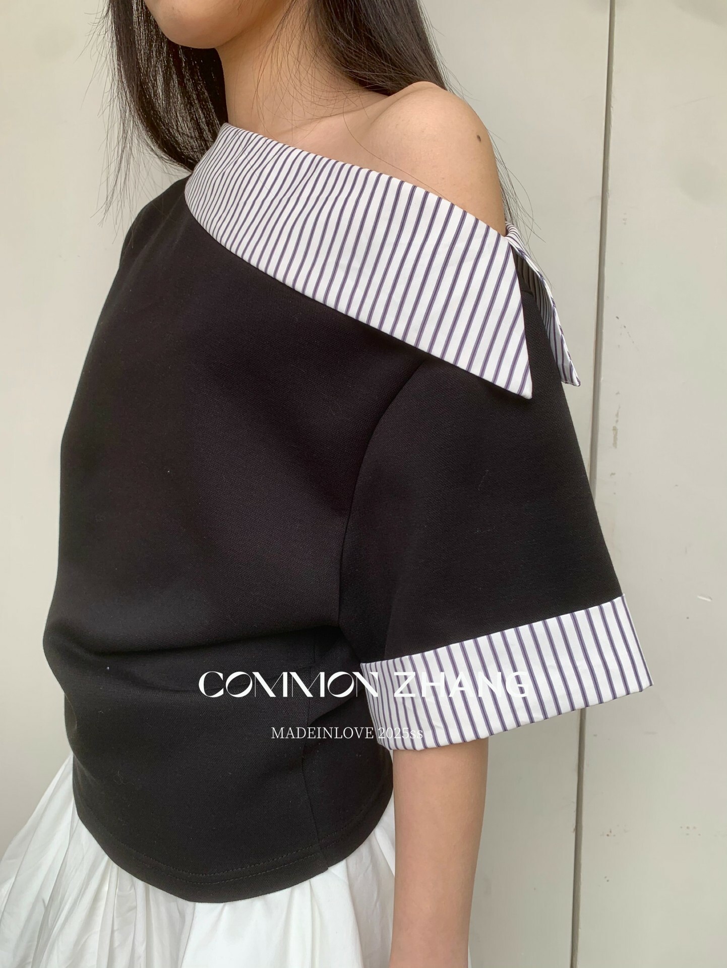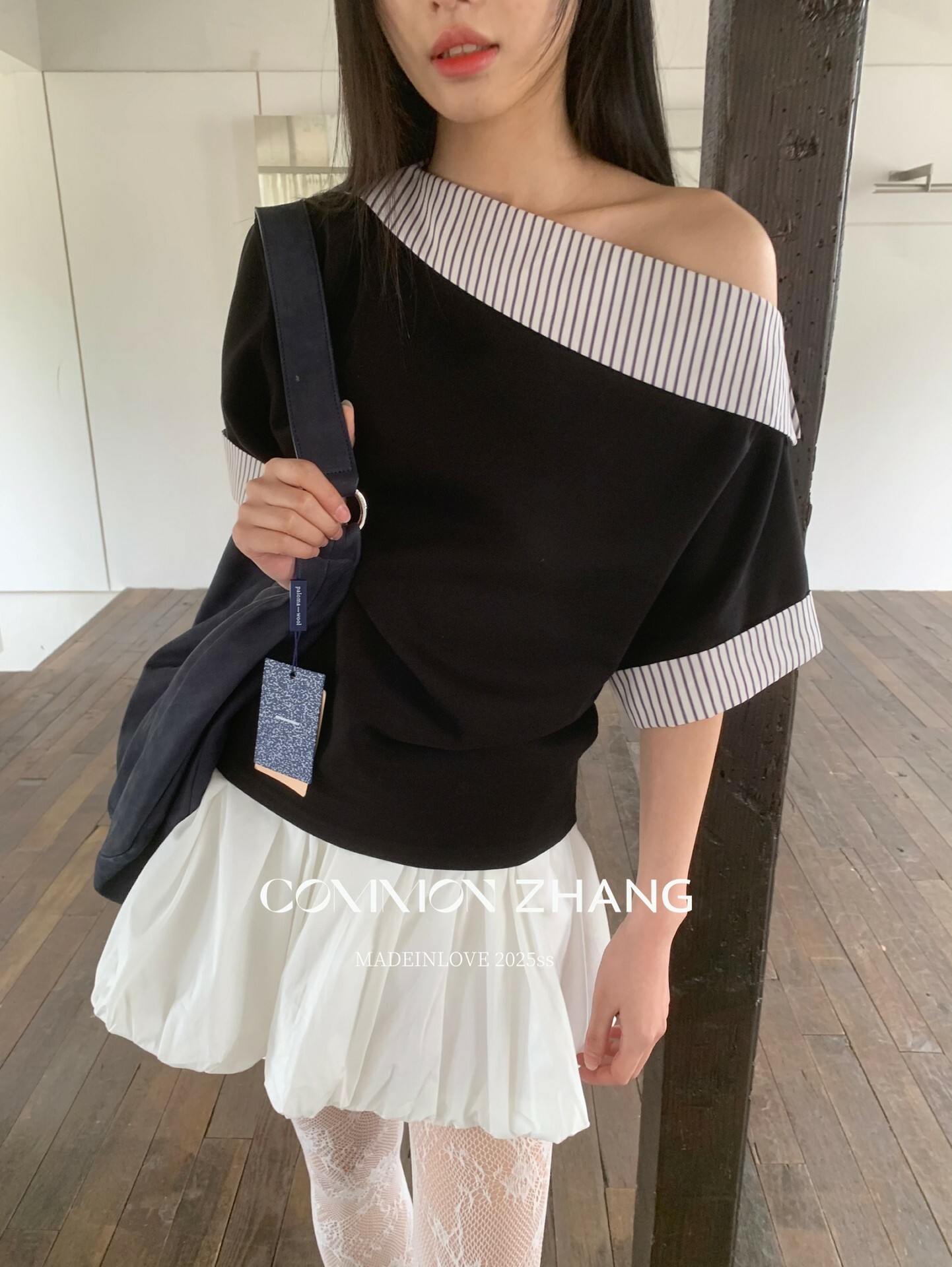 *o-ha-you*【FCZ100486】夏季新款斜領條紋半袖短袖T恤-3色-如有需要請先諮詢