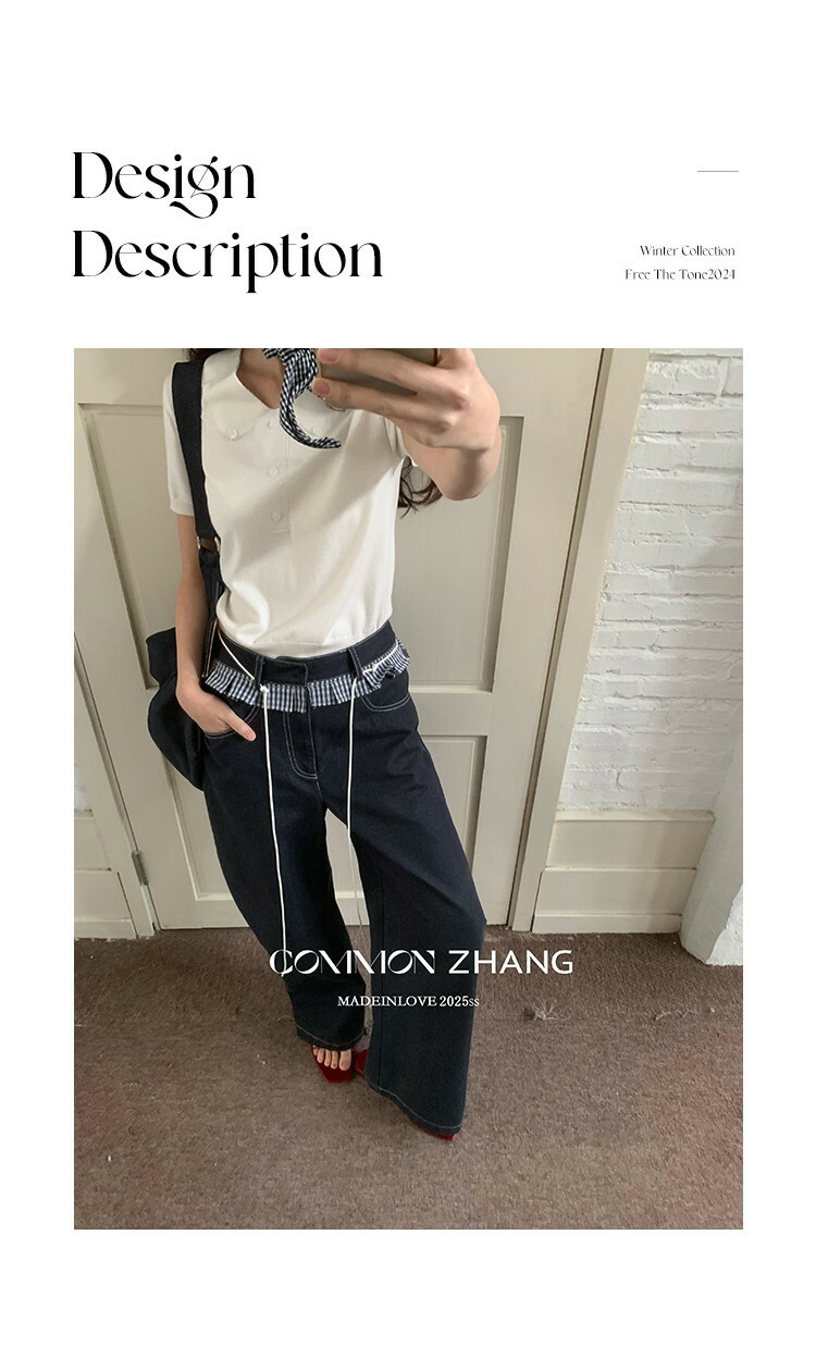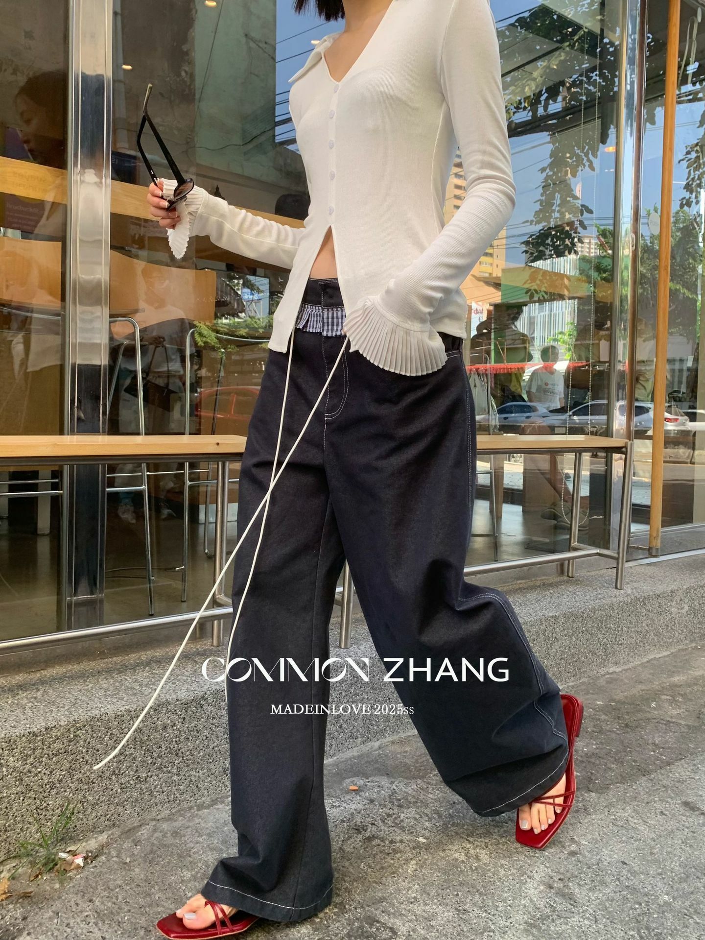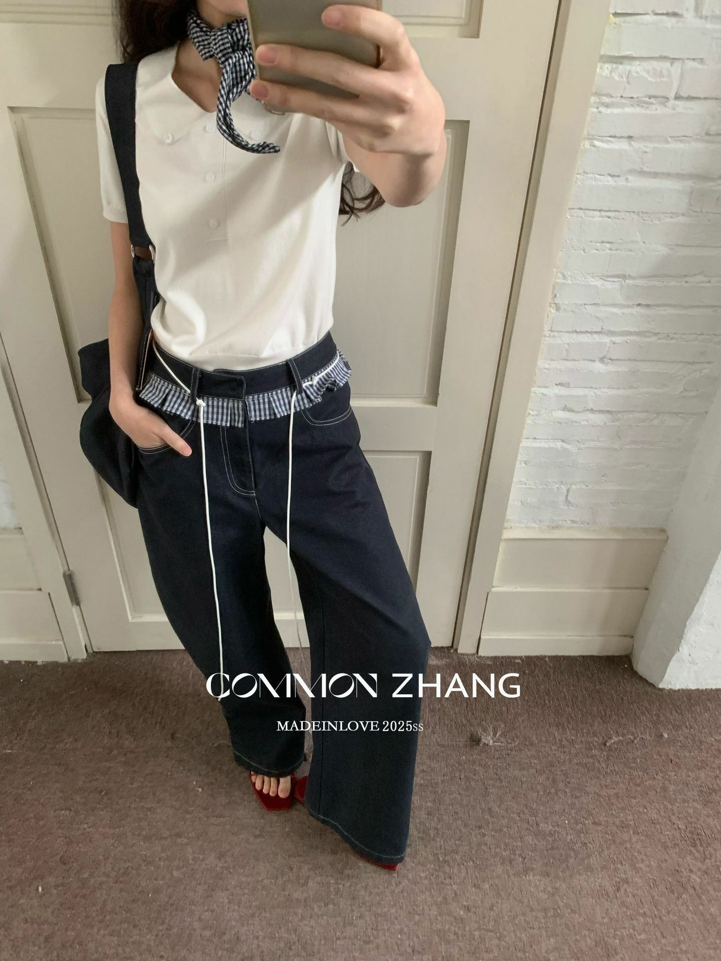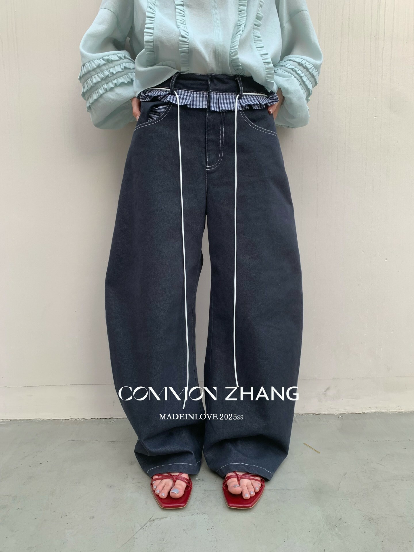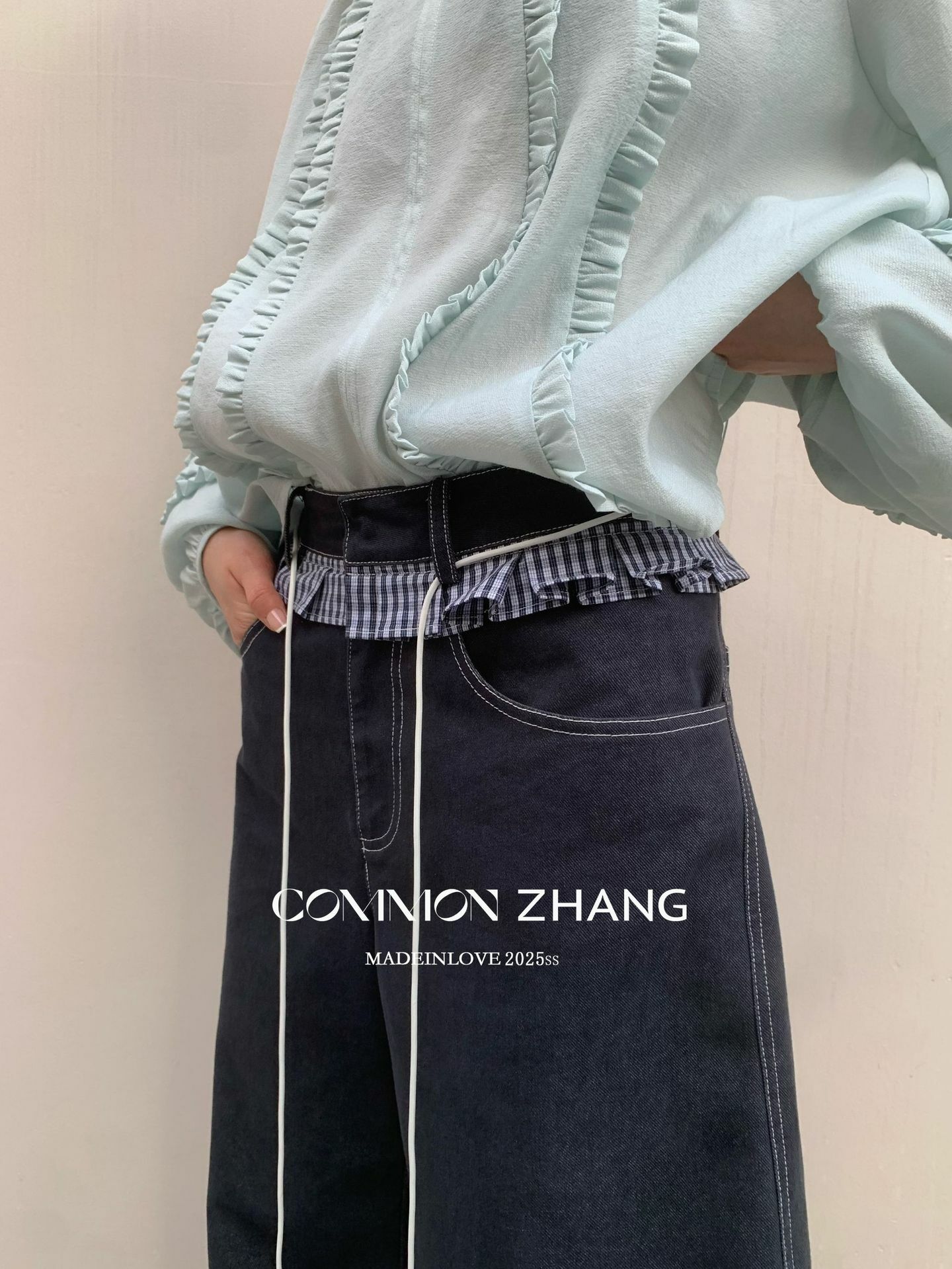 *o-ha-you*【FCZ101231】韓版都會通勤花邊拼接繫帶高腰闊腿垂感拖地牛仔褲-2色-如有需要請先諮詢