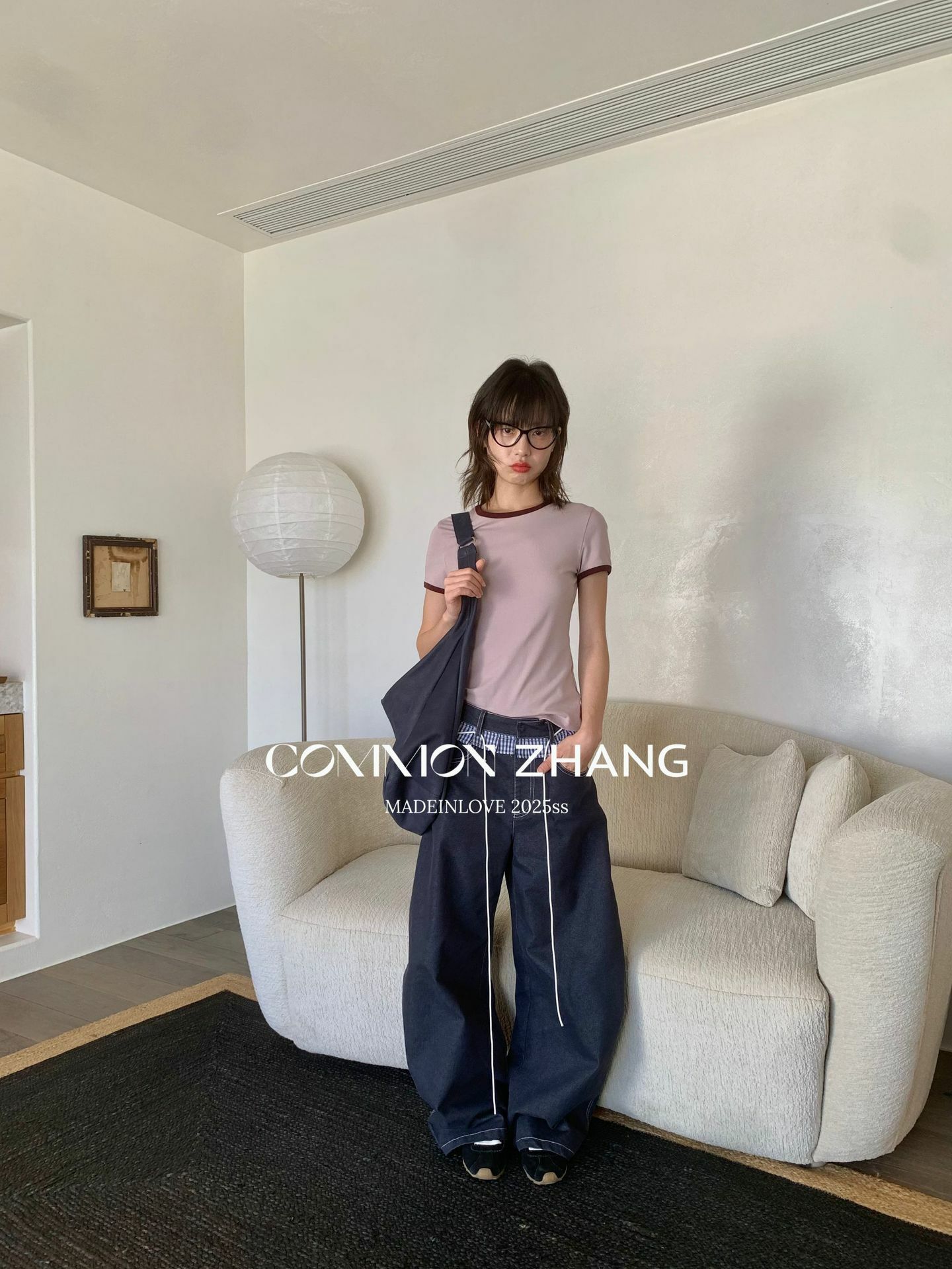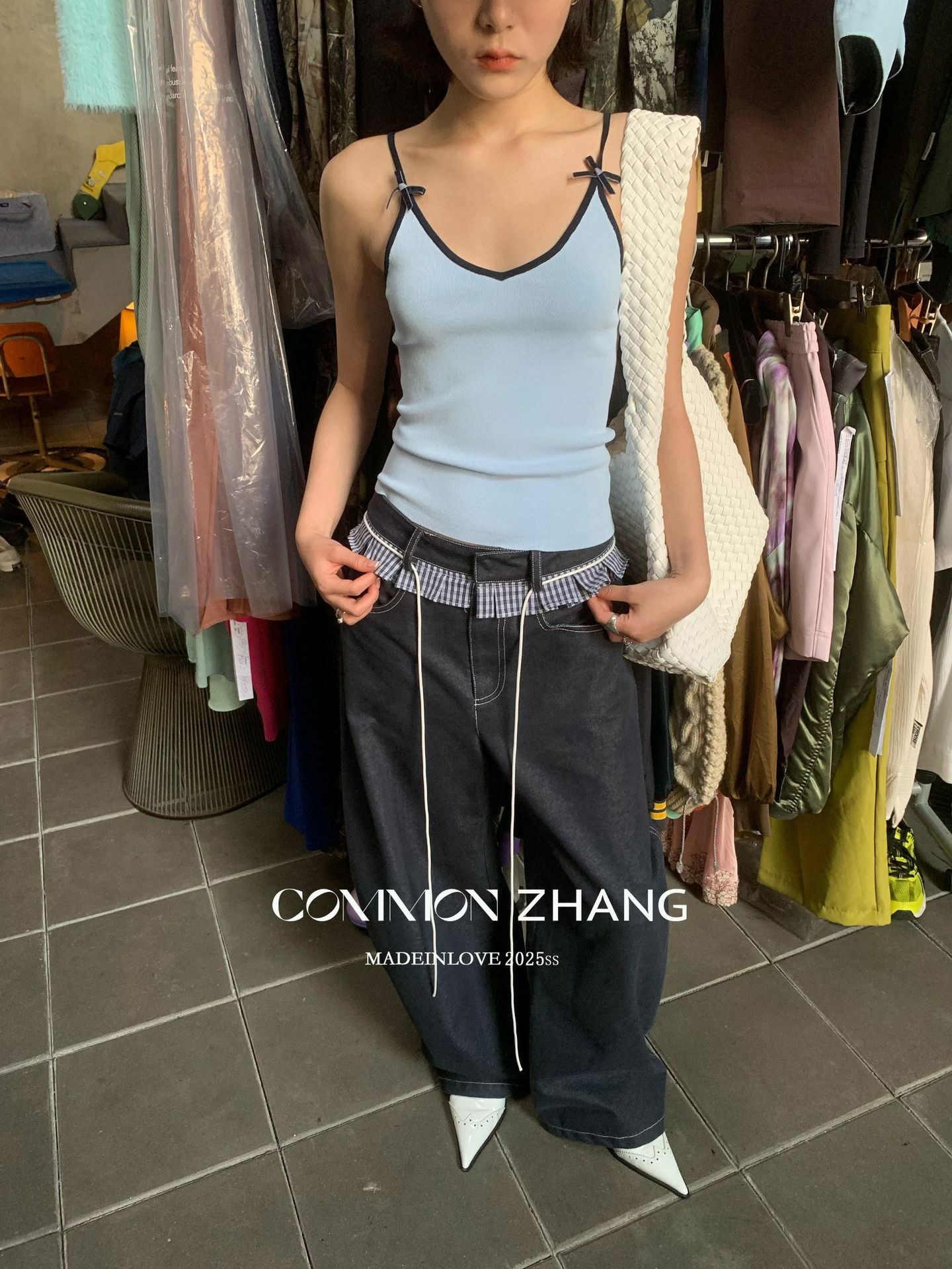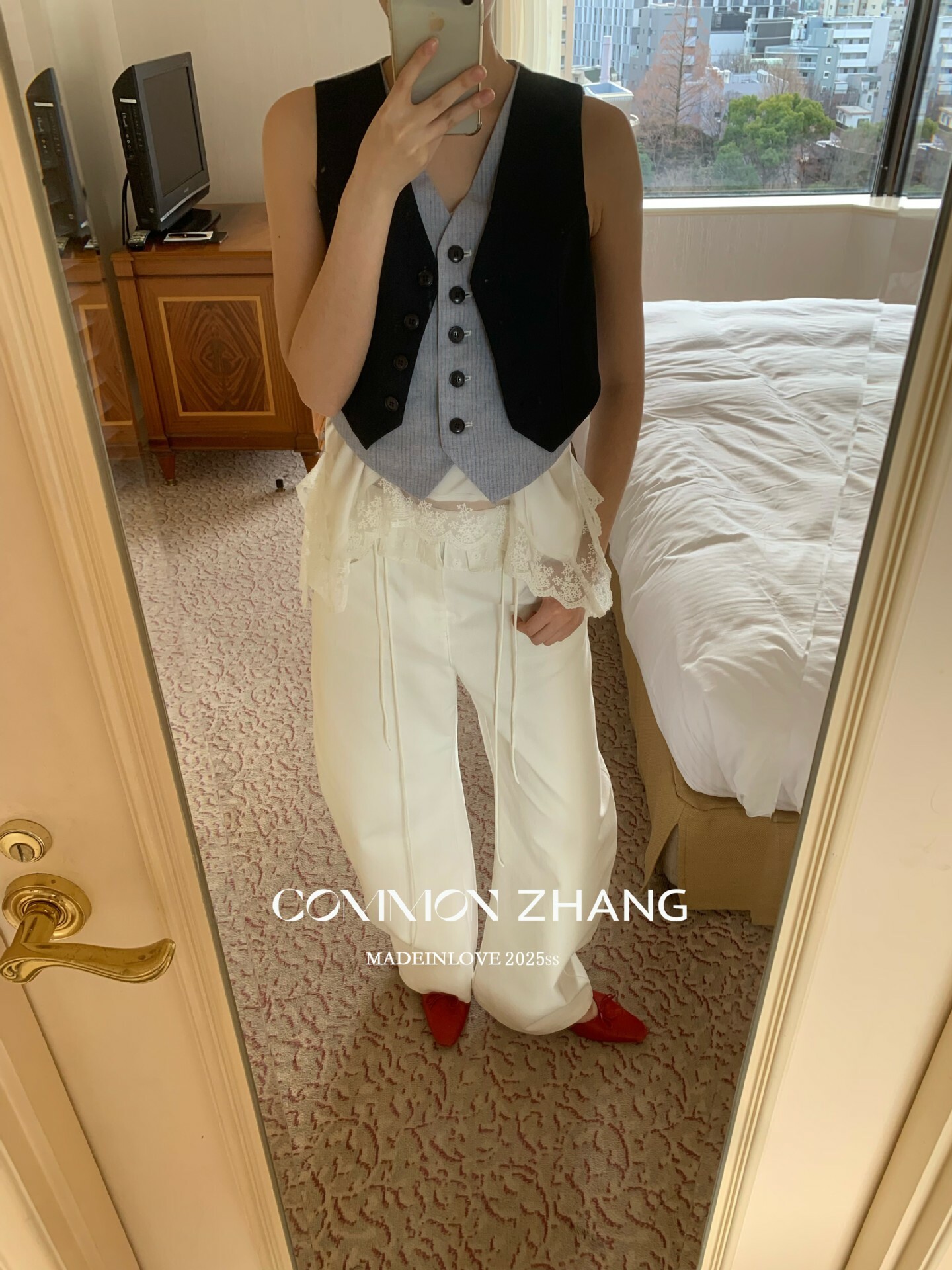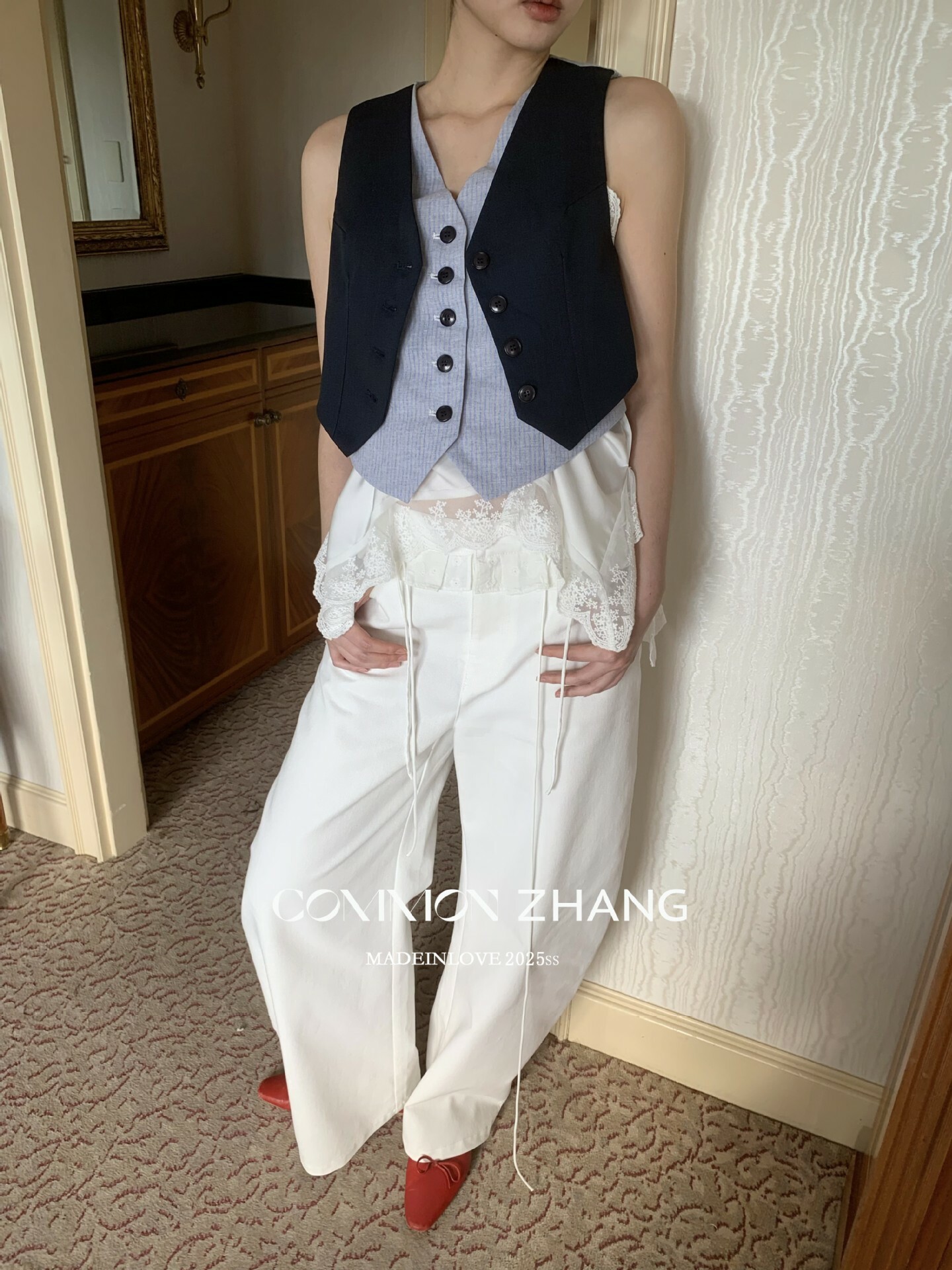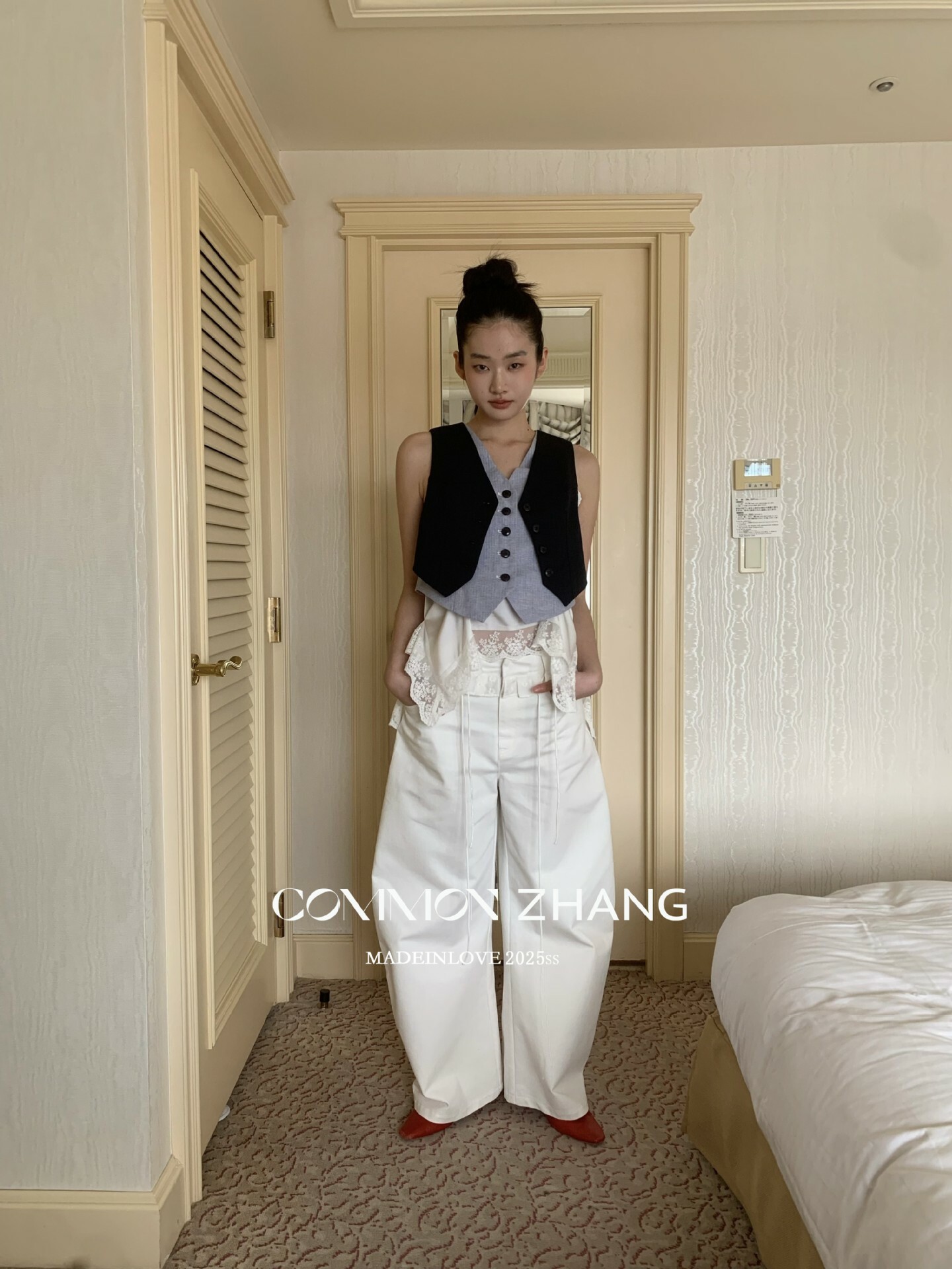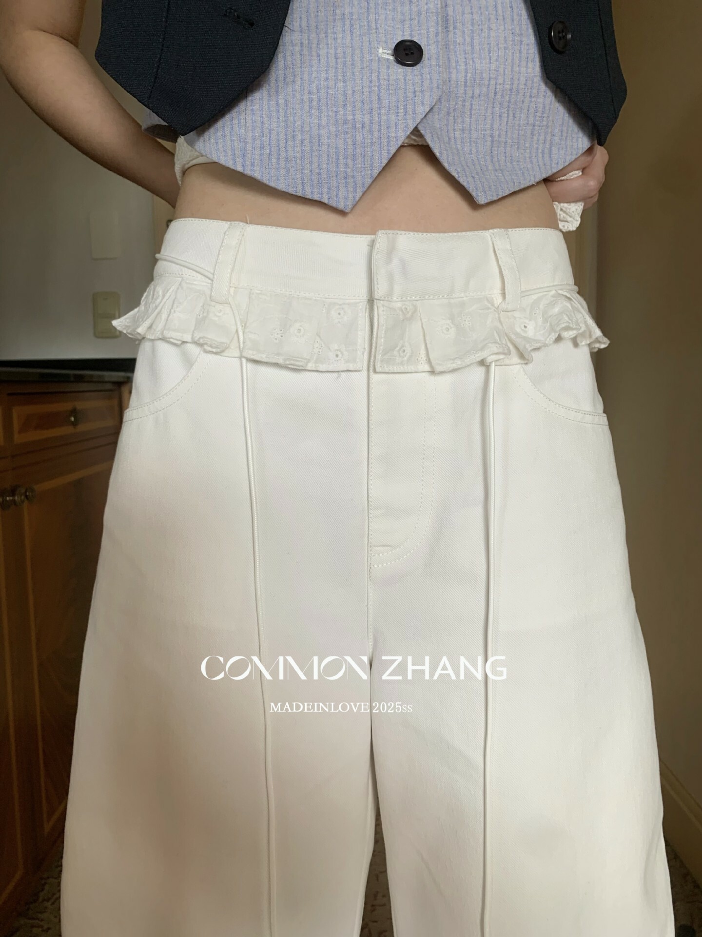 *o-ha-you*【FCZ101231】韓版都會通勤花邊拼接繫帶高腰闊腿垂感拖地牛仔褲-2色-如有需要請先諮詢