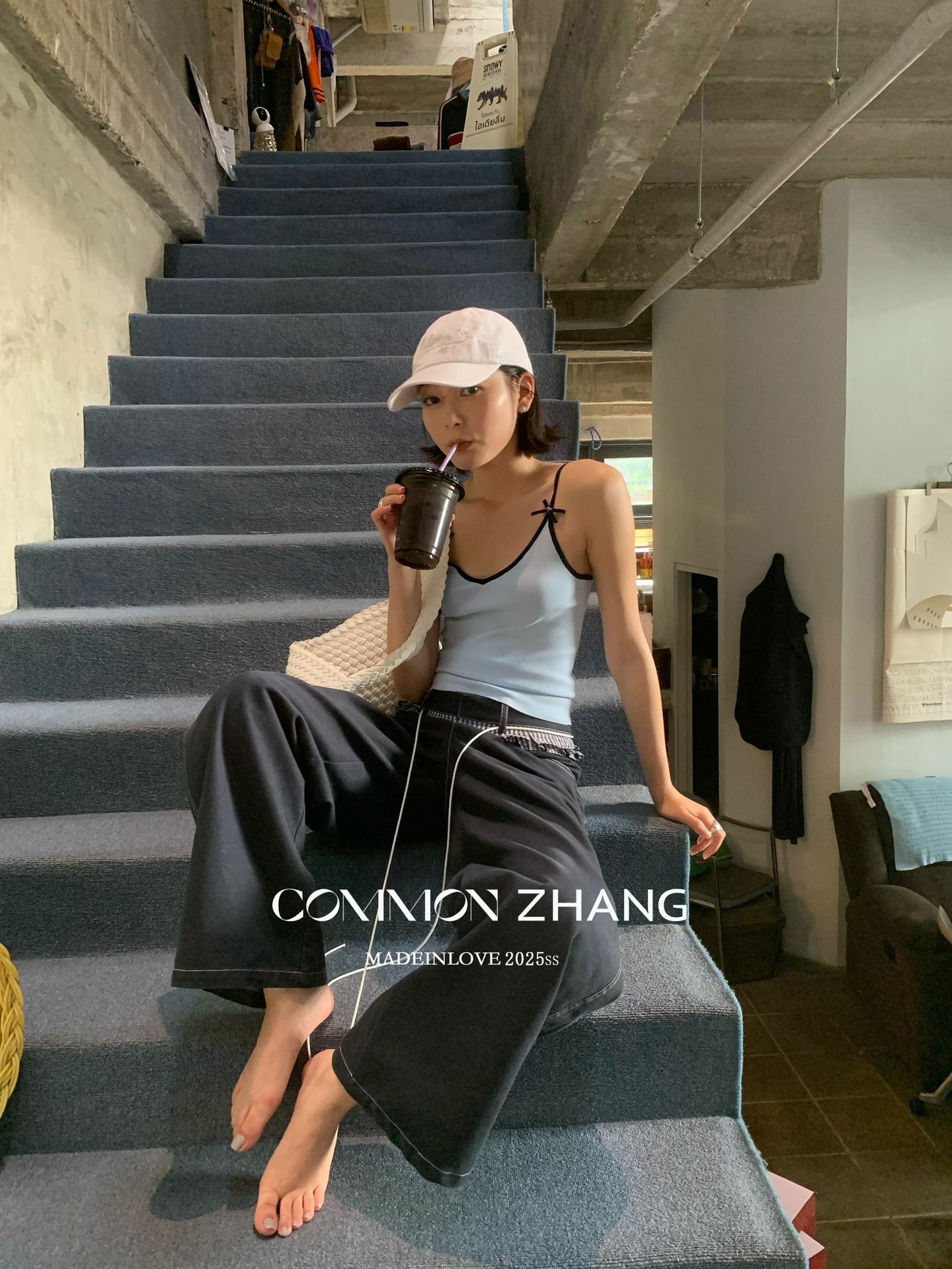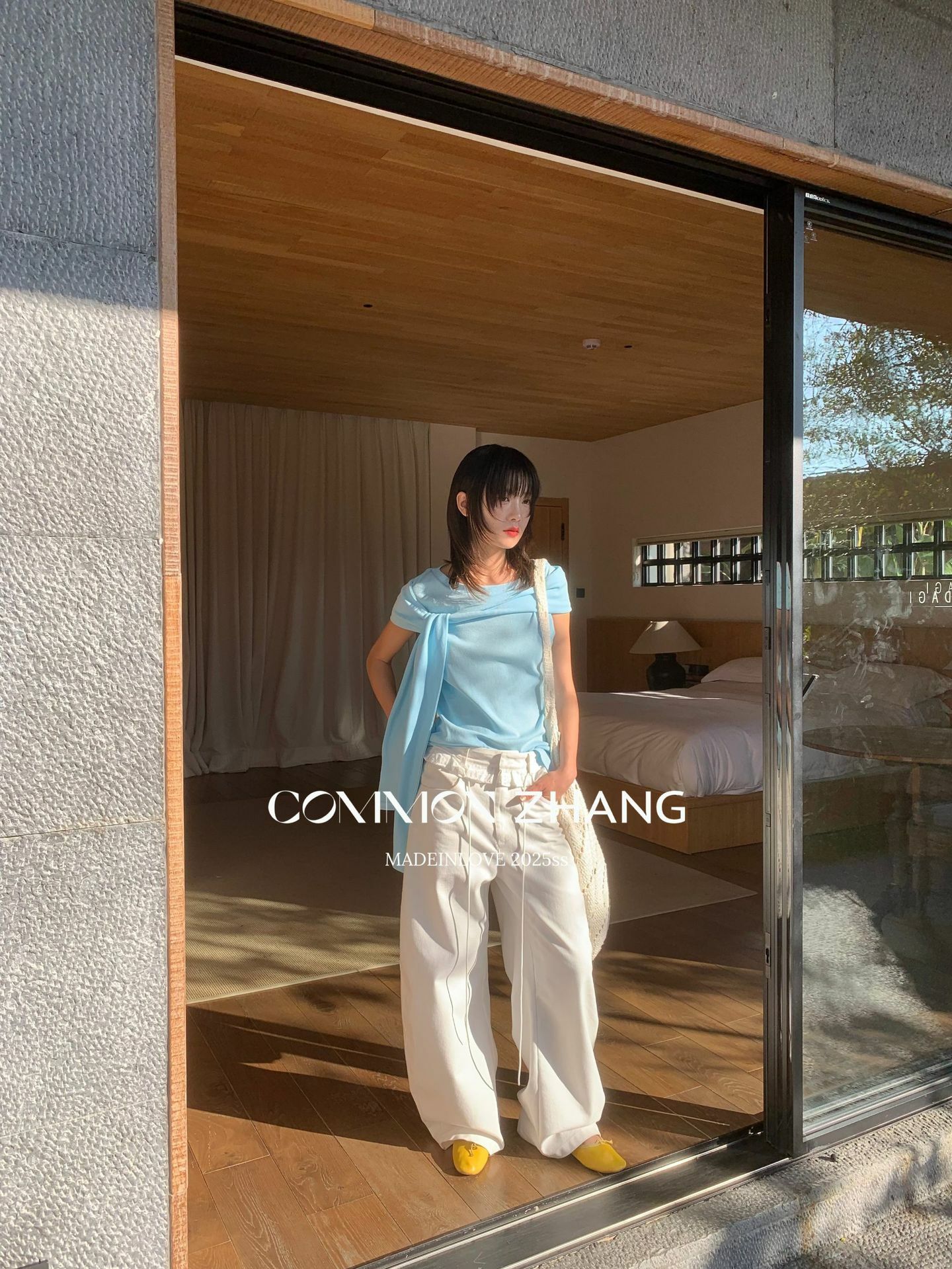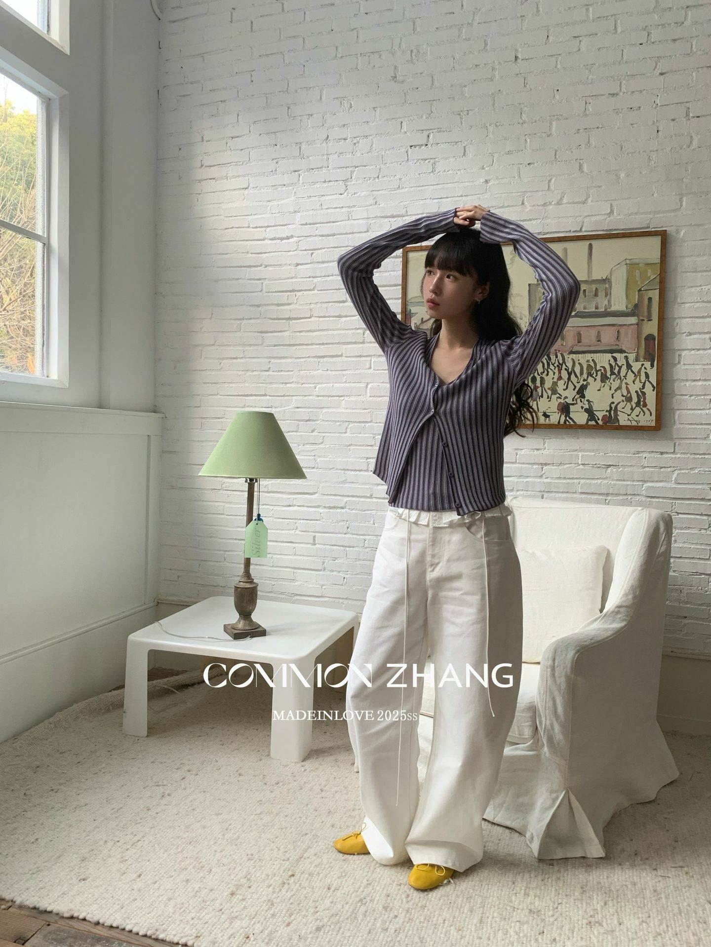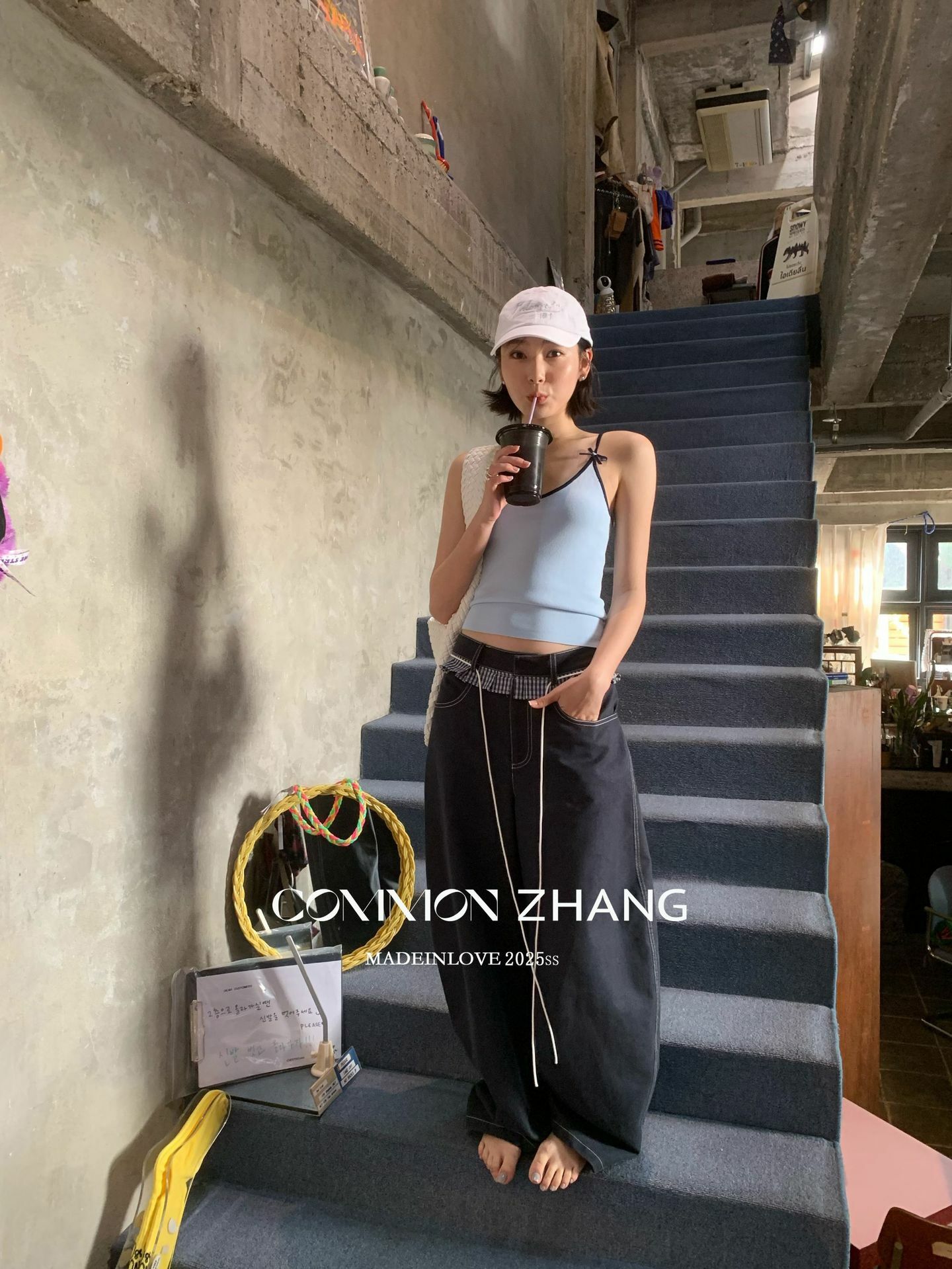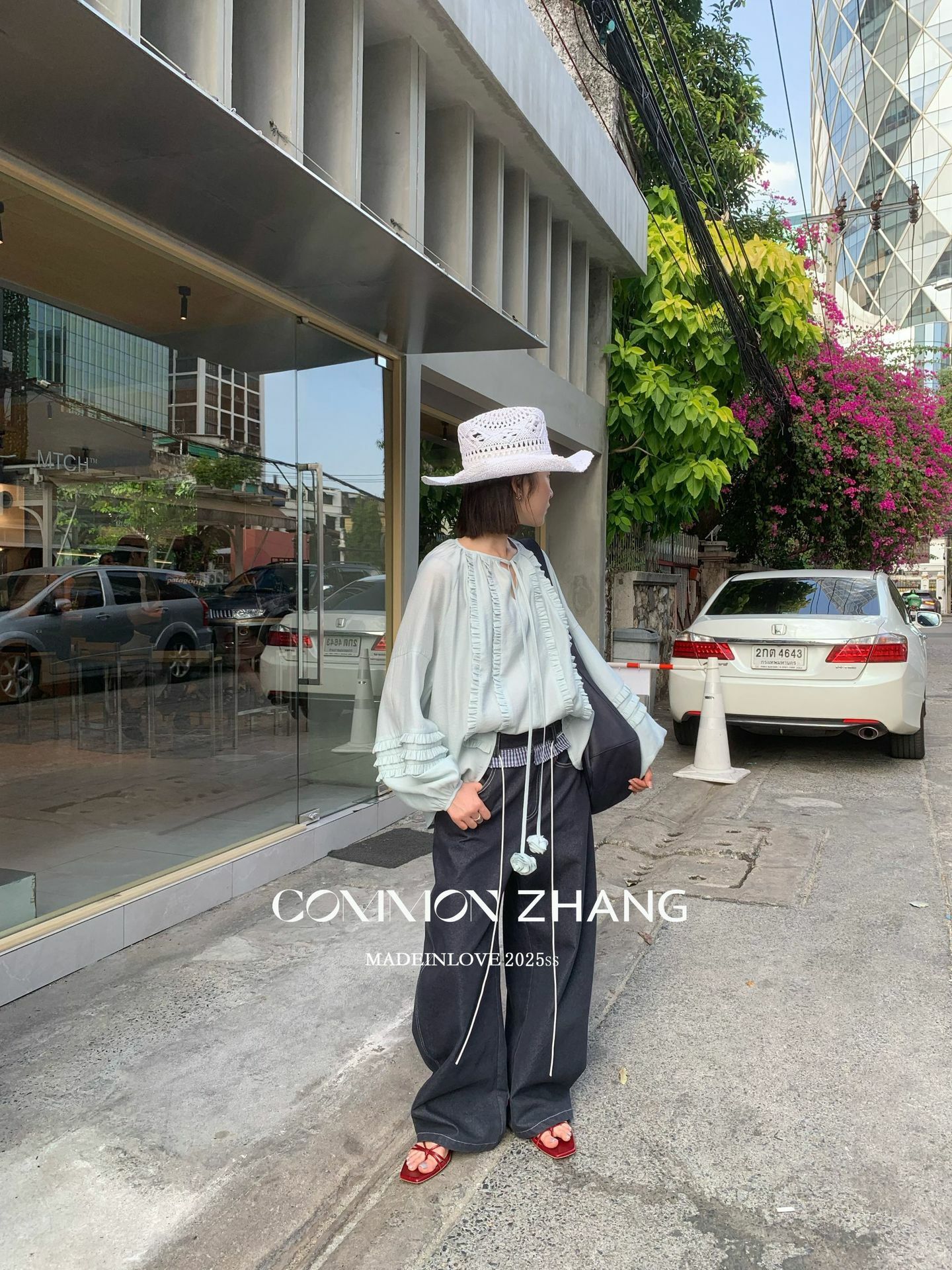 *o-ha-you*【FCZ101231】韓版都會通勤花邊拼接繫帶高腰闊腿垂感拖地牛仔褲-2色-如有需要請先諮詢