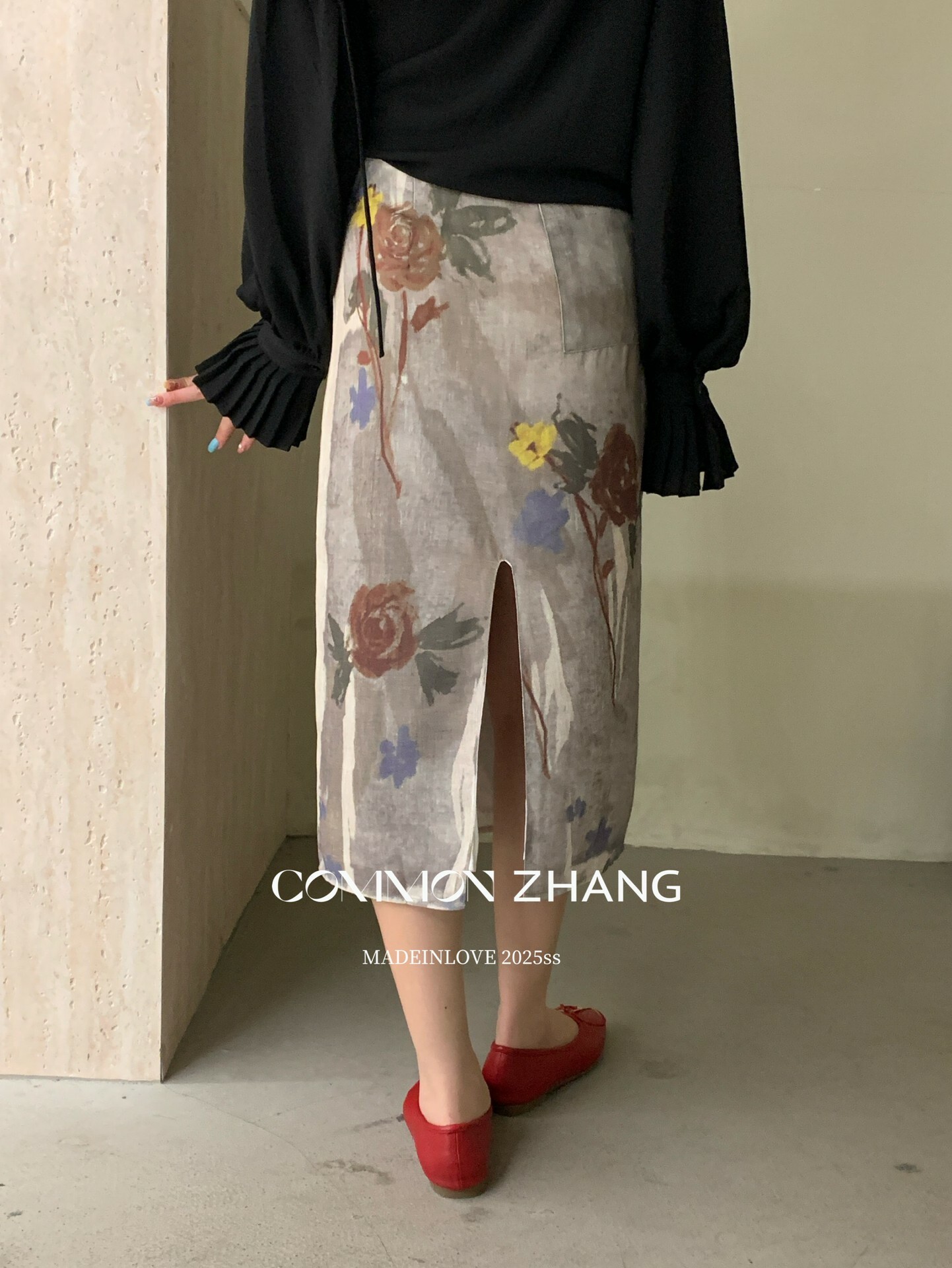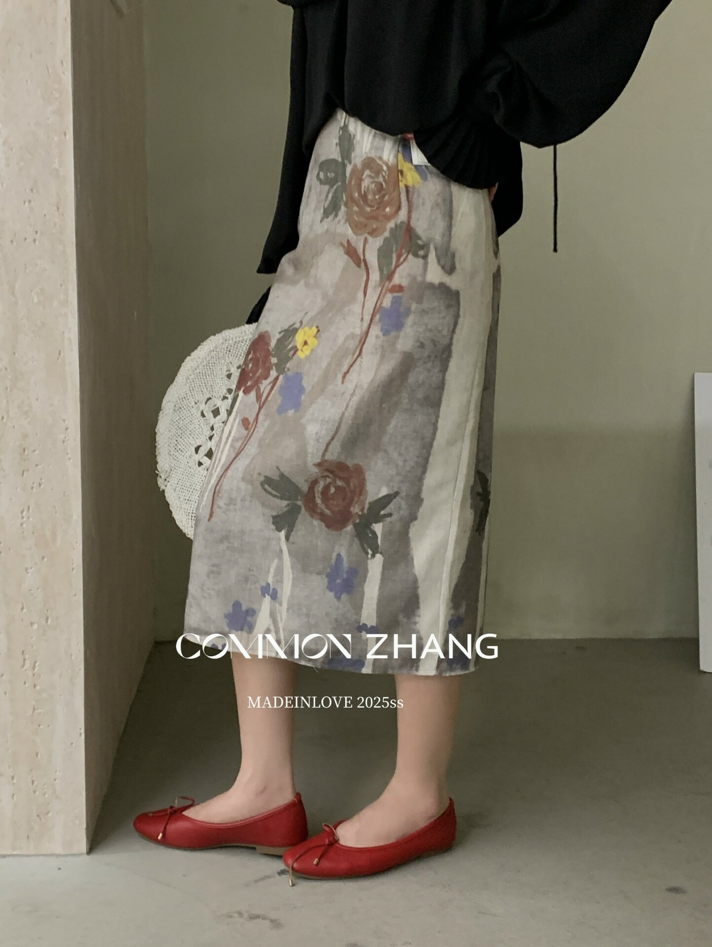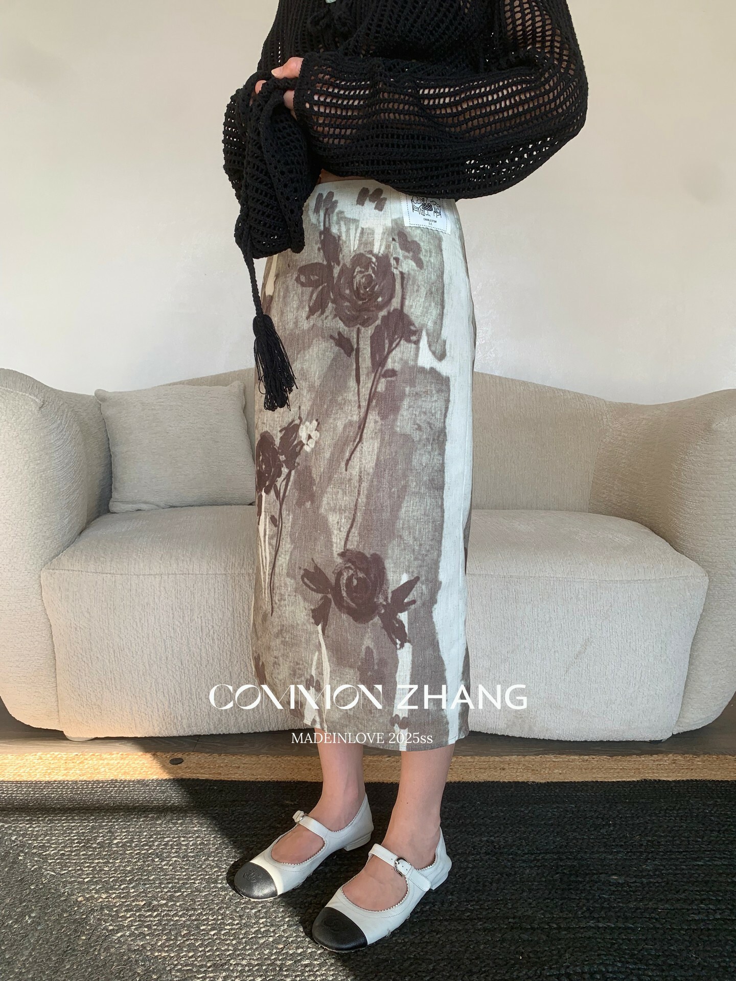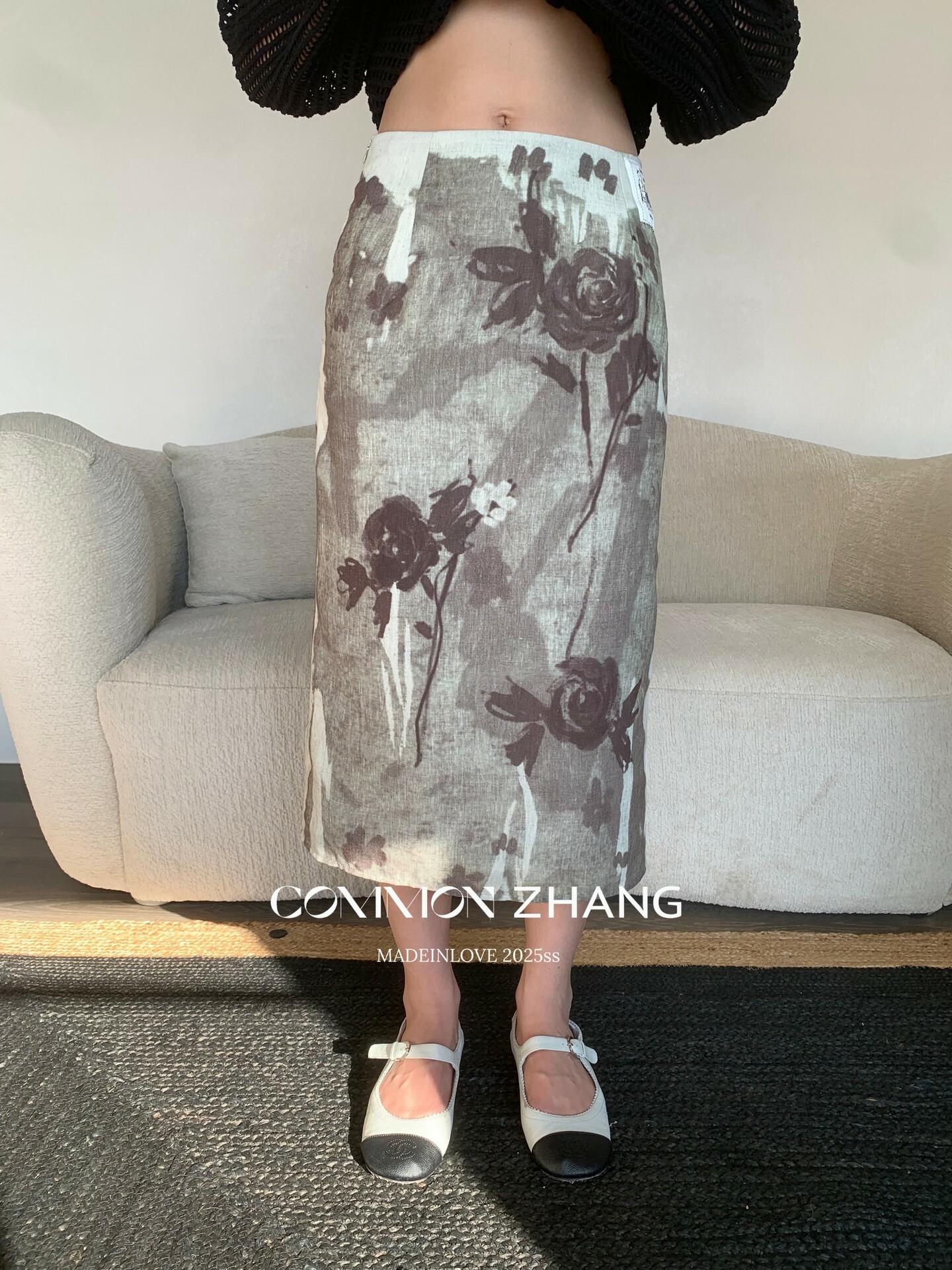 *o-ha-you*【FCZ102166】春季新中式植物花卉印花質感高腰開叉A字包臀半身裙-2色