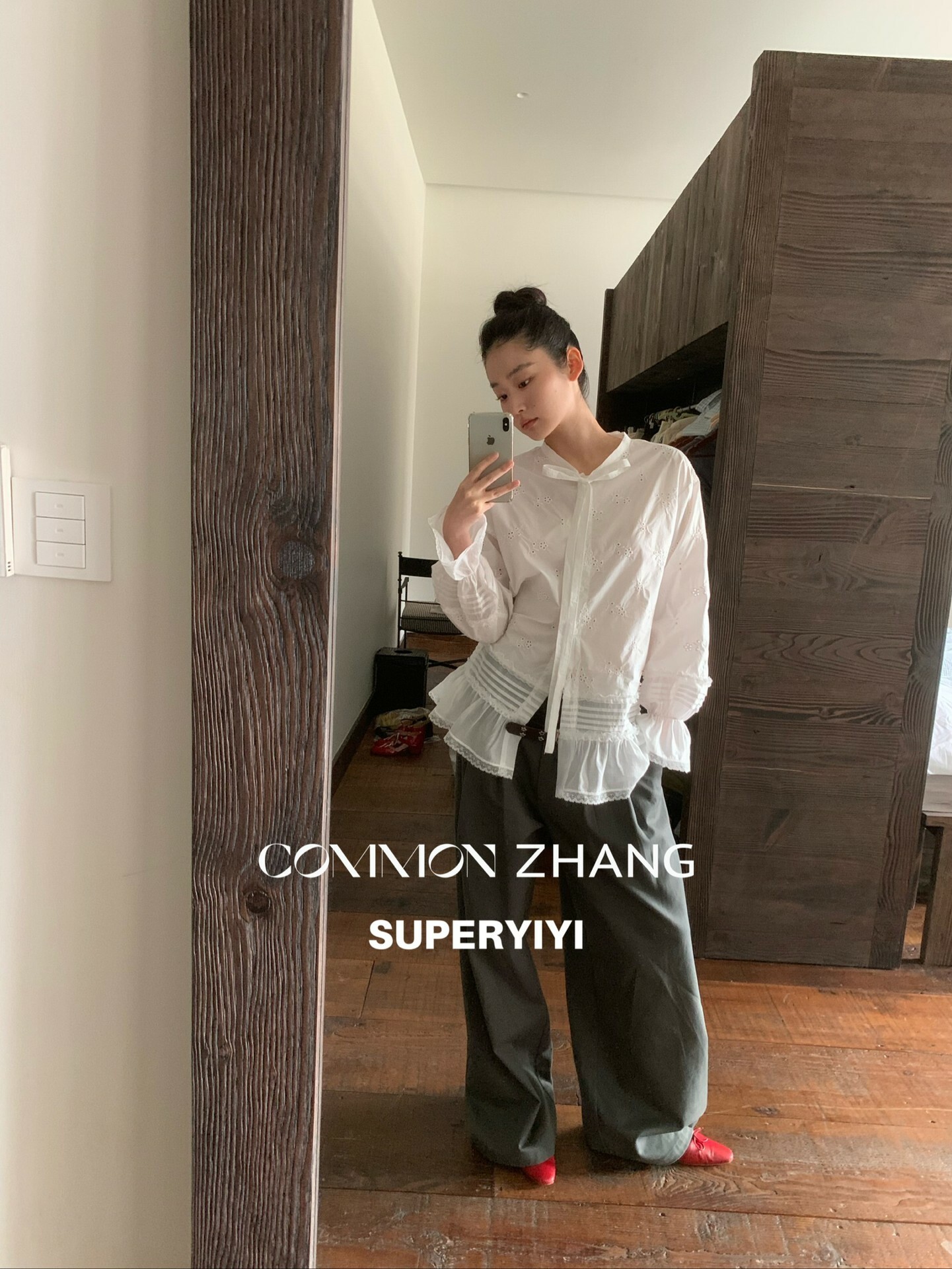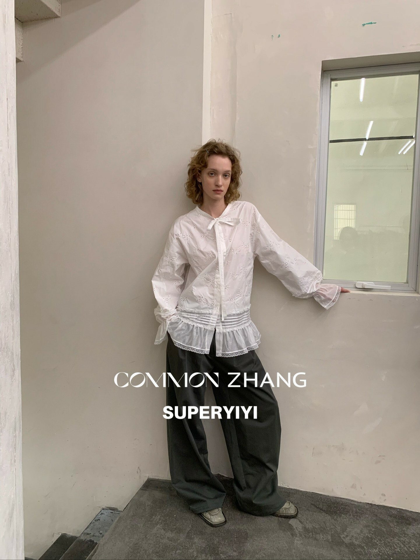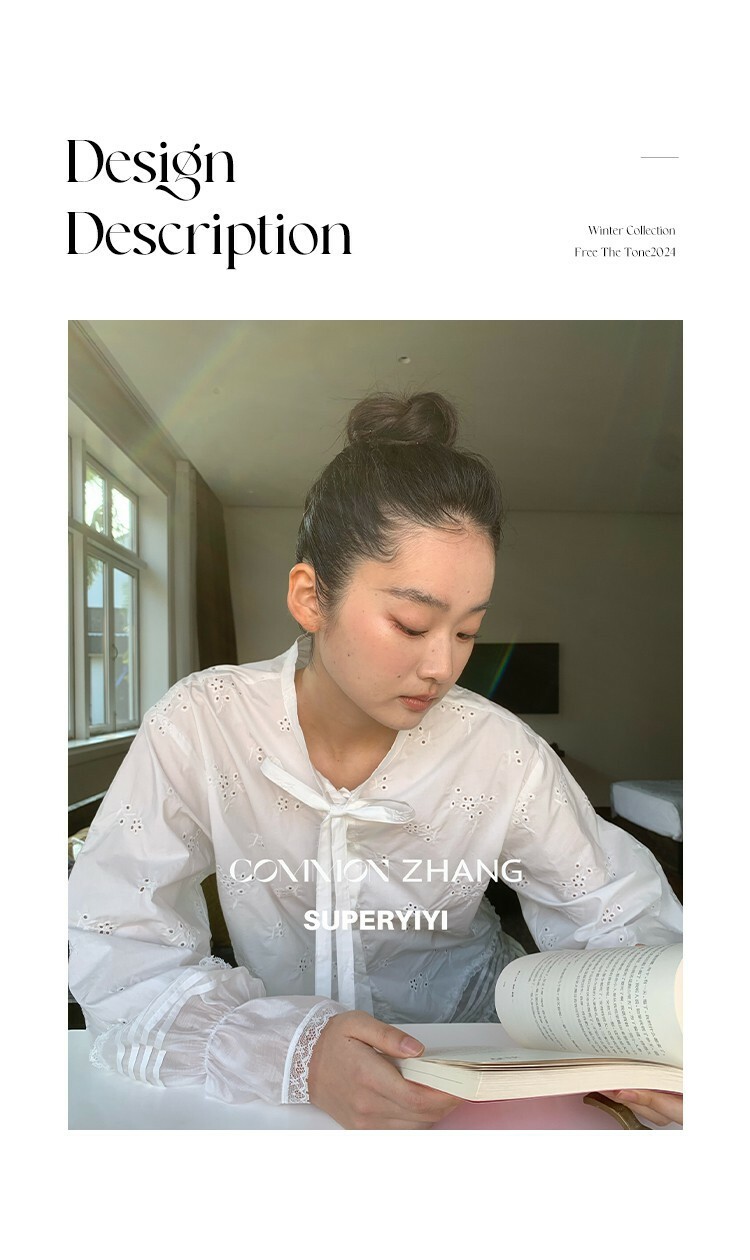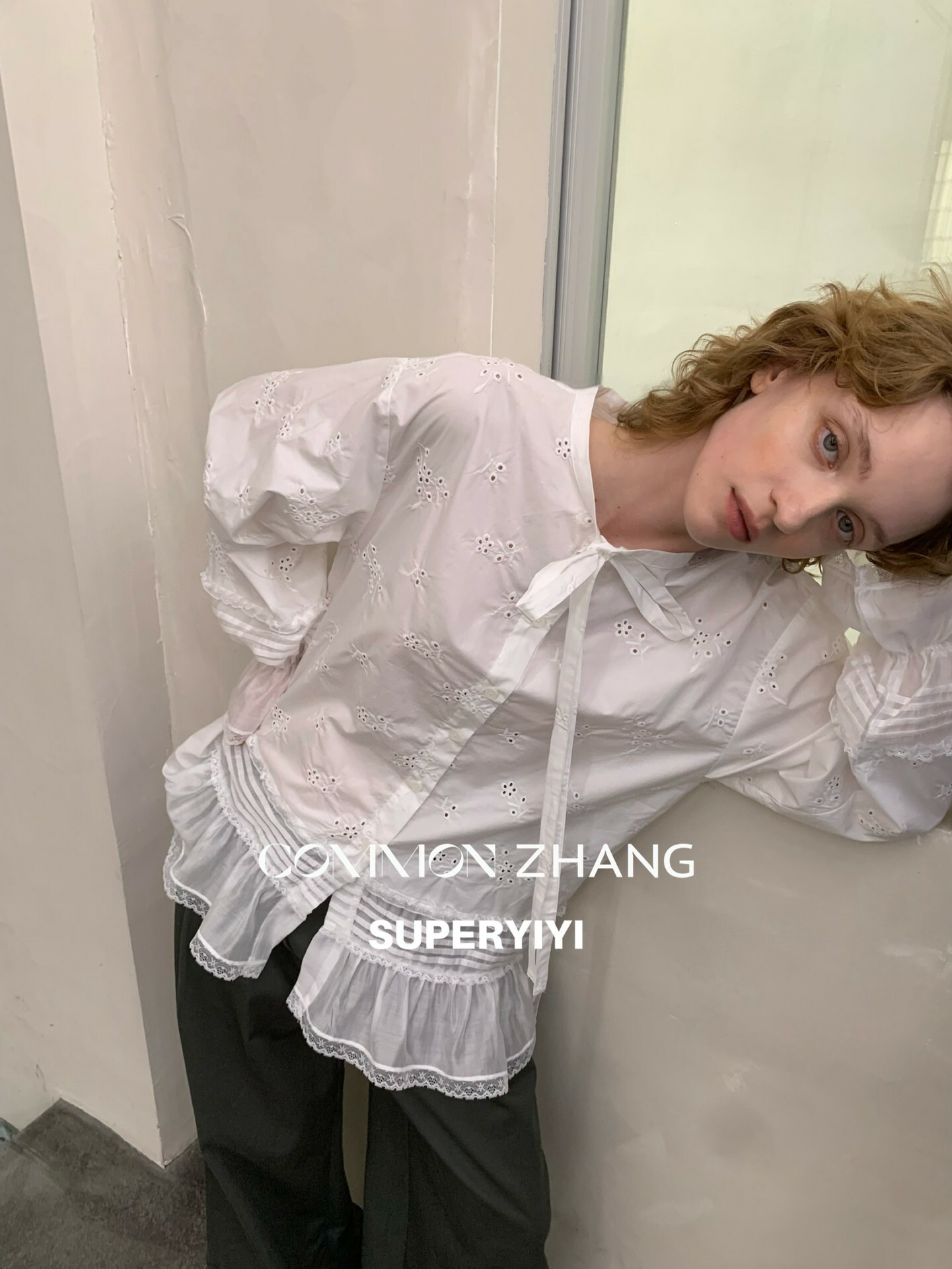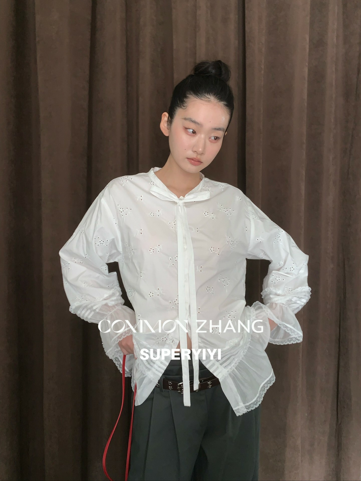 *o-ha-you*【FCZ103005】春季新款微透鏤空蕾絲邊拼接繫帶圓領長袖天絲襯衫