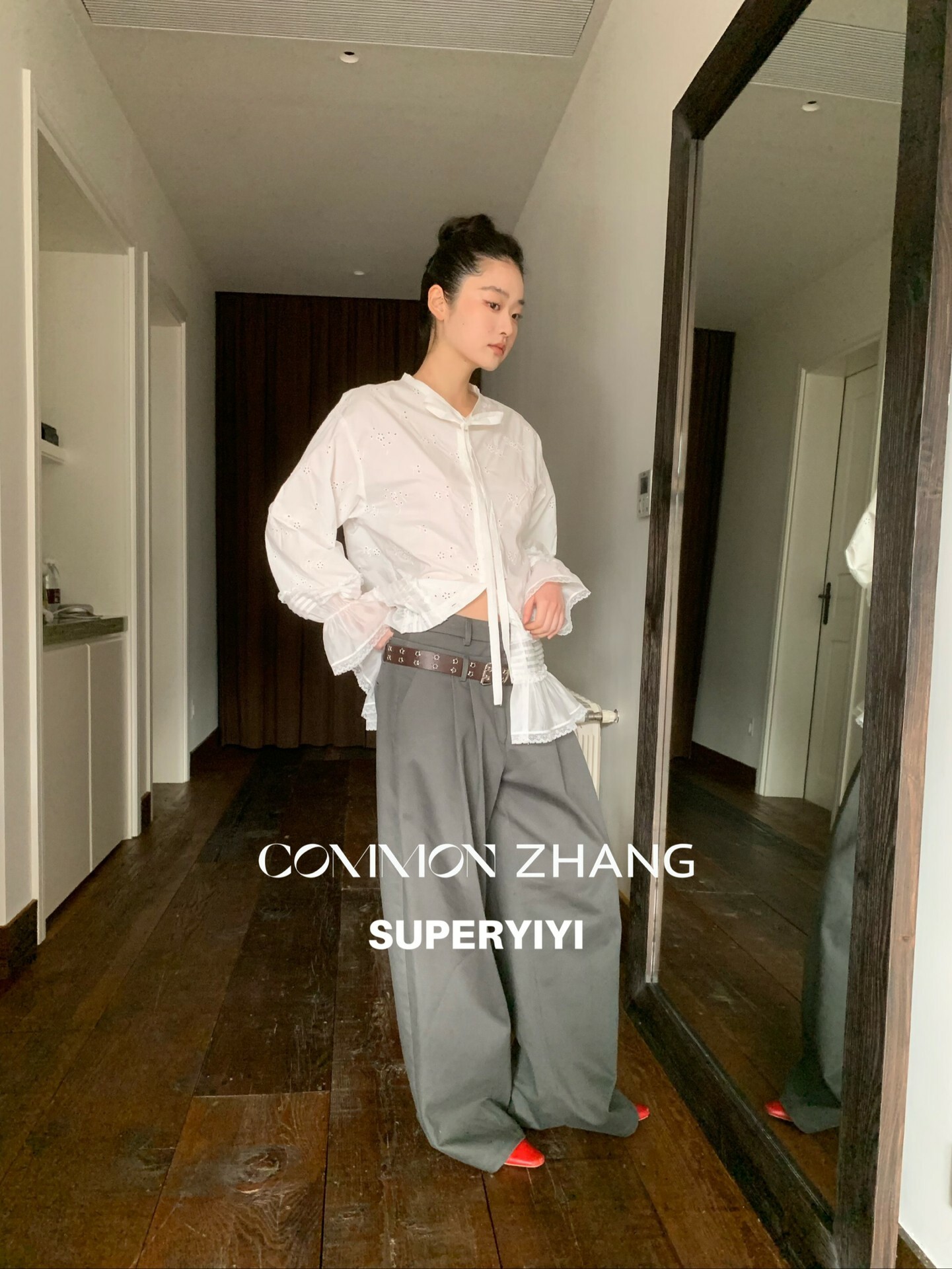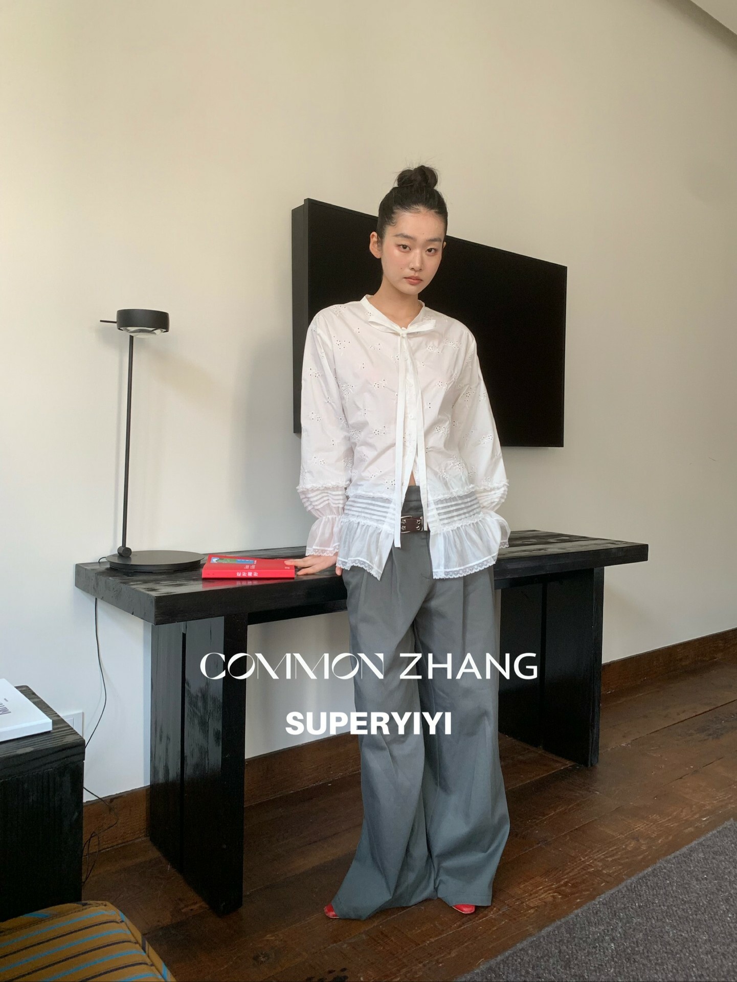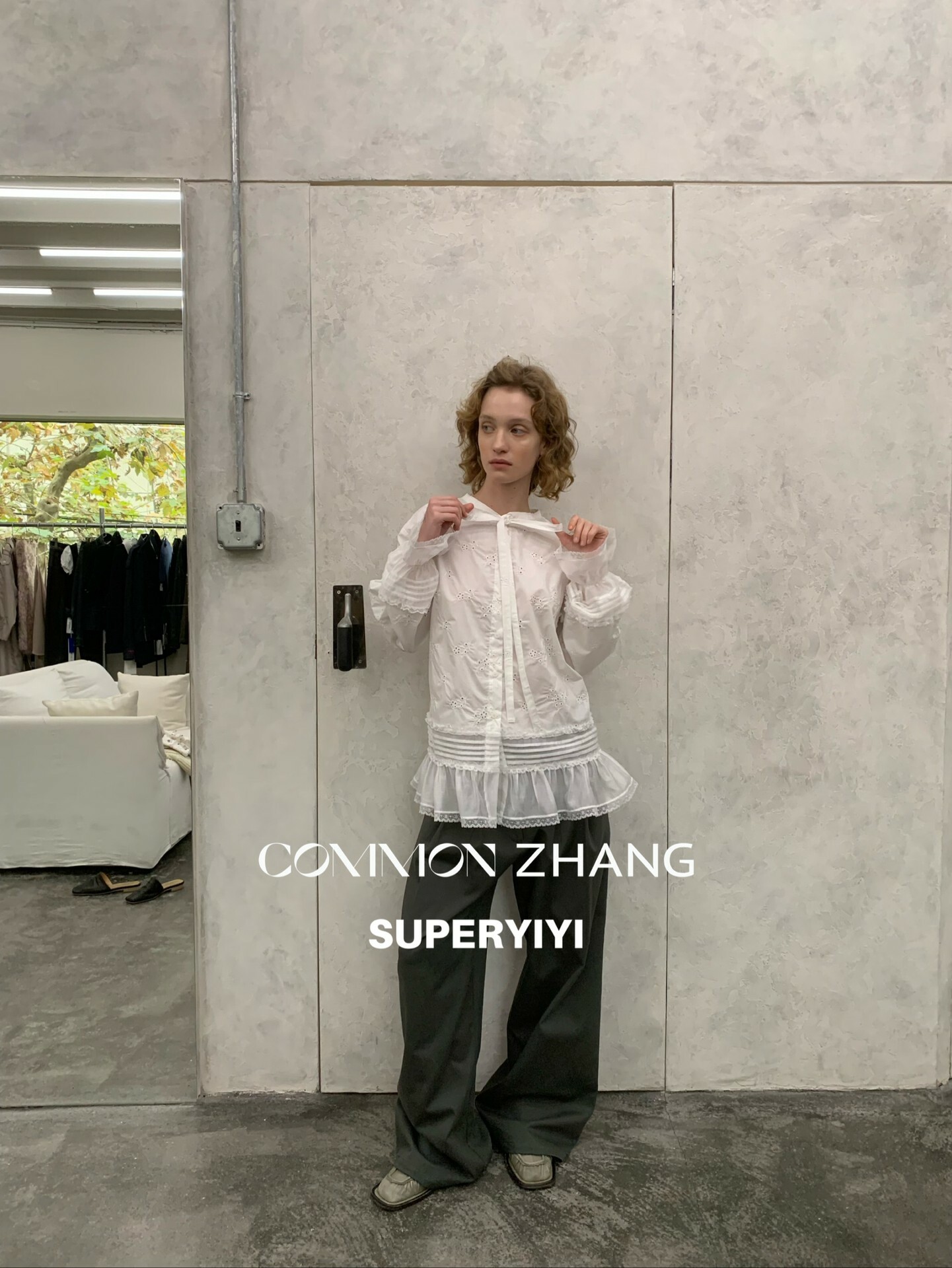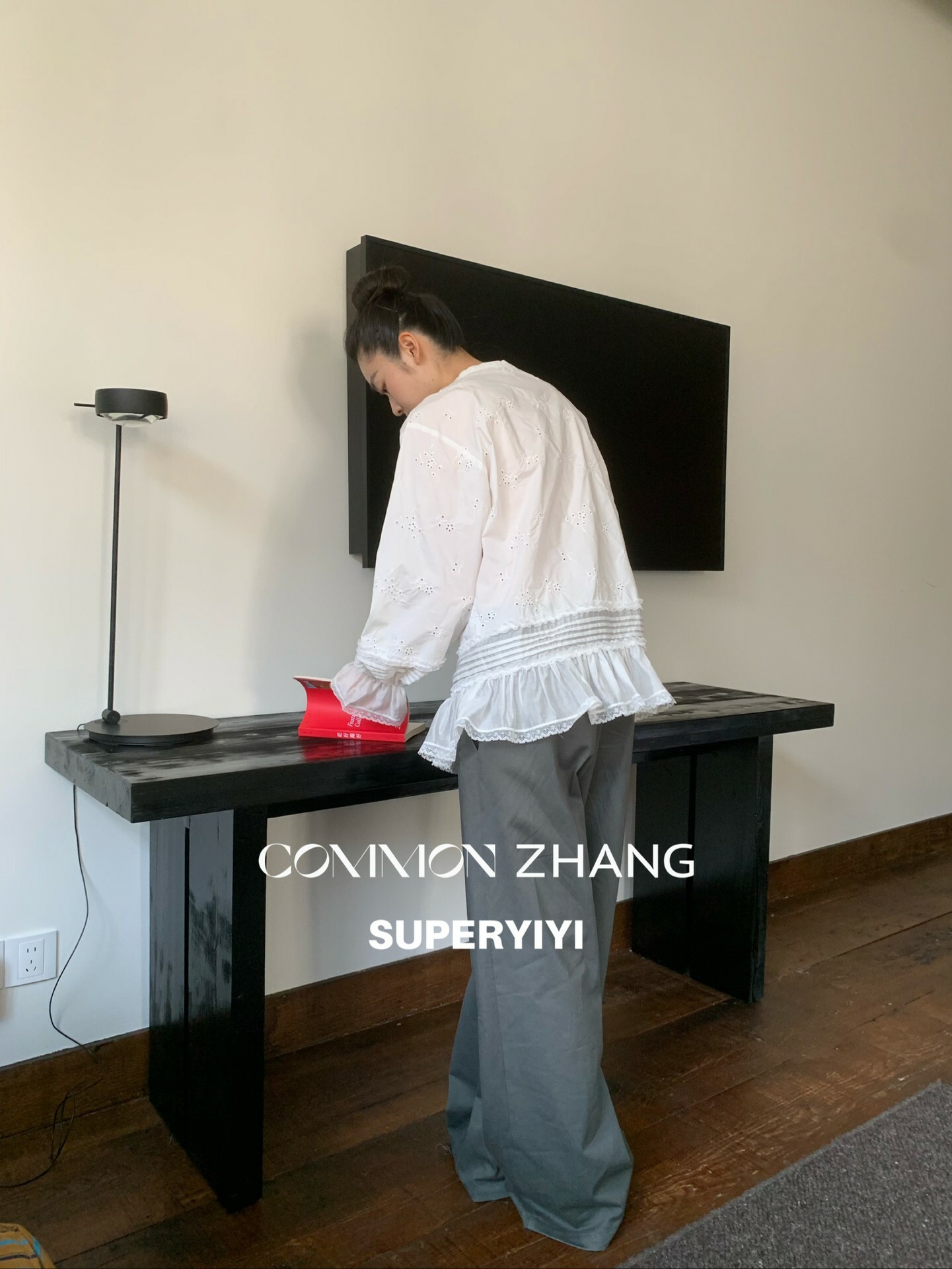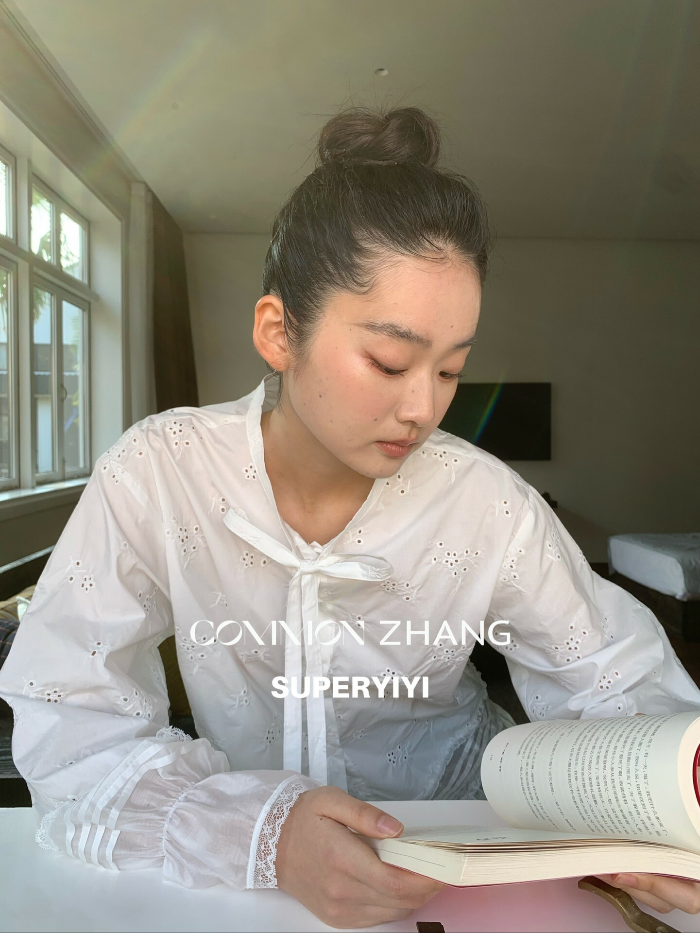 *o-ha-you*【FCZ103005】春季新款微透鏤空蕾絲邊拼接繫帶圓領長袖天絲襯衫