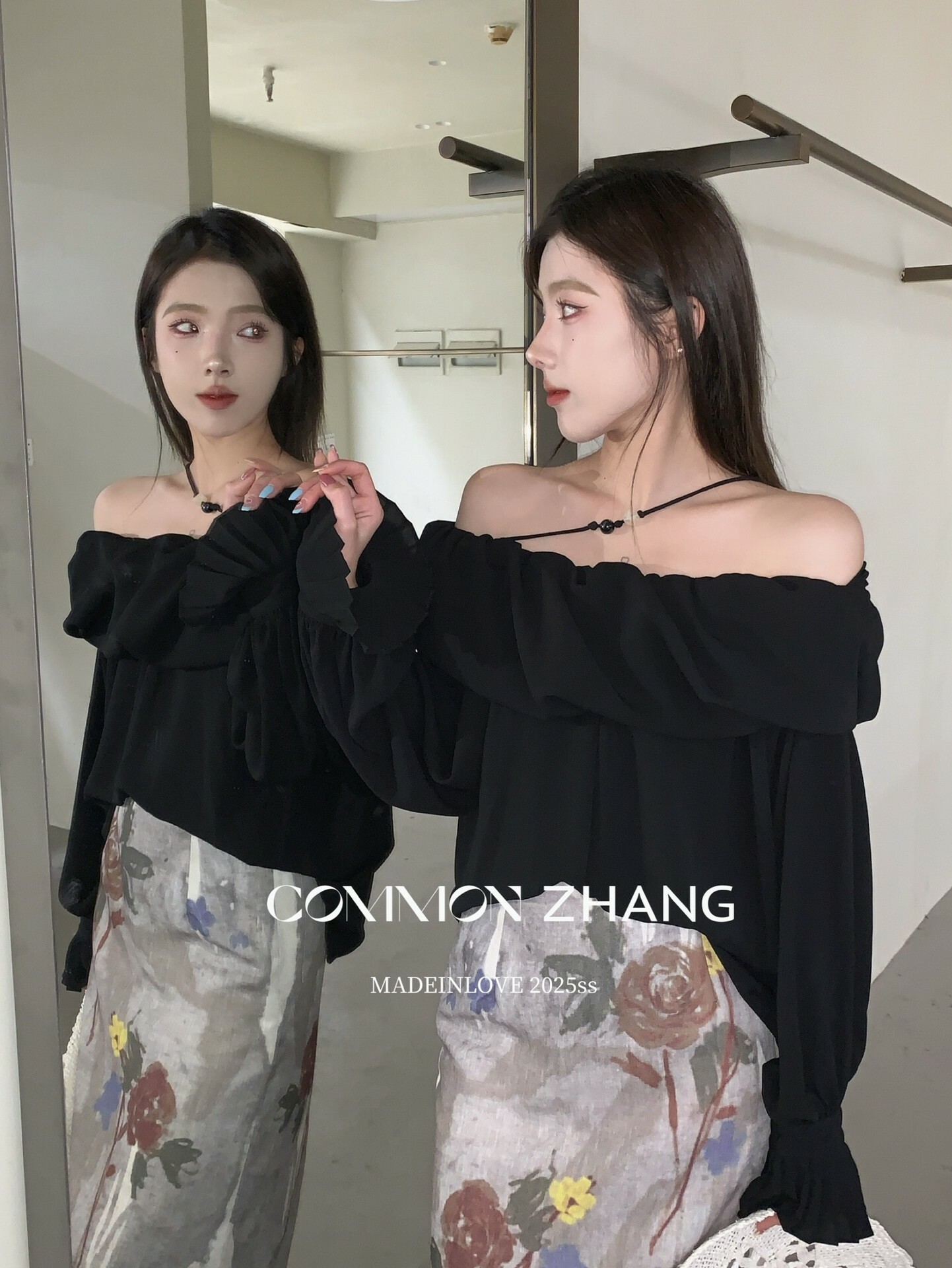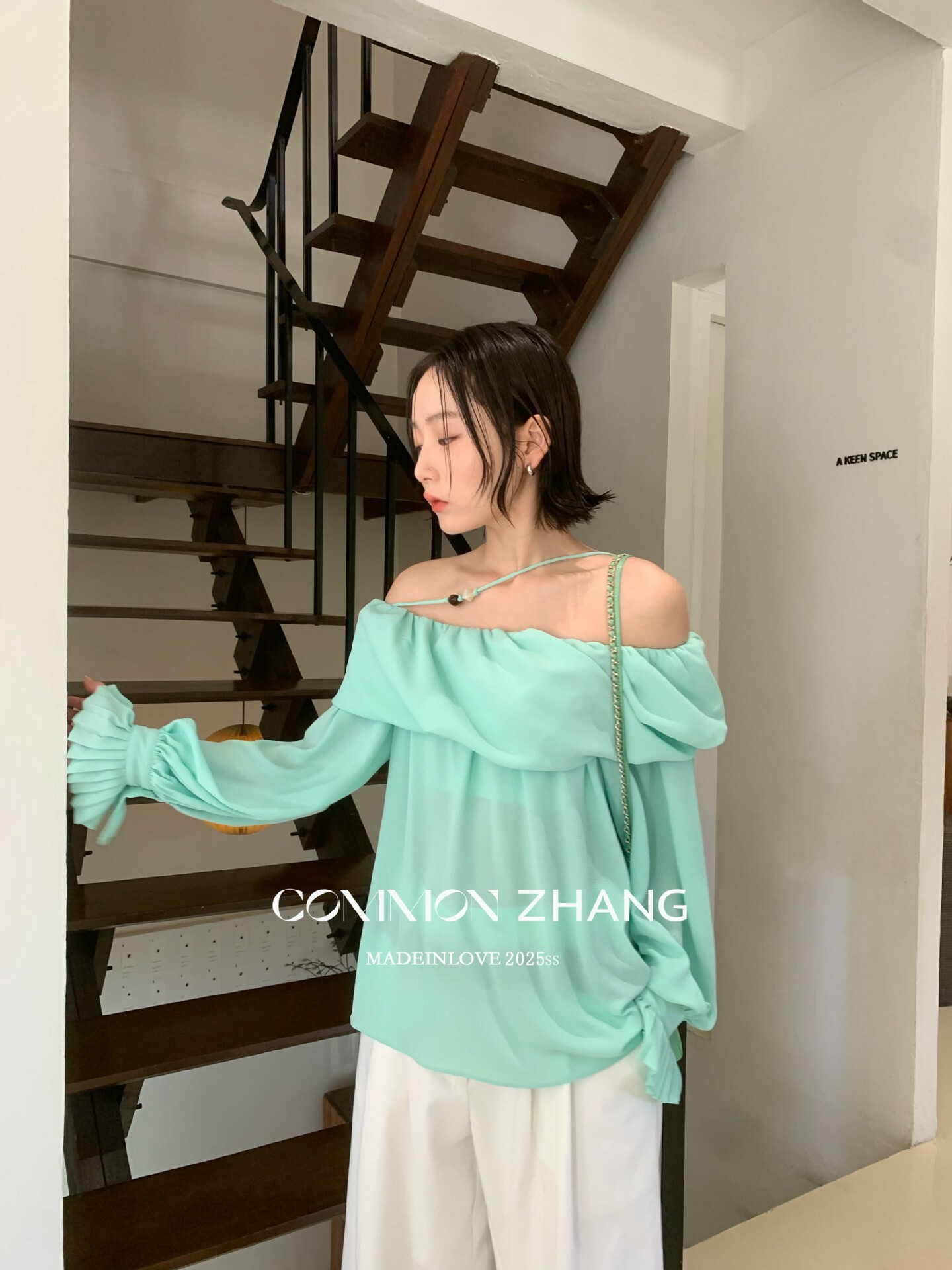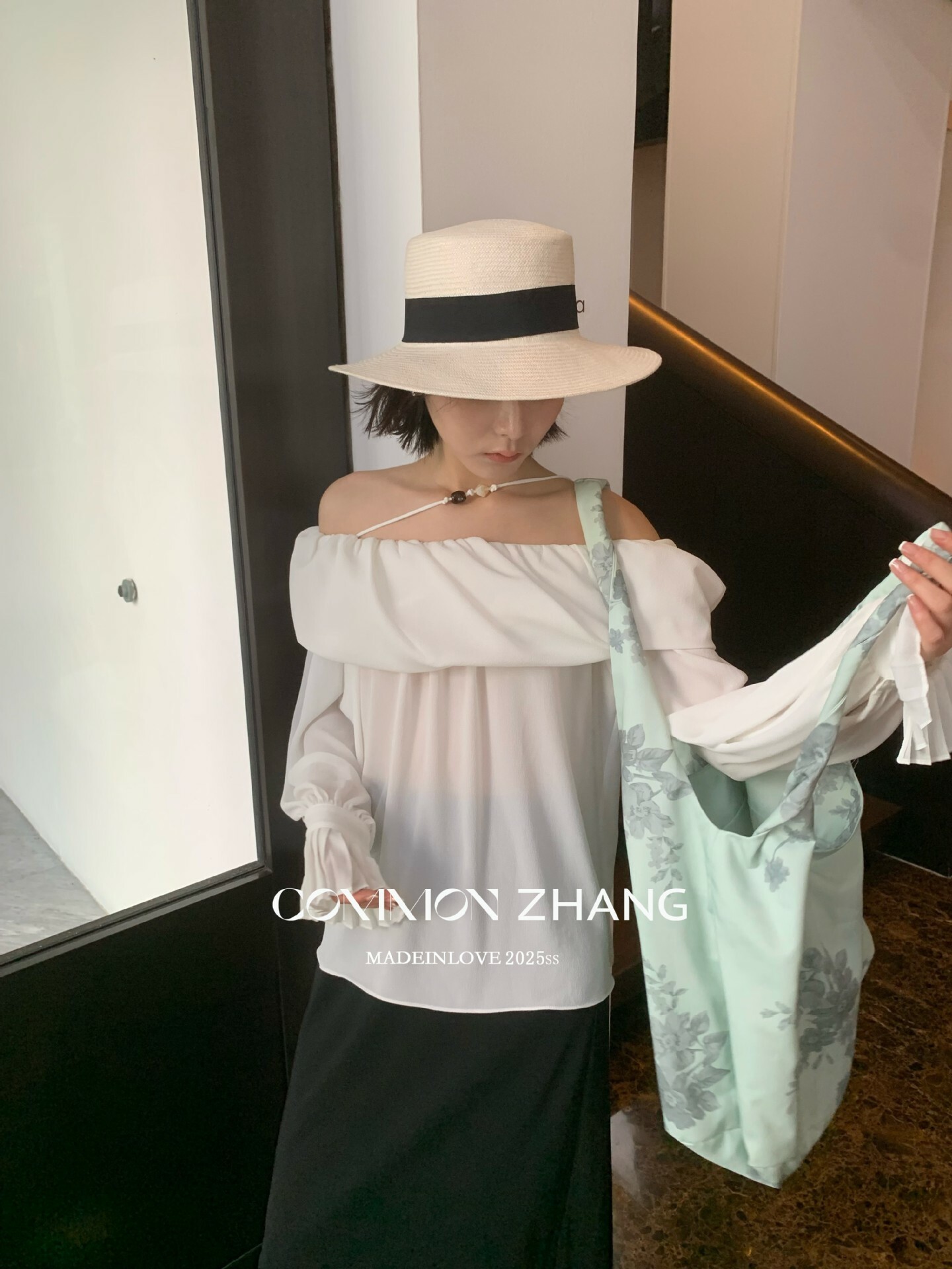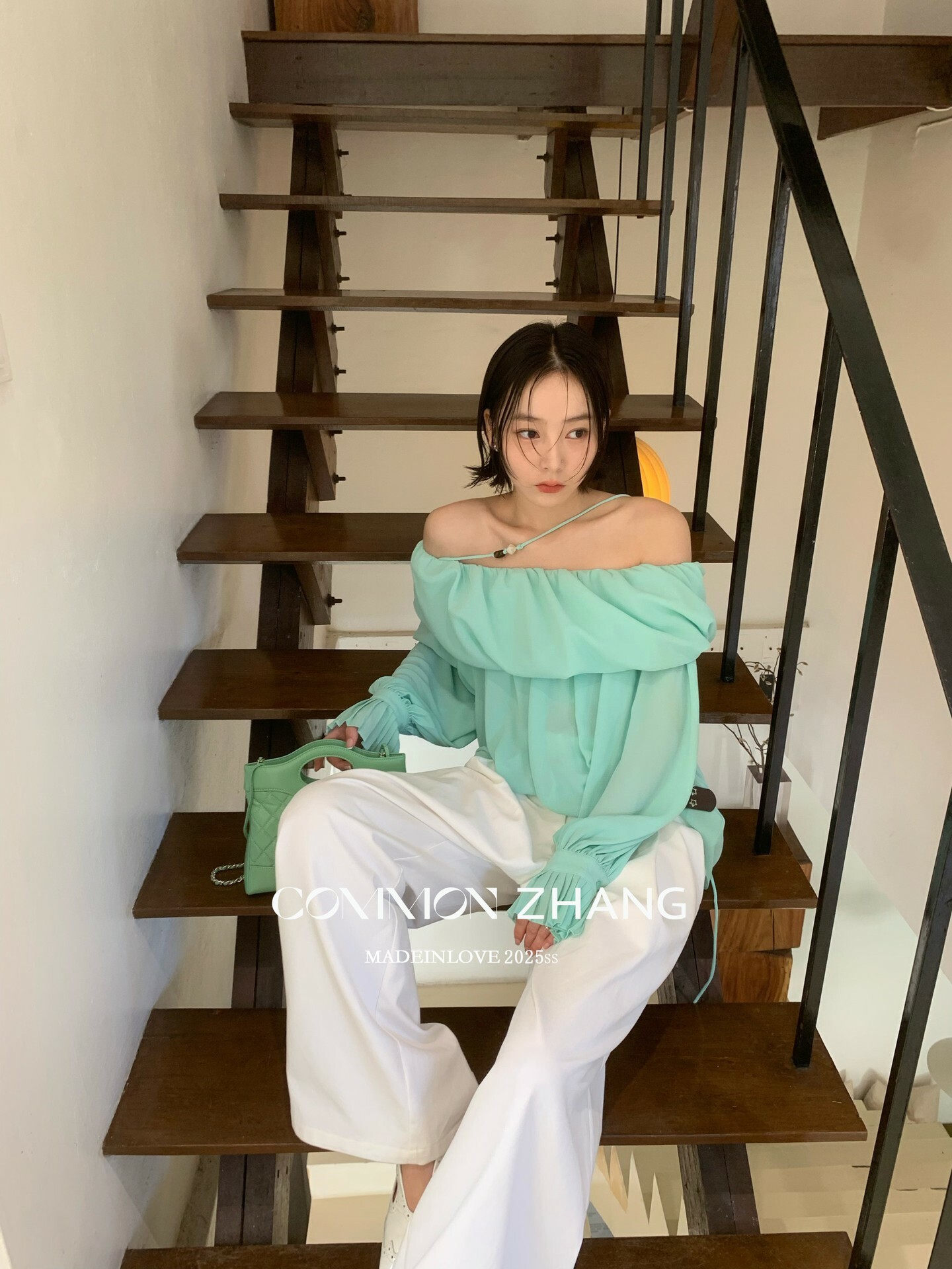 *o-ha-you*【FCZ103401】韓風淺春系一字領露肩花瓣袖慵懶度假性感網紗小衫-4色-如有需要請先諮詢