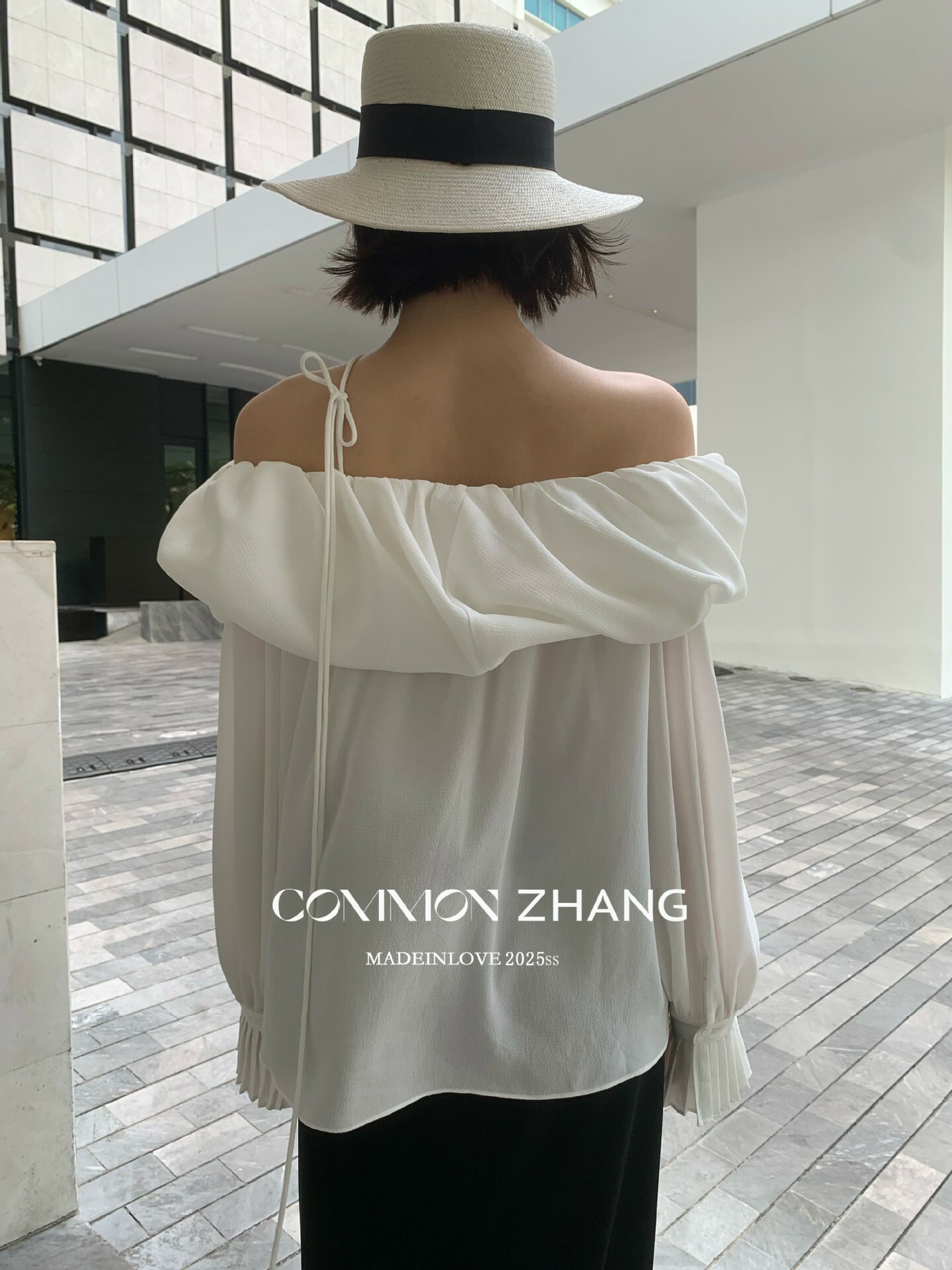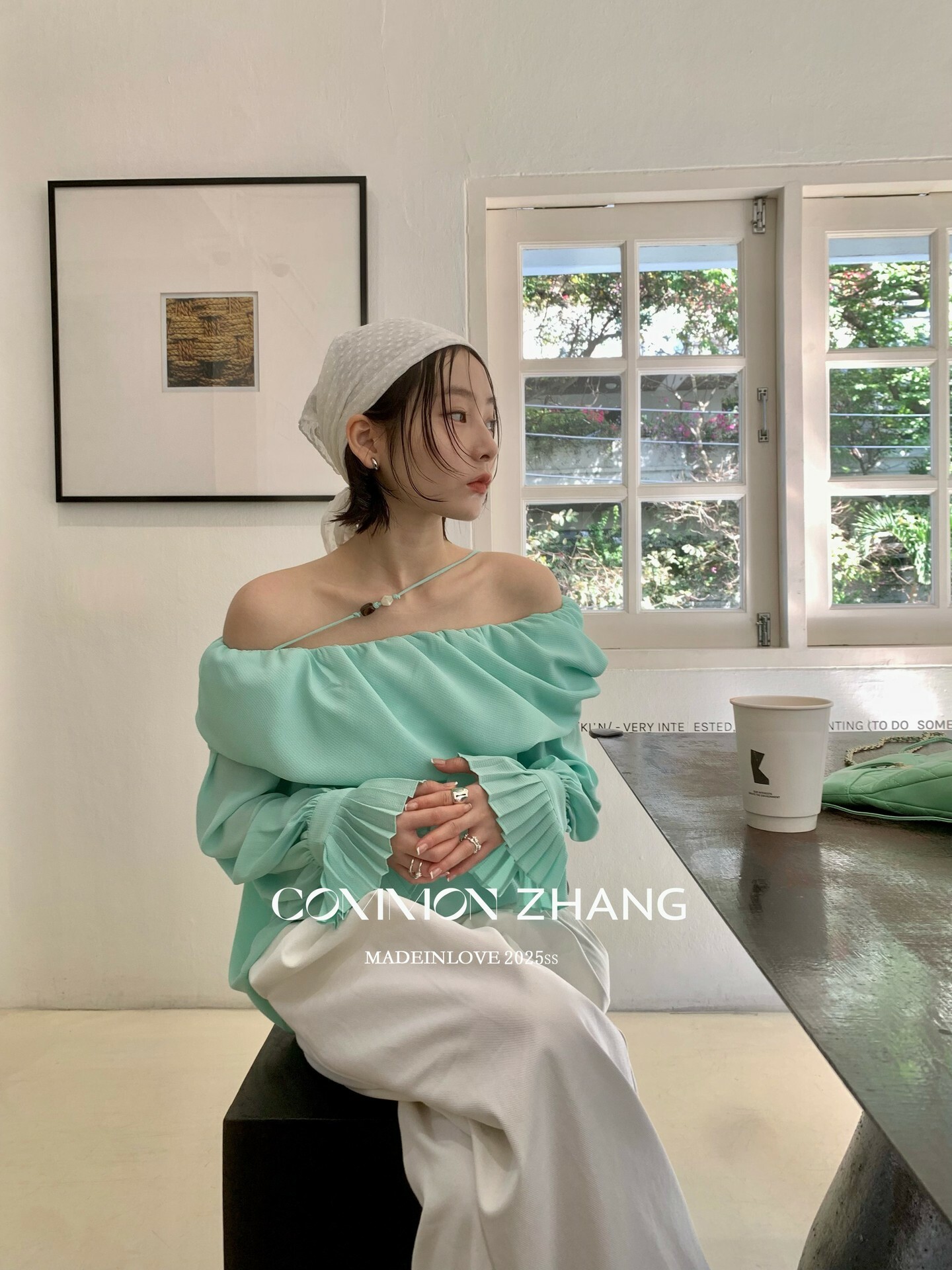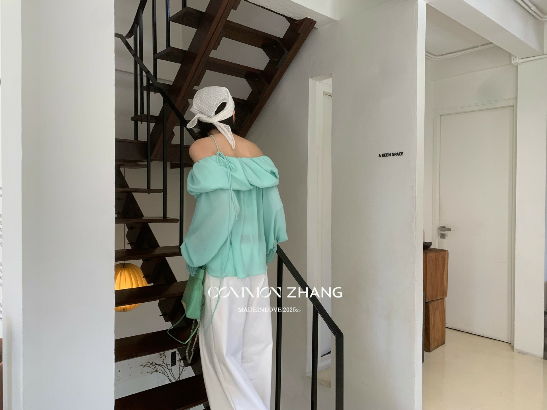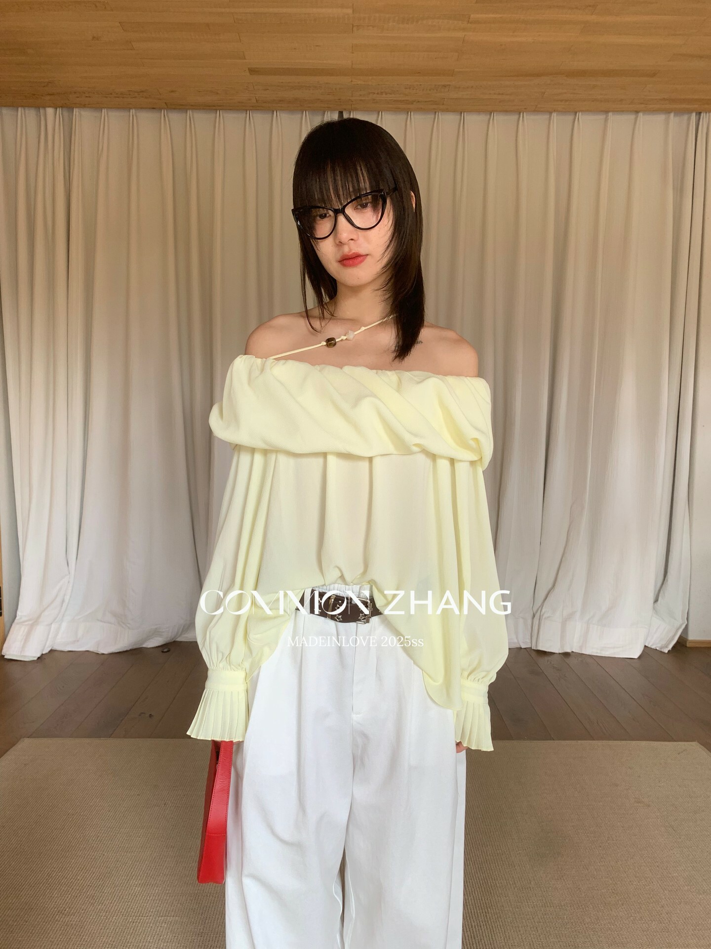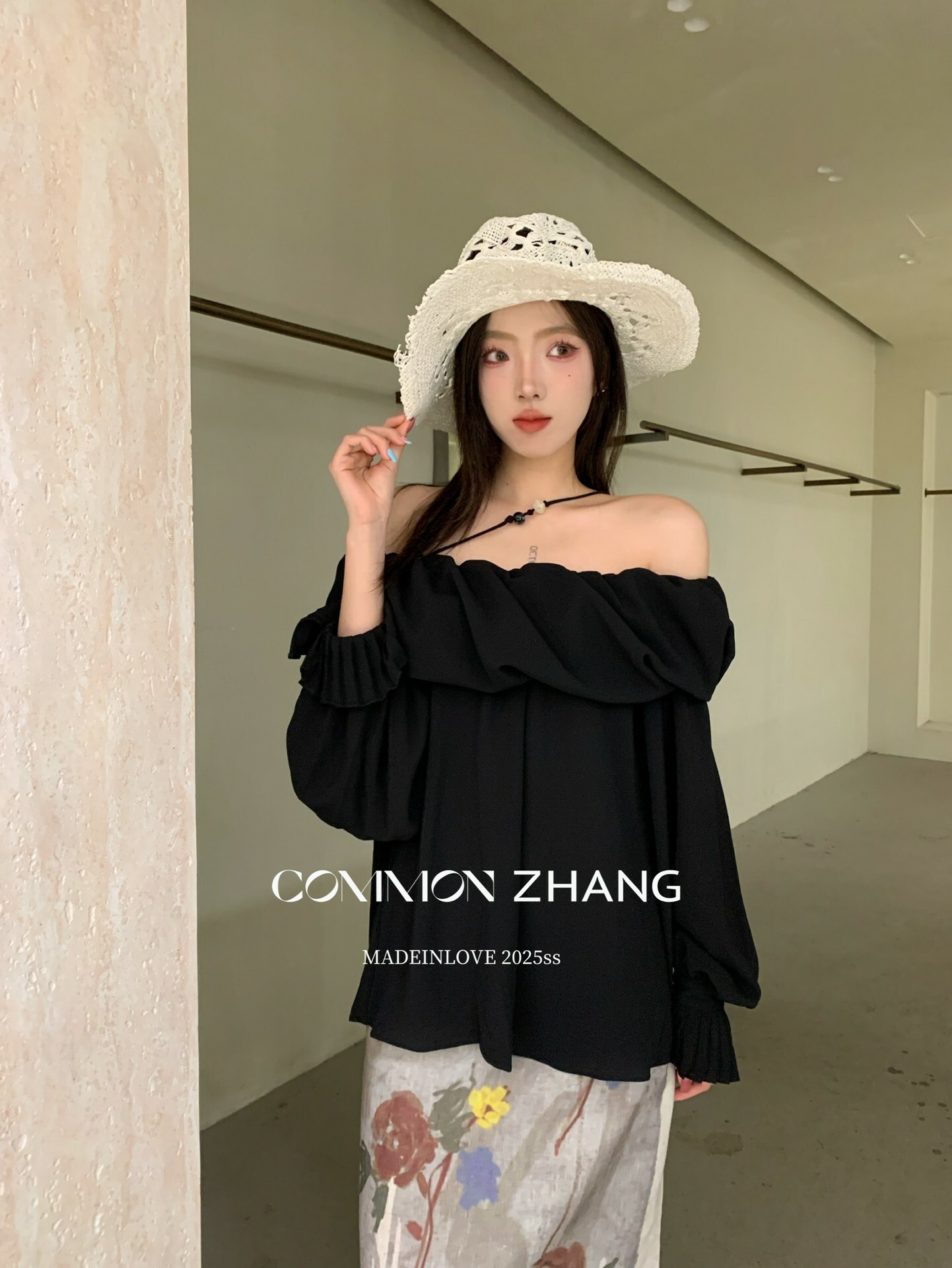 *o-ha-you*【FCZ103401】韓風淺春系一字領露肩花瓣袖慵懶度假性感網紗小衫-4色-如有需要請先諮詢