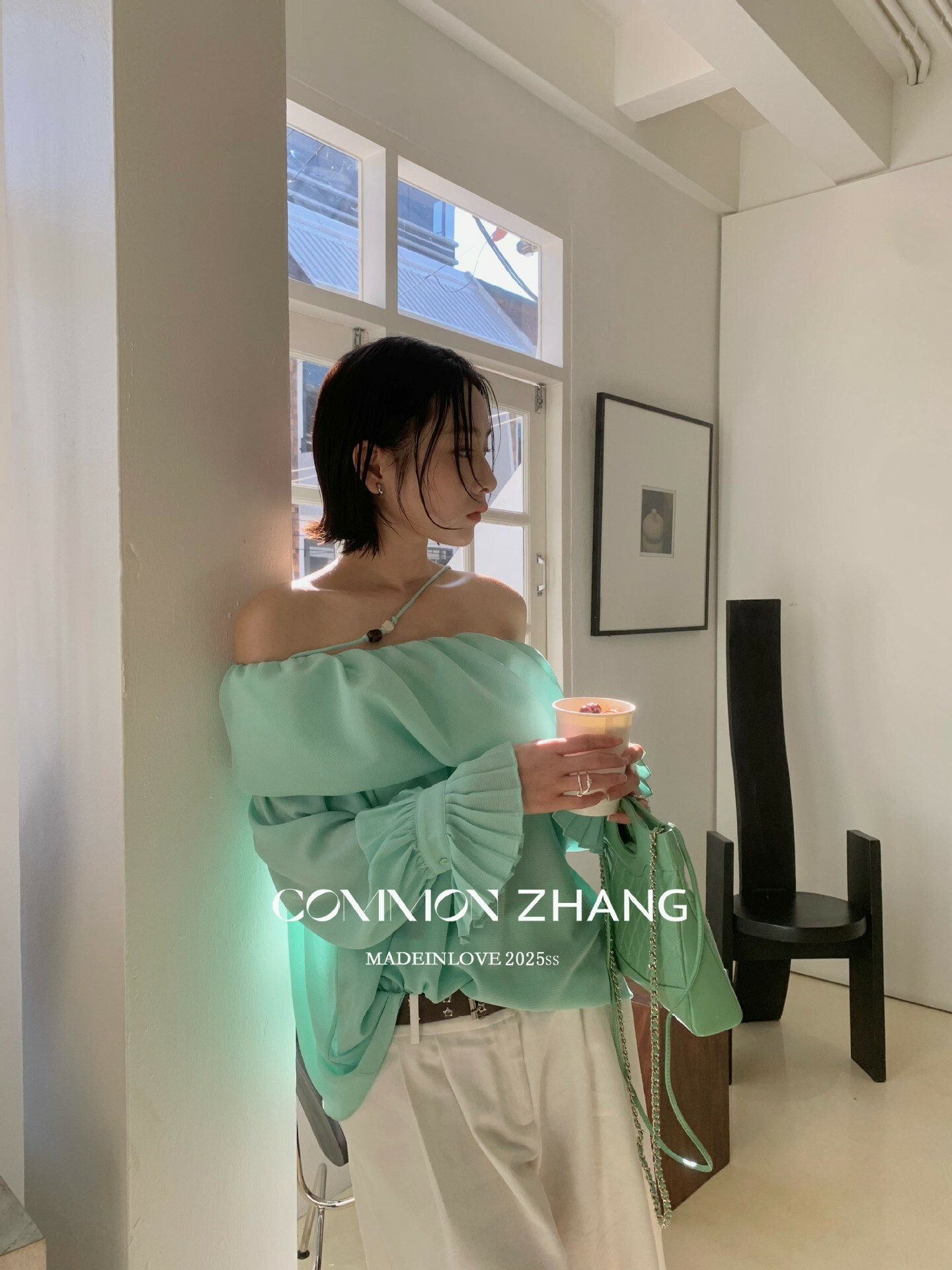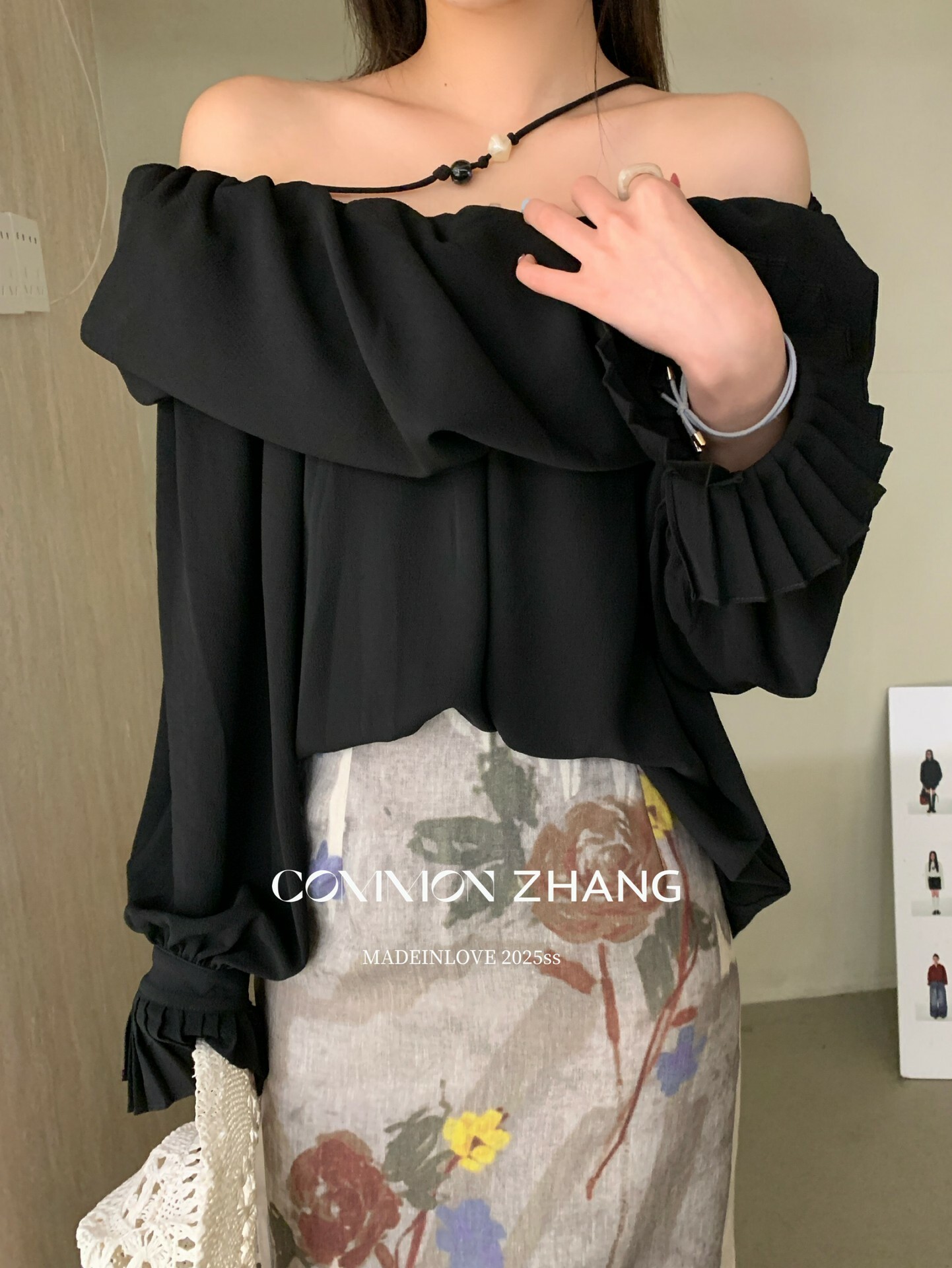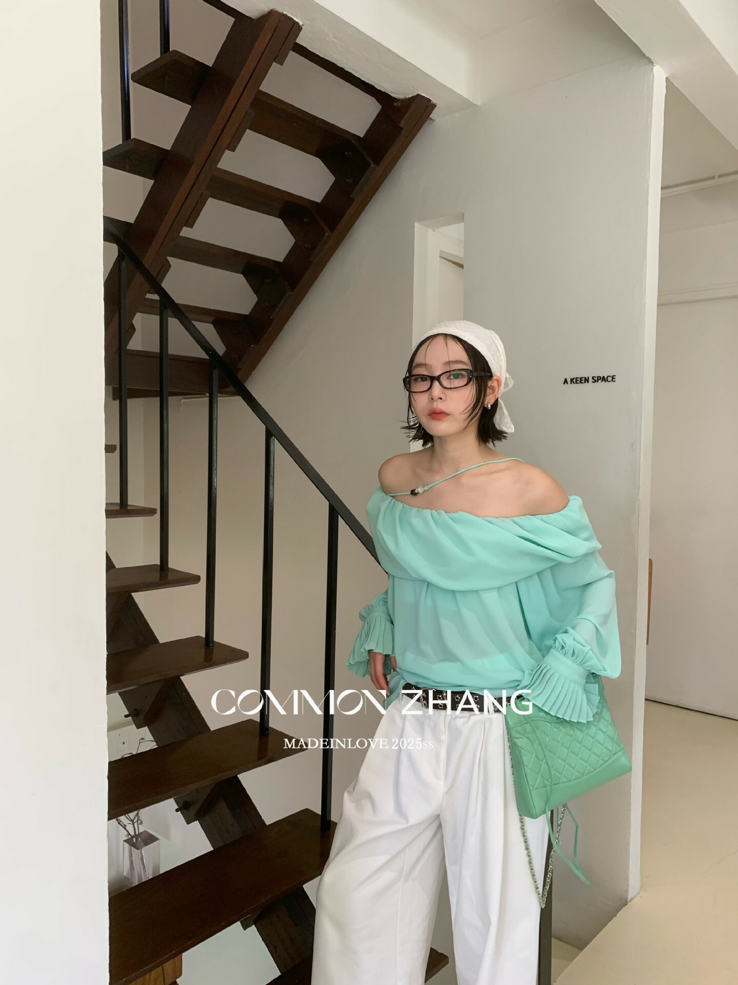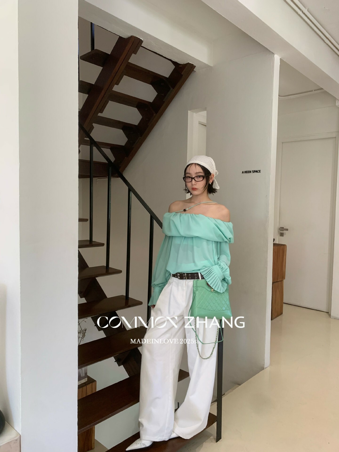 *o-ha-you*【FCZ103401】韓風淺春系一字領露肩花瓣袖慵懶度假性感網紗小衫-4色-如有需要請先諮詢