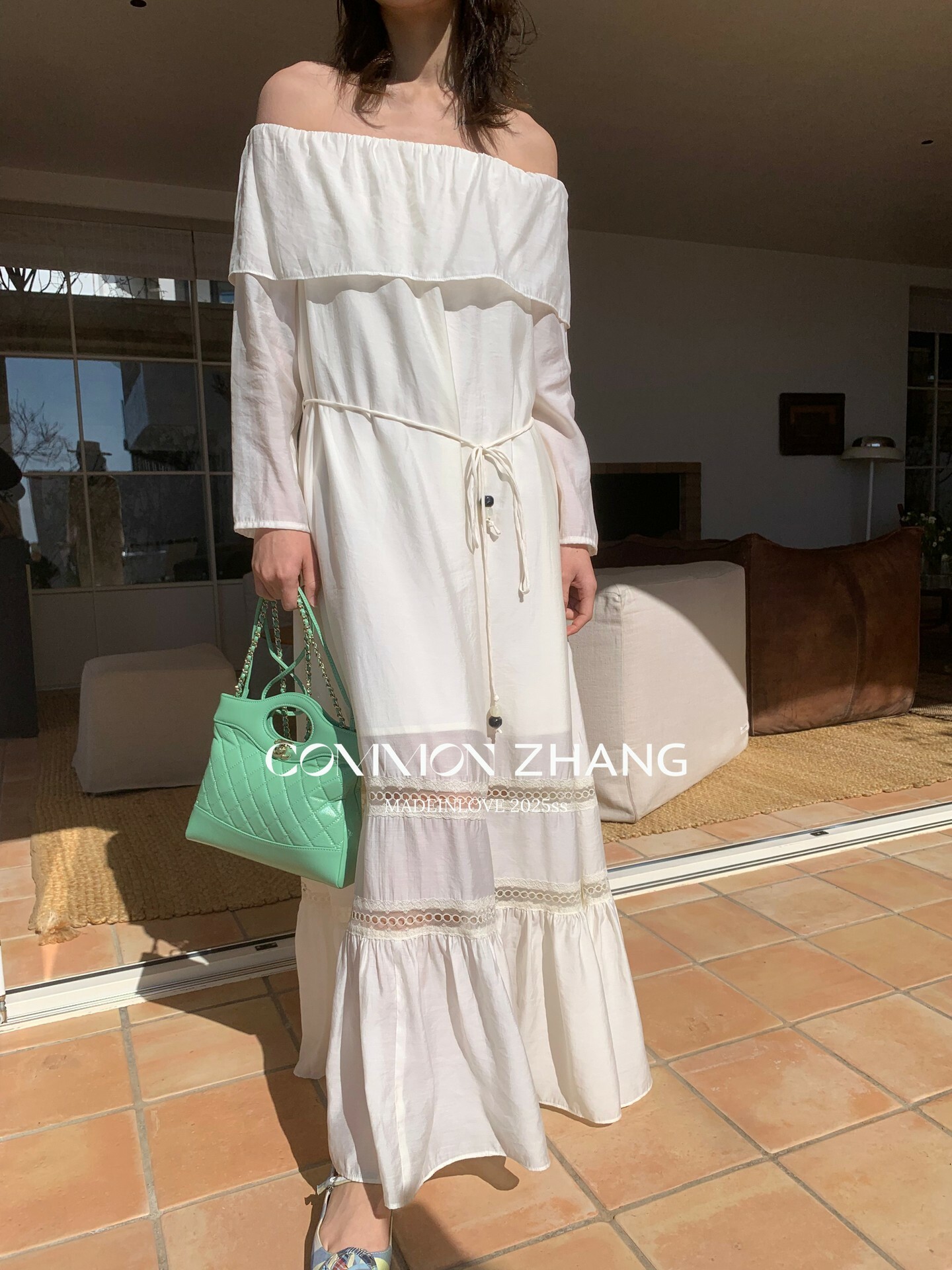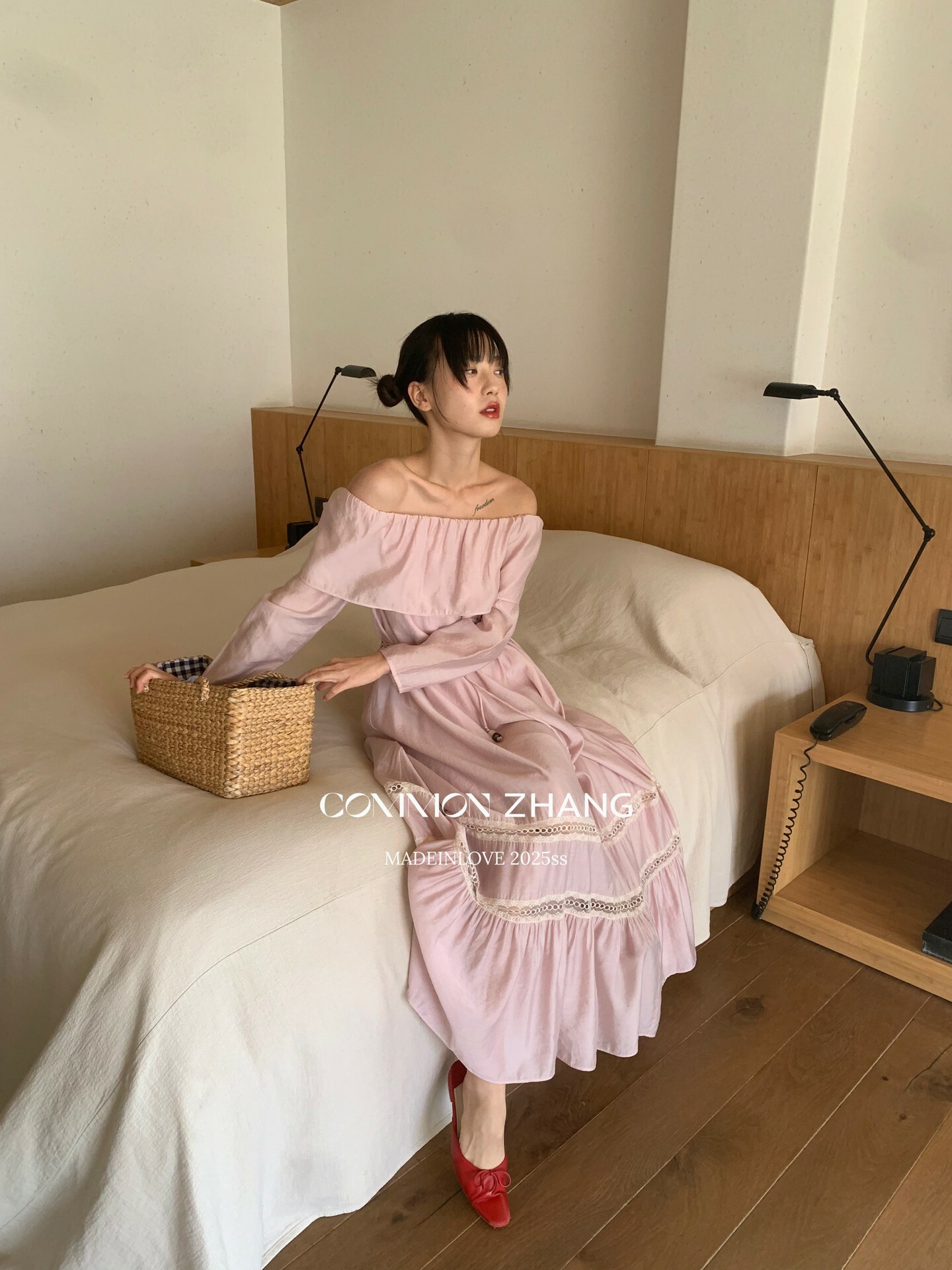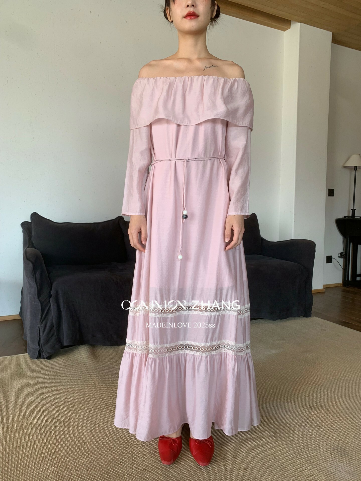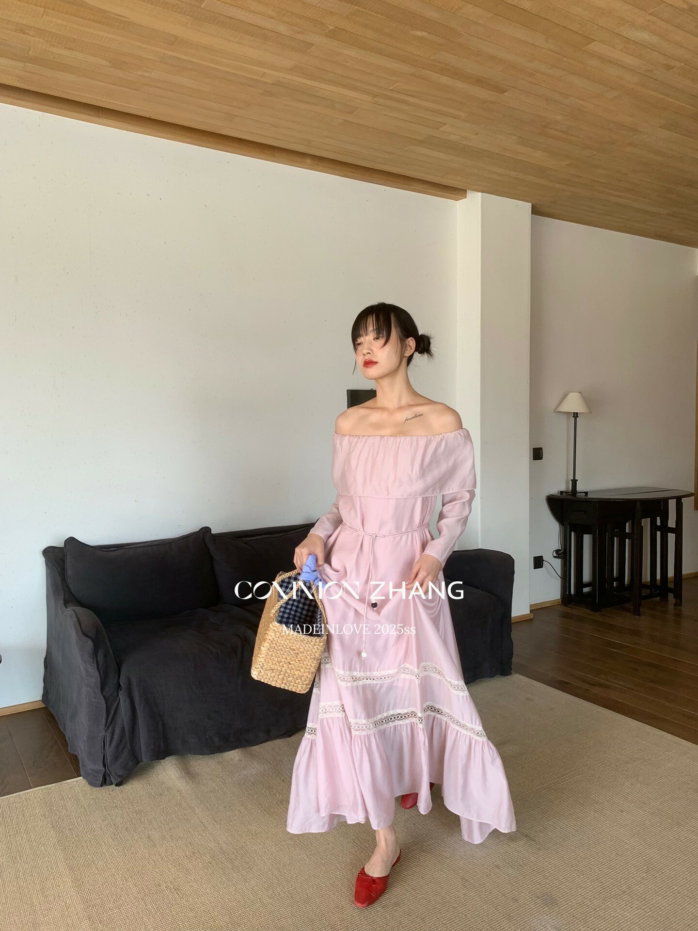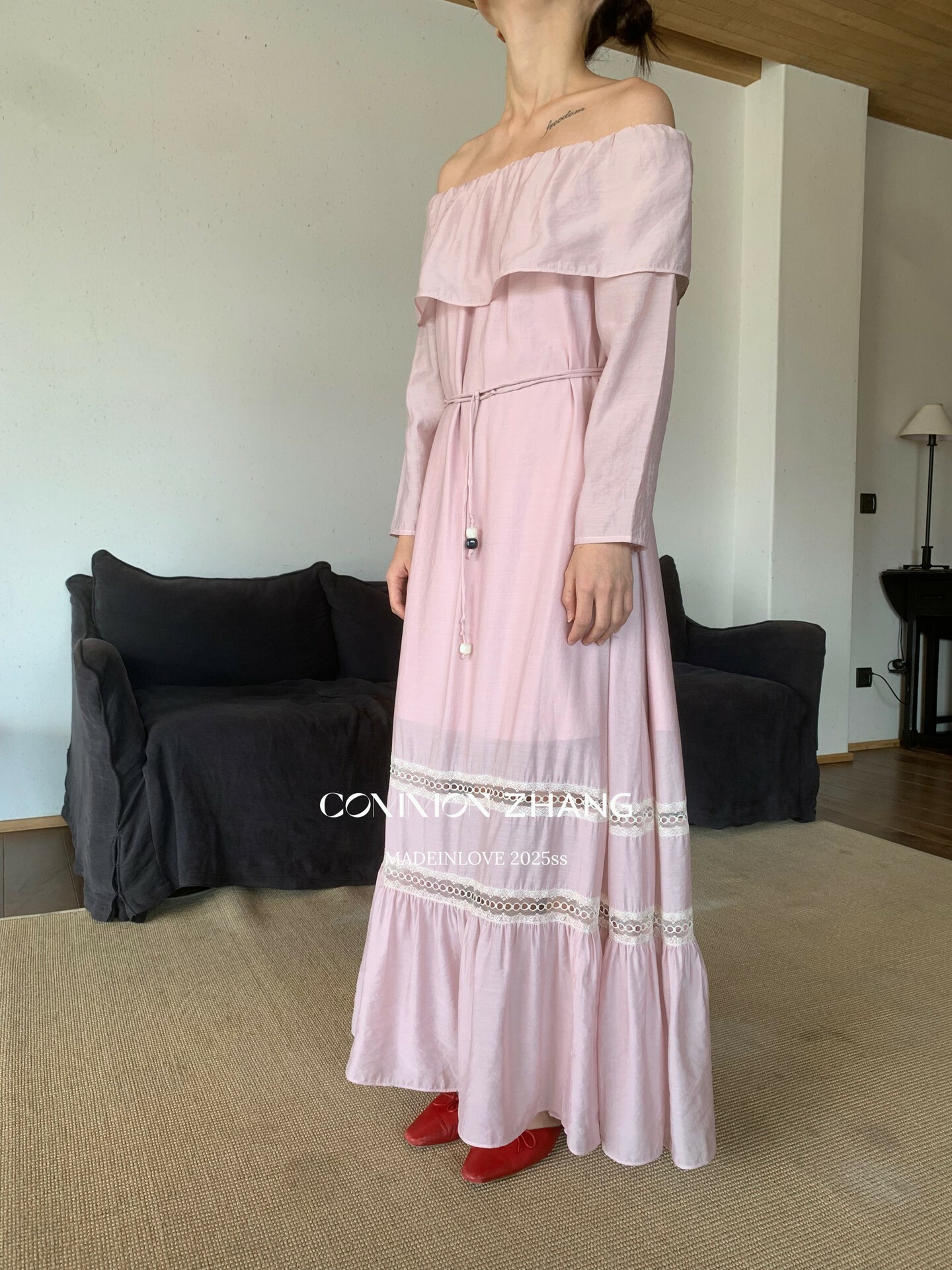 *o-ha-you*【FCZ106426】春季一字領性感露肩蕾絲微透繫帶收腰質感A字連衣裙洋裝-2色