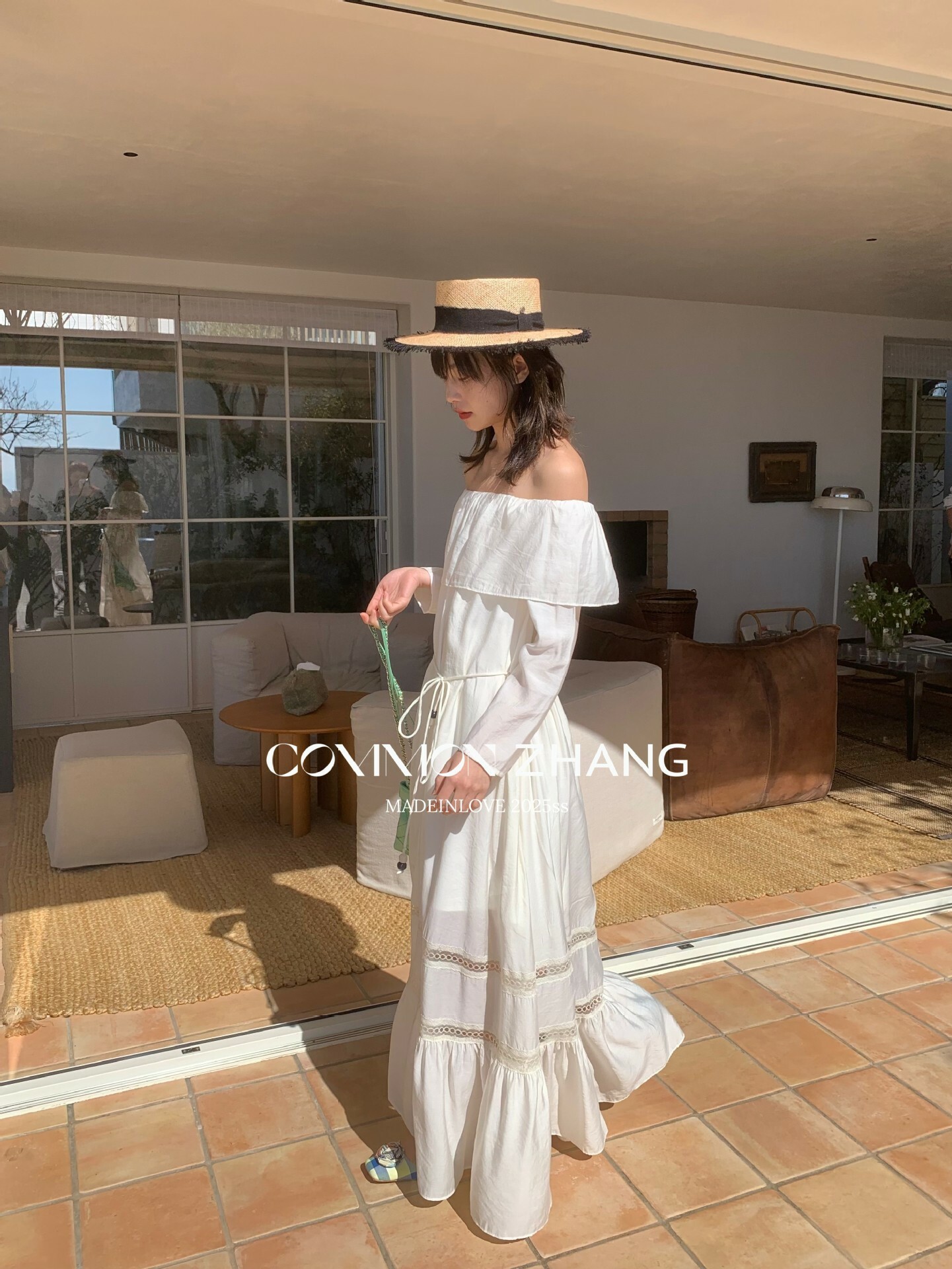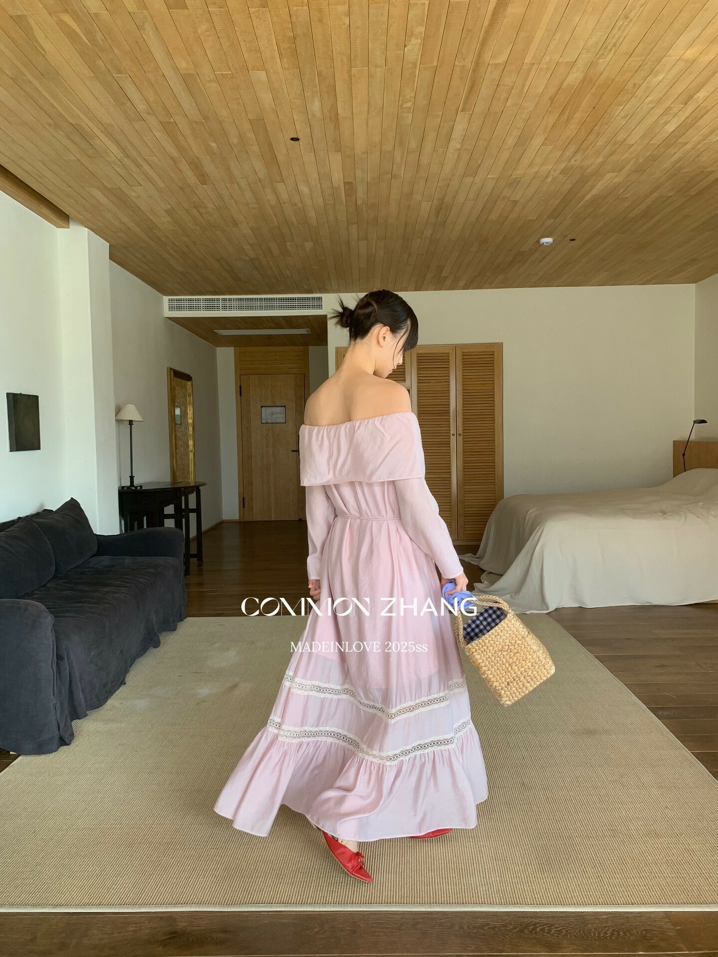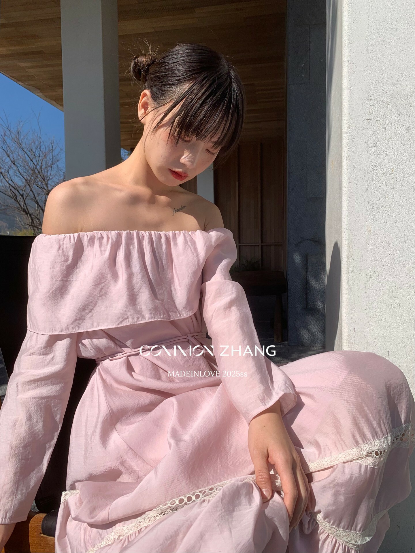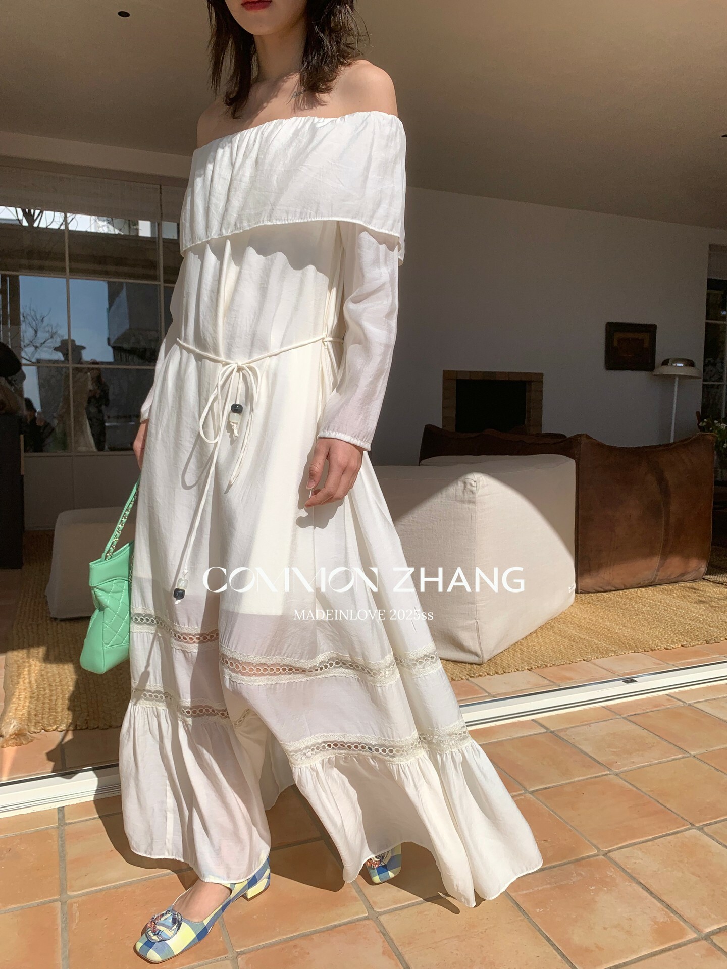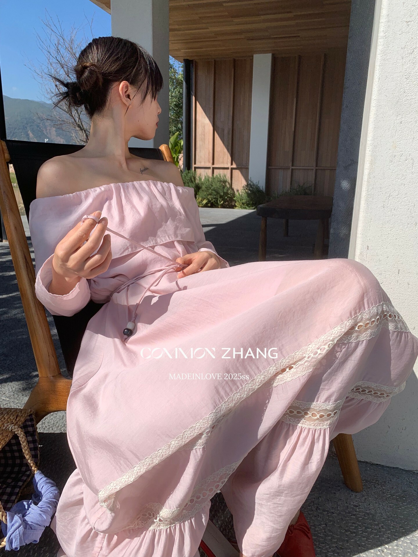 *o-ha-you*【FCZ106426】春季一字領性感露肩蕾絲微透繫帶收腰質感A字連衣裙洋裝-2色