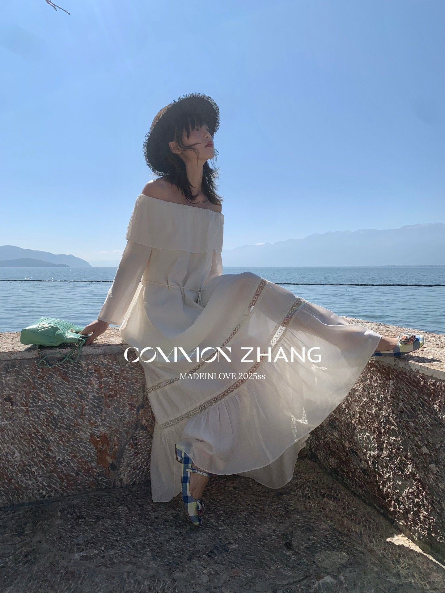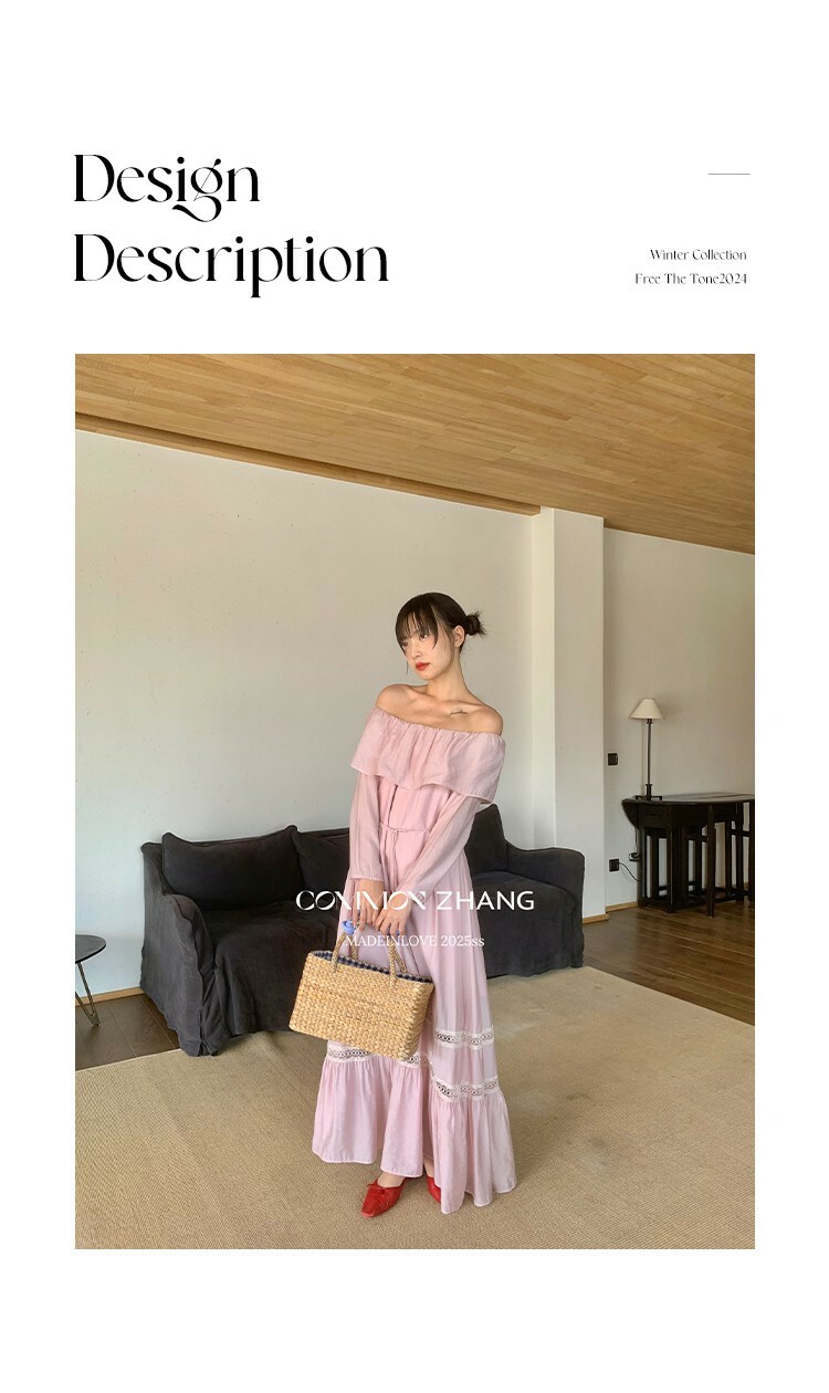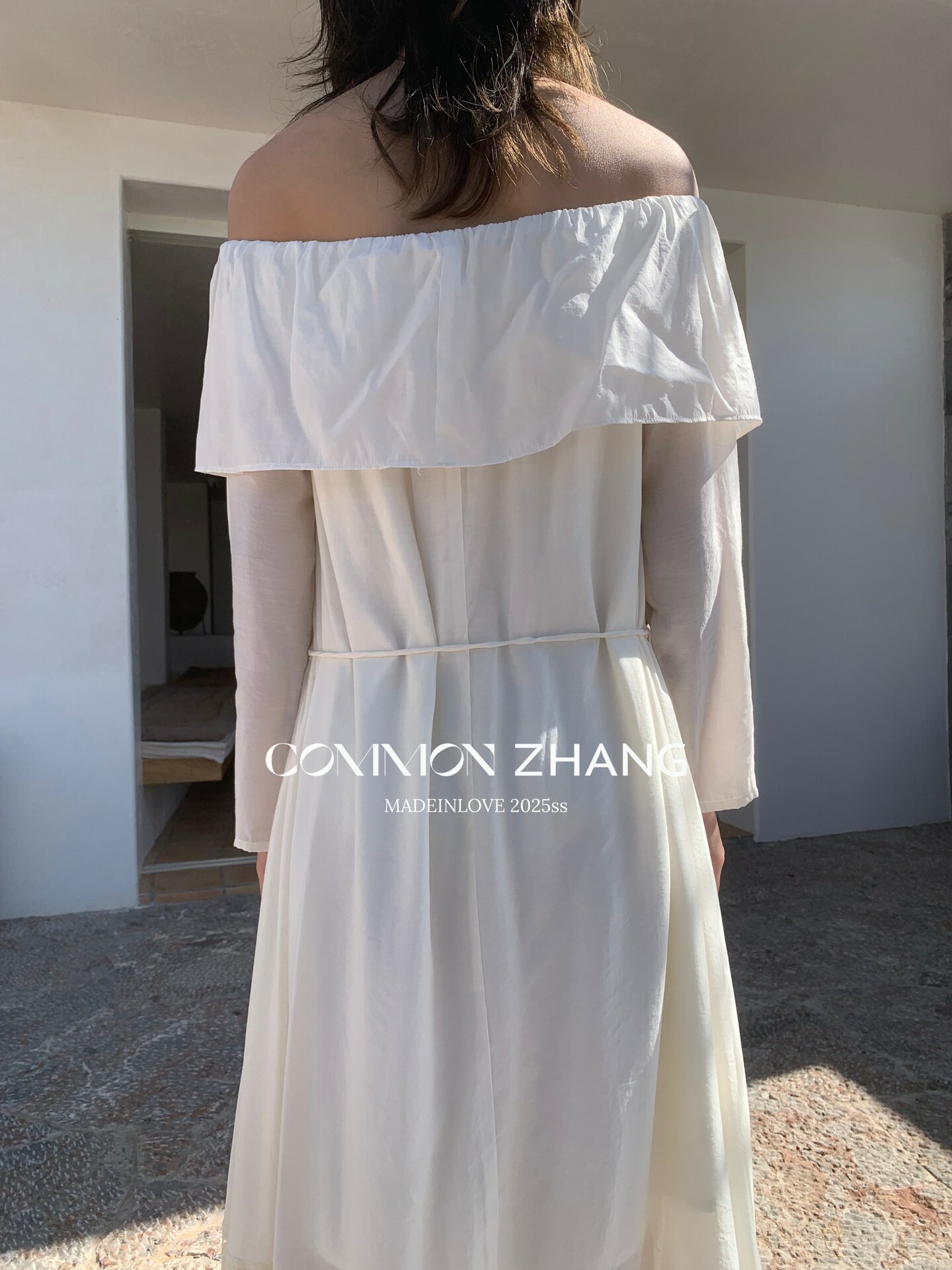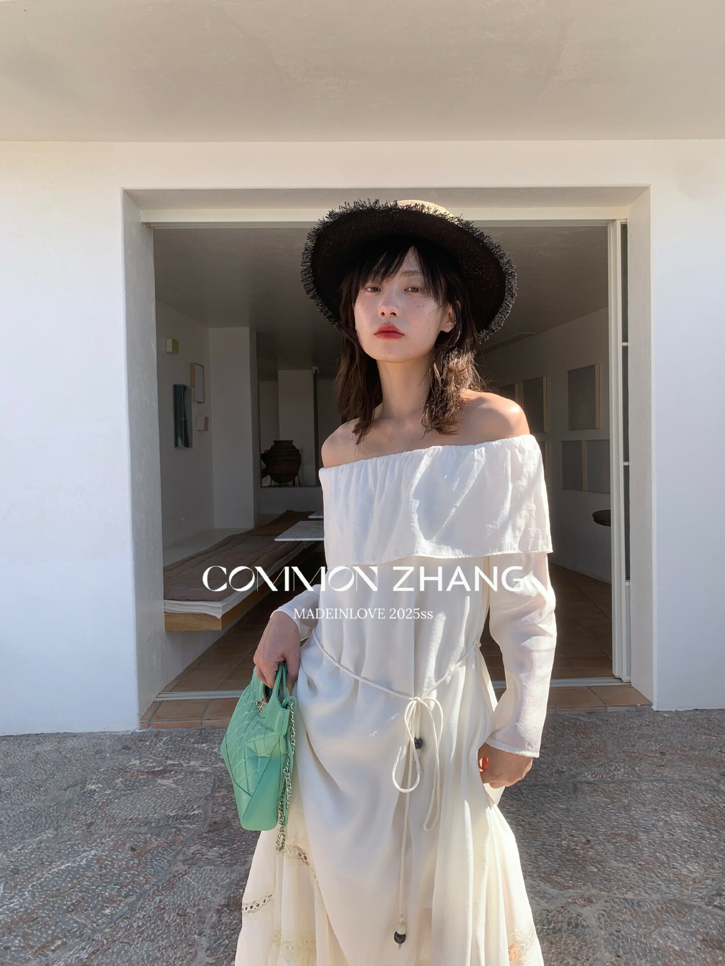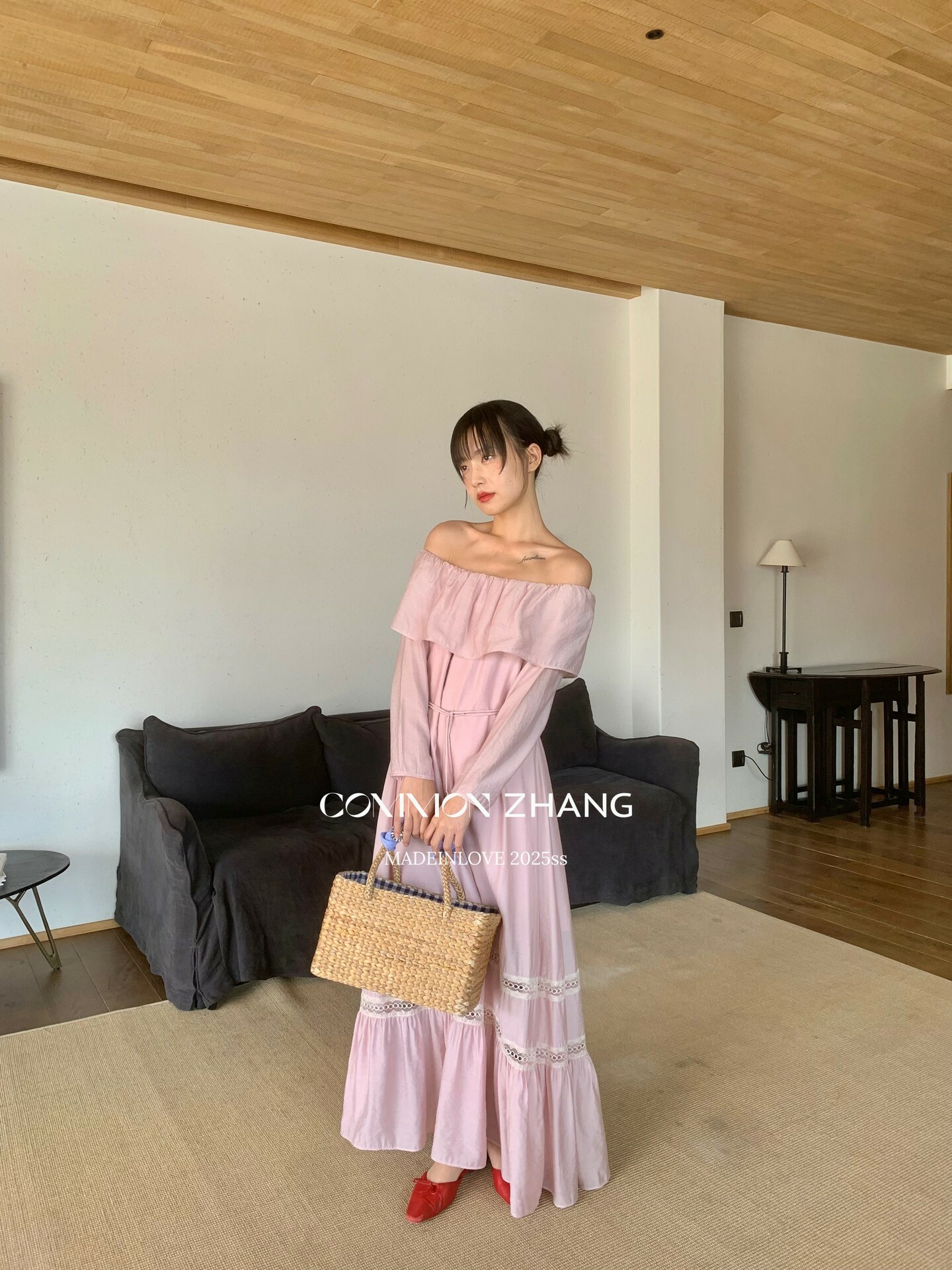 *o-ha-you*【FCZ106426】春季一字領性感露肩蕾絲微透繫帶收腰質感A字連衣裙洋裝-2色