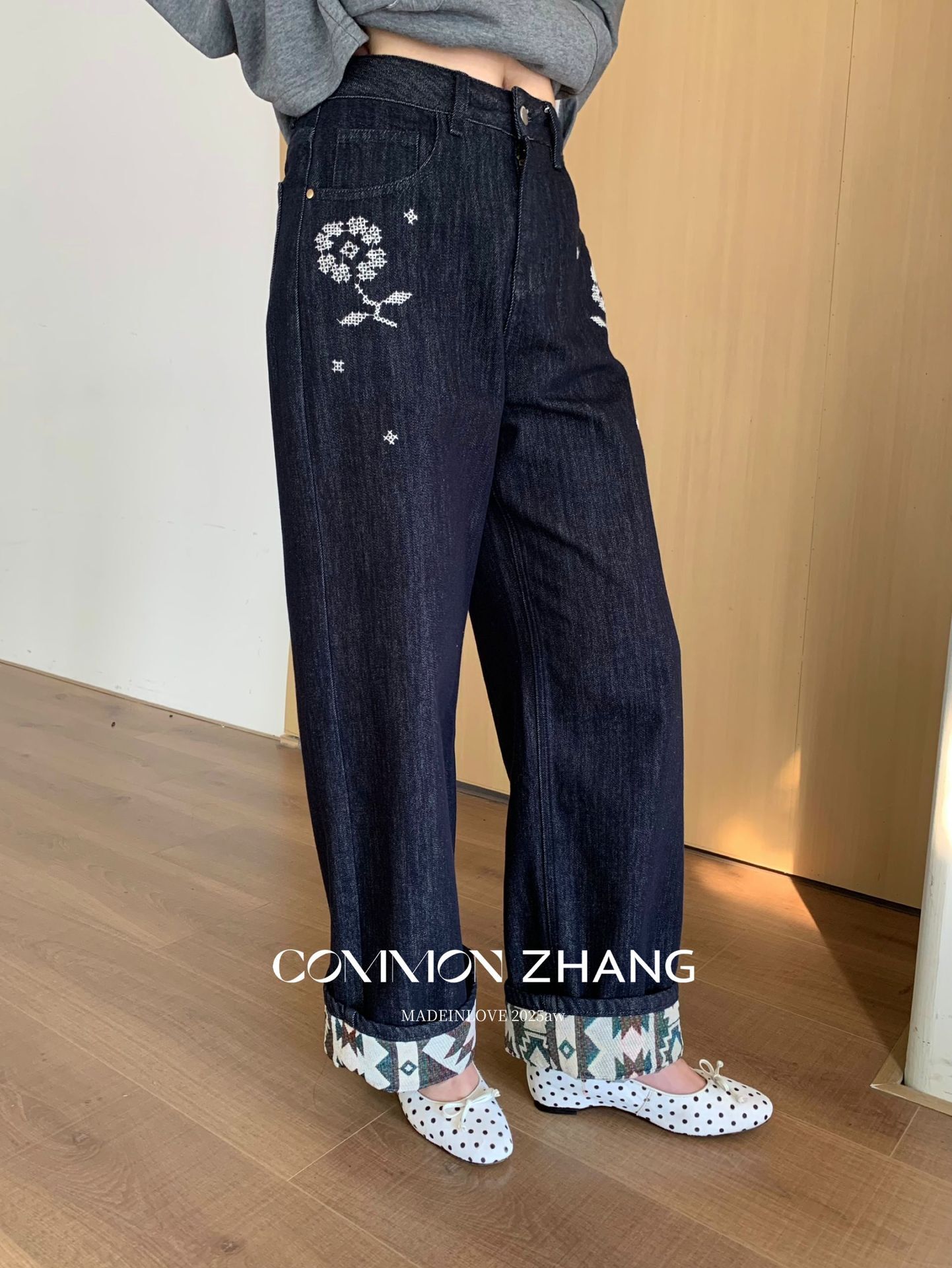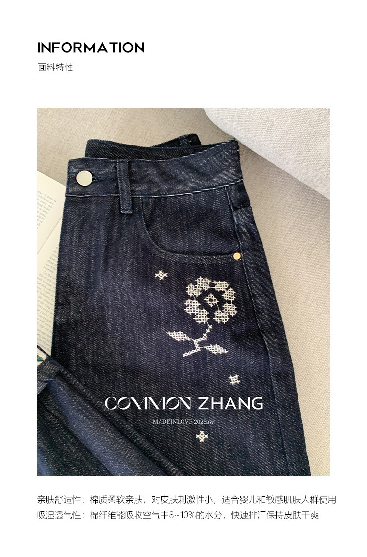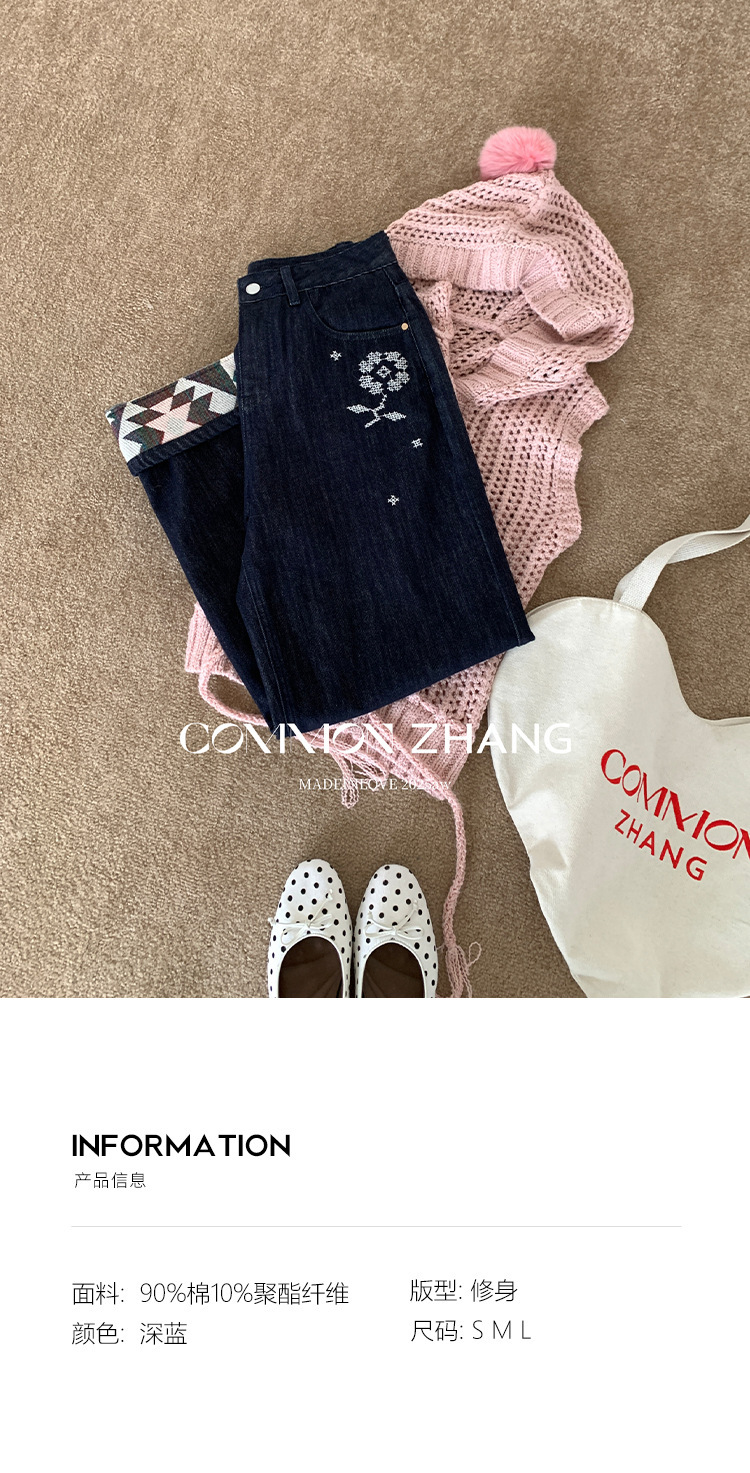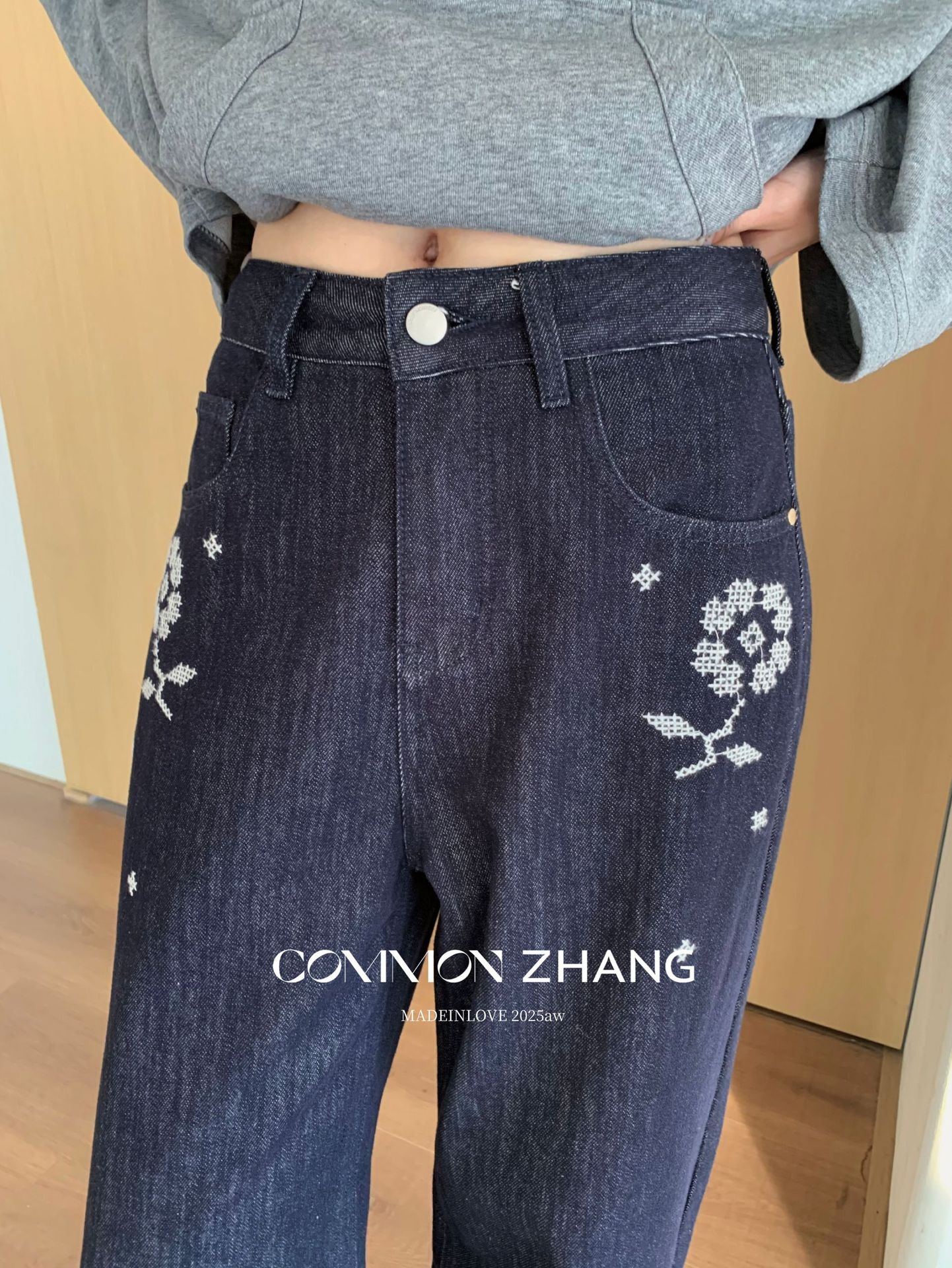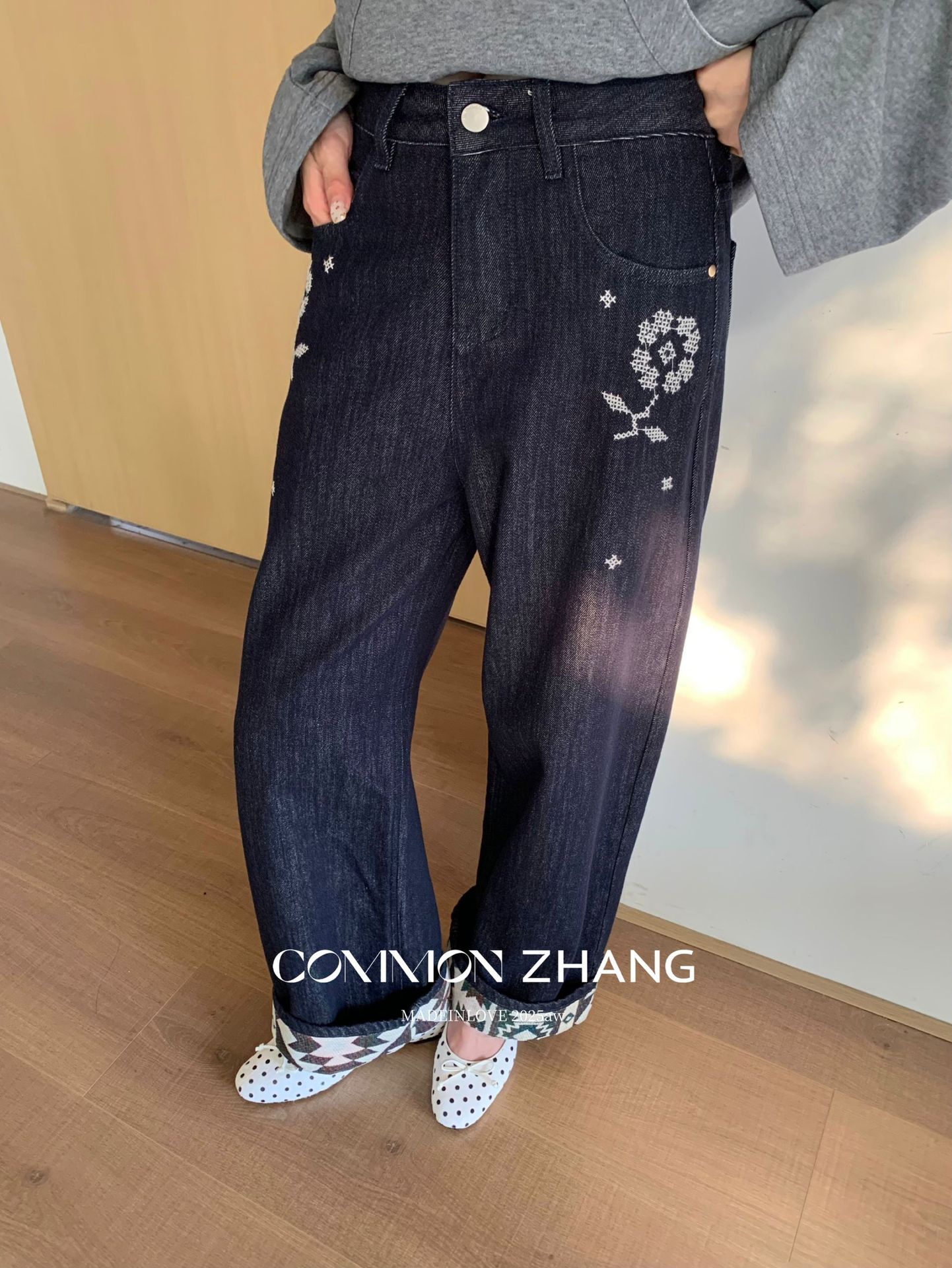 *o-ha-you*【FCZB301162】秋韓版學院風直筒繡花牛仔褲百搭拖地休閒老爹褲