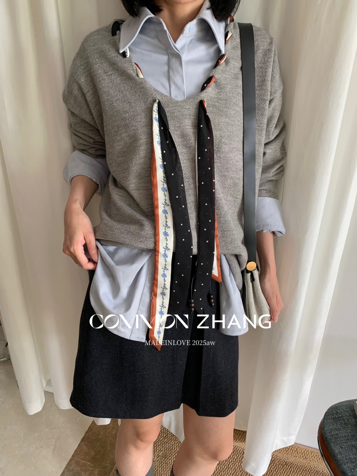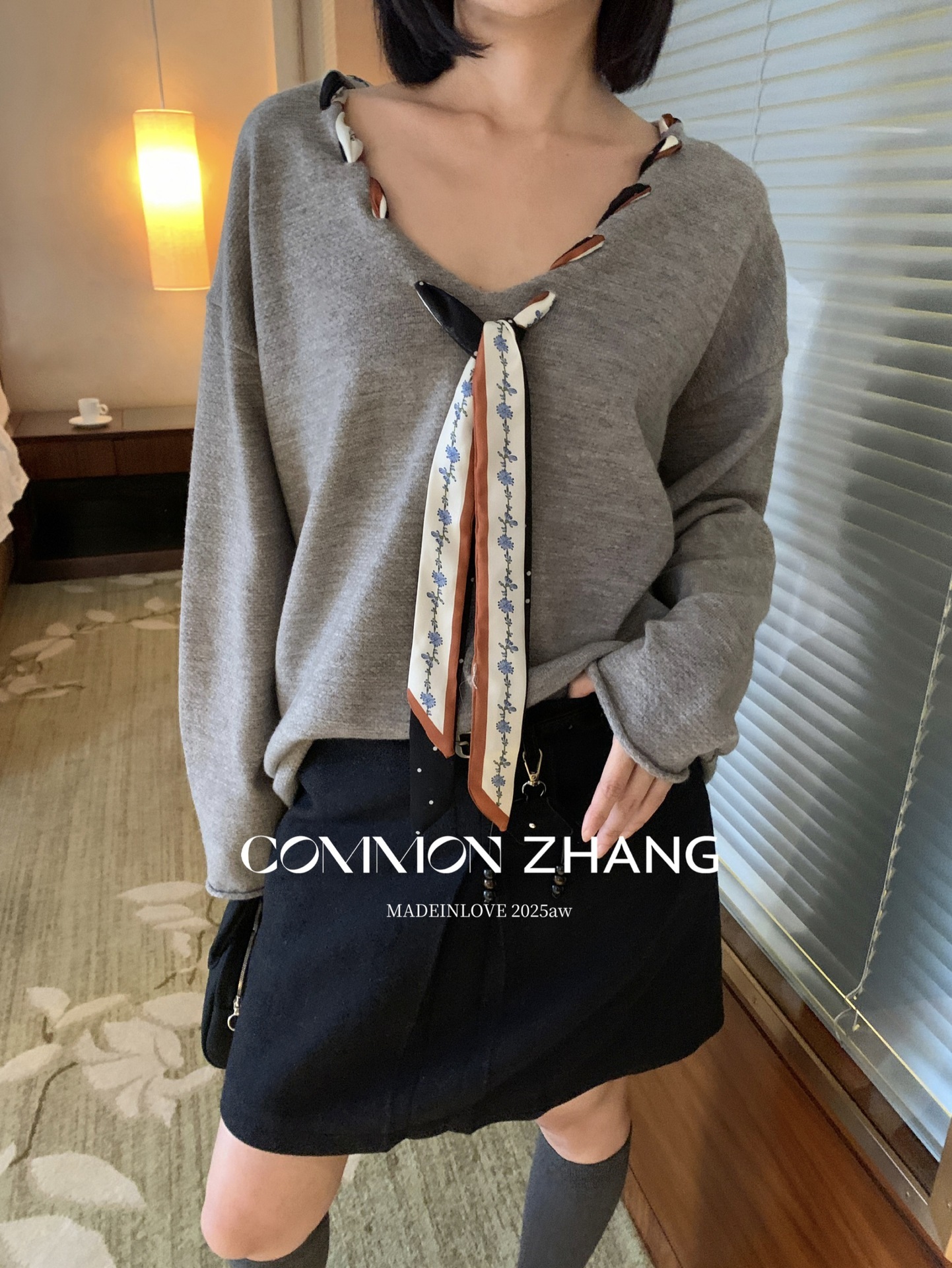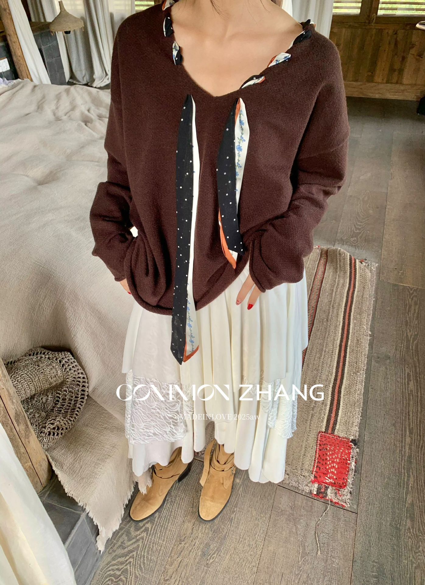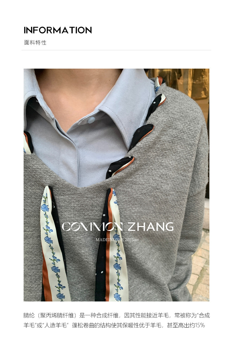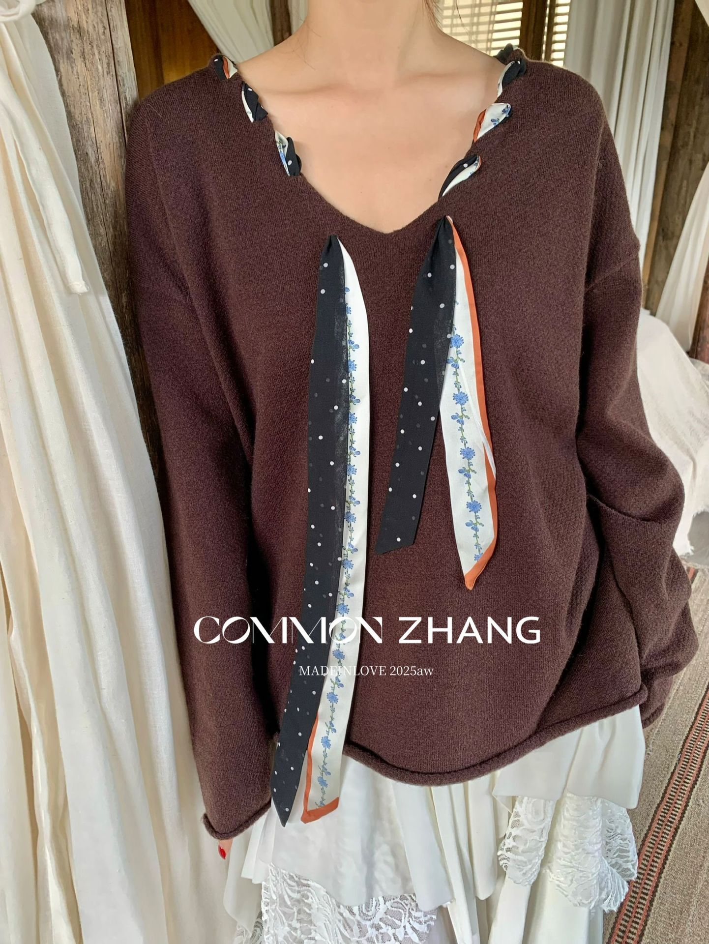 *o-ha-you*【FCZB305357】秋冬V領拼接絲巾毛衣女學院風寬鬆休閒套頭針織衫-4色