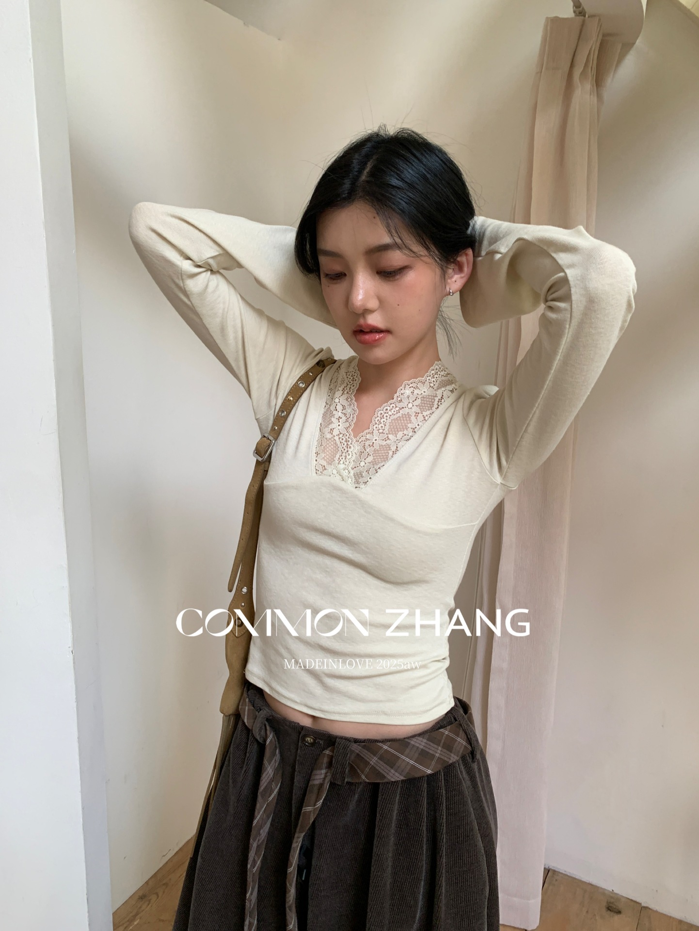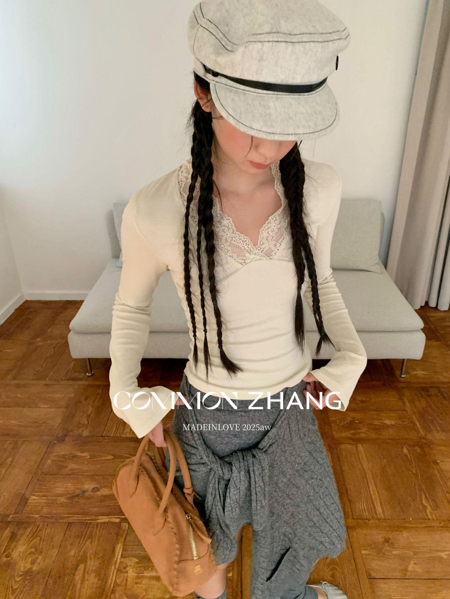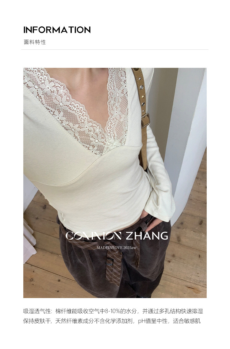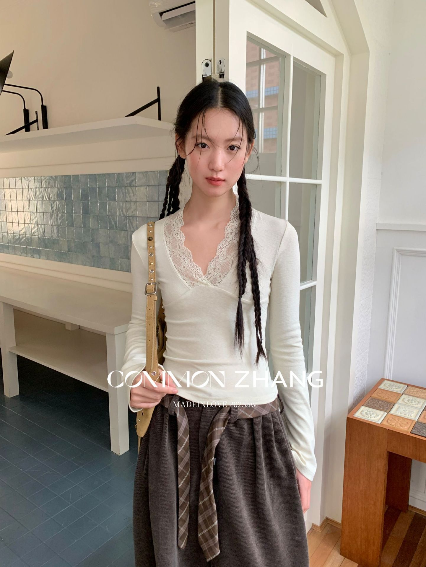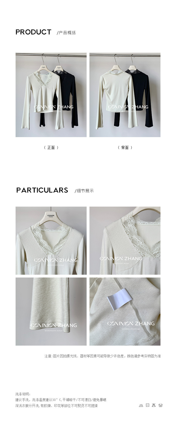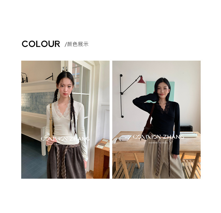 *o-ha-you*【FCZB400078】秋蕾絲拼接V領針織衫女名媛修身顯瘦長袖打底T恤-2色