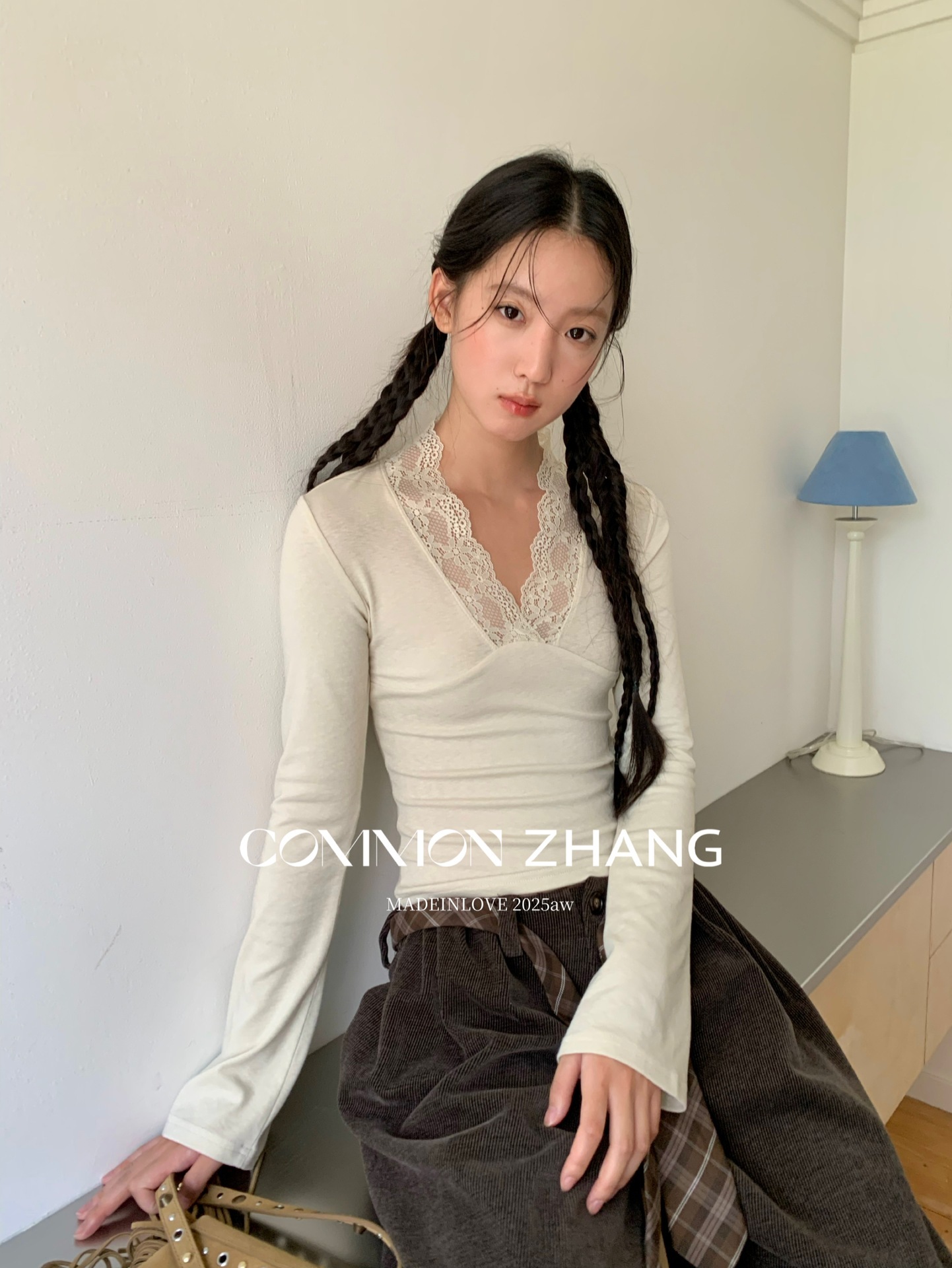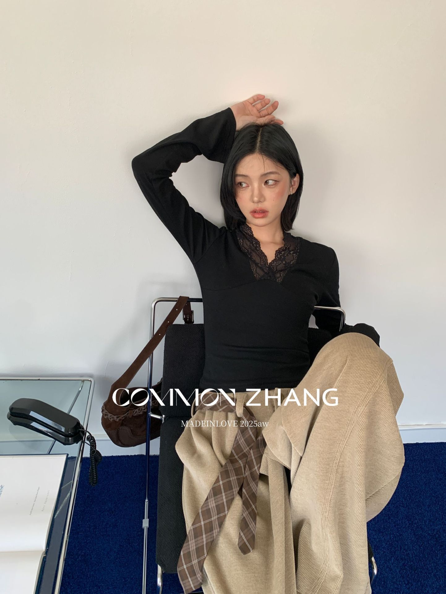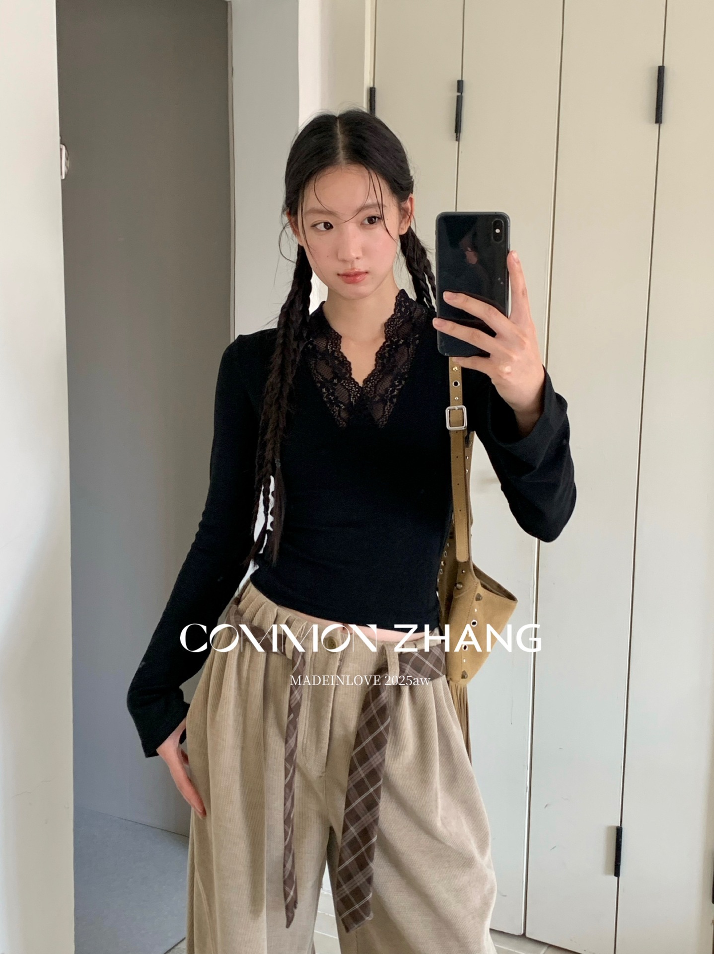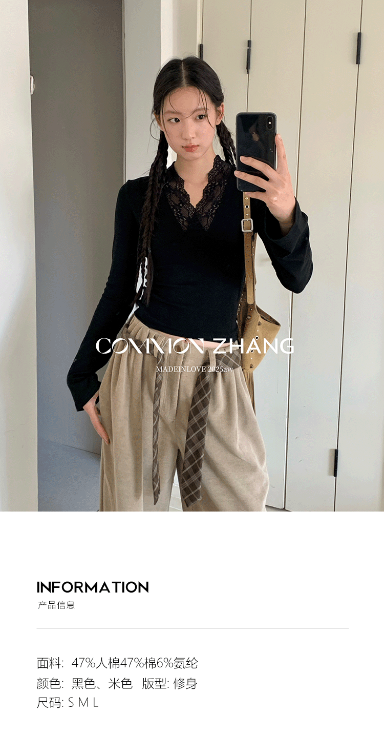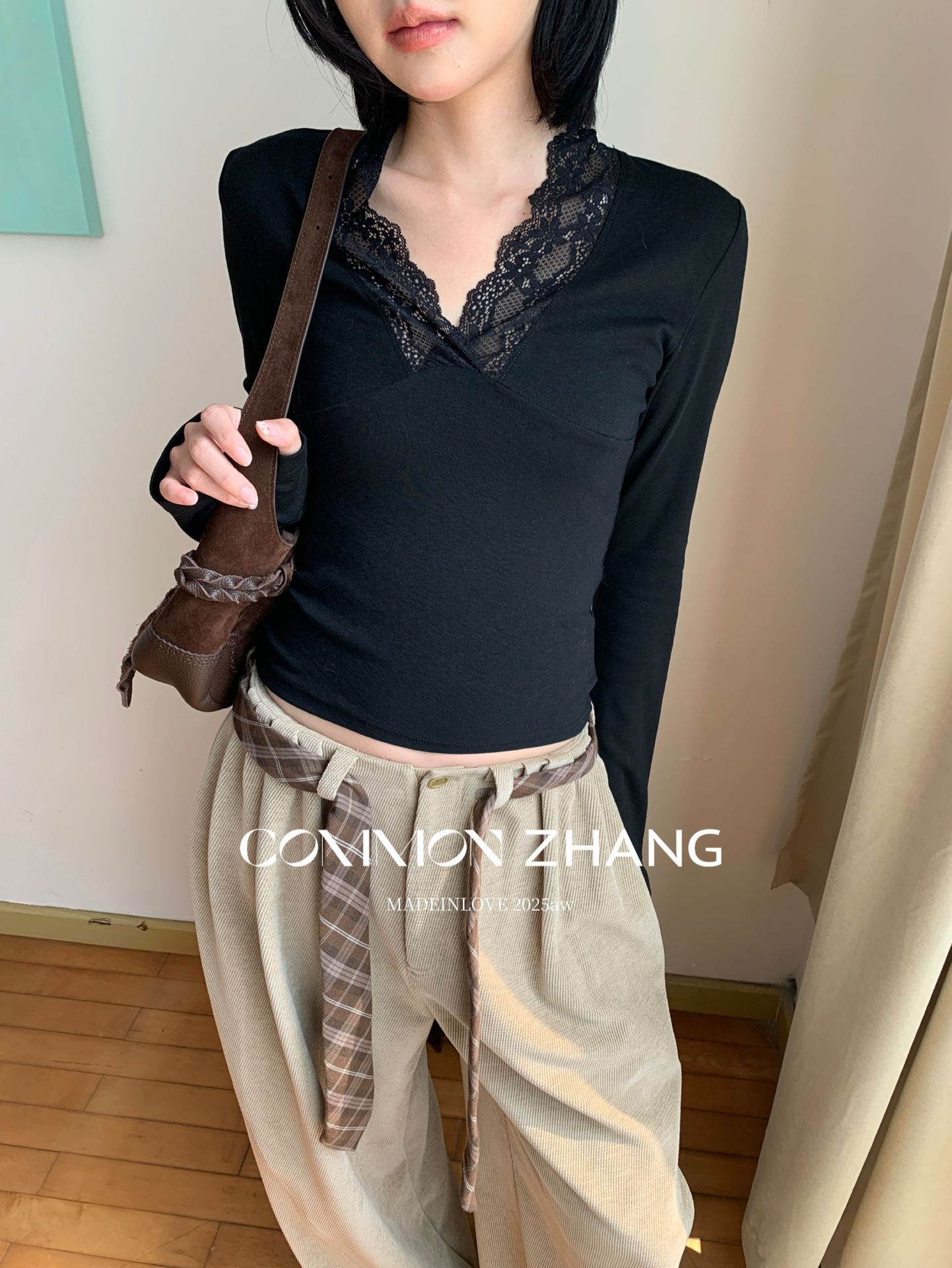 *o-ha-you*【FCZB400078】秋蕾絲拼接V領針織衫女名媛修身顯瘦長袖打底T恤-2色