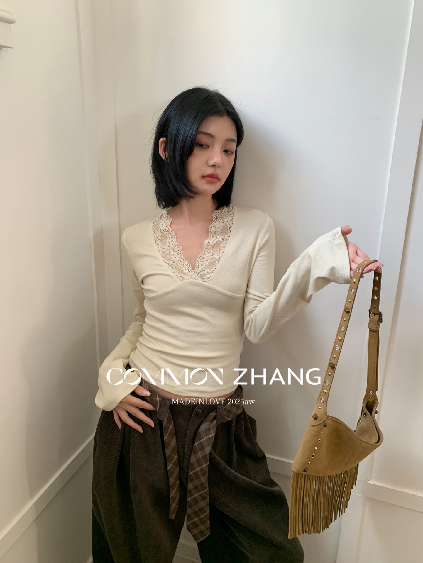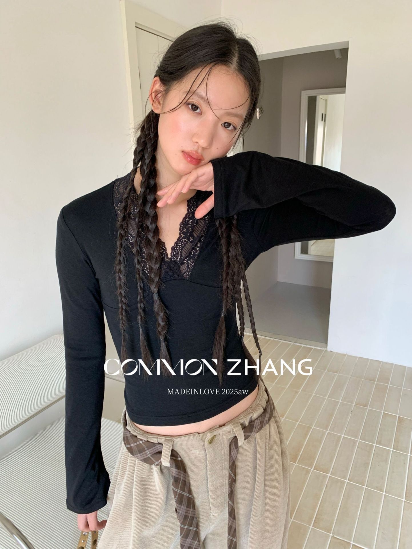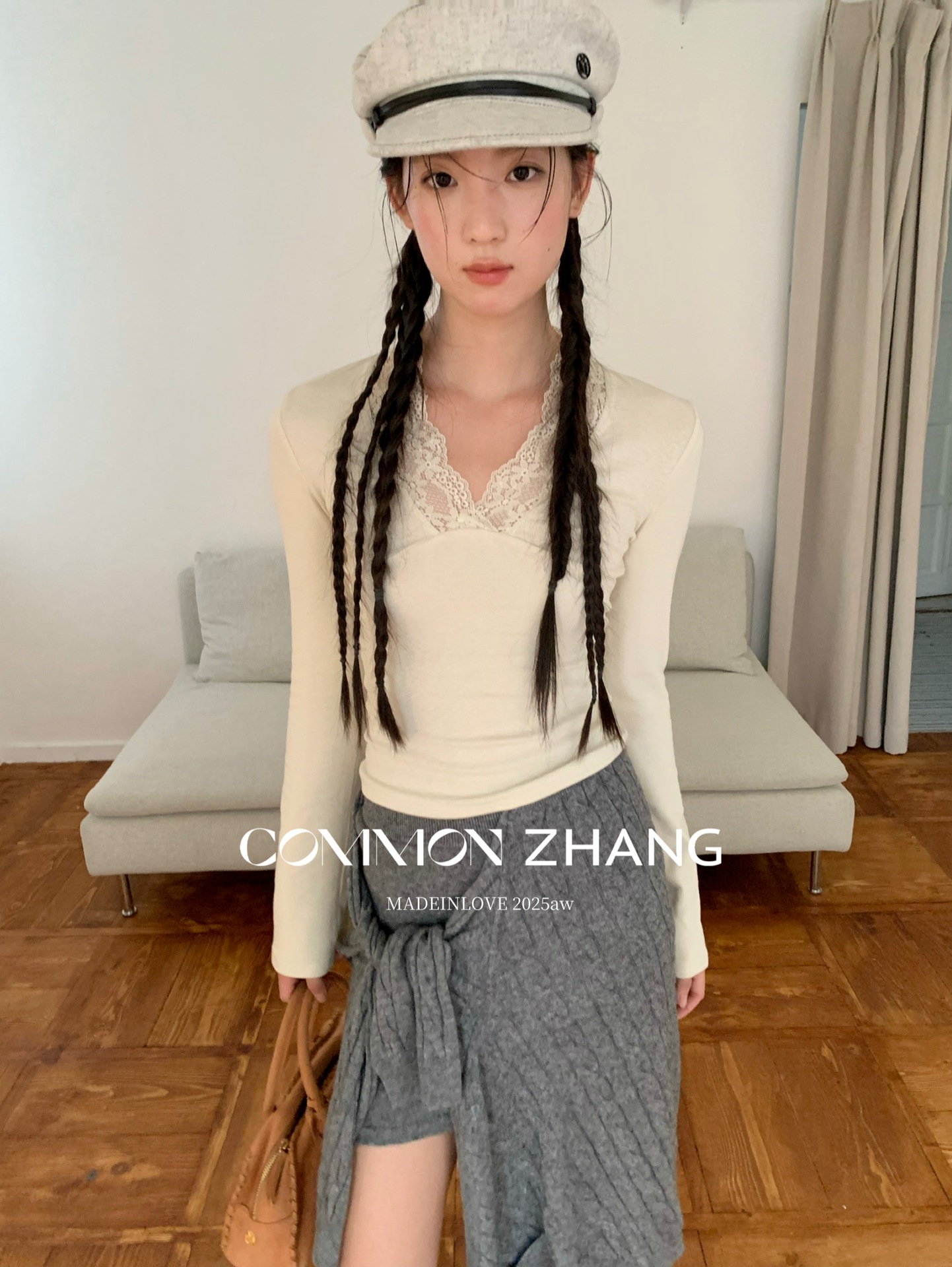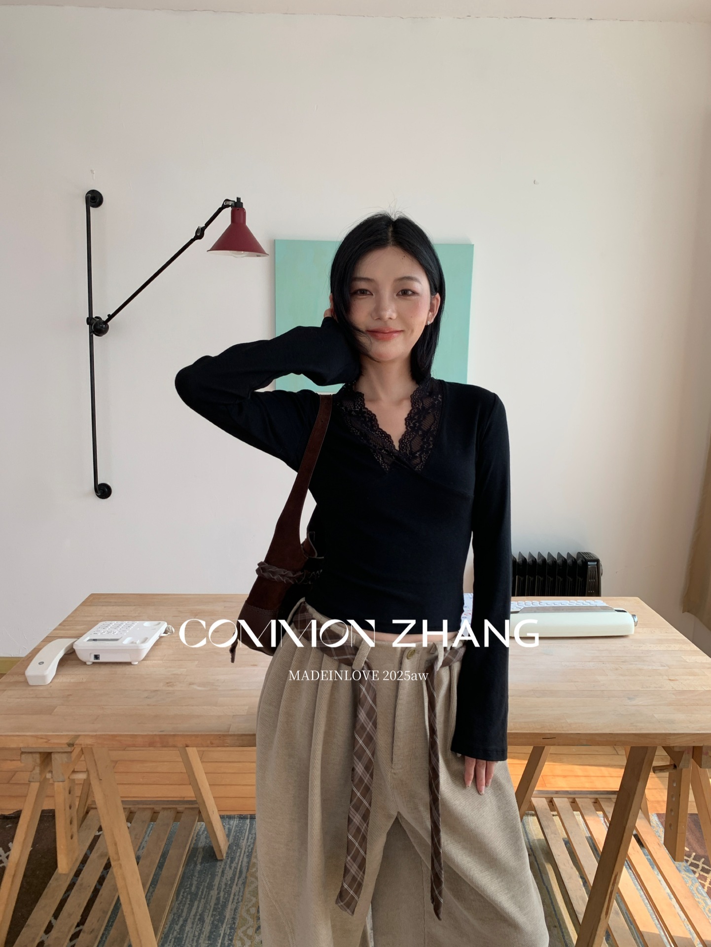 *o-ha-you*【FCZB400078】秋蕾絲拼接V領針織衫女名媛修身顯瘦長袖打底T恤-2色