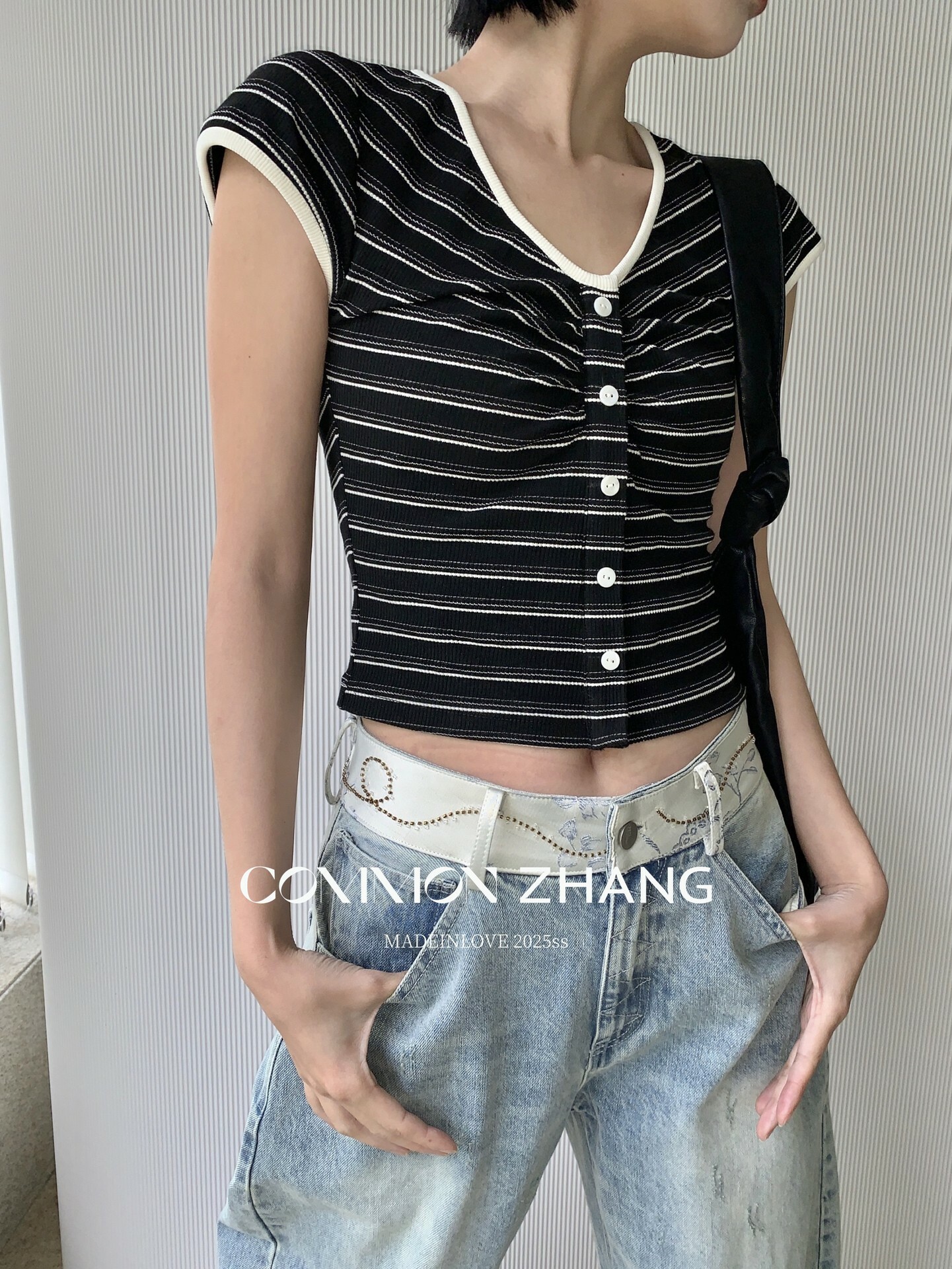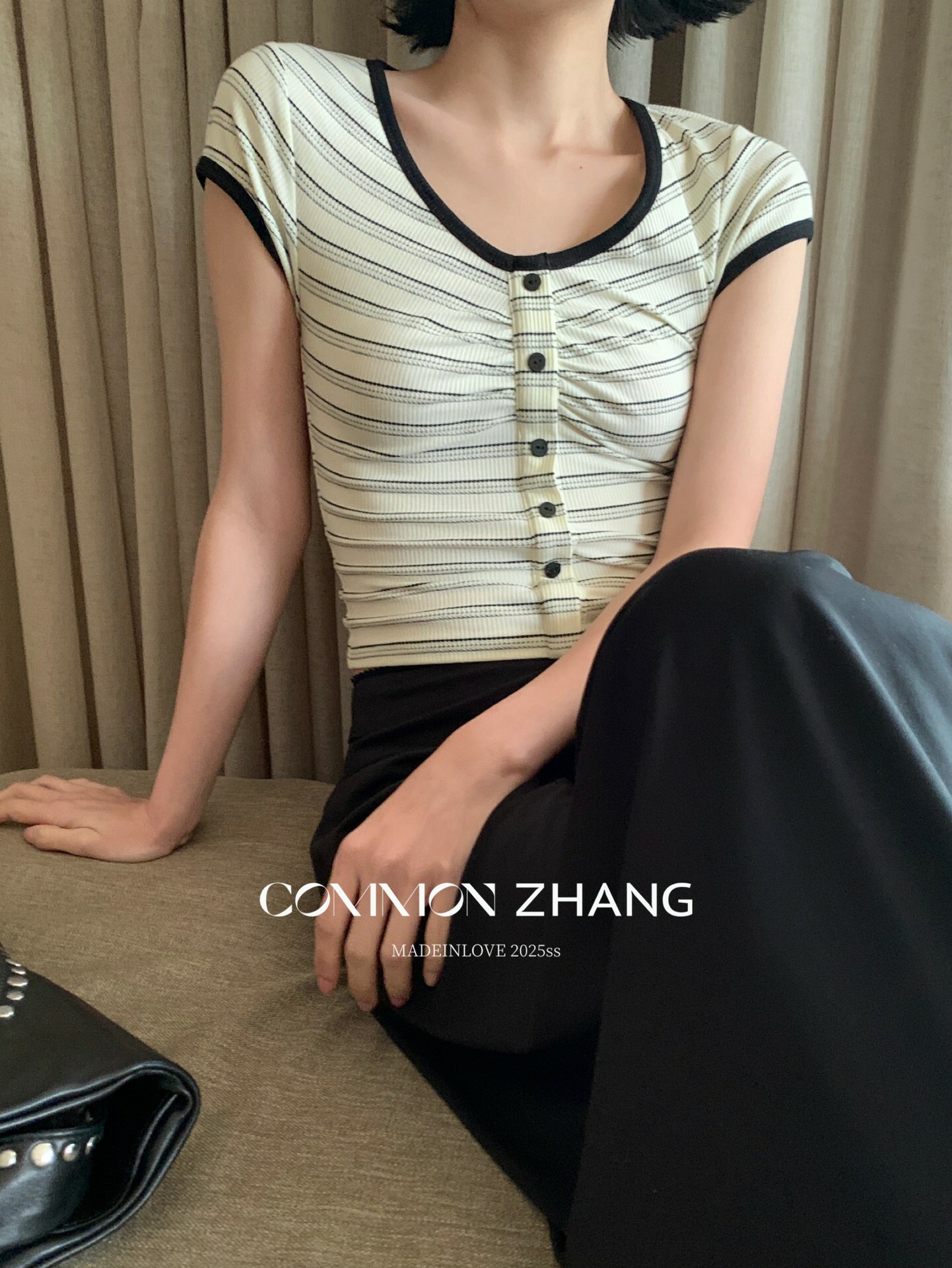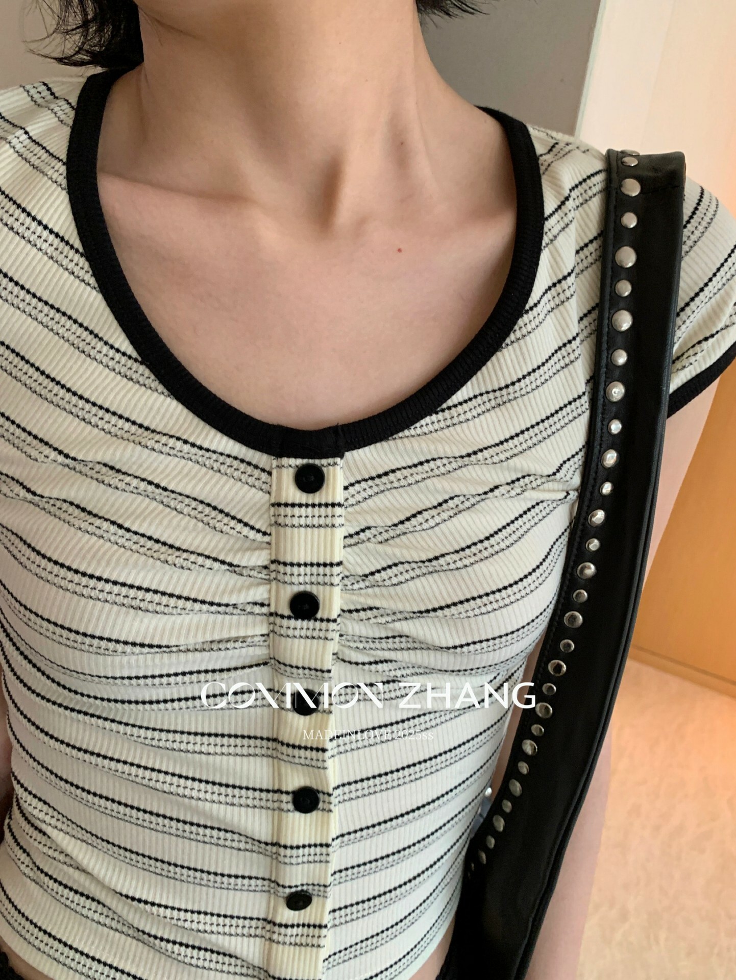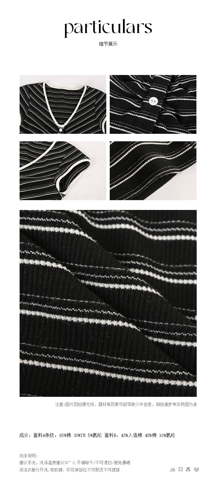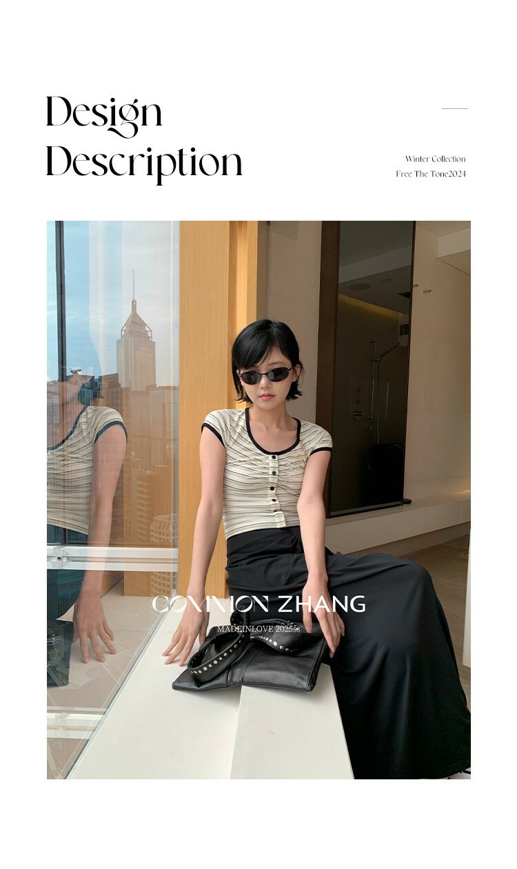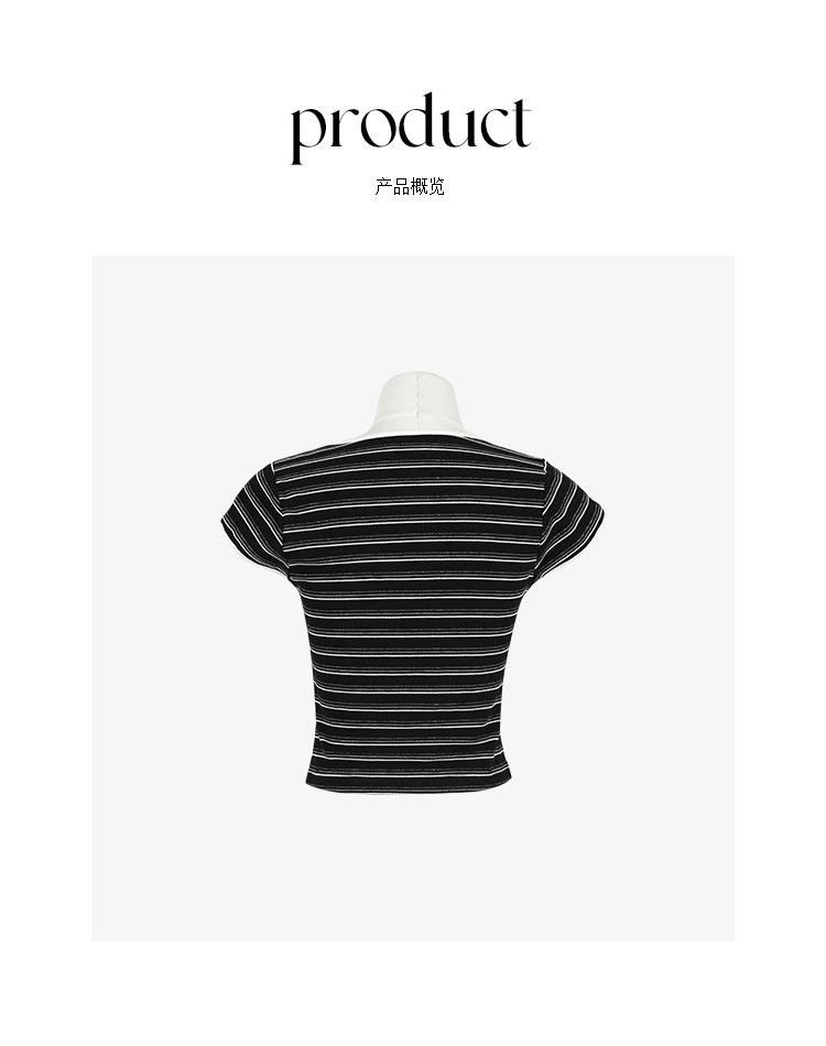 *o-ha-you*【FCZCB100480】夏季韓風小眾復古條紋圓領正肩假扣針織短袖T恤-2色