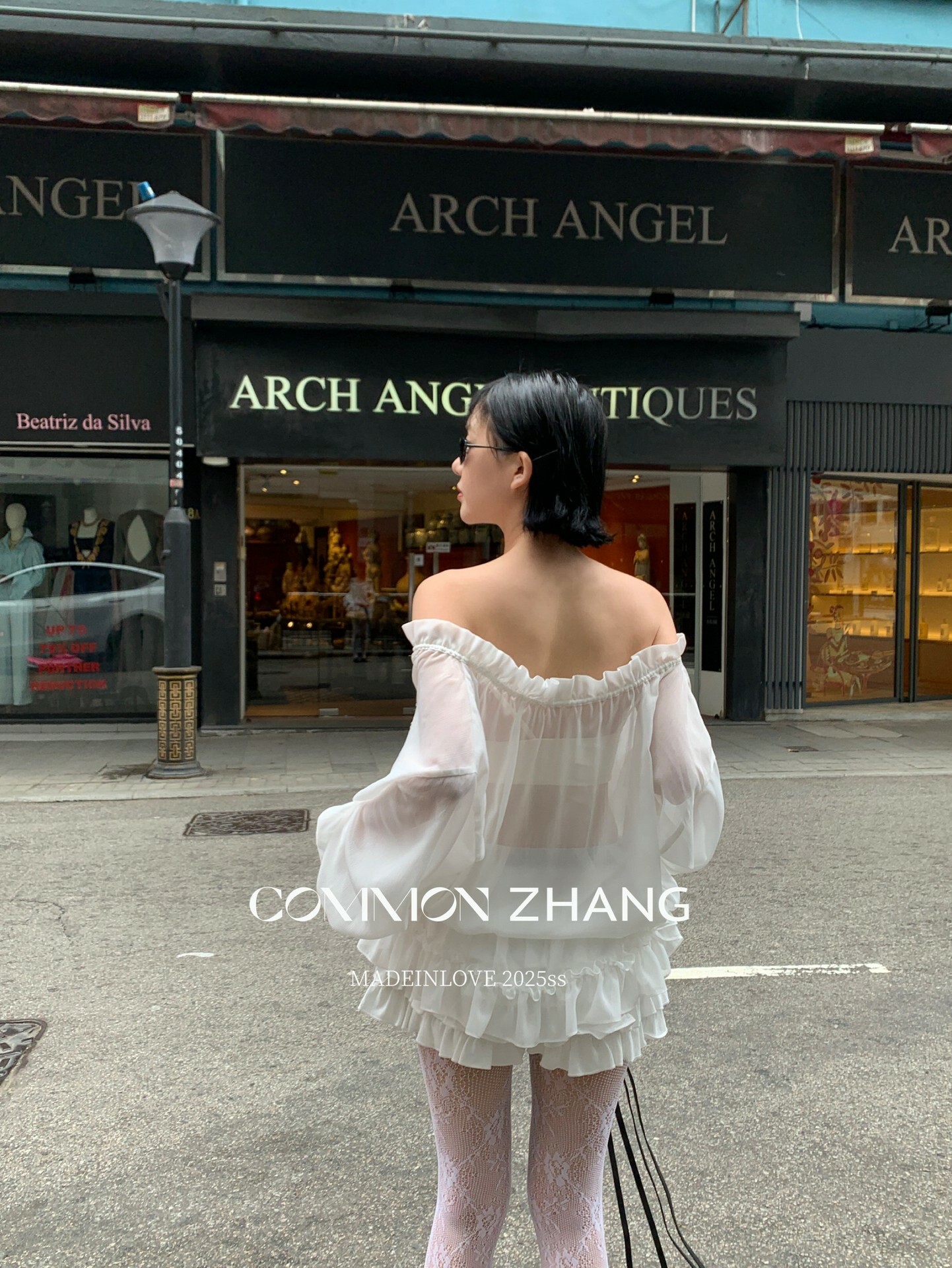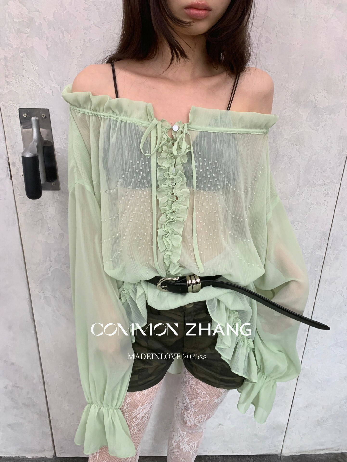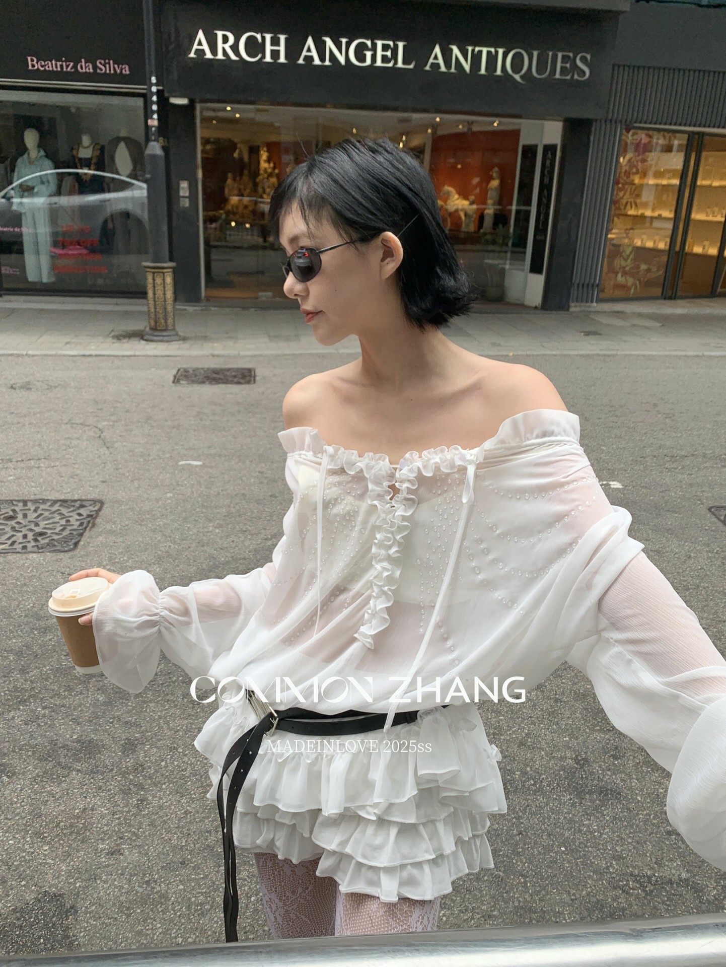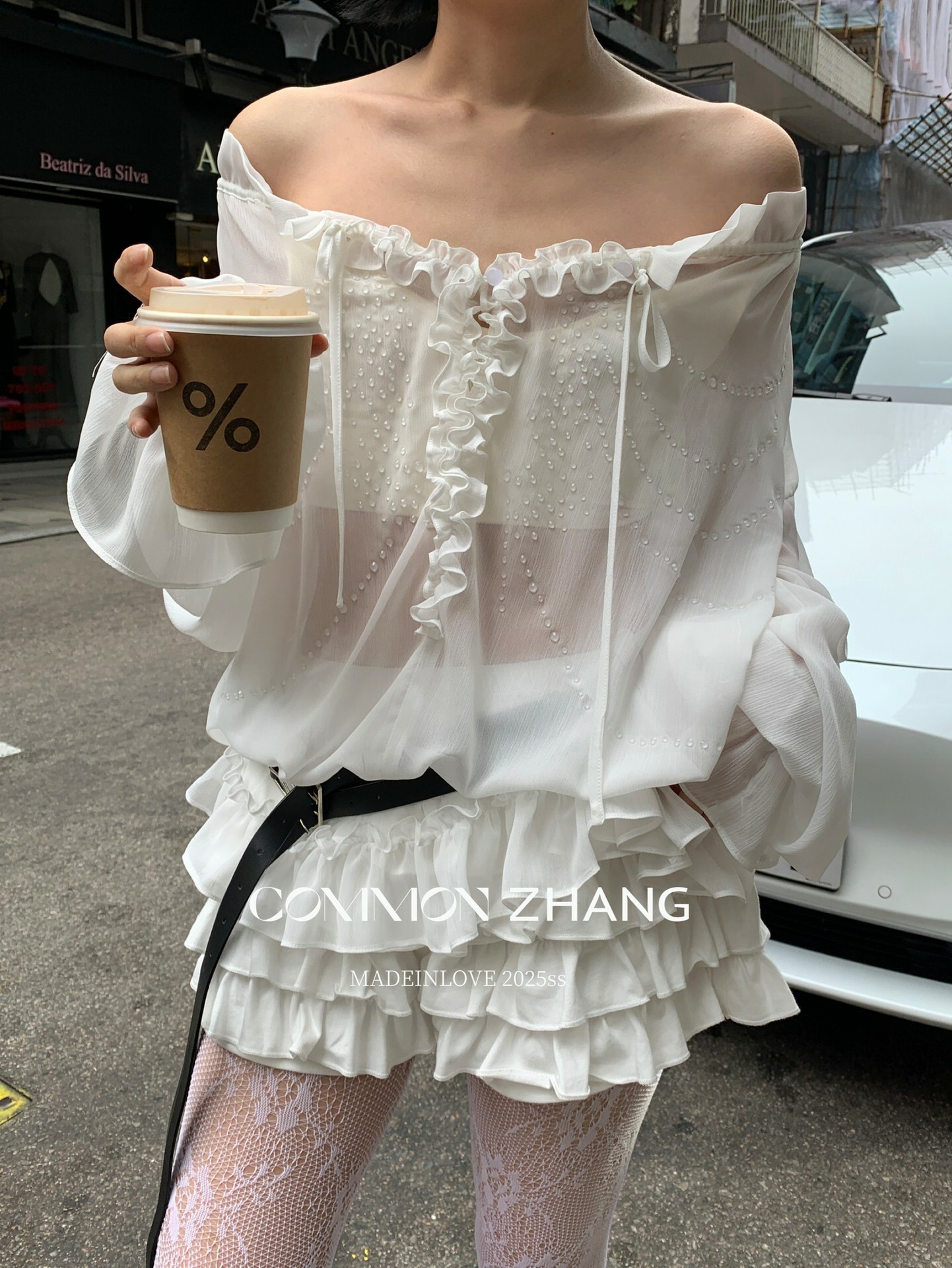 *o-ha-you*【FCZCB103542】夏季性感透視水滴珠花邊拼接繫帶一字肩百搭小衫-2色