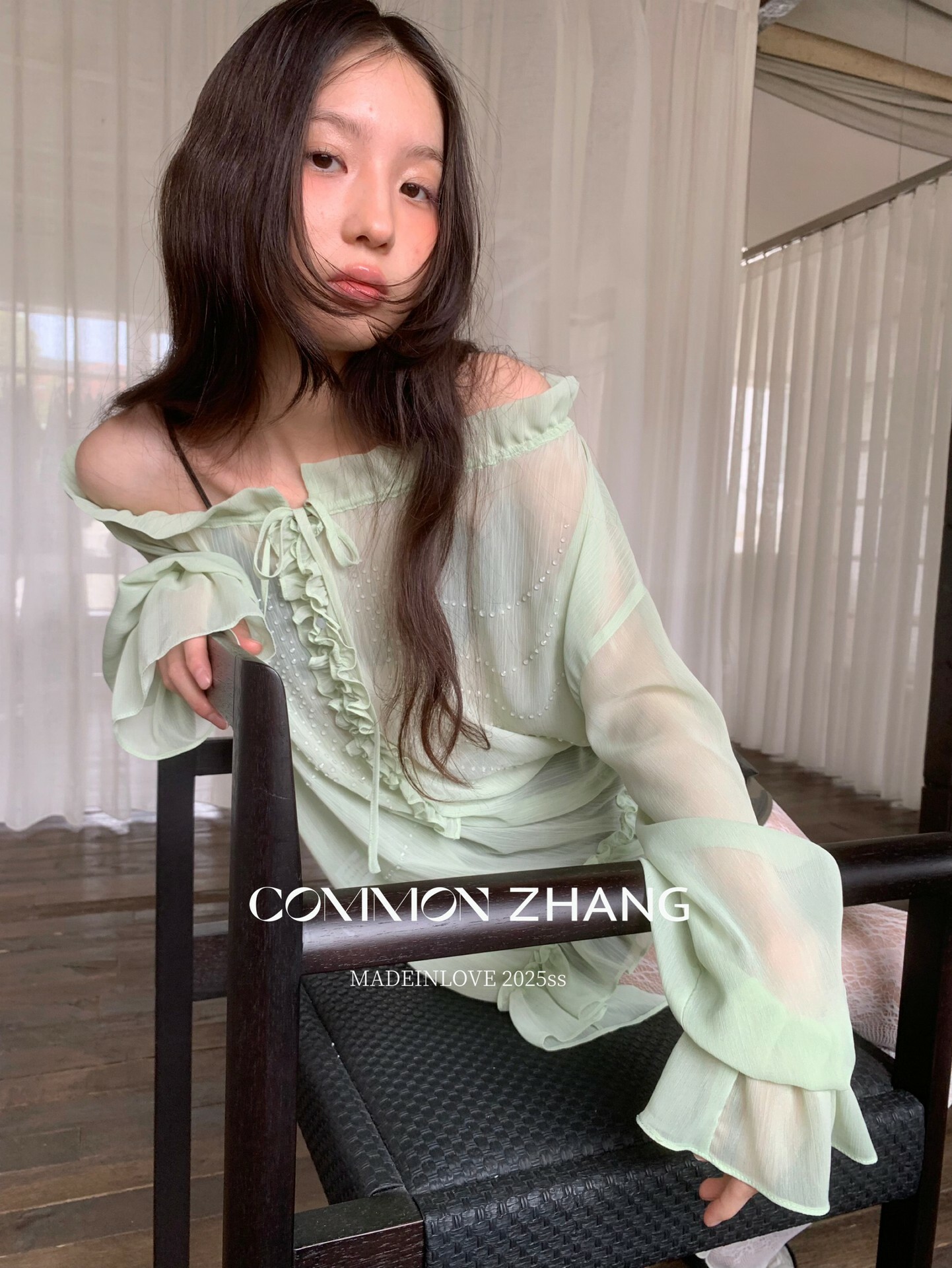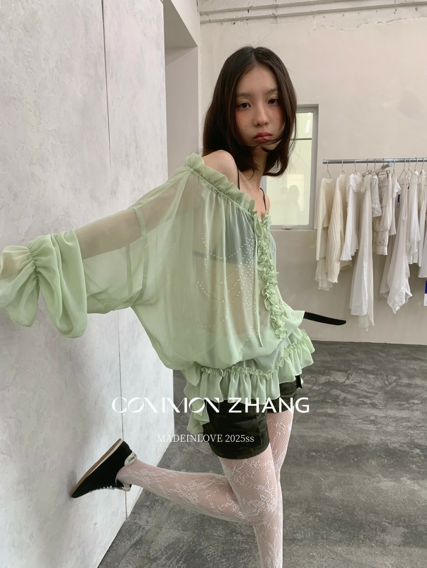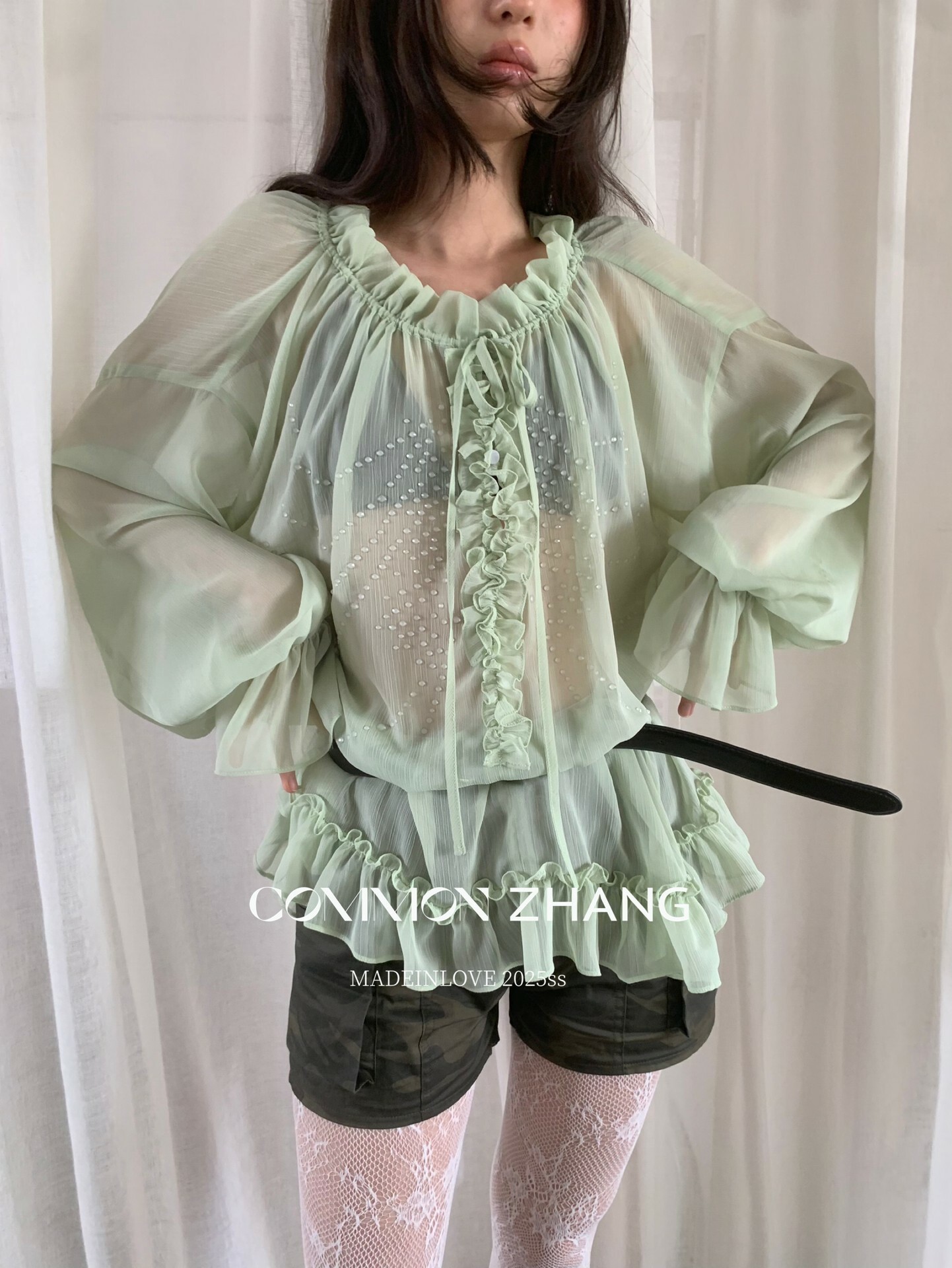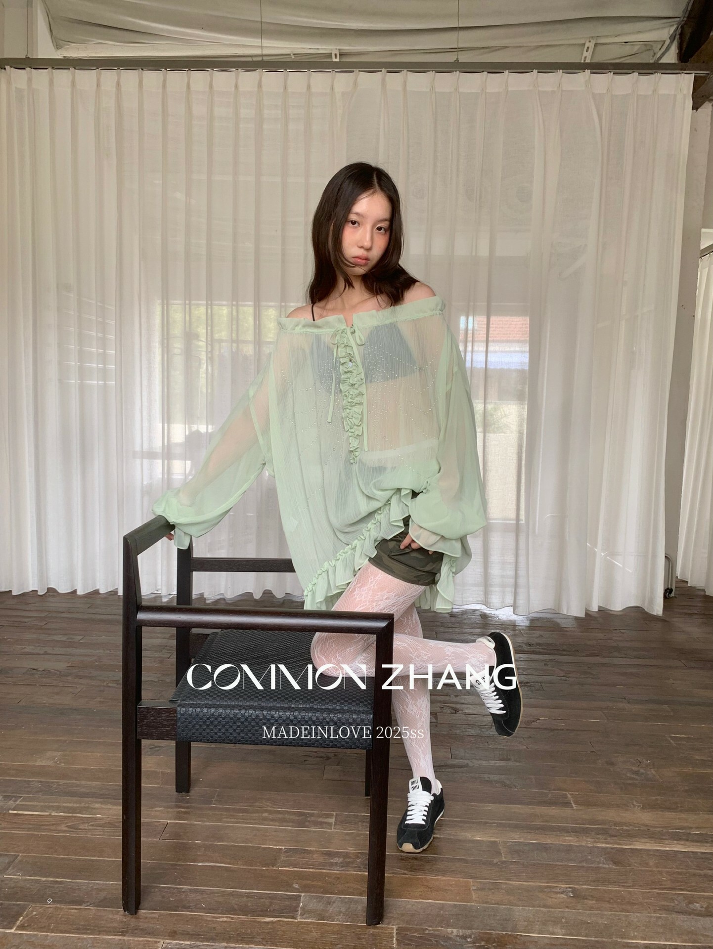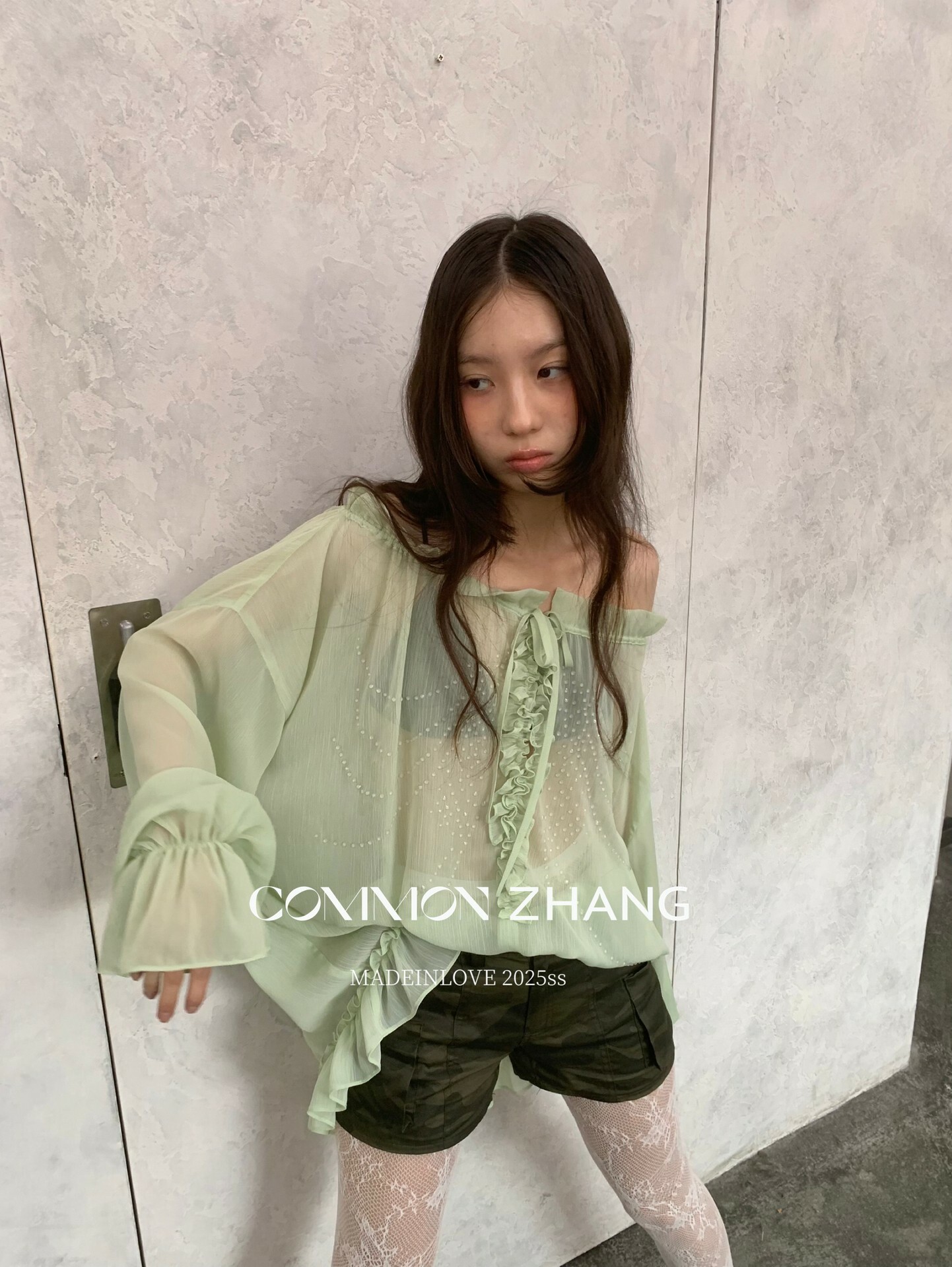 *o-ha-you*【FCZCB103542】夏季性感透視水滴珠花邊拼接繫帶一字肩百搭小衫-2色