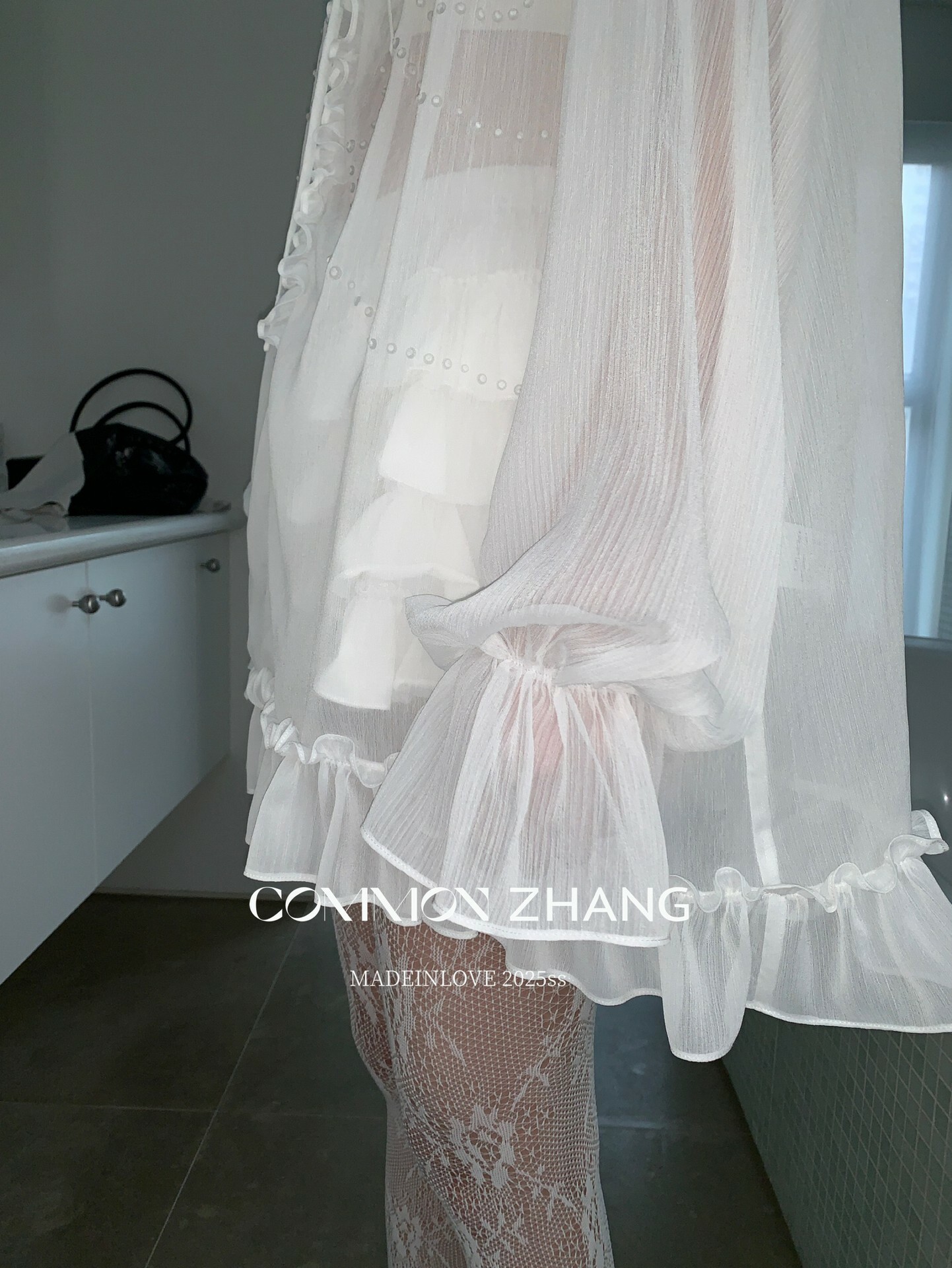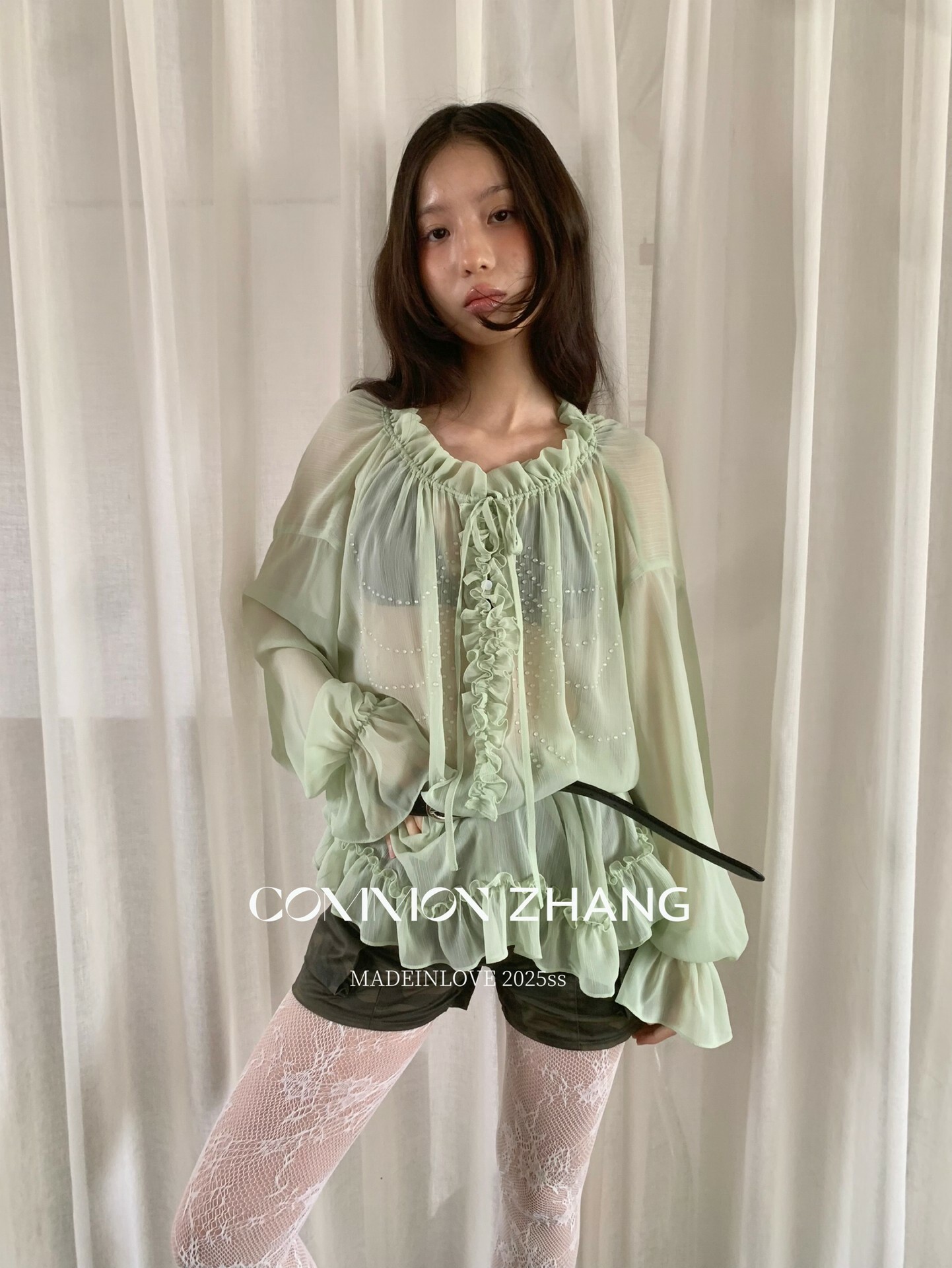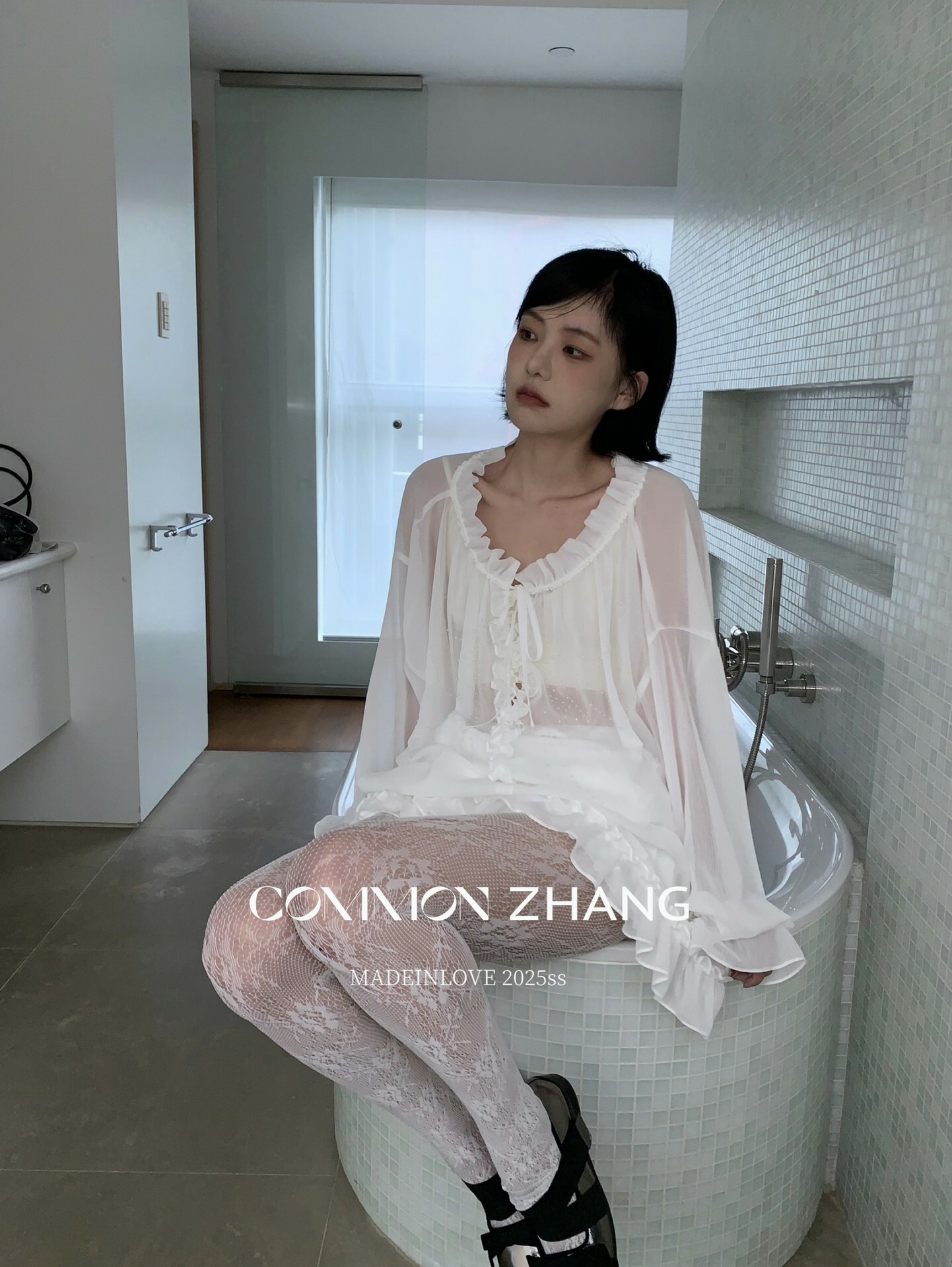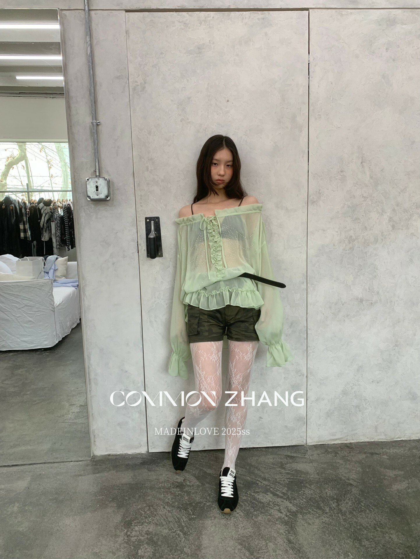 *o-ha-you*【FCZCB103542】夏季性感透視水滴珠花邊拼接繫帶一字肩百搭小衫-2色