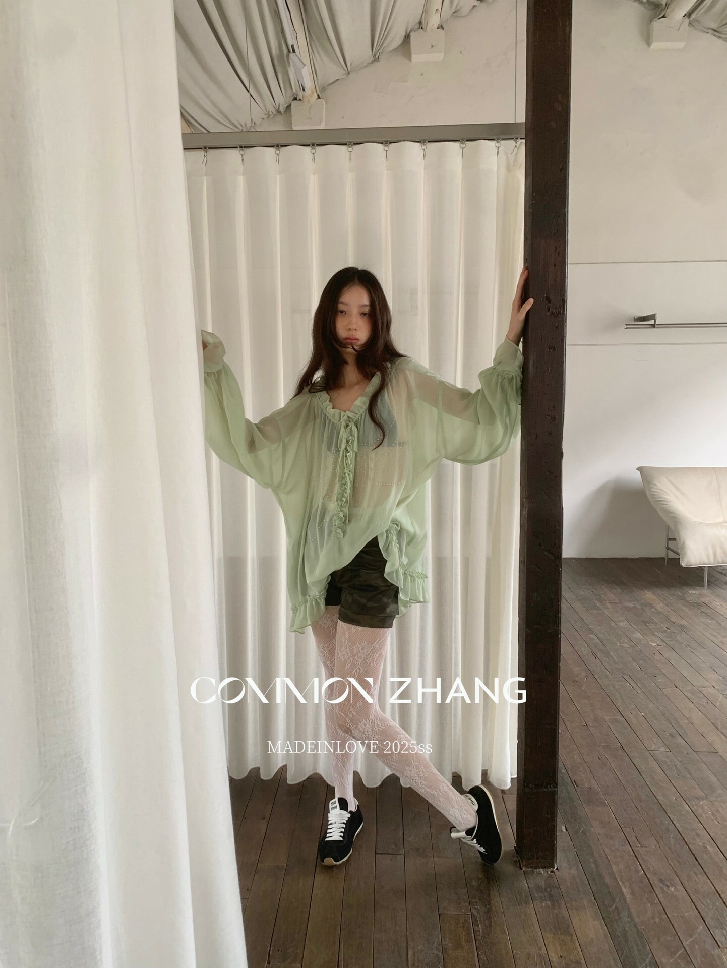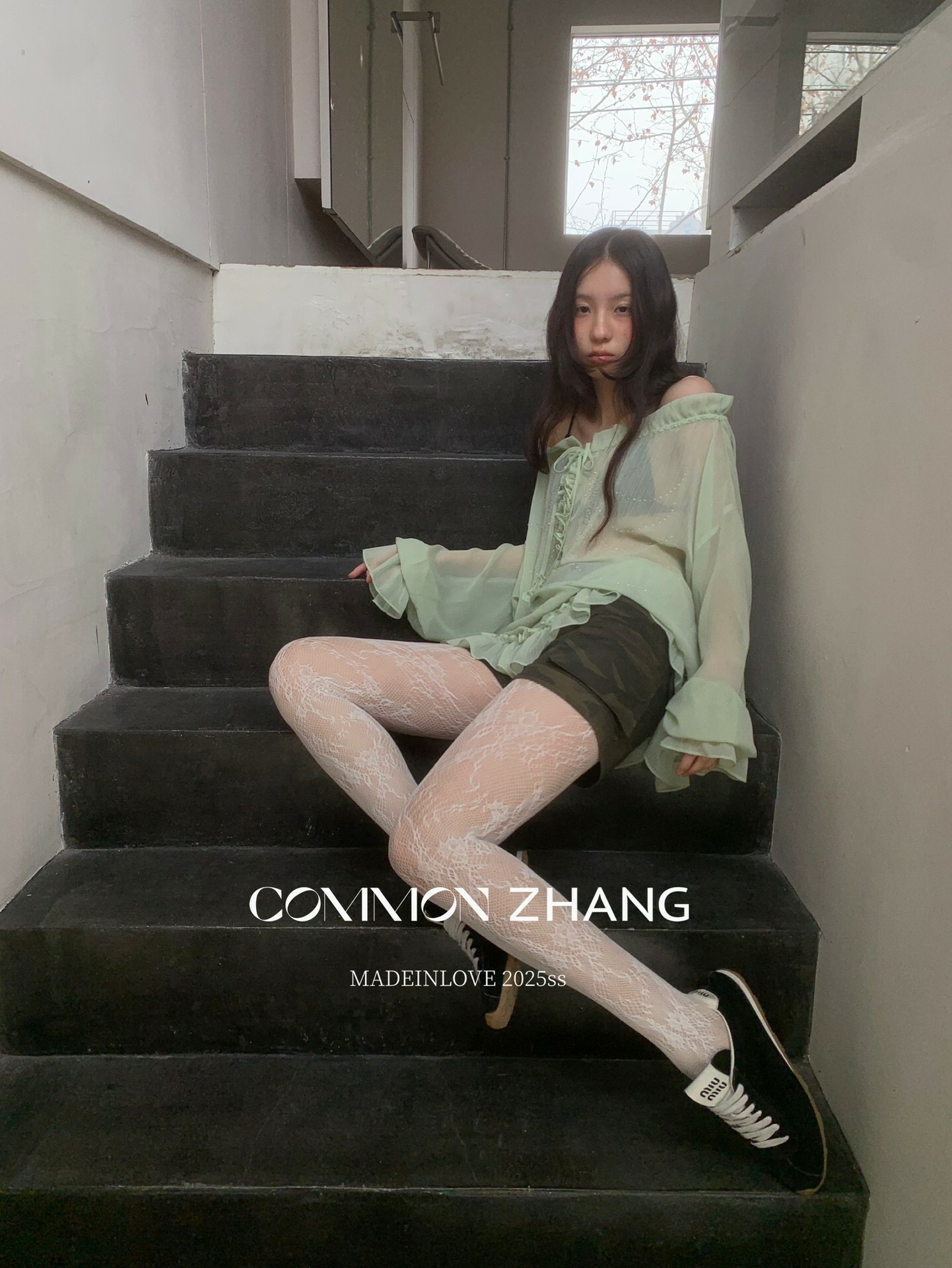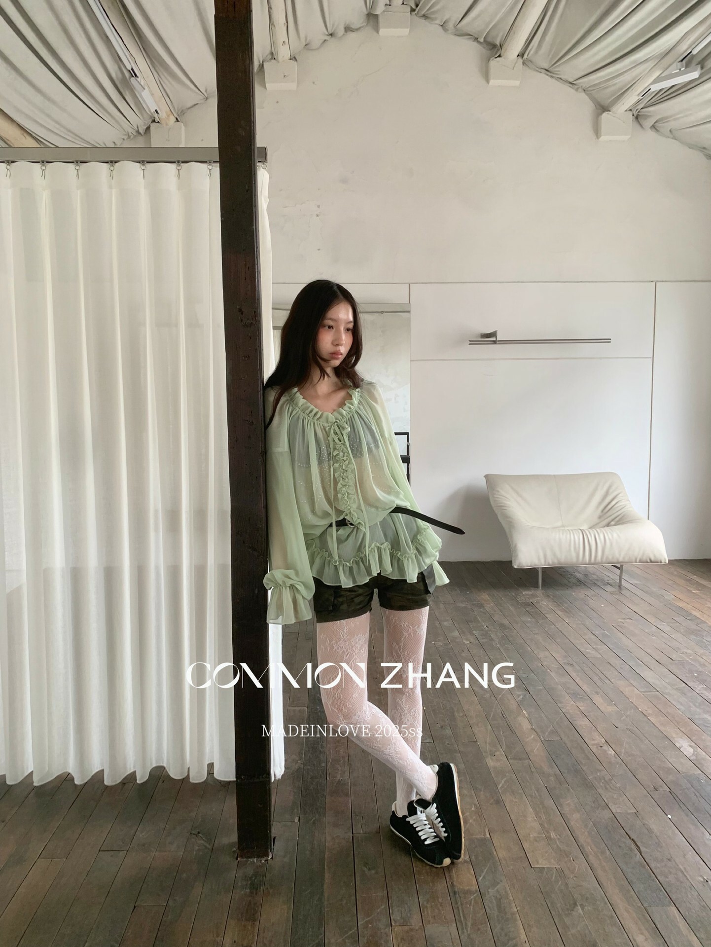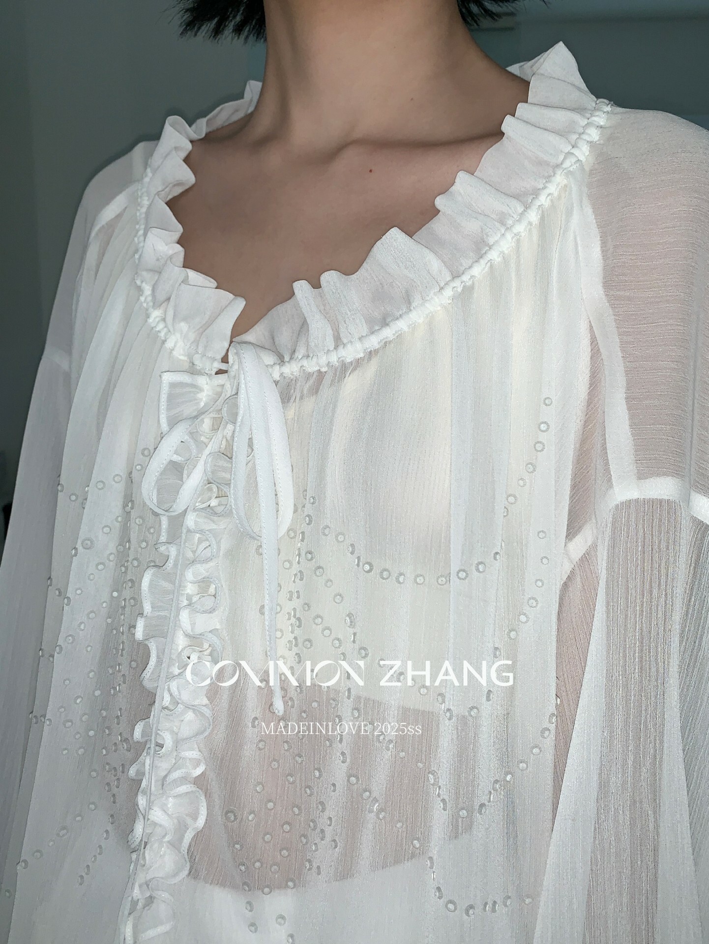 *o-ha-you*【FCZCB103542】夏季性感透視水滴珠花邊拼接繫帶一字肩百搭小衫-2色