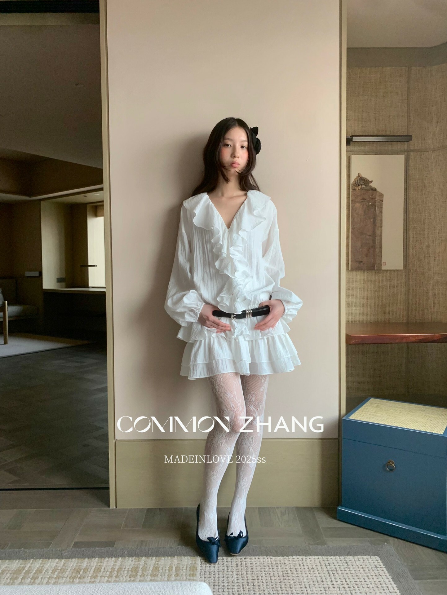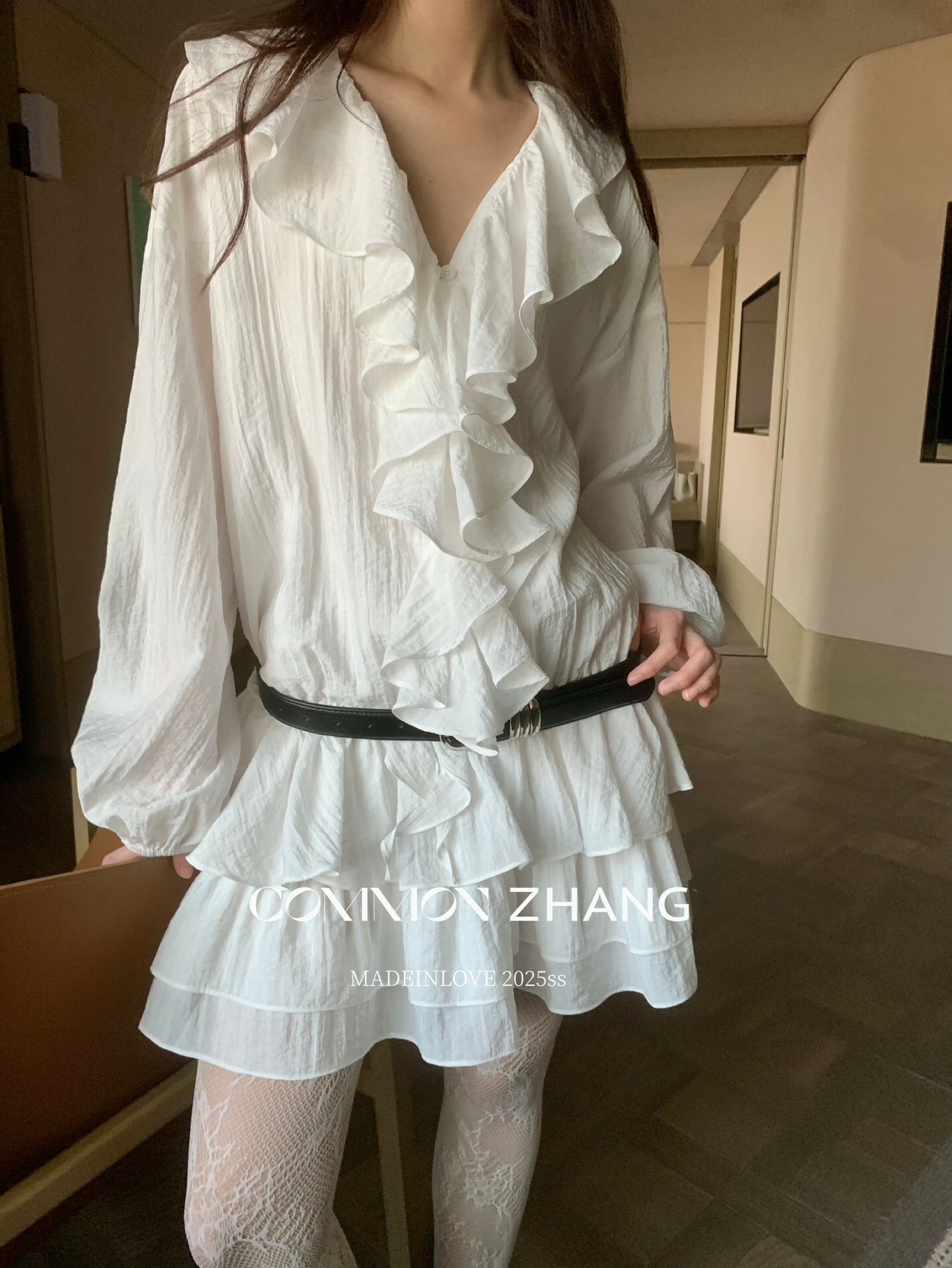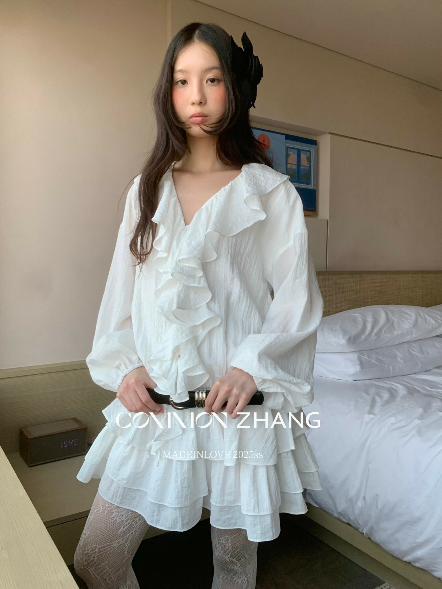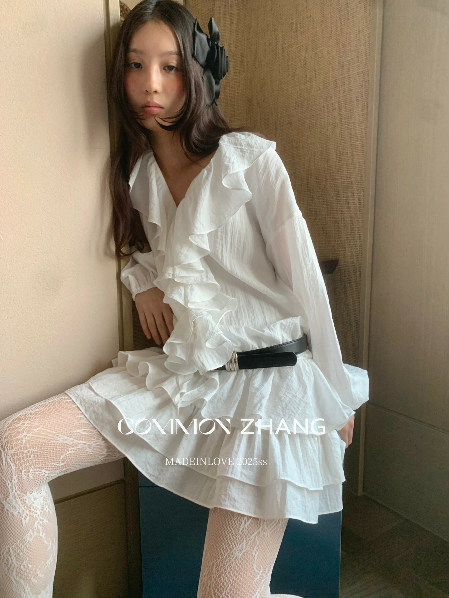 *o-ha-you*【FCZCB106528】夏季法式減齡V領花邊拼接收腰顯瘦層次感連衣裙洋裝-2色