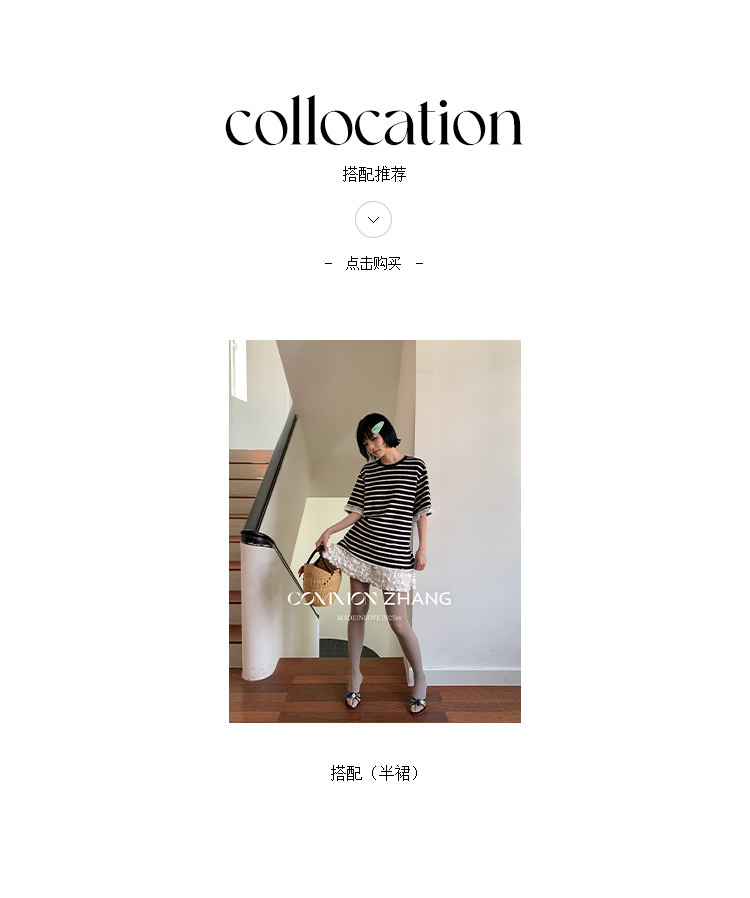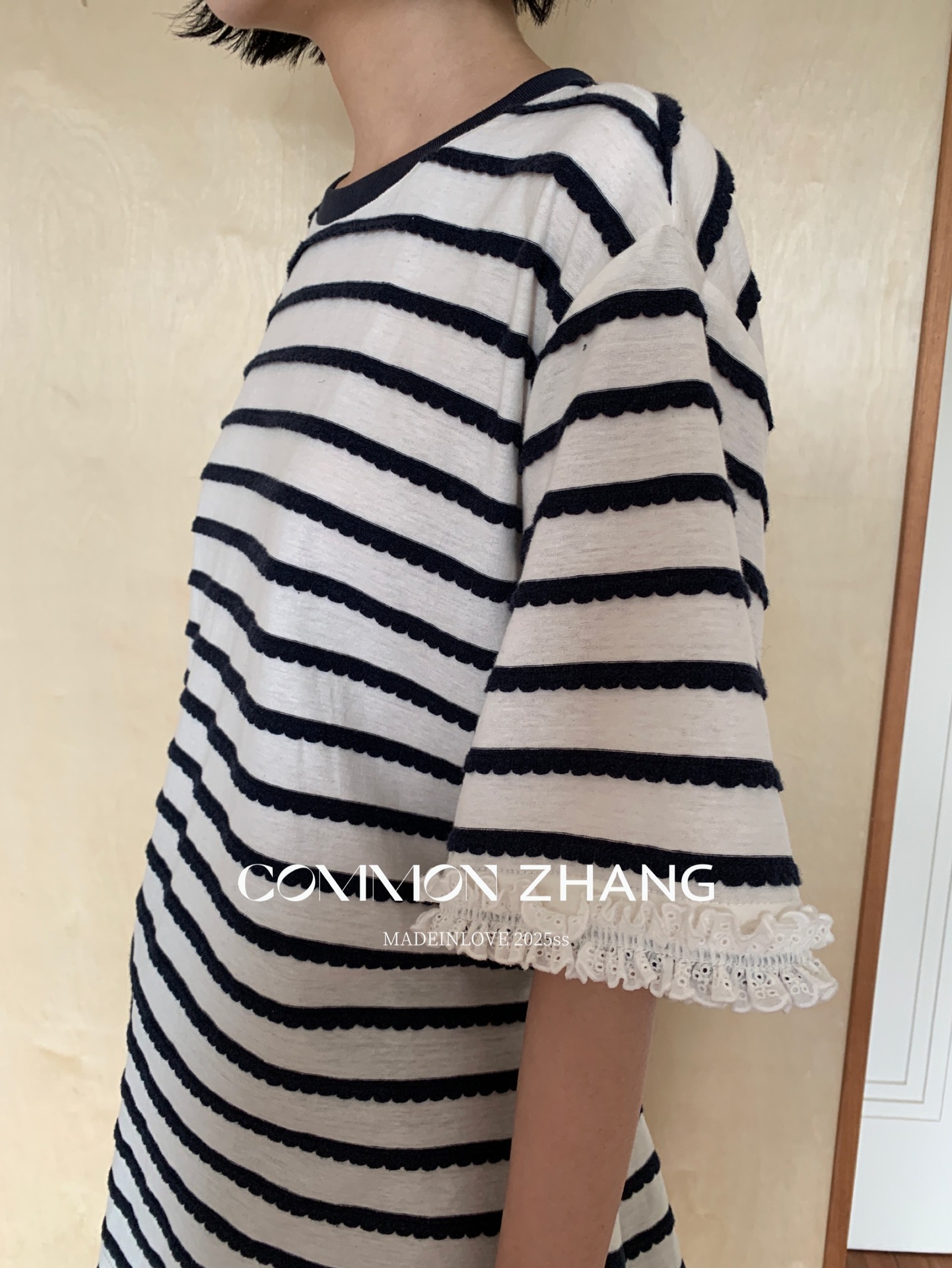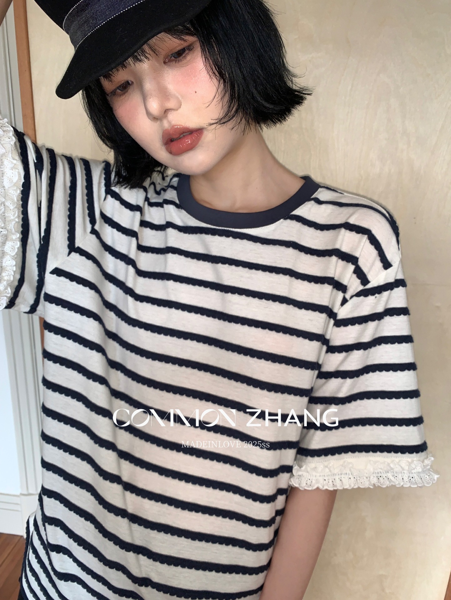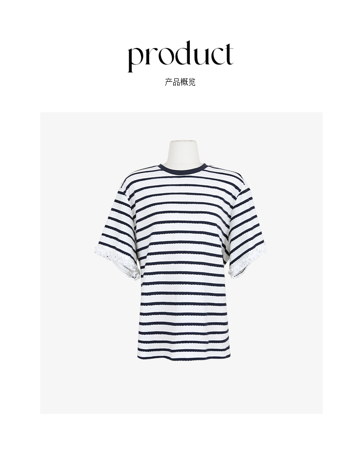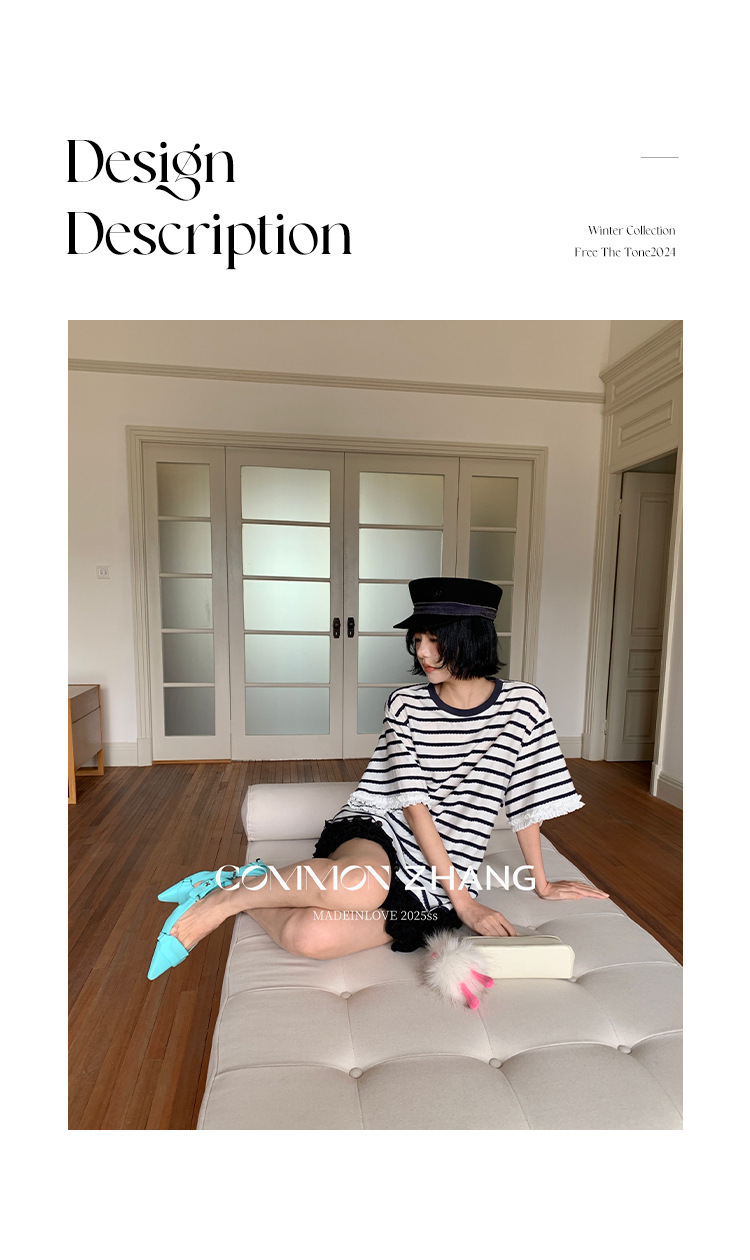 *o-ha-you*【FCZCB200549】夏季韓版減齡條紋蕾絲拼接圓領寬鬆百搭繫帶T恤-2色