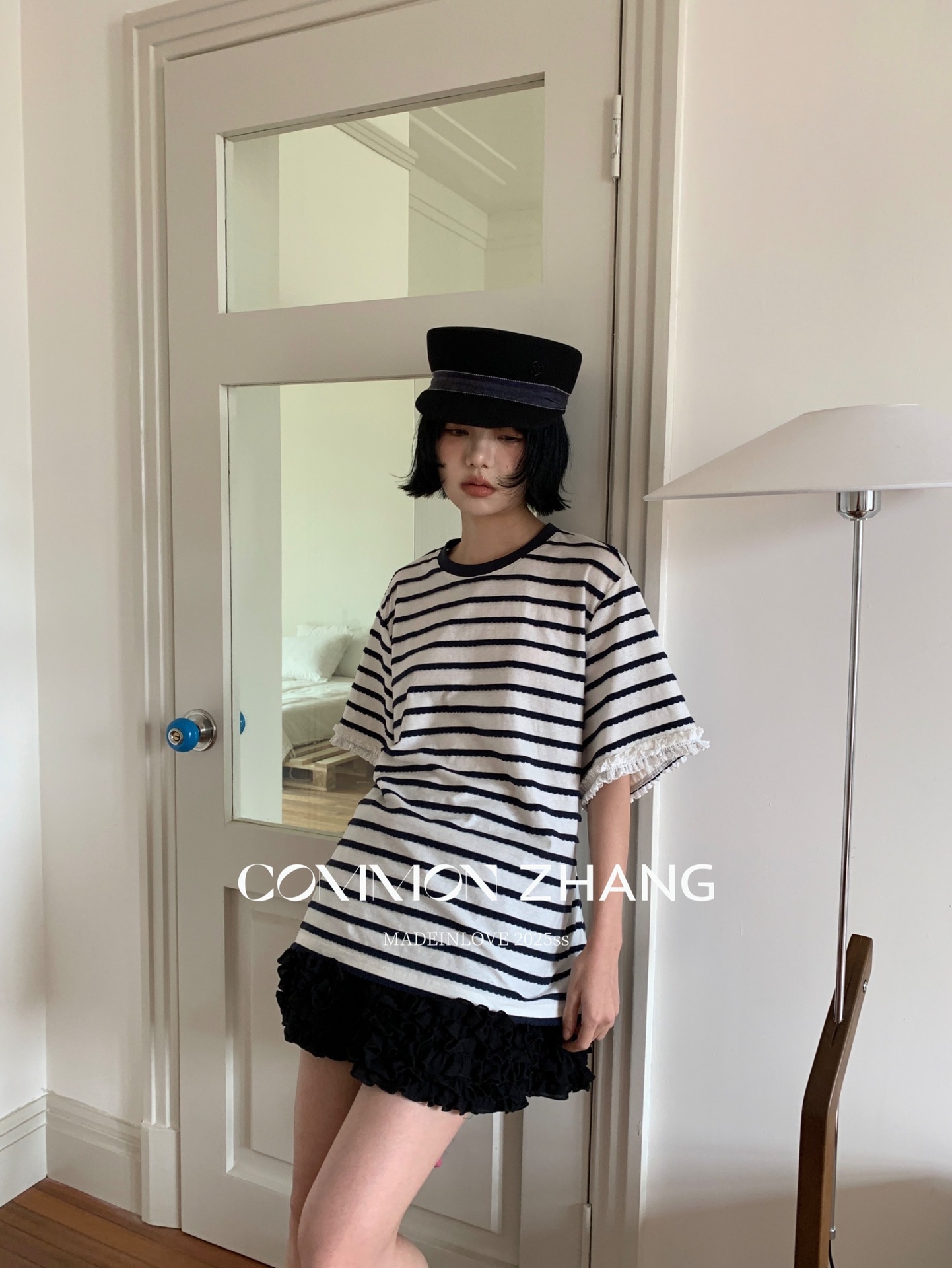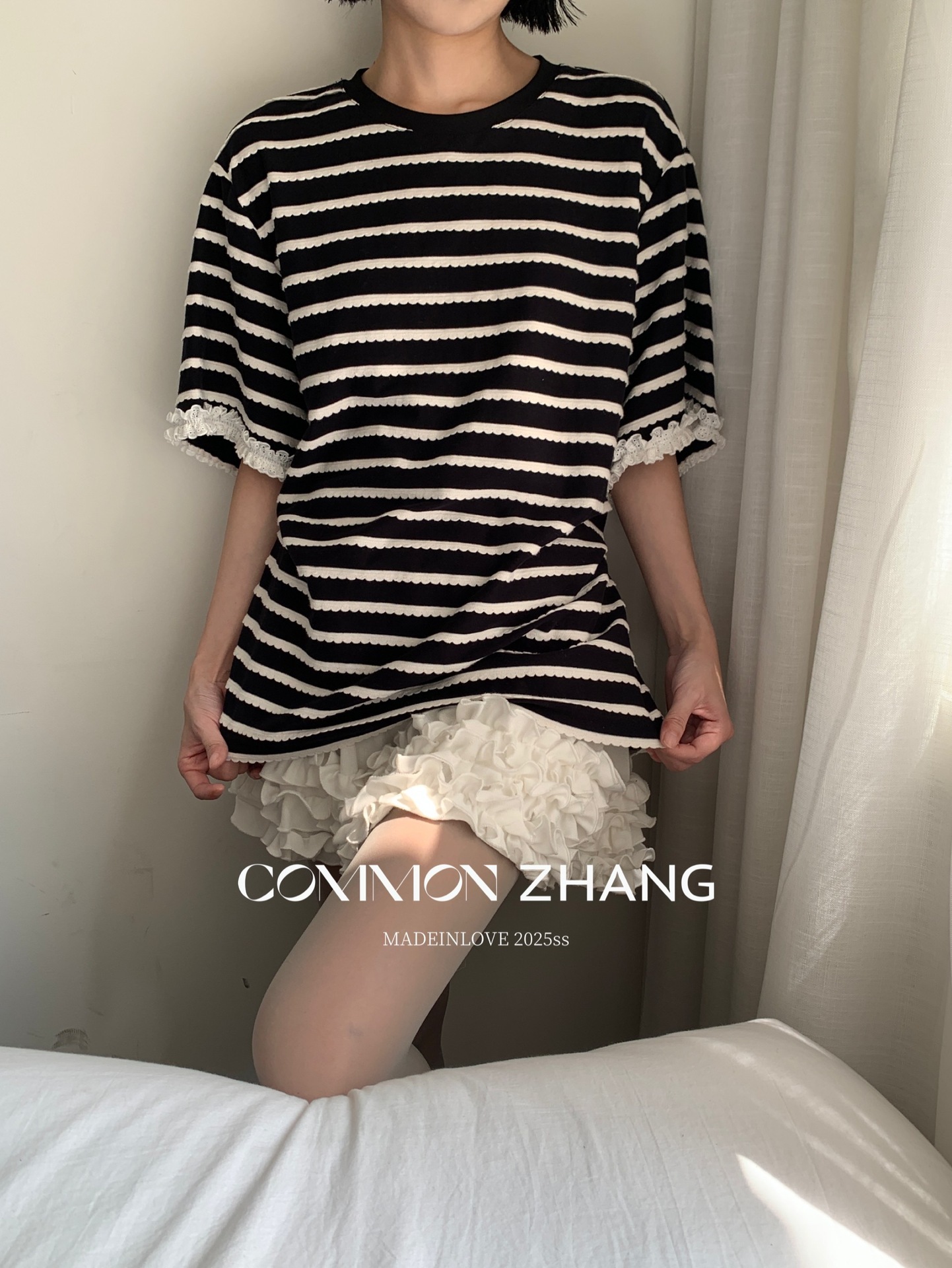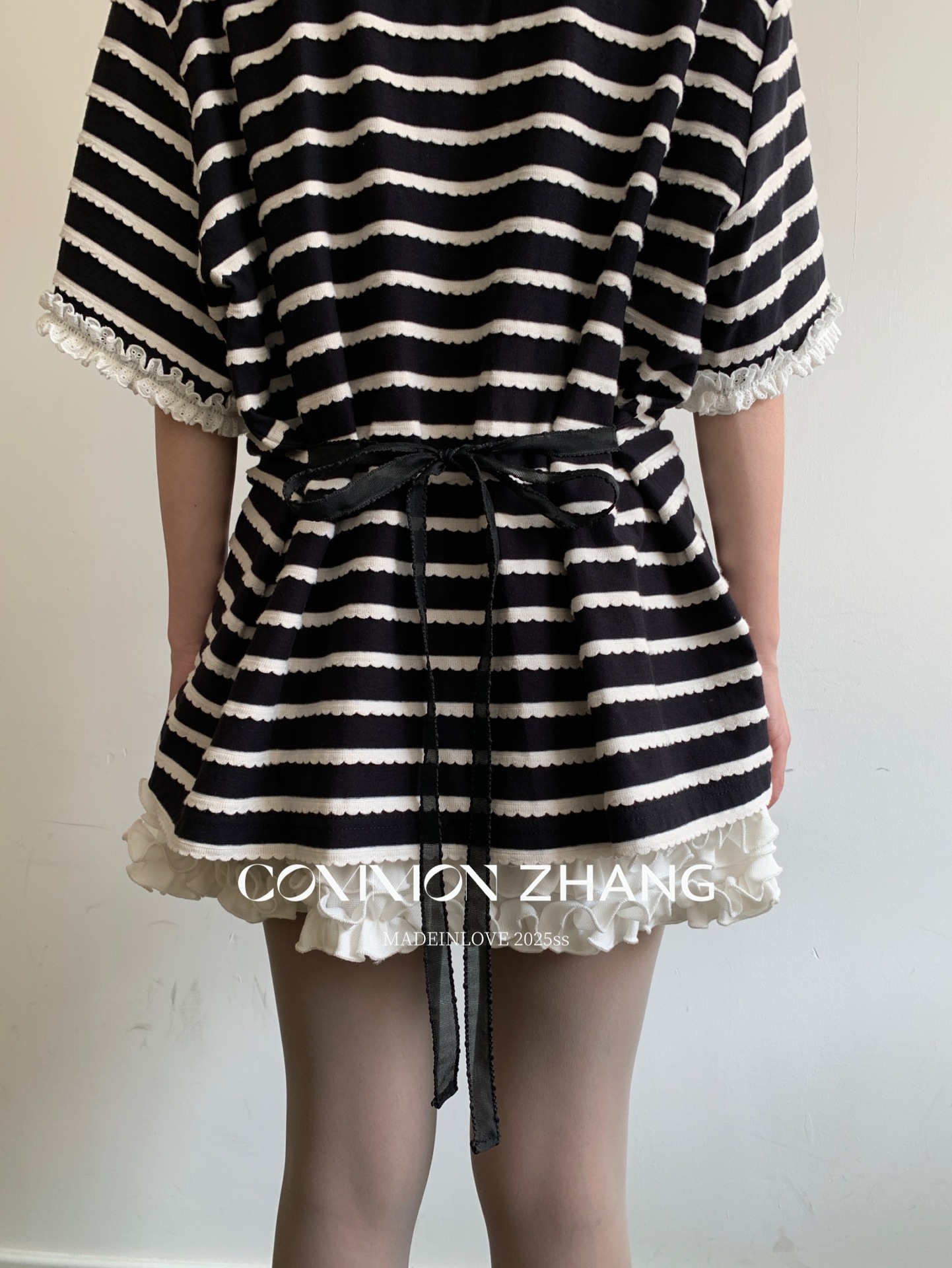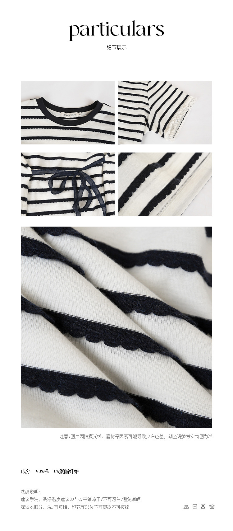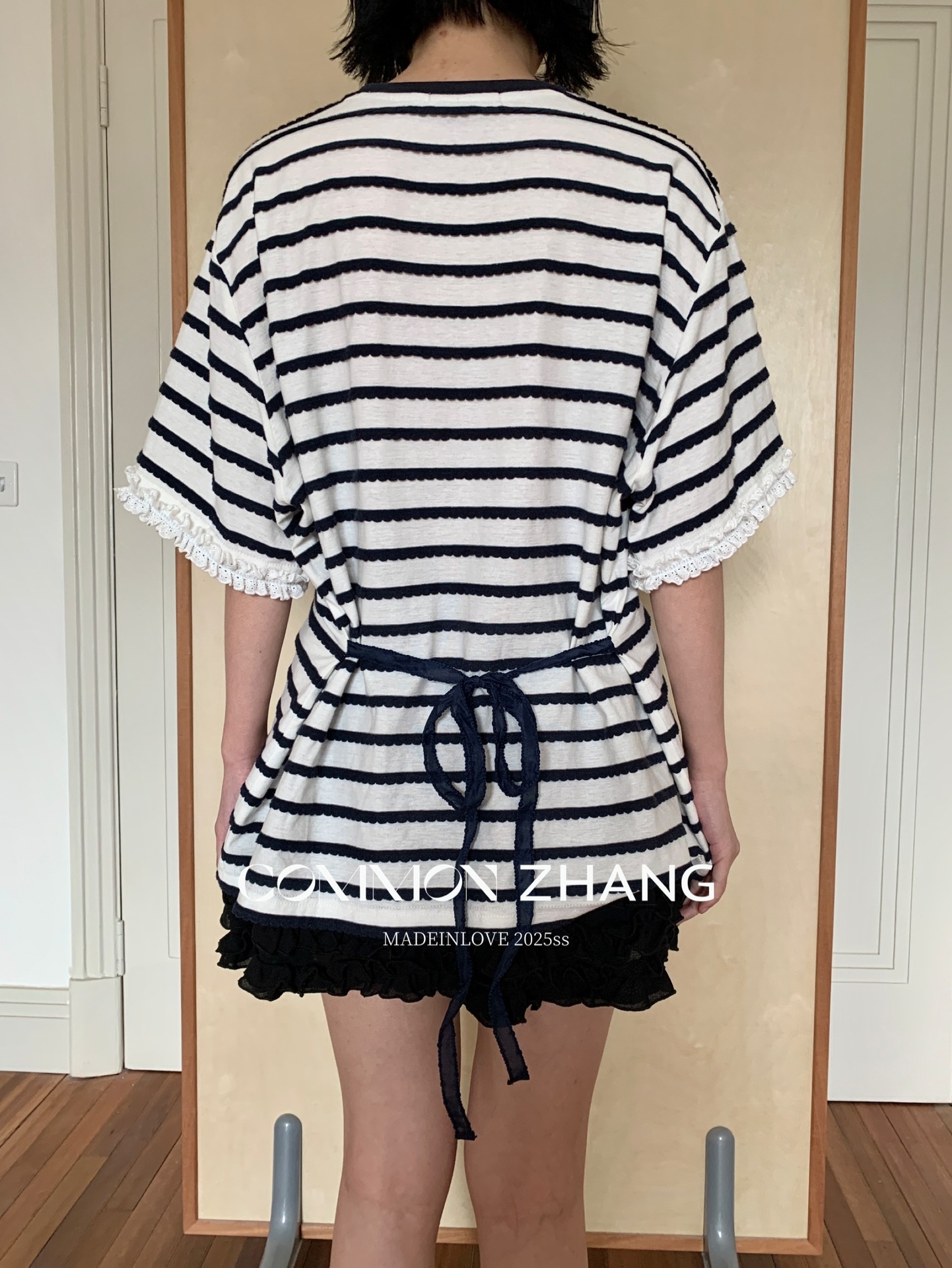 *o-ha-you*【FCZCB200549】夏季韓版減齡條紋蕾絲拼接圓領寬鬆百搭繫帶T恤-2色