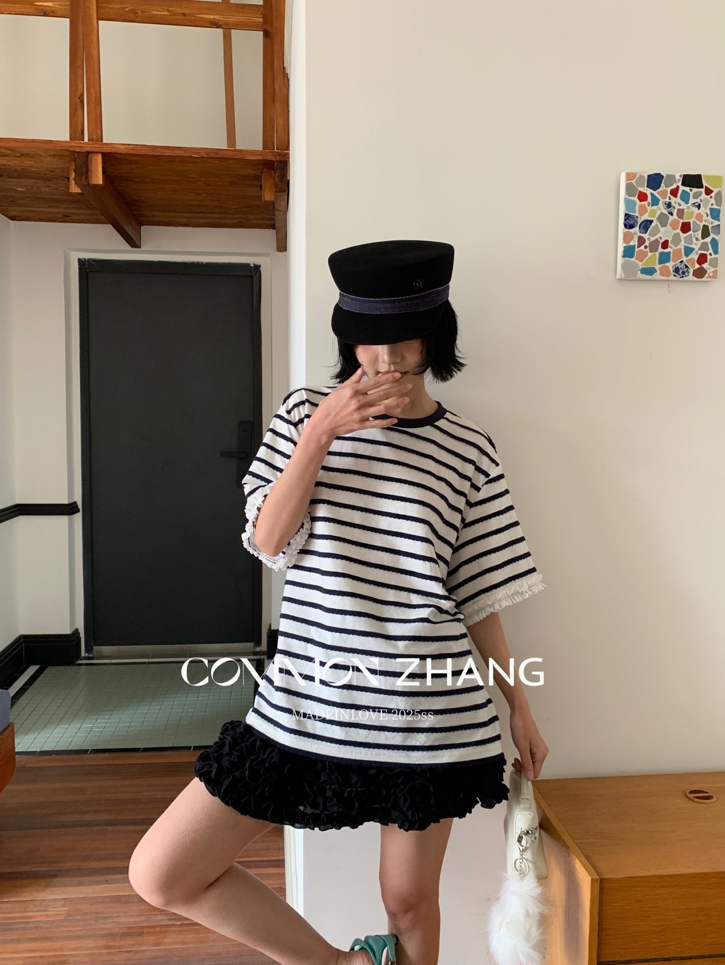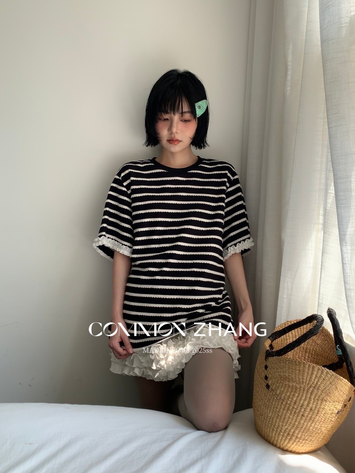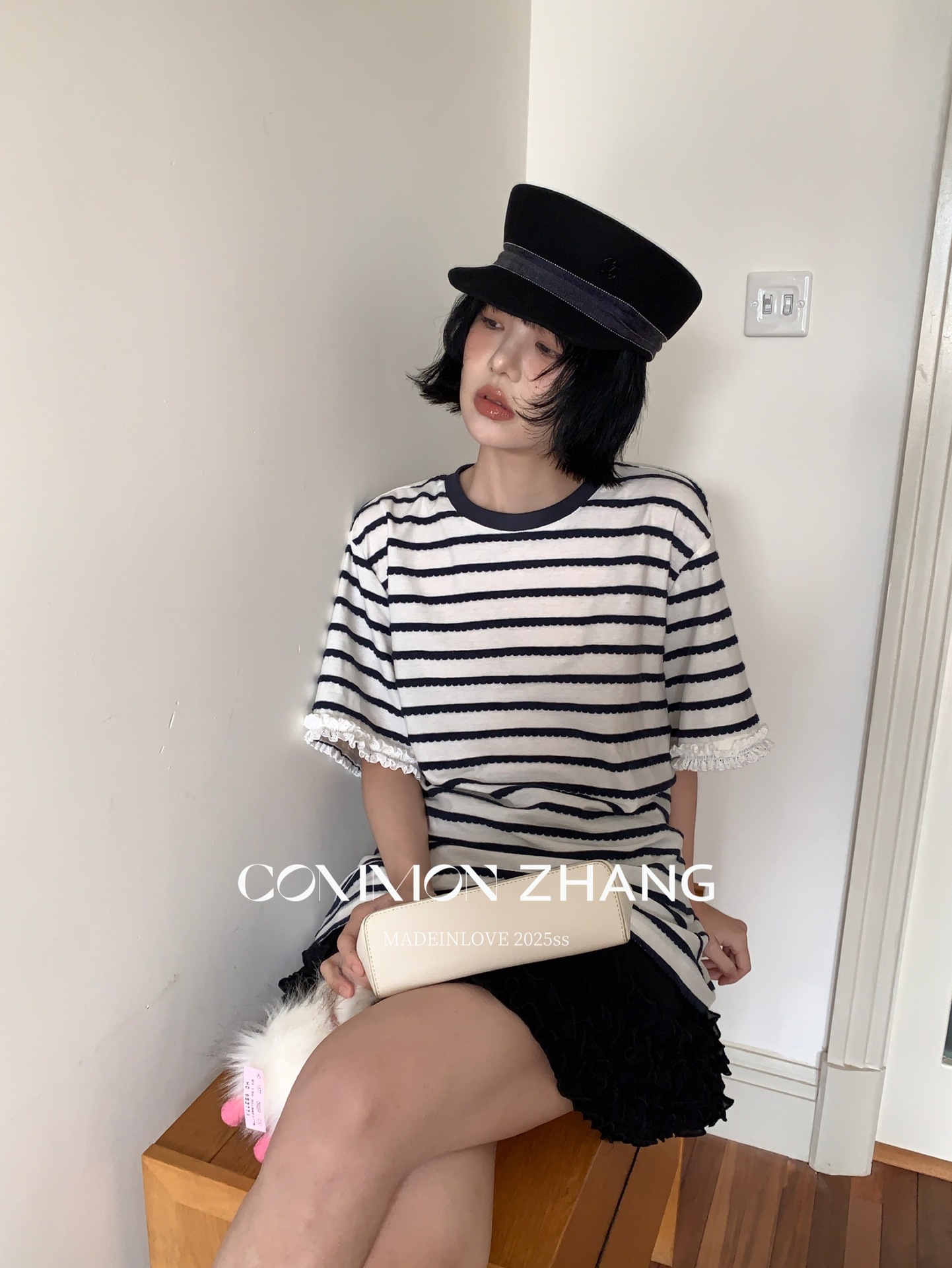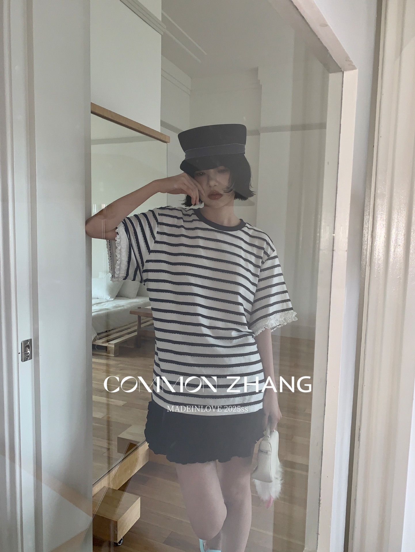 *o-ha-you*【FCZCB200549】夏季韓版減齡條紋蕾絲拼接圓領寬鬆百搭繫帶T恤-2色