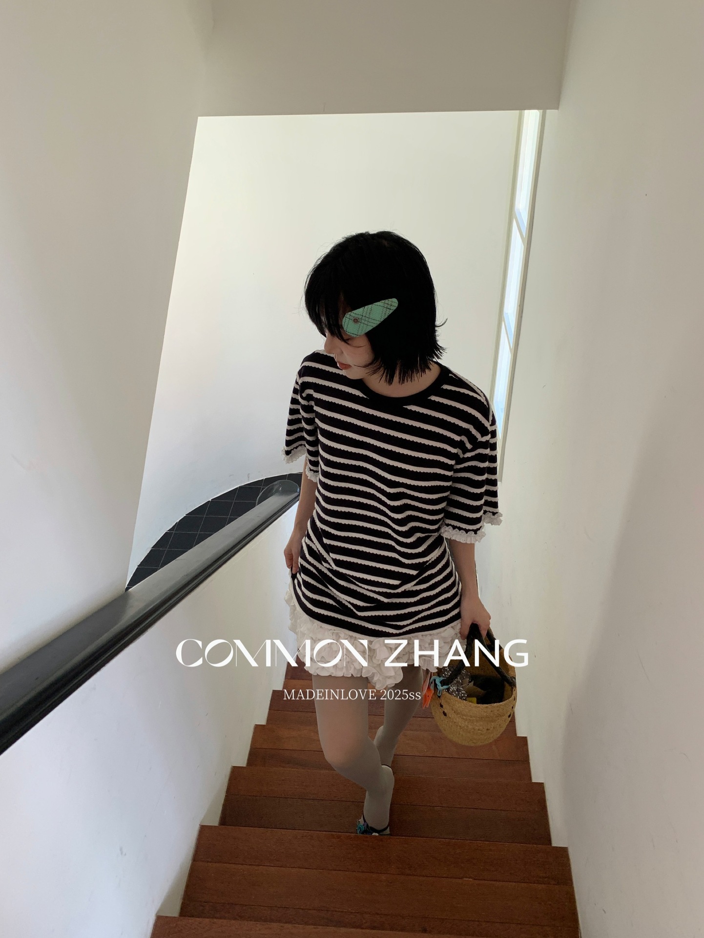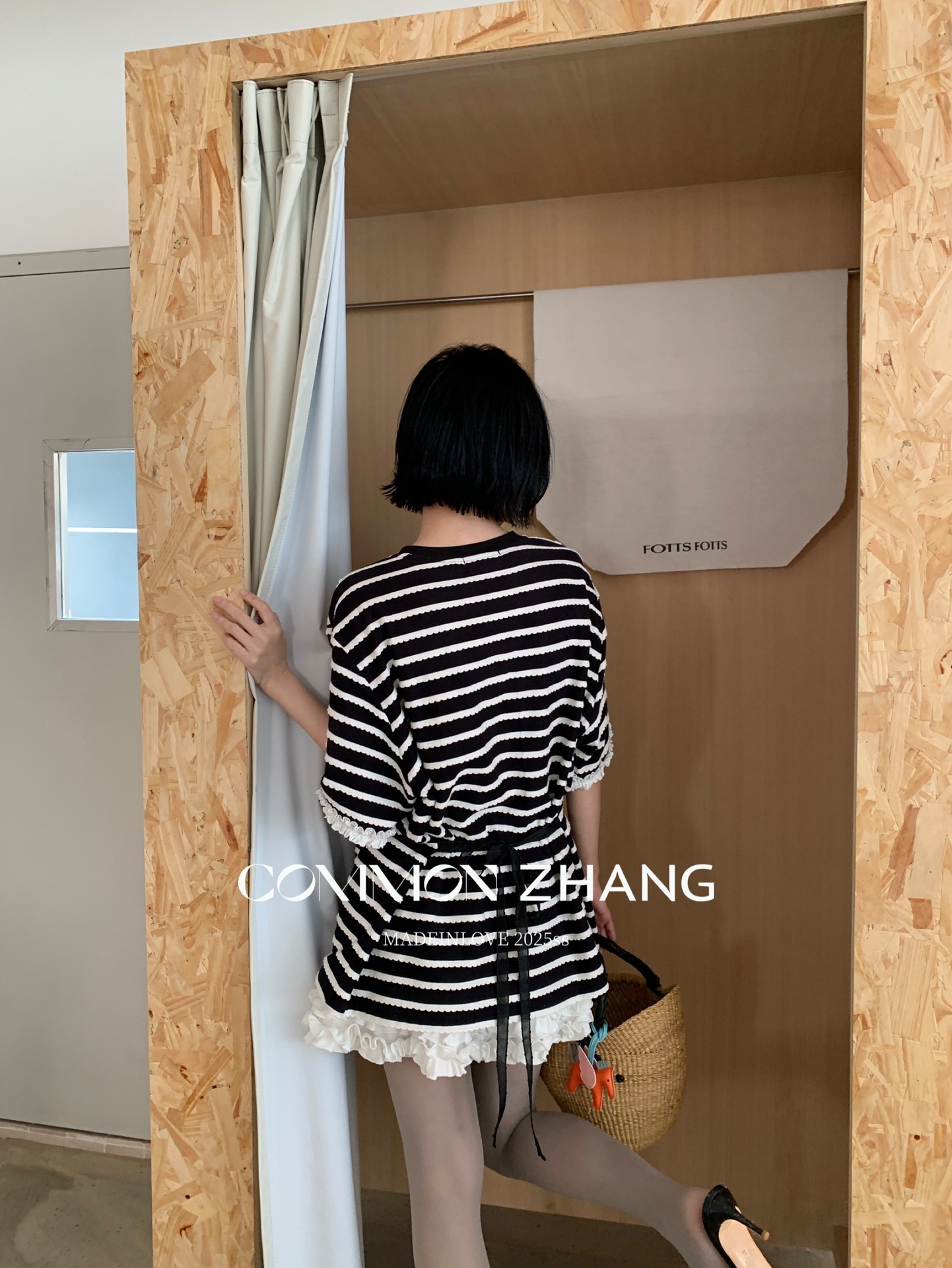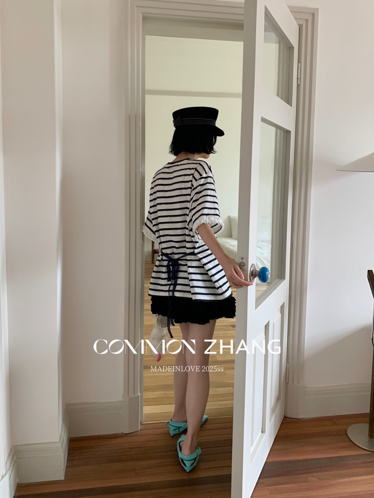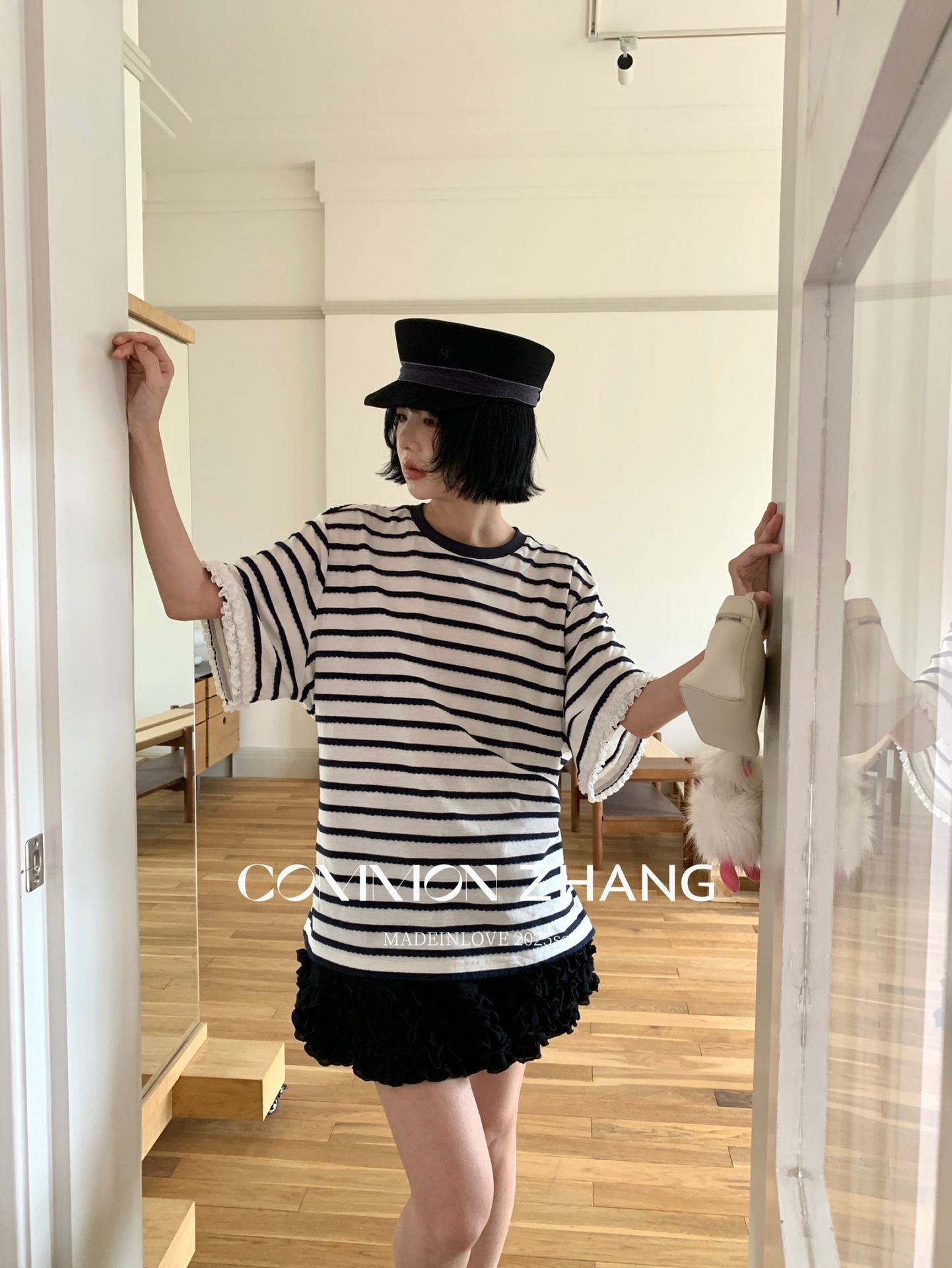 *o-ha-you*【FCZCB200549】夏季韓版減齡條紋蕾絲拼接圓領寬鬆百搭繫帶T恤-2色