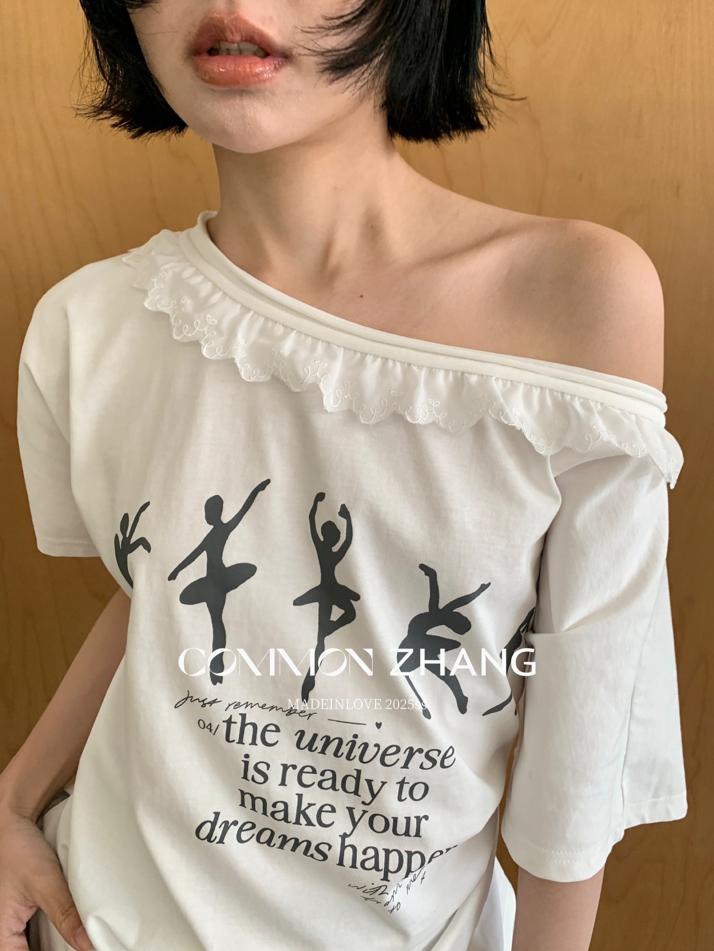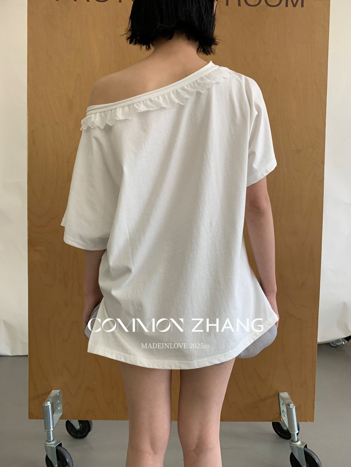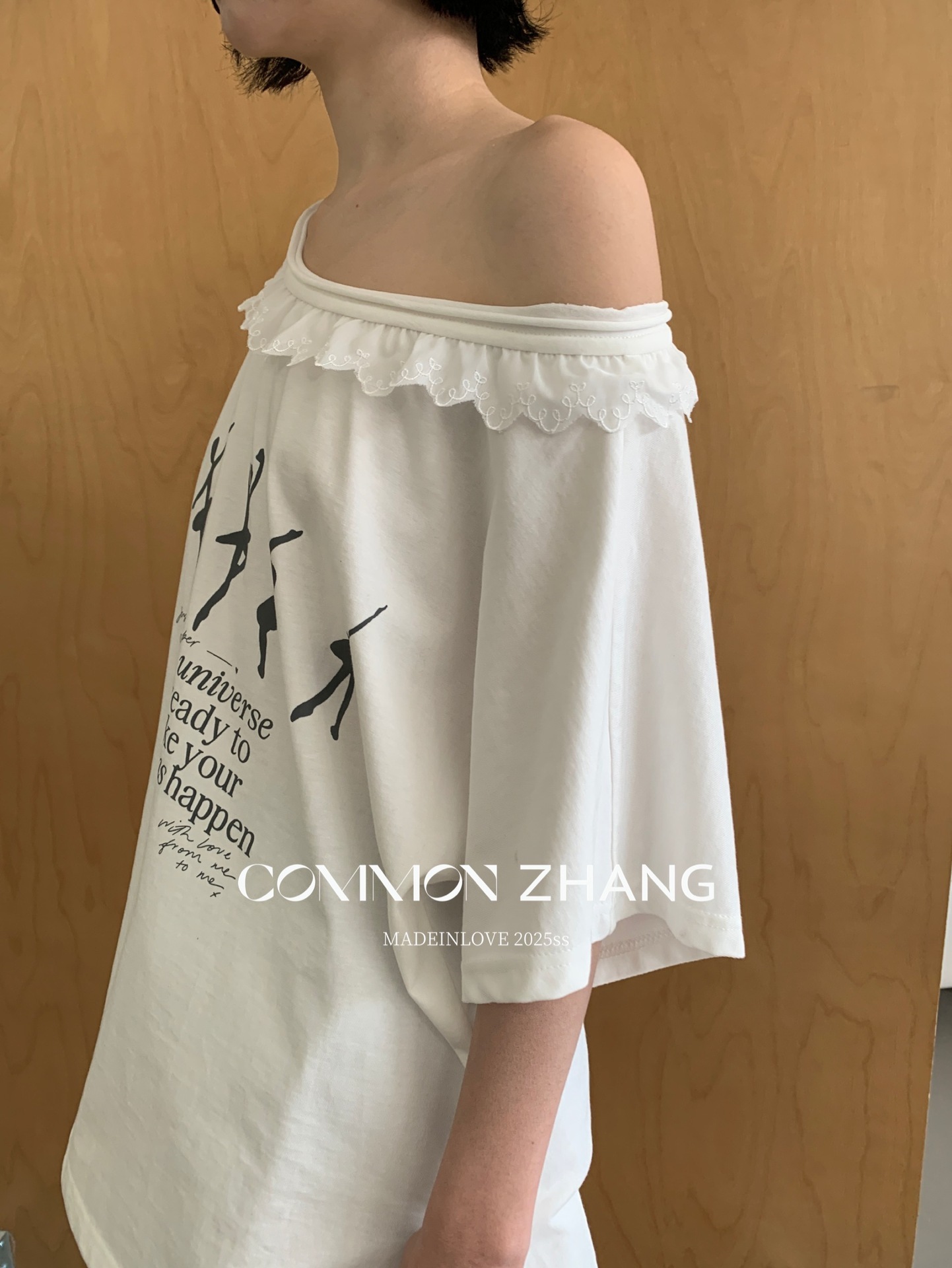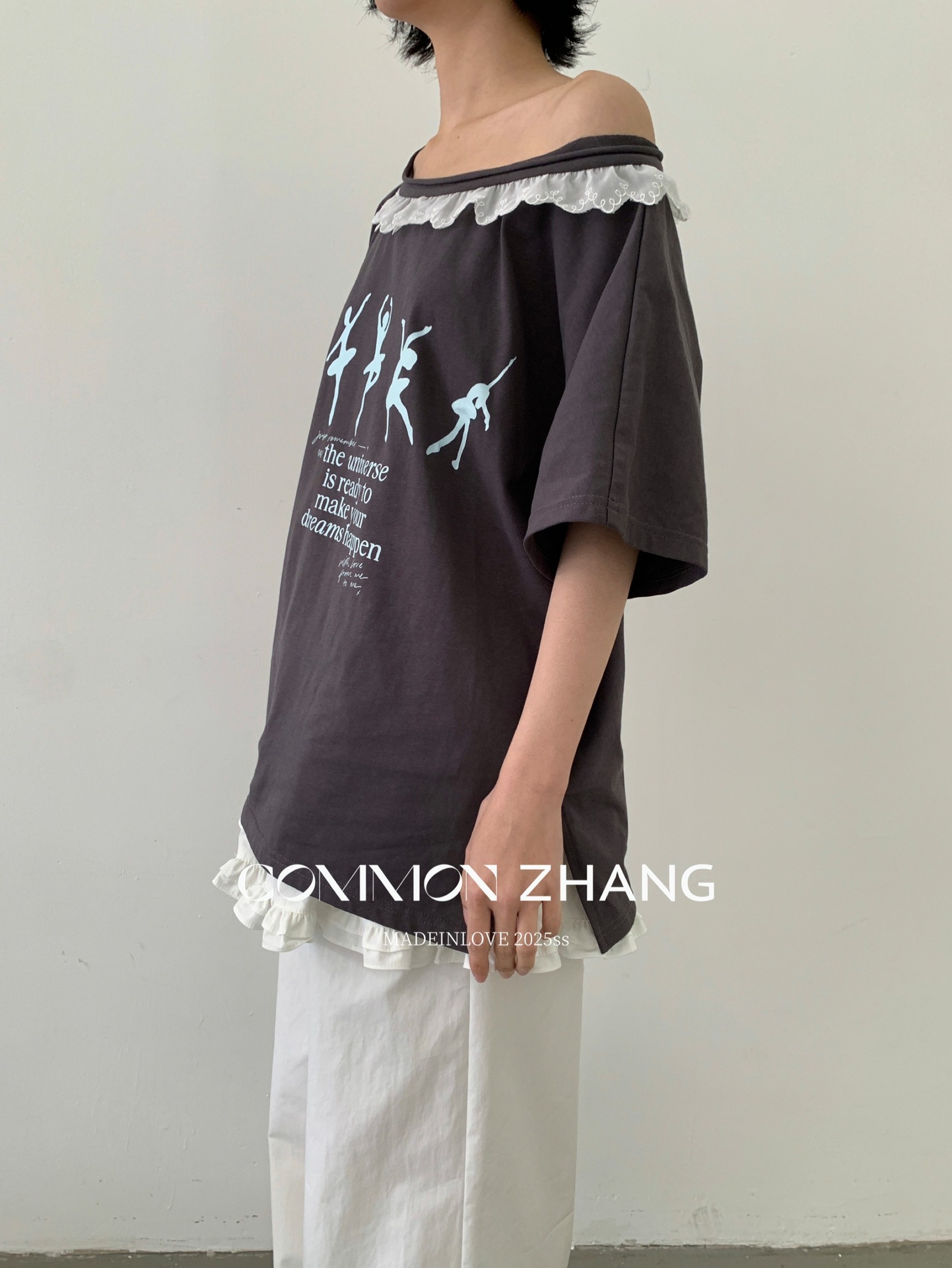*o-ha-you*【FCZCB200805】夏季韓風減齡斜領蕾絲邊拼接印花寬鬆百搭短袖T恤-2色