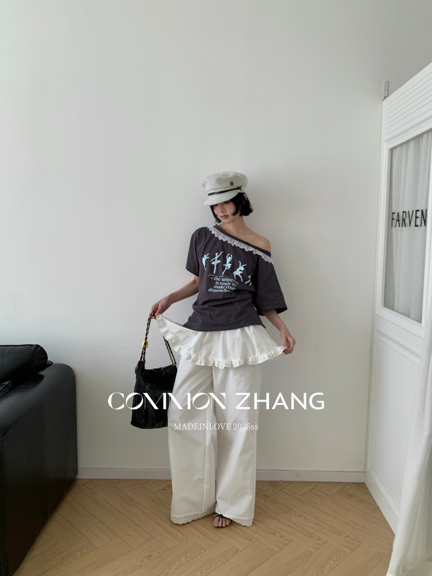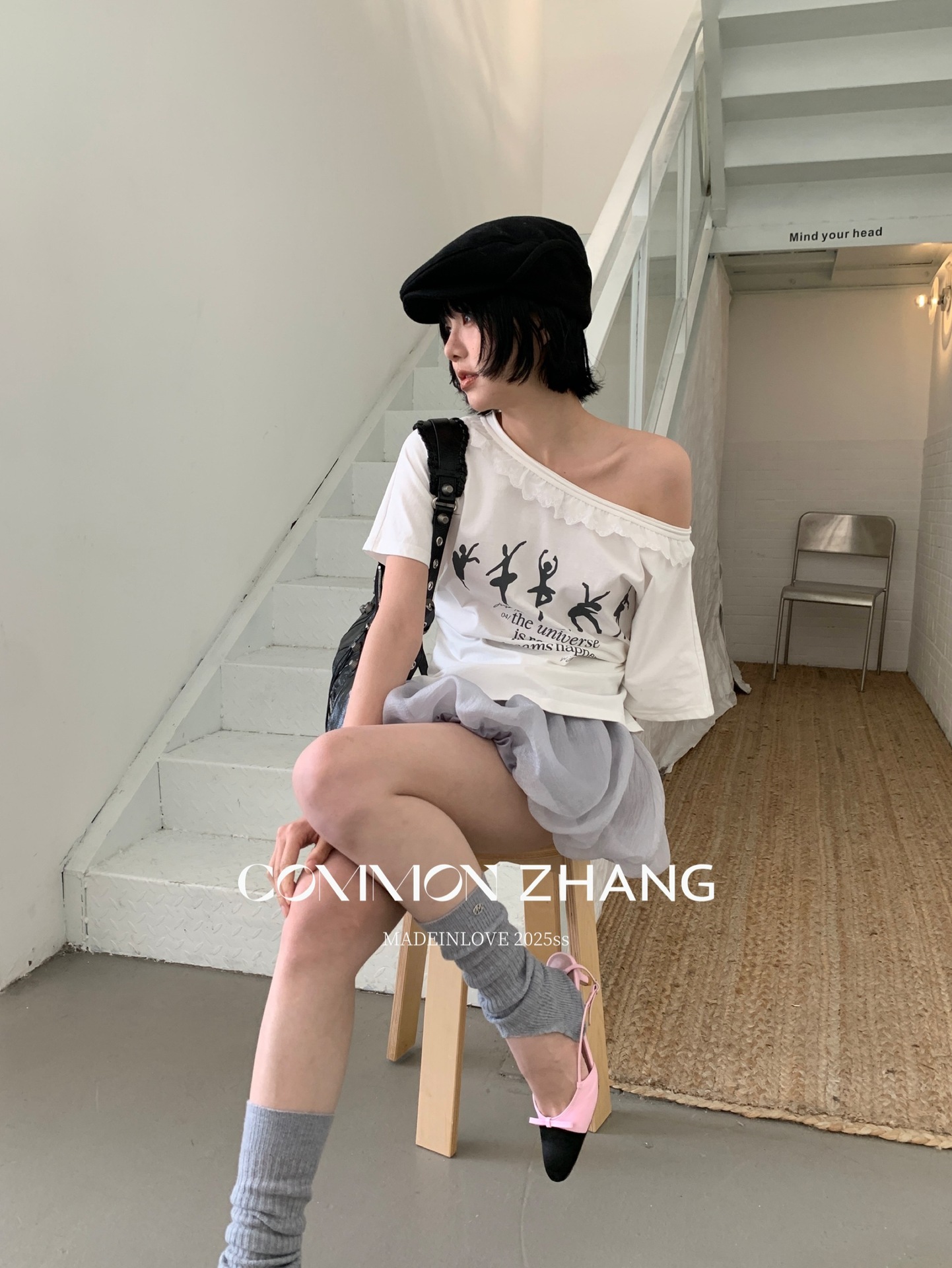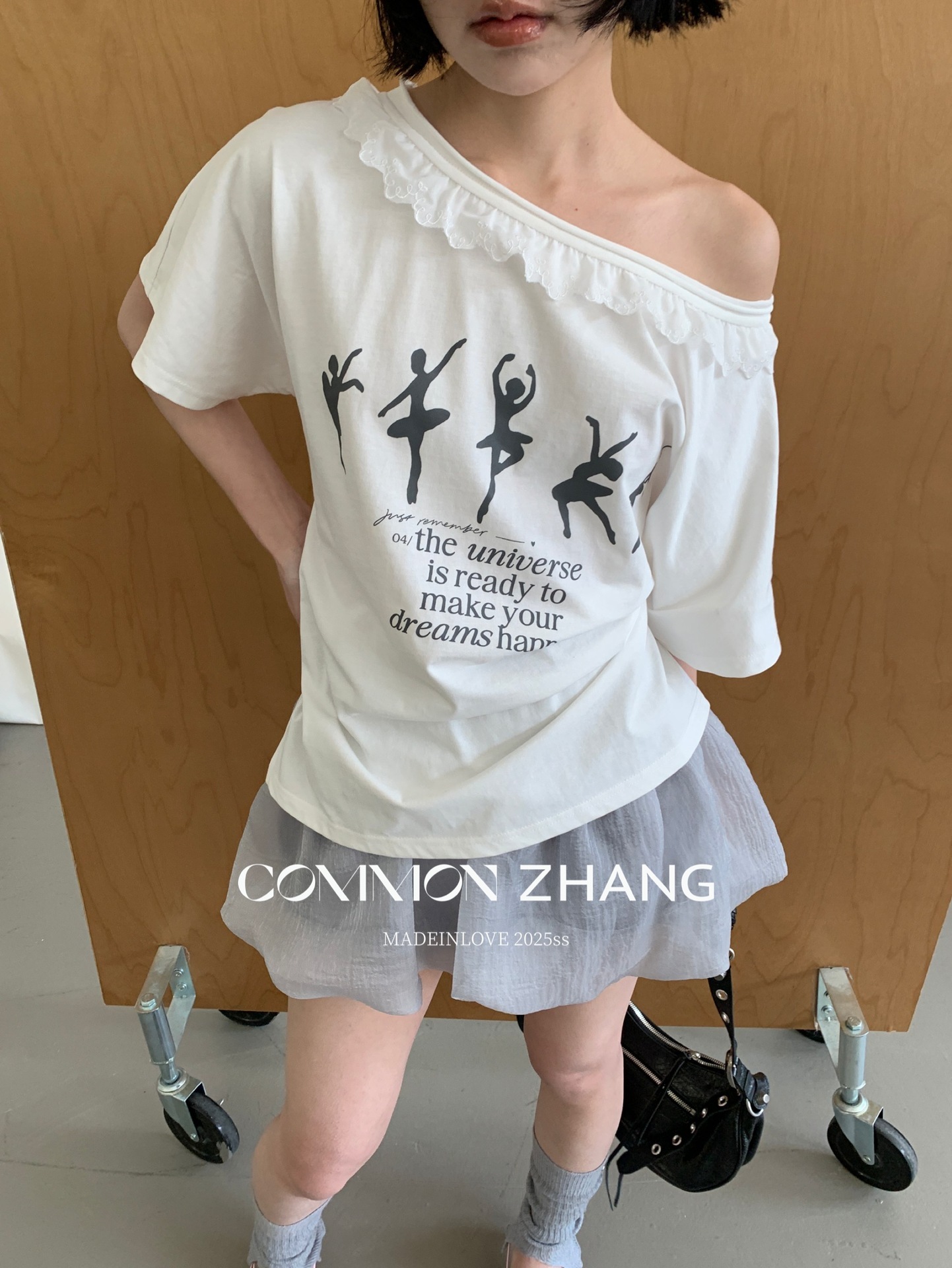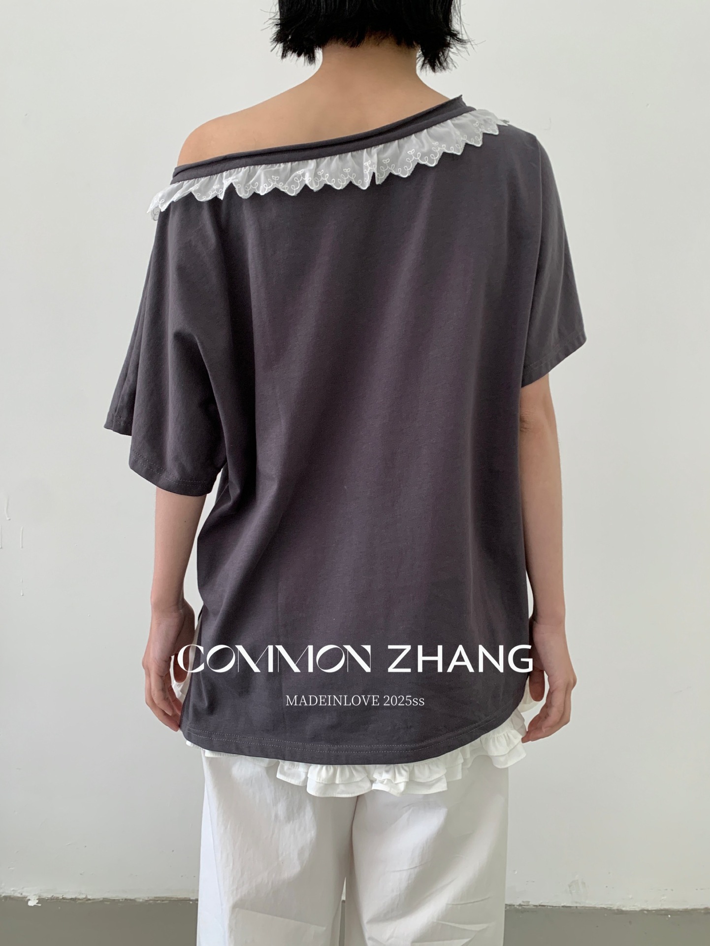 *o-ha-you*【FCZCB200805】夏季韓風減齡斜領蕾絲邊拼接印花寬鬆百搭短袖T恤-2色