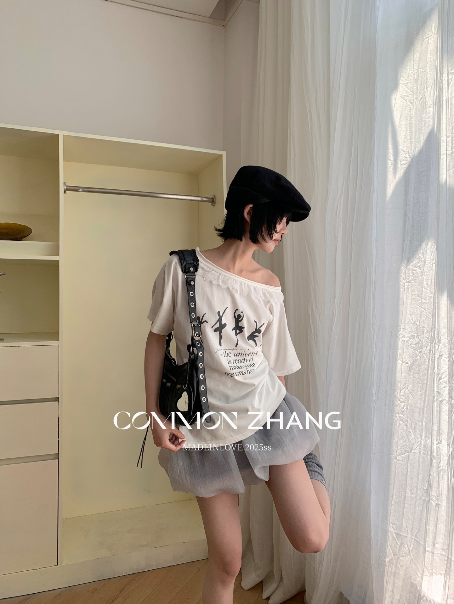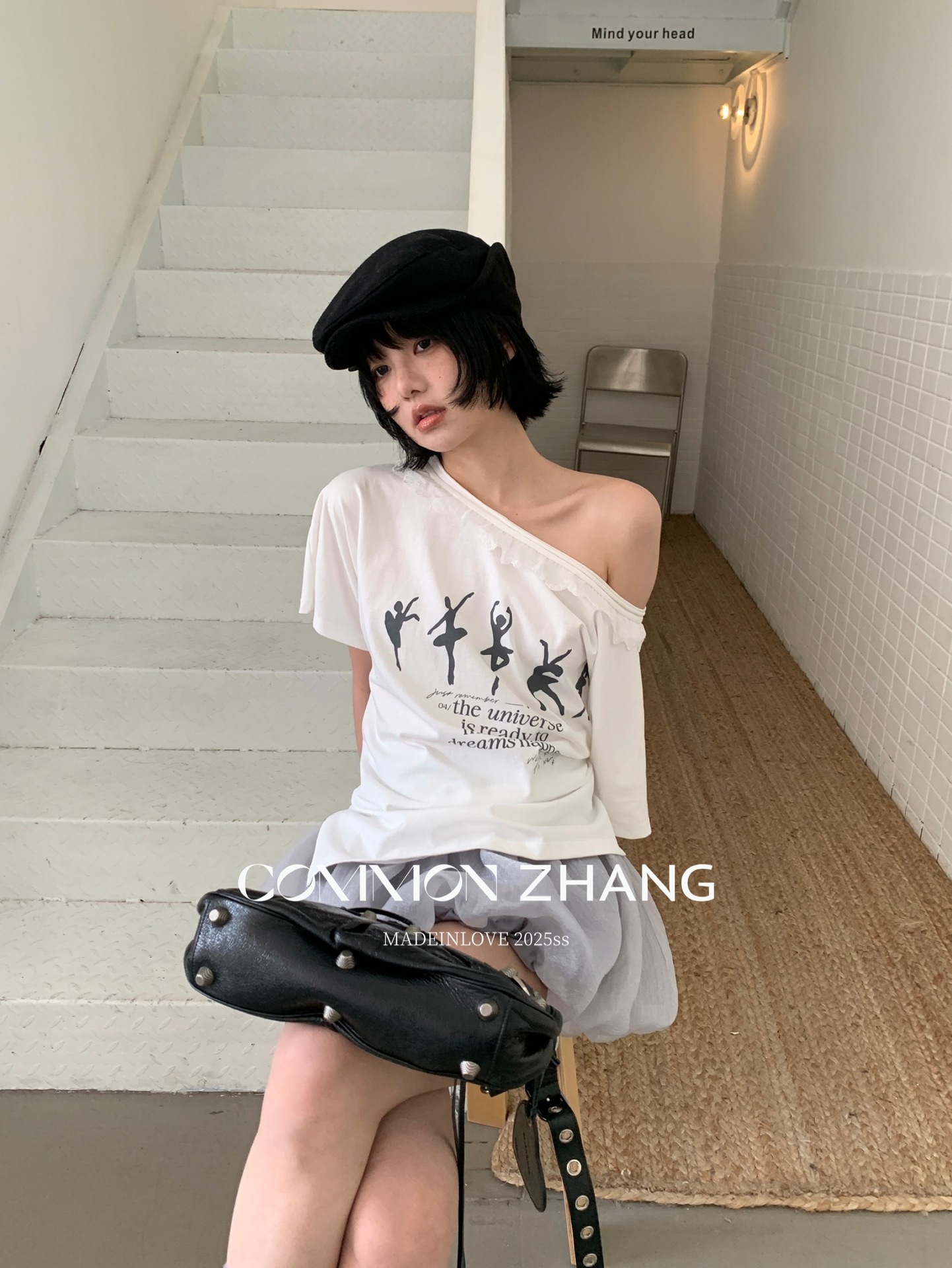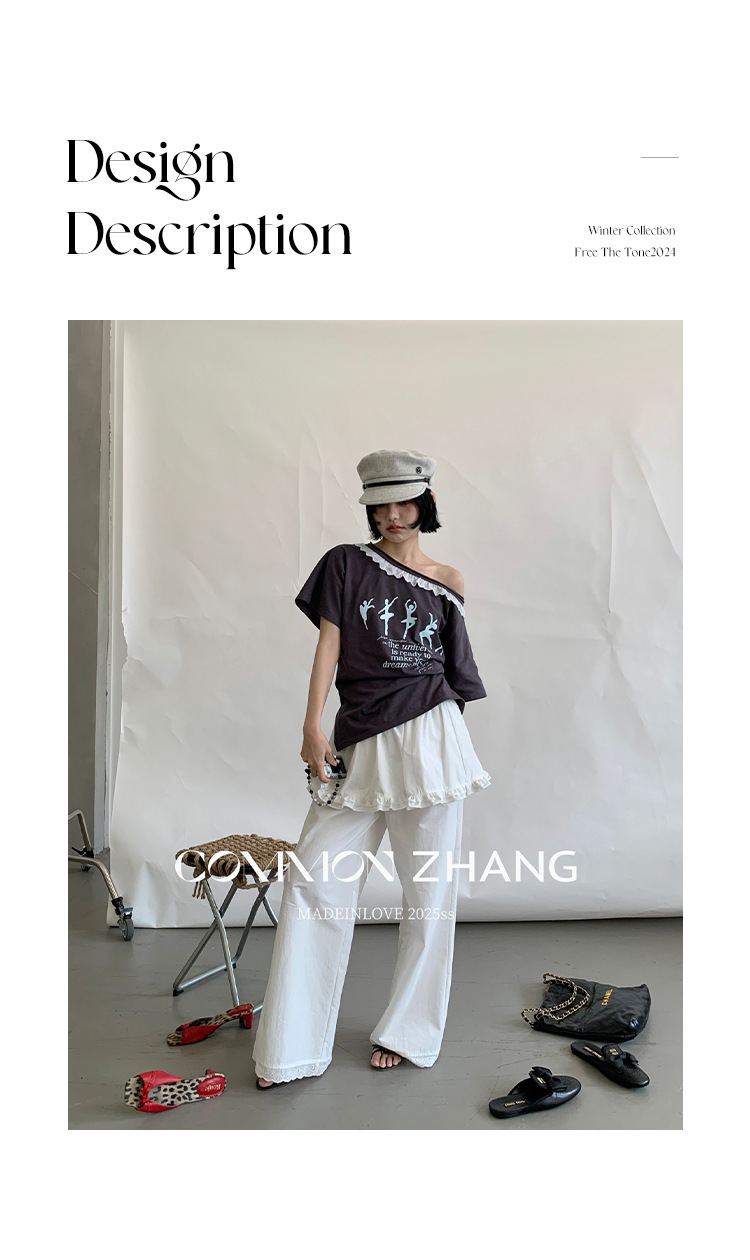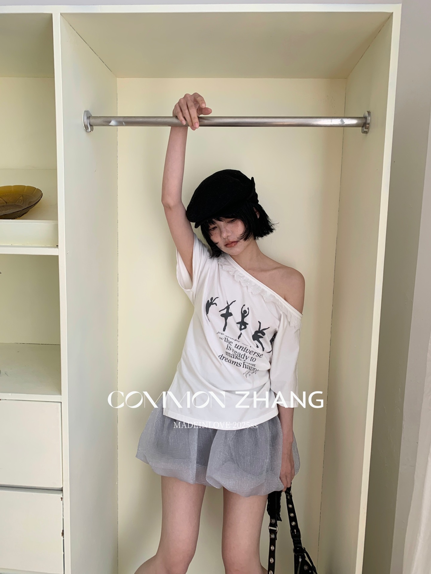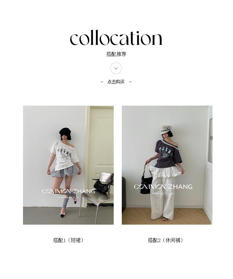 *o-ha-you*【FCZCB200805】夏季韓風減齡斜領蕾絲邊拼接印花寬鬆百搭短袖T恤-2色