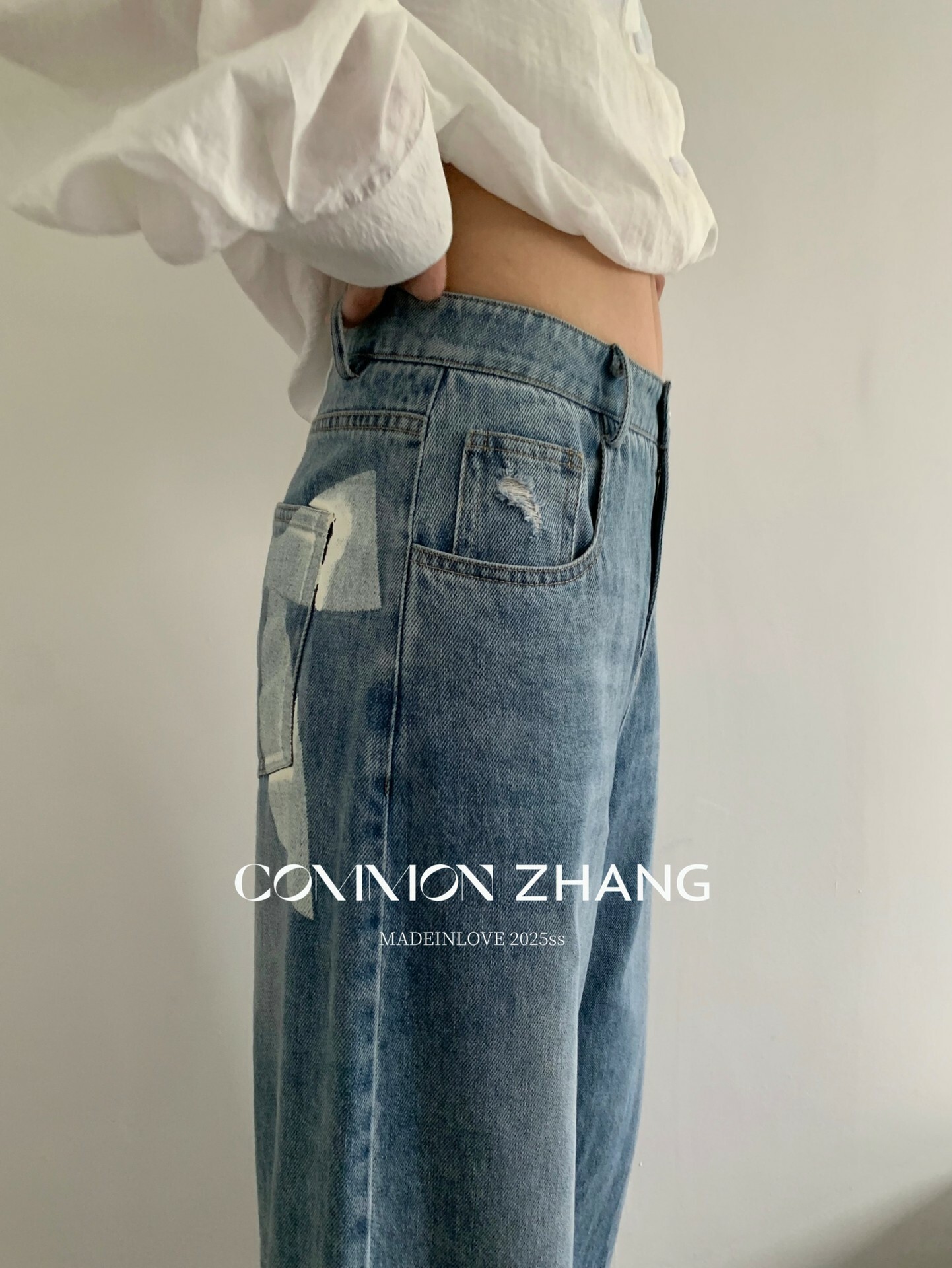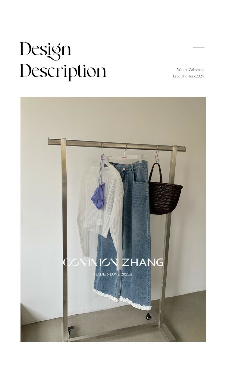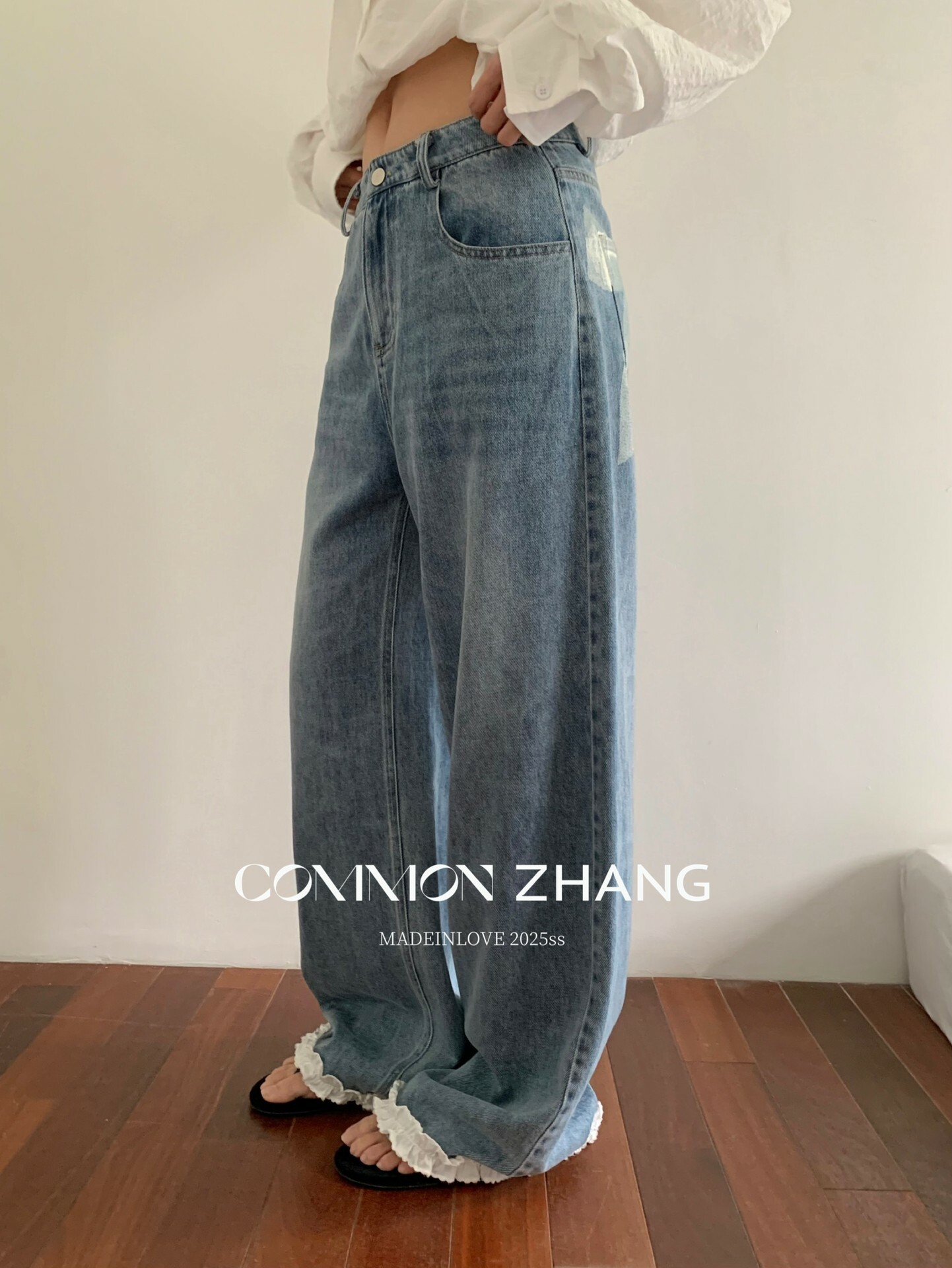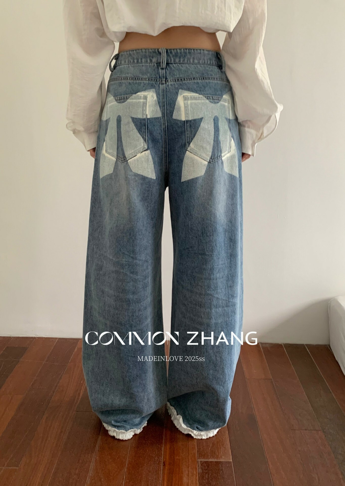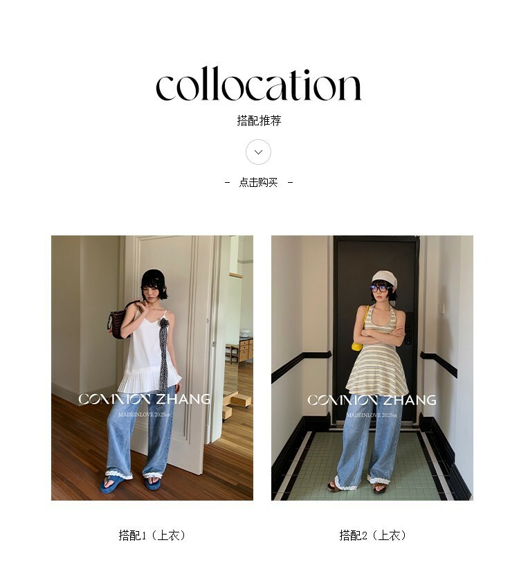 *o-ha-you*【FCZCB201750】夏日韓版蝴蝶結印花低腰垂感闊腿蕾絲拼接牛仔褲