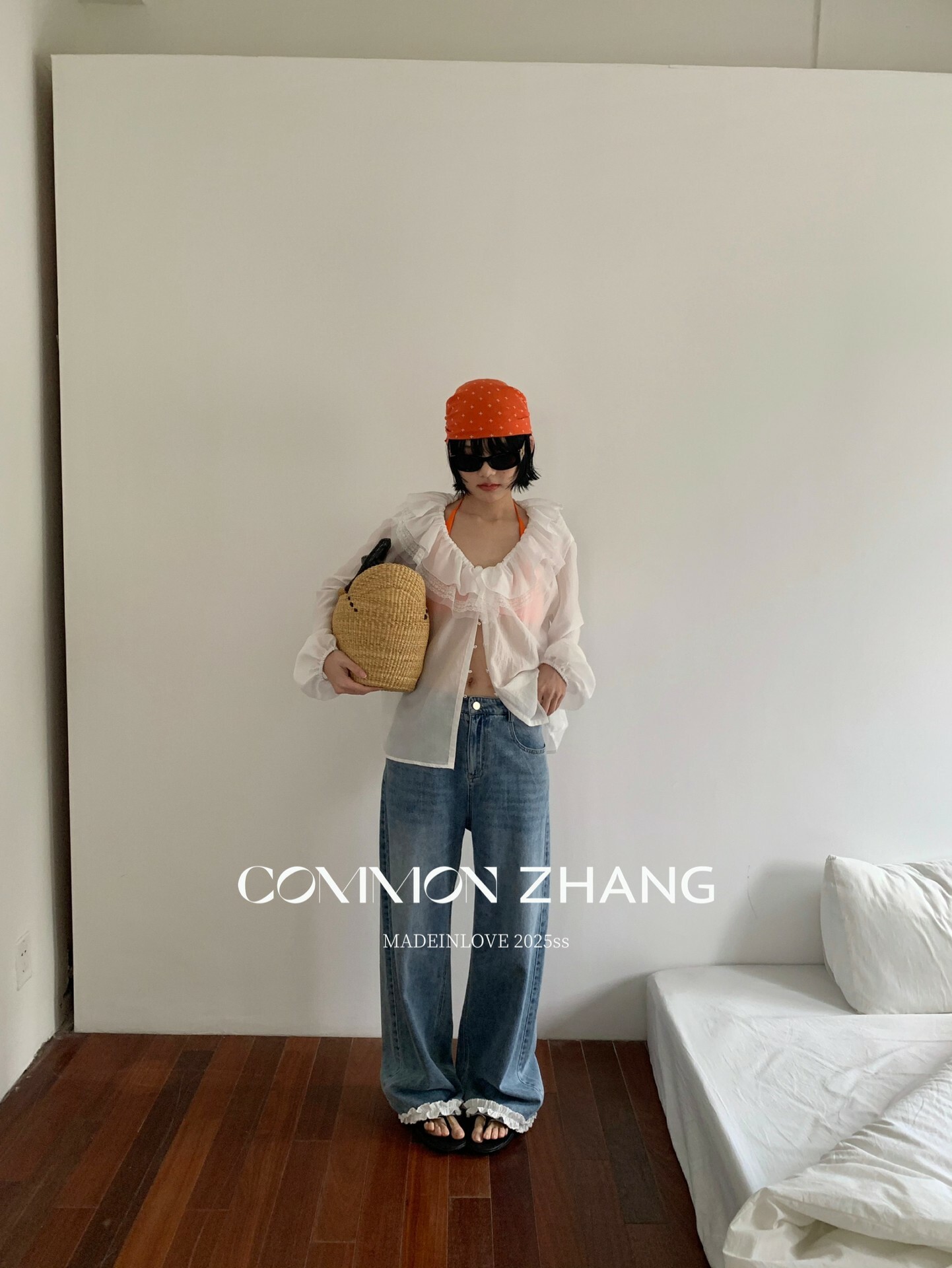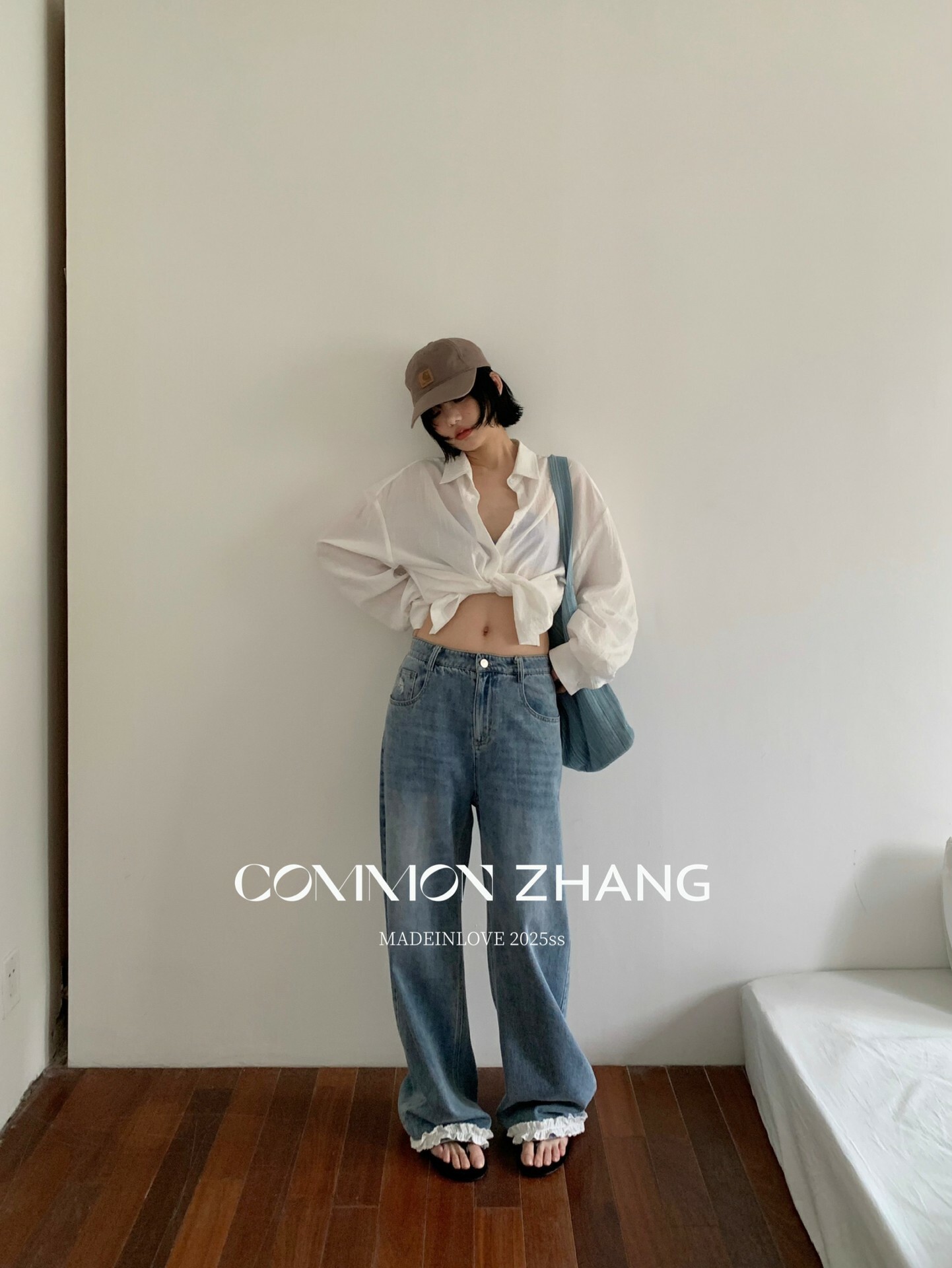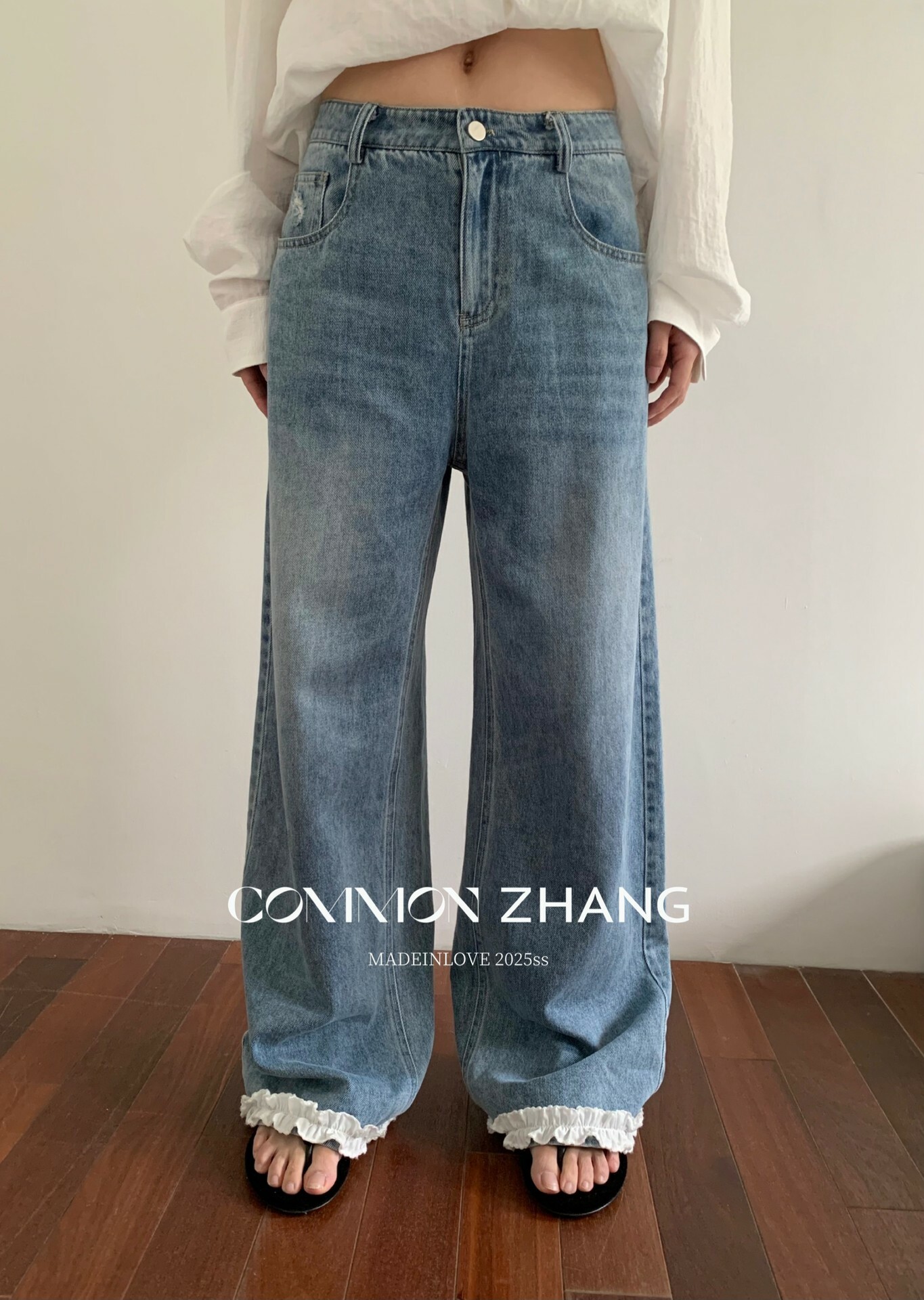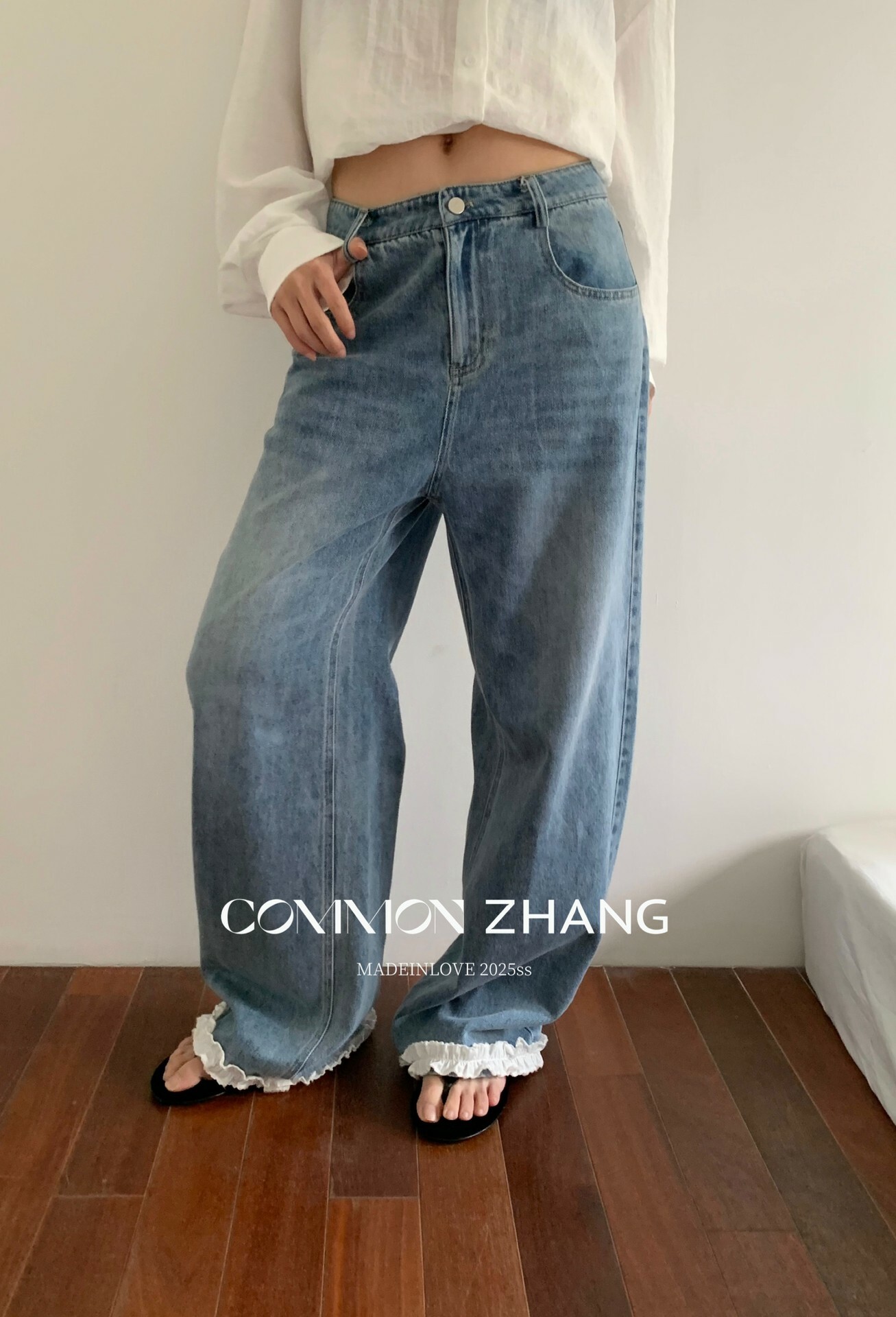 *o-ha-you*【FCZCB201750】夏日韓版蝴蝶結印花低腰垂感闊腿蕾絲拼接牛仔褲