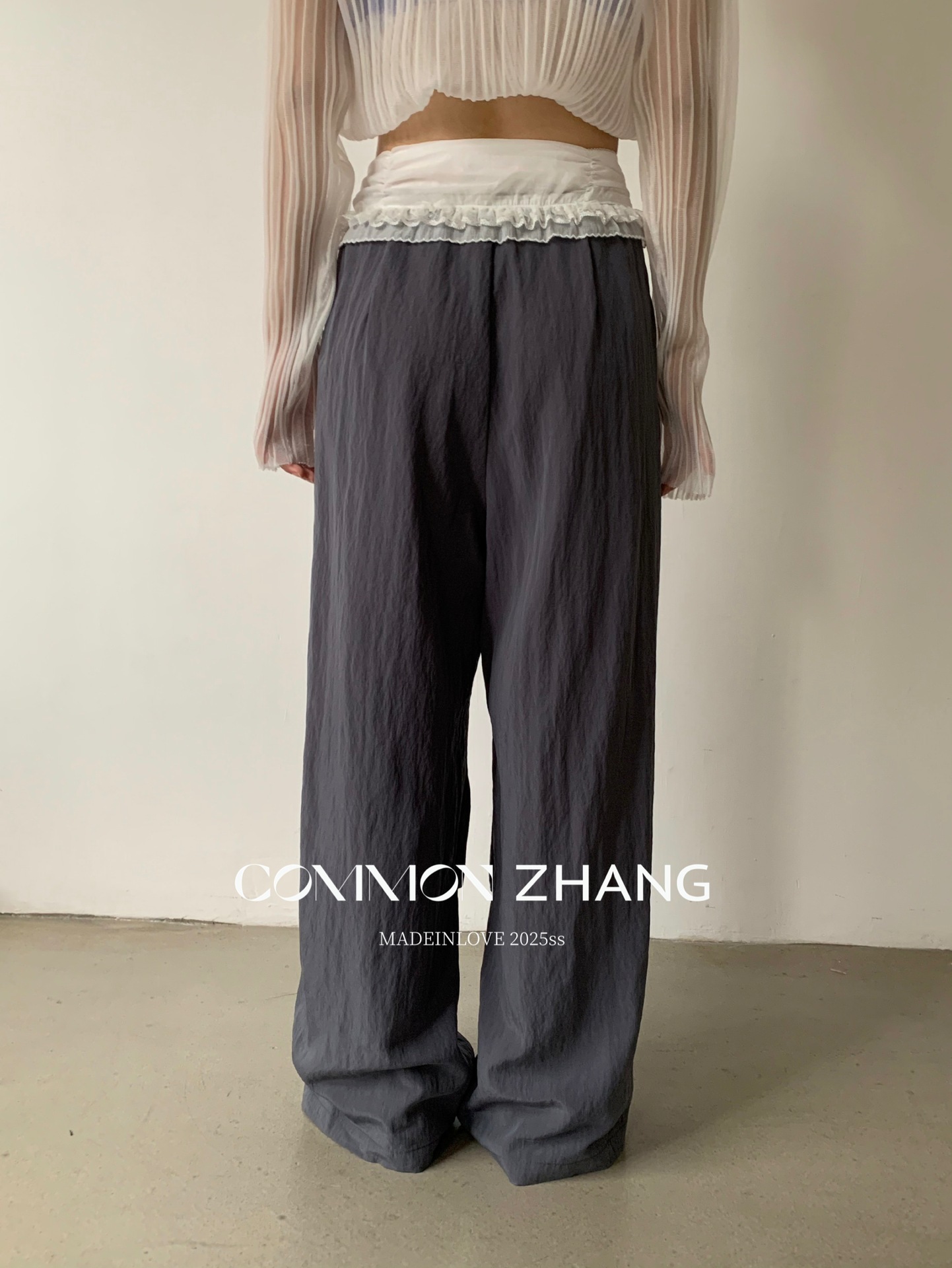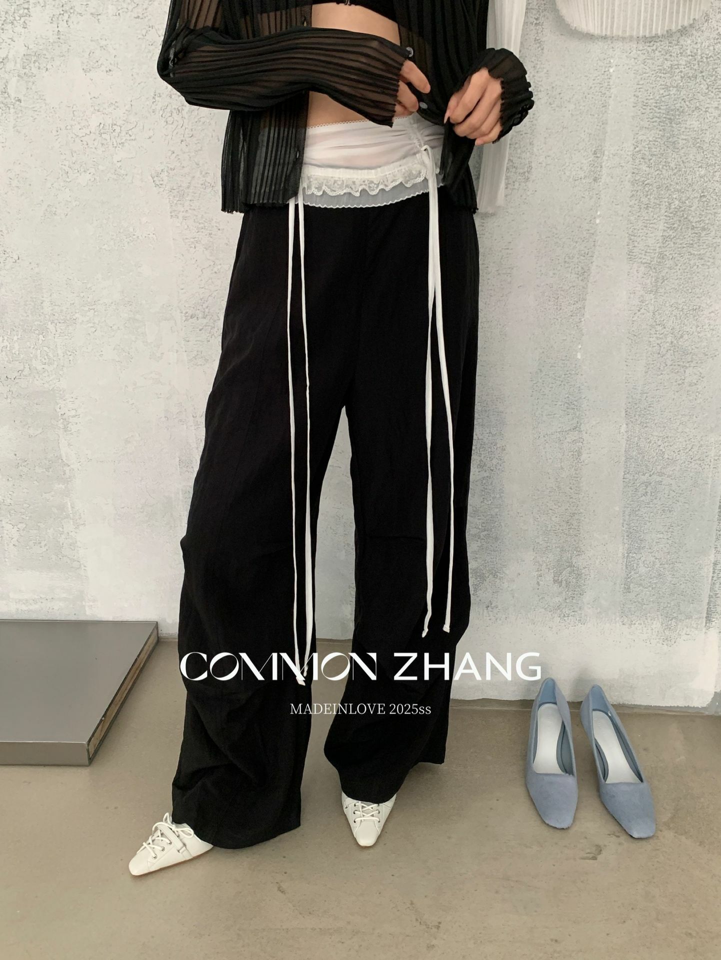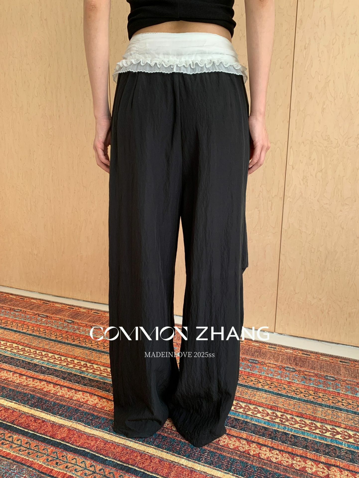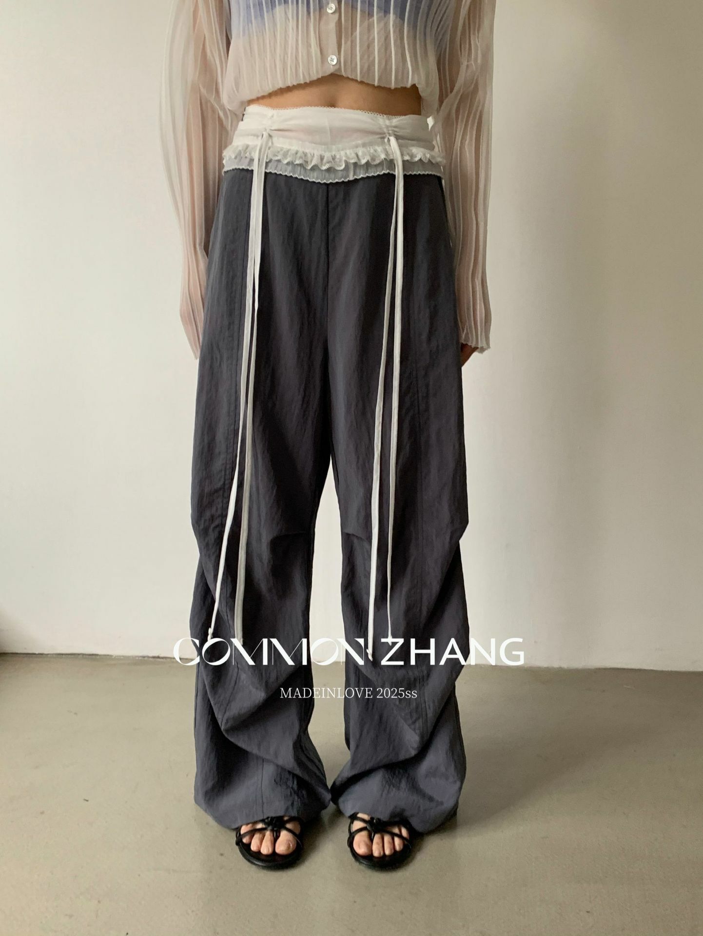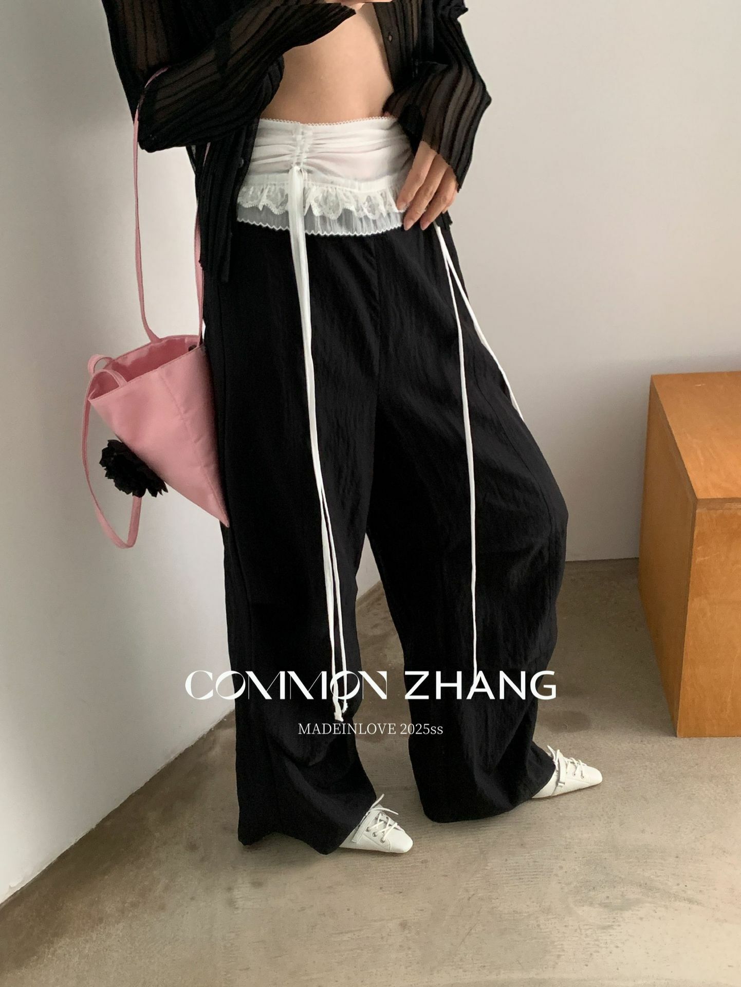 *o-ha-you*【FCZCB201813】夏季韓版蕾絲繫帶低腰闊腿垂感拖地天絲質感休閒褲-2色