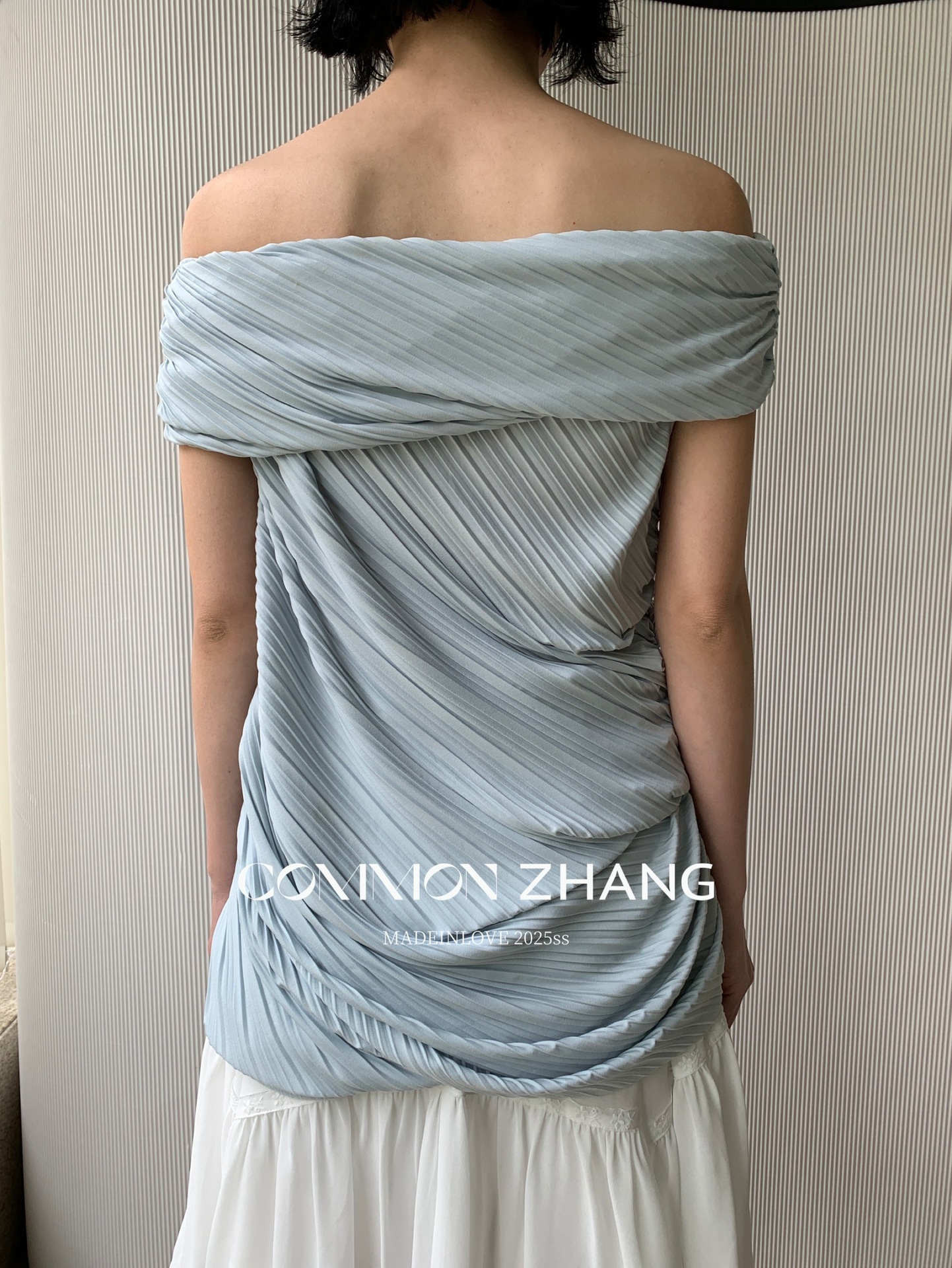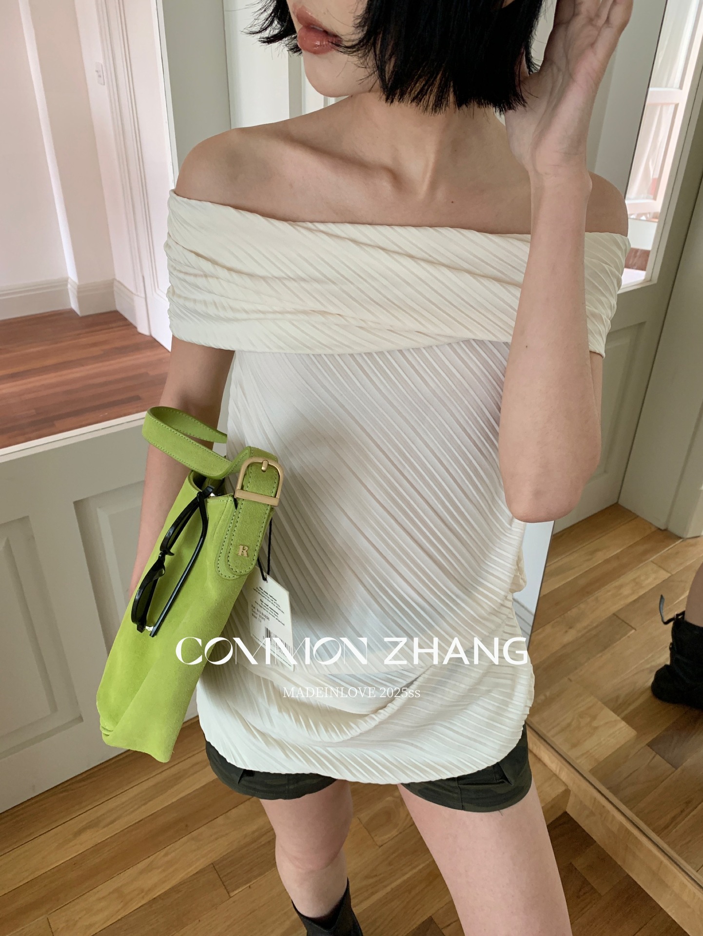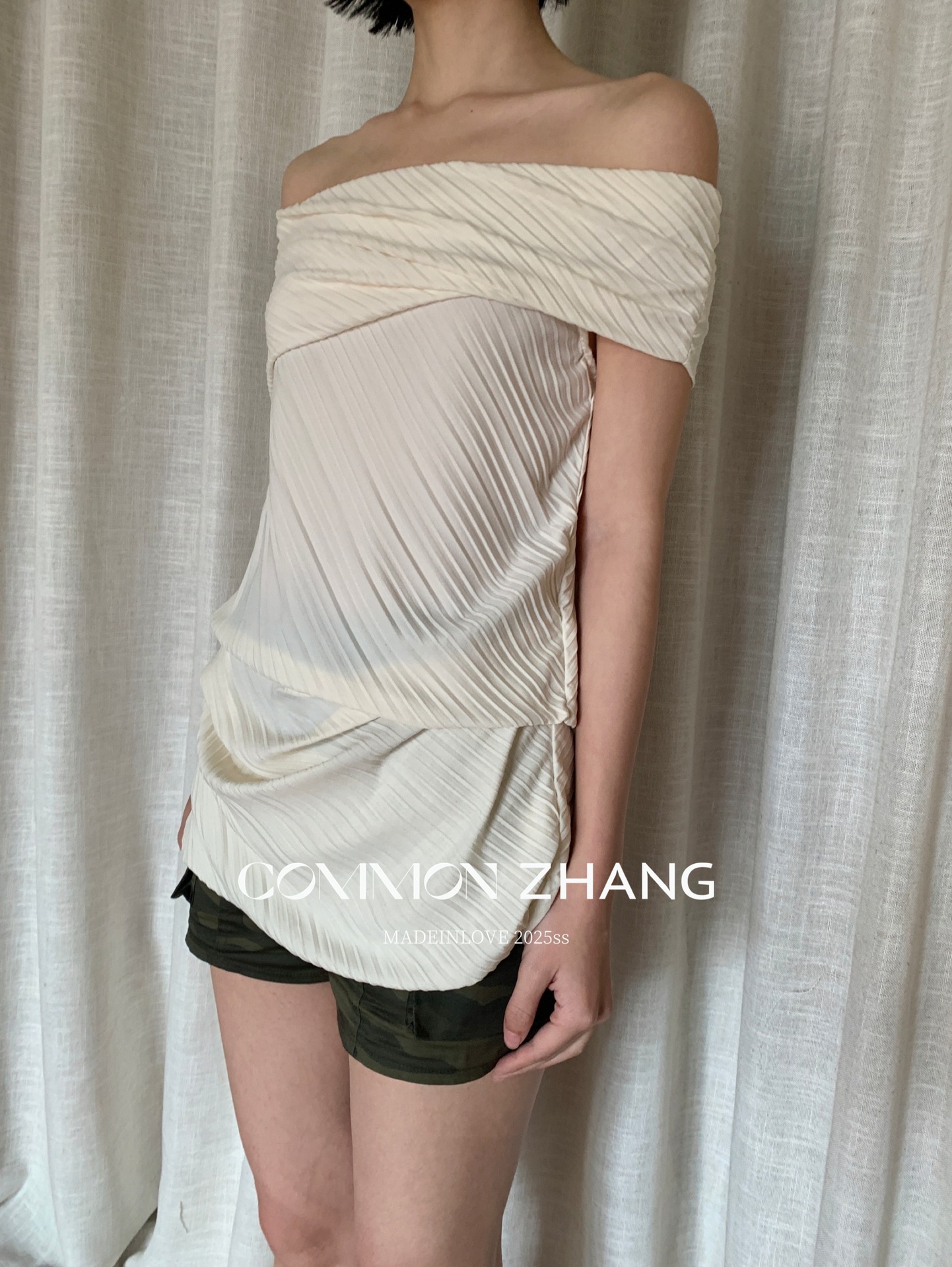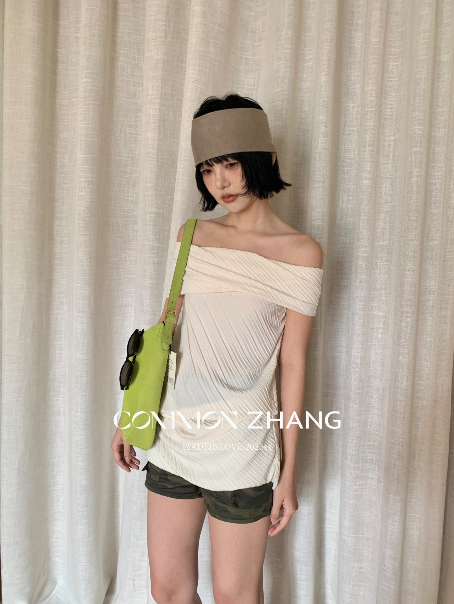 *o-ha-you*【FCZCB203600】夏季法式三宅風一字領露肩性感壓皺質感透視純色百搭小衫-3色