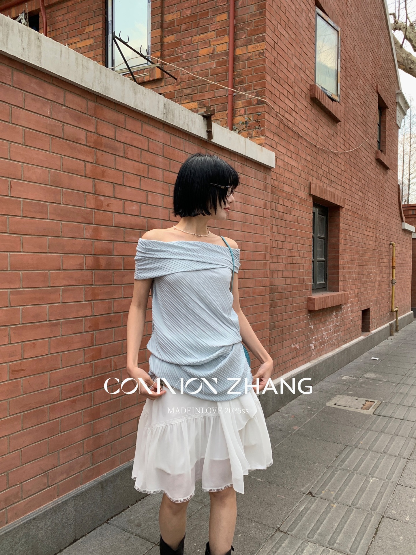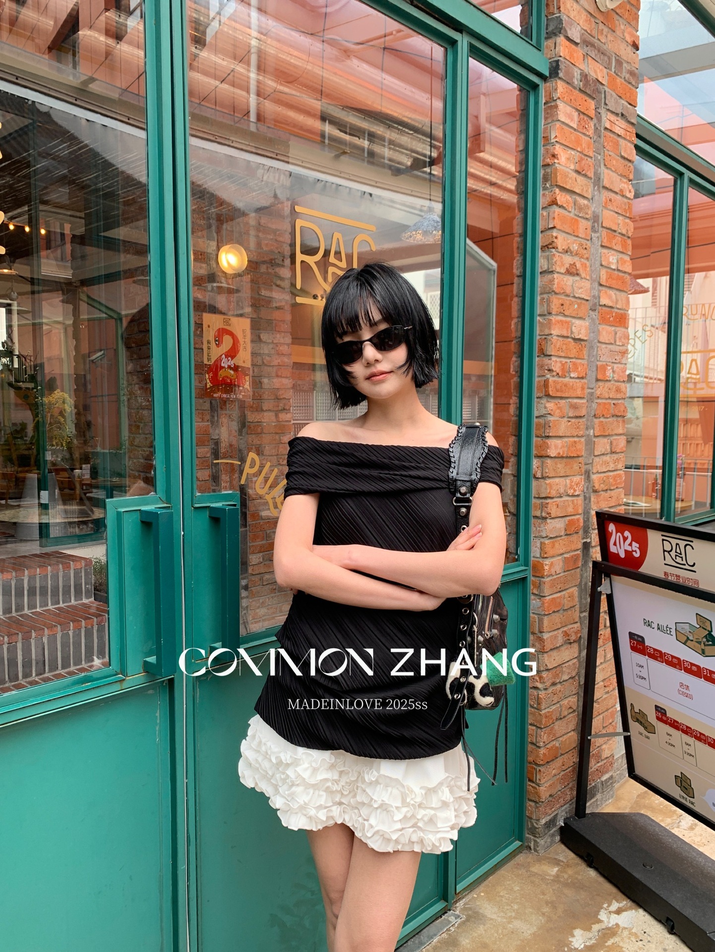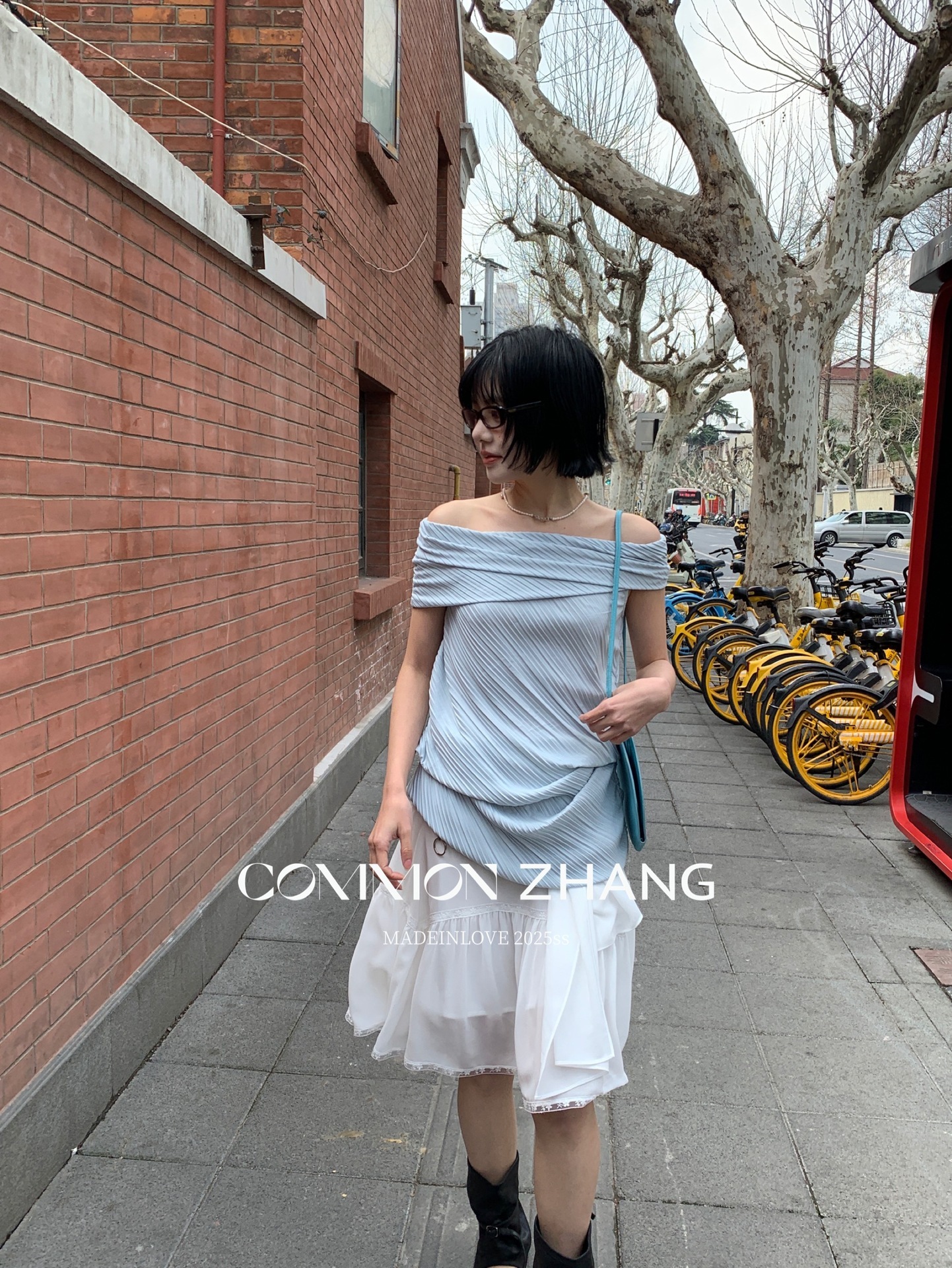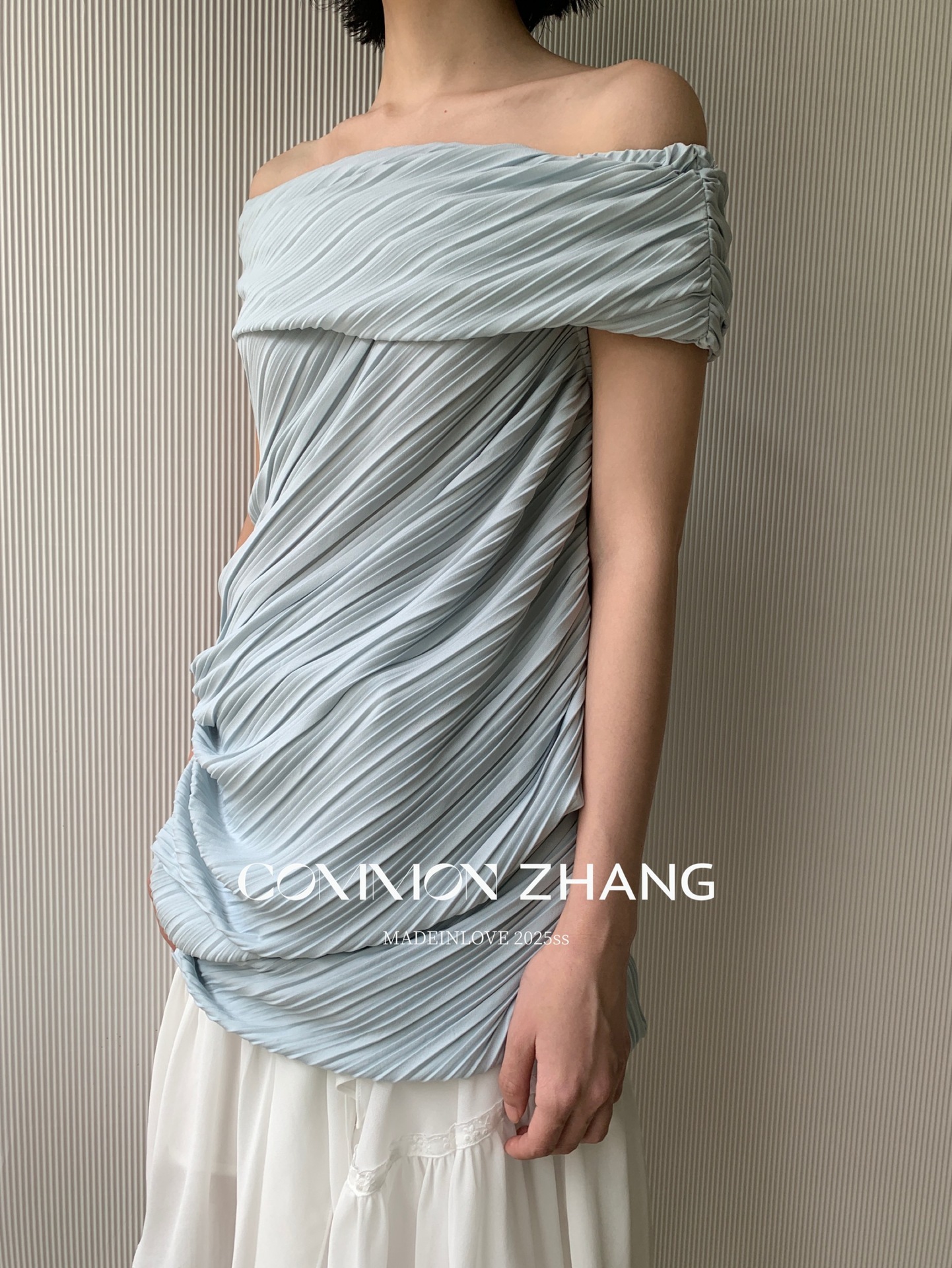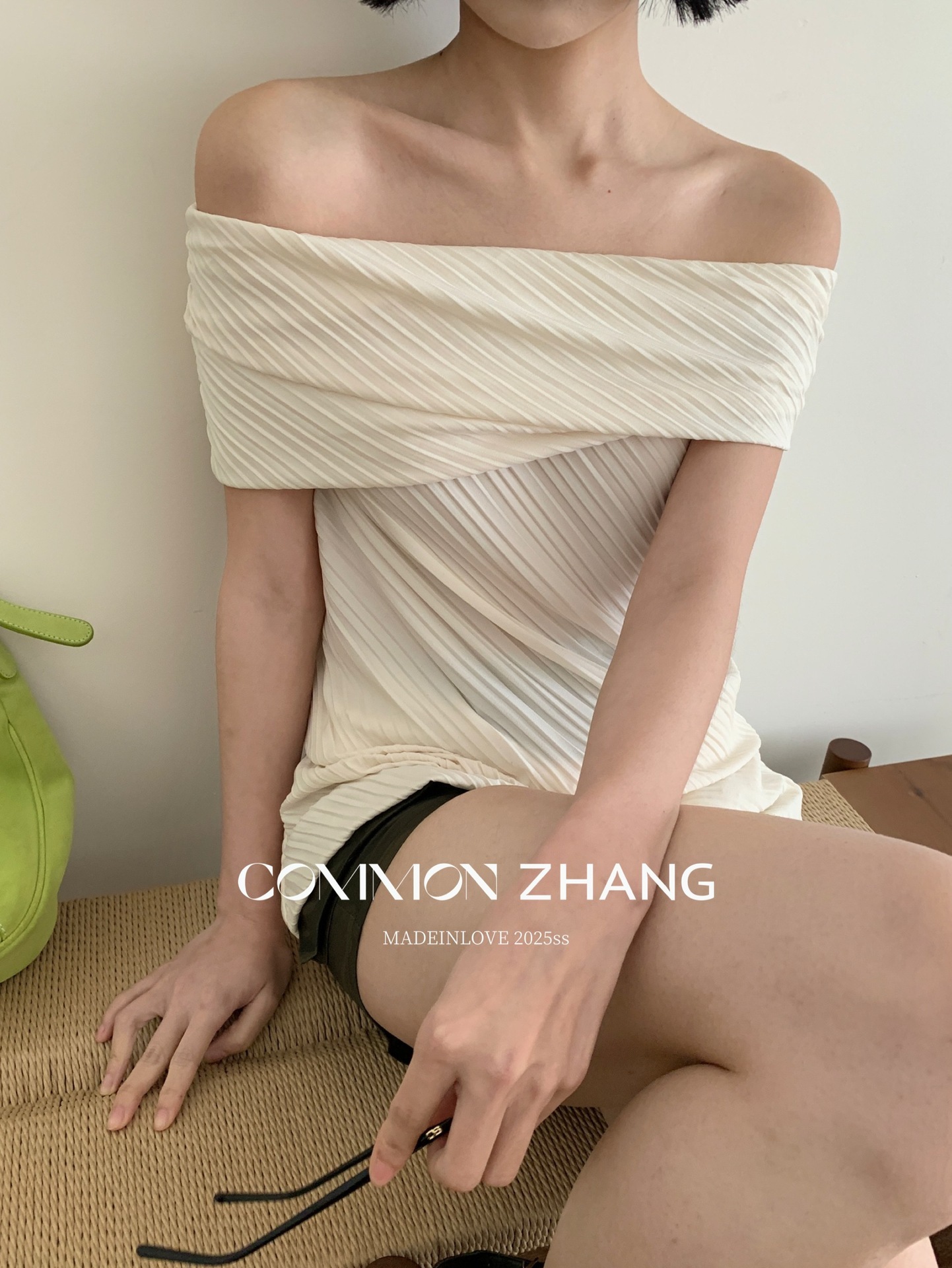 *o-ha-you*【FCZCB203600】夏季法式三宅風一字領露肩性感壓皺質感透視純色百搭小衫-3色