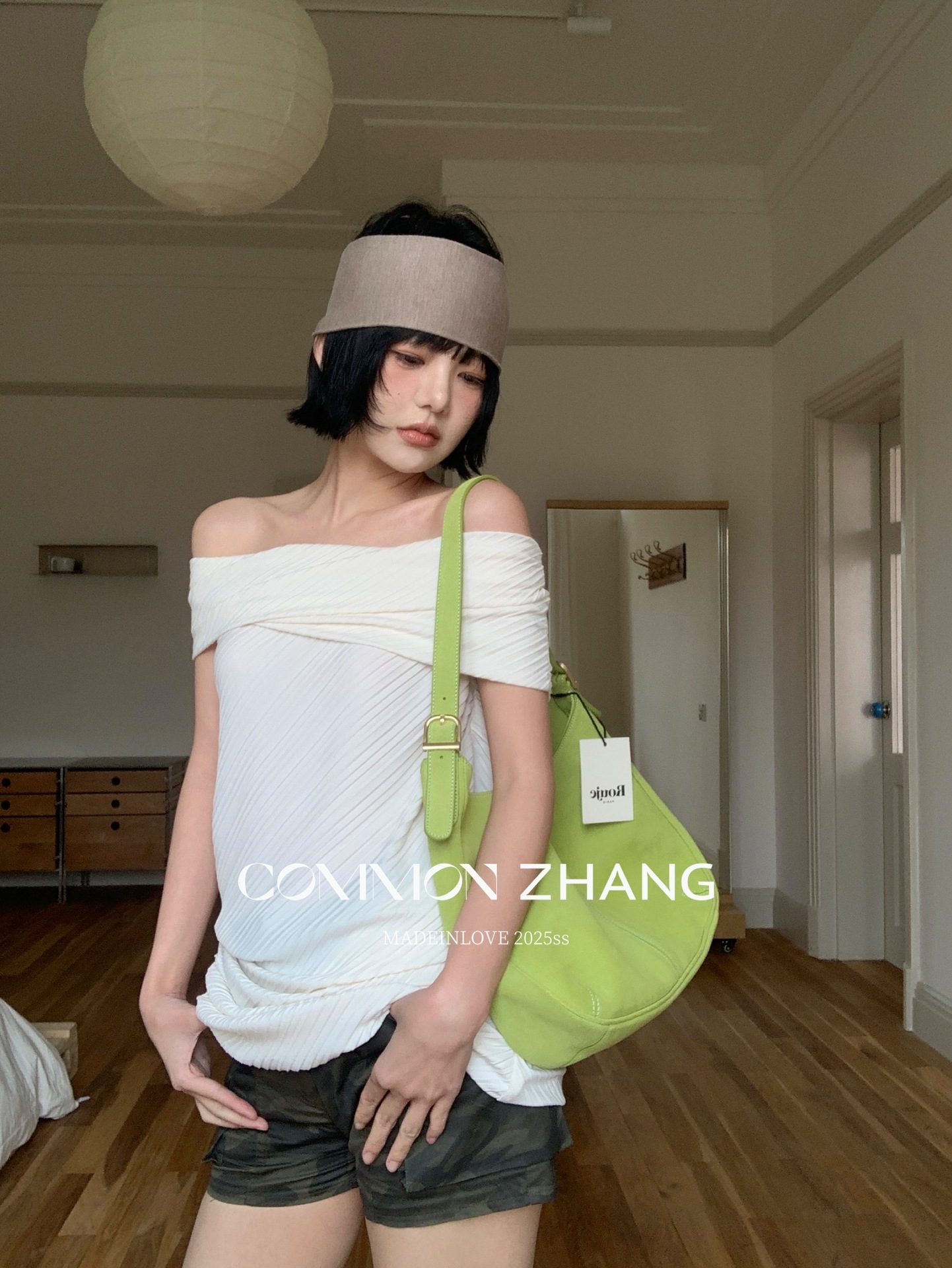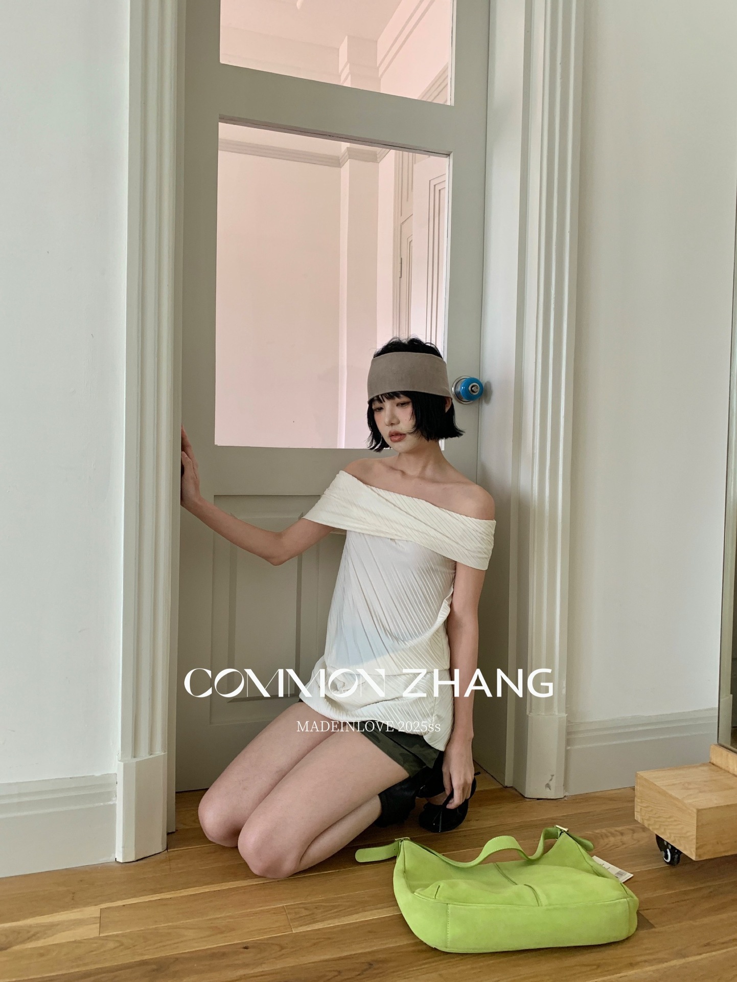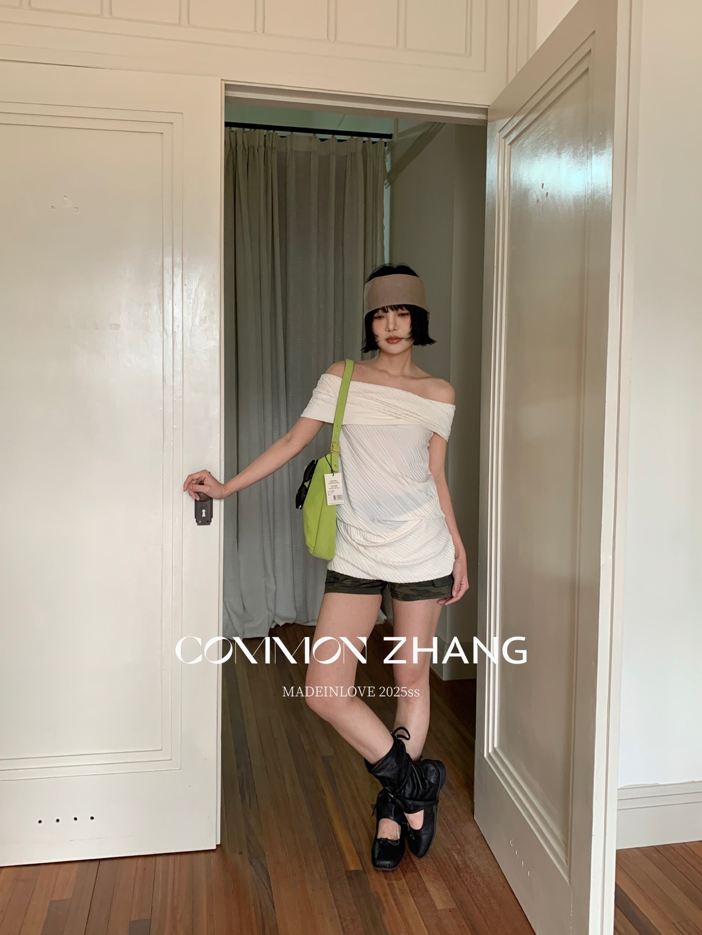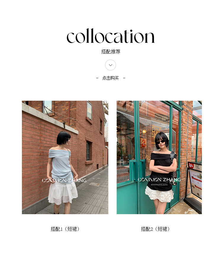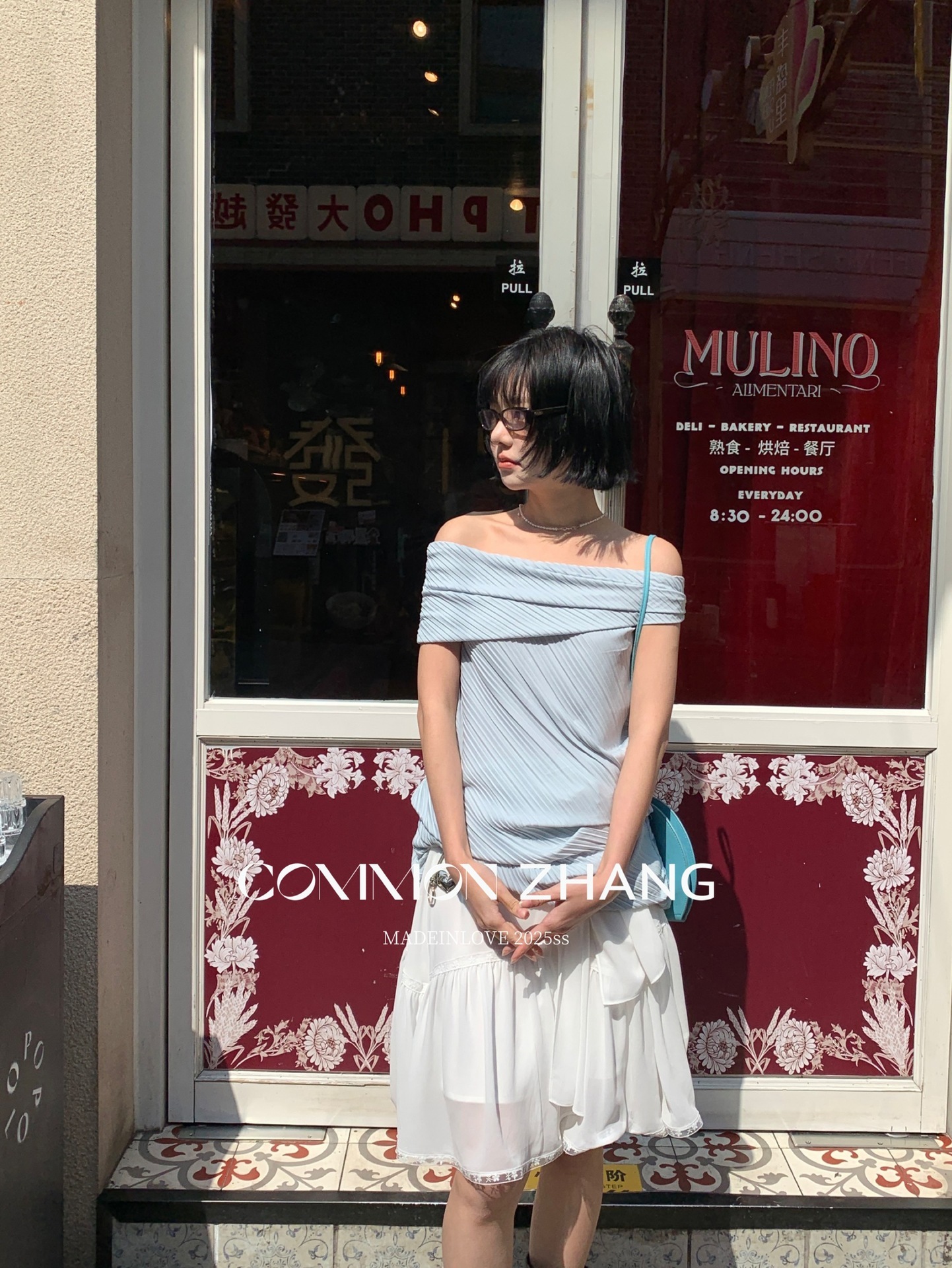 *o-ha-you*【FCZCB203600】夏季法式三宅風一字領露肩性感壓皺質感透視純色百搭小衫-3色