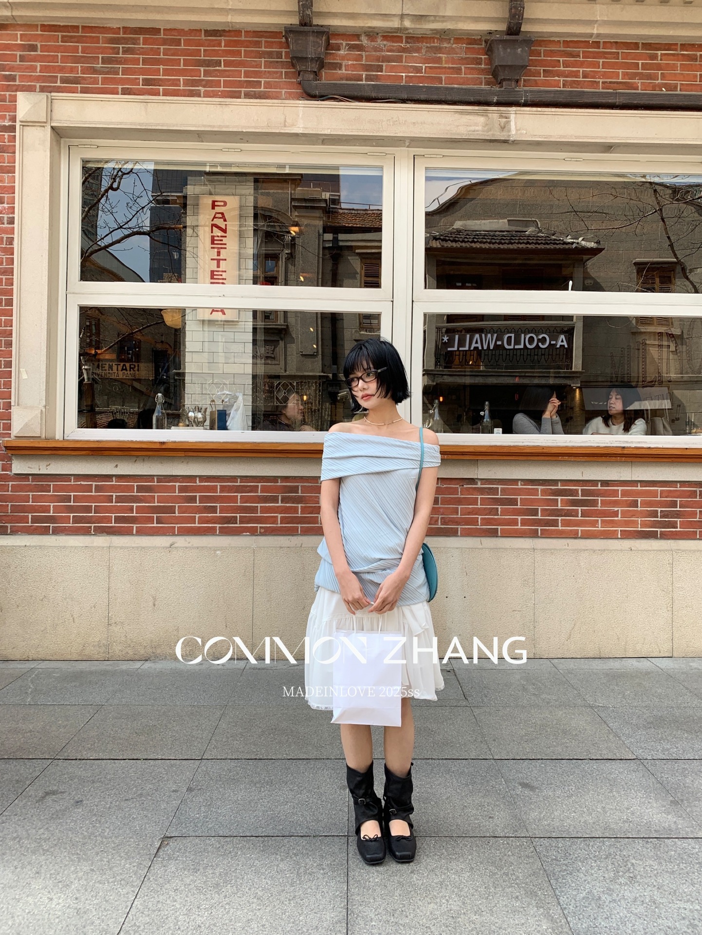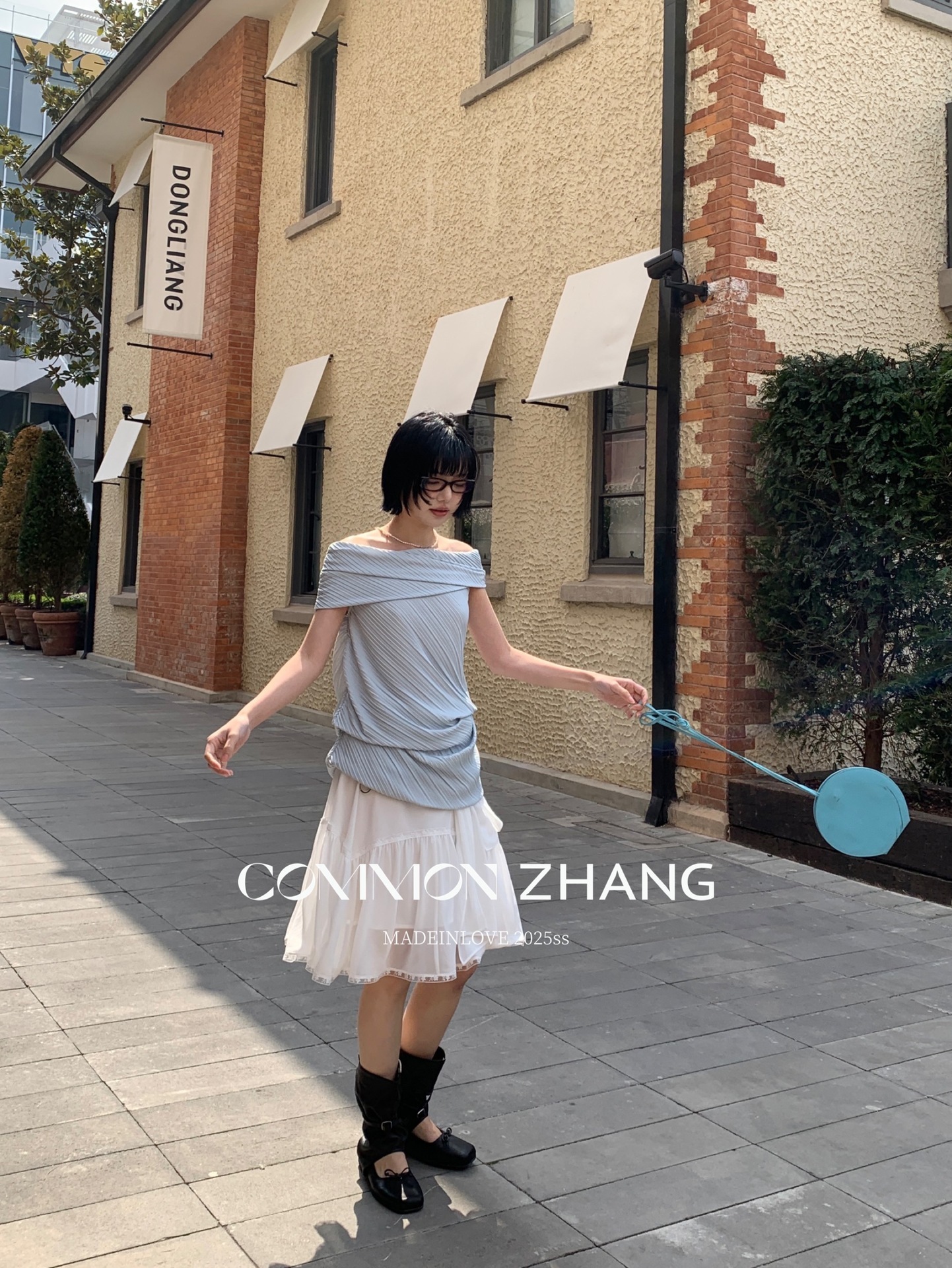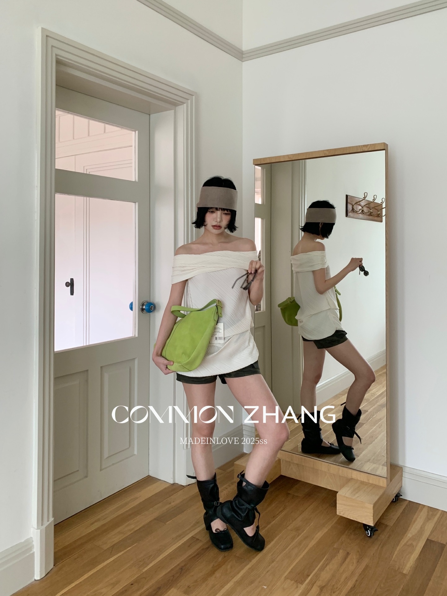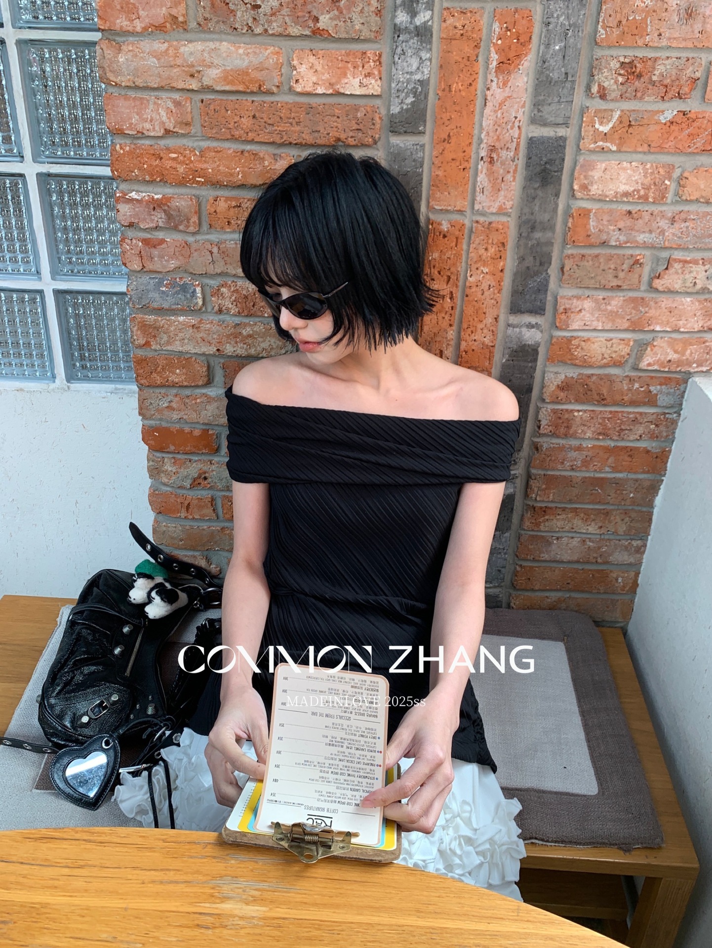 *o-ha-you*【FCZCB203600】夏季法式三宅風一字領露肩性感壓皺質感透視純色百搭小衫-3色