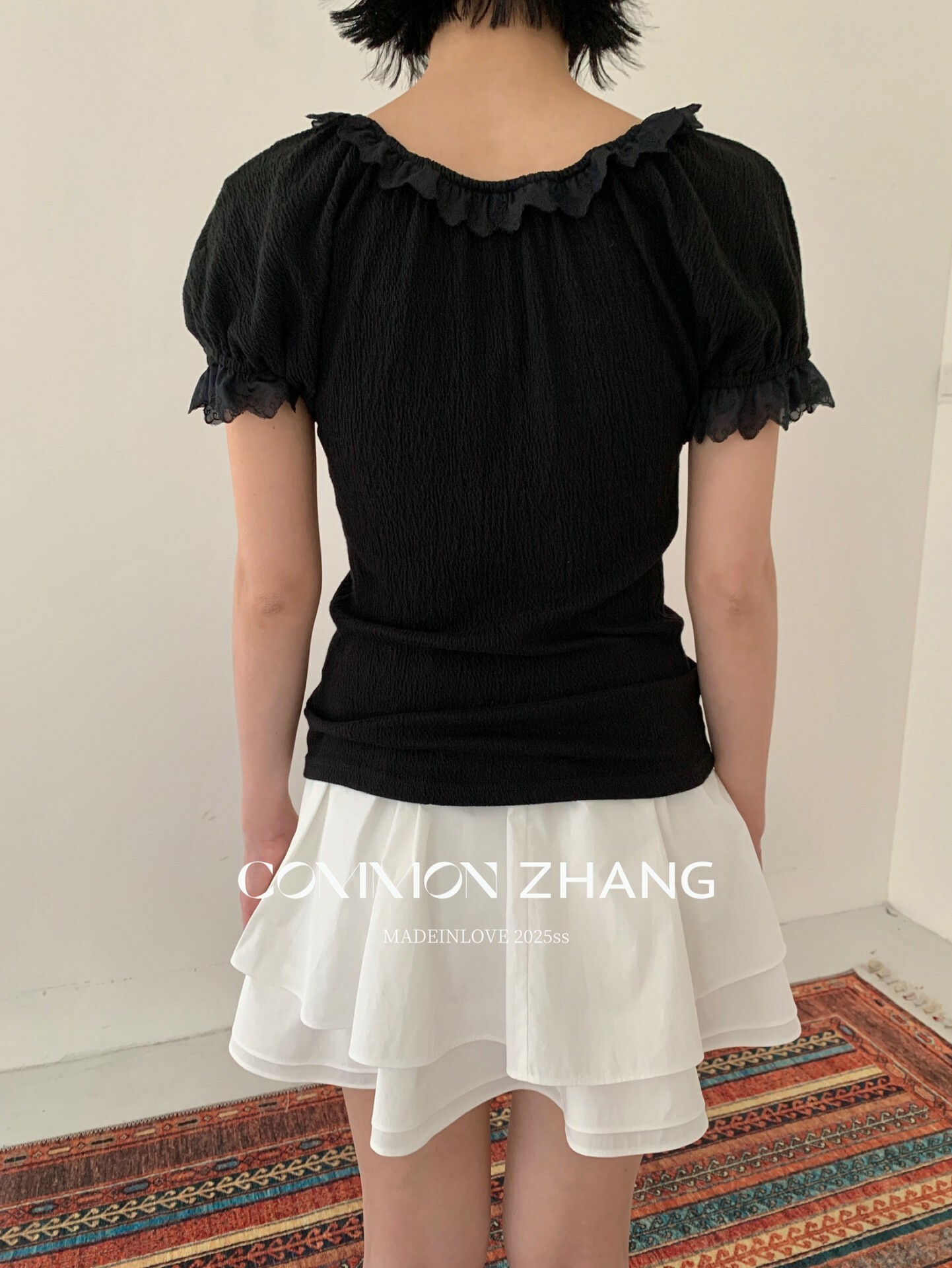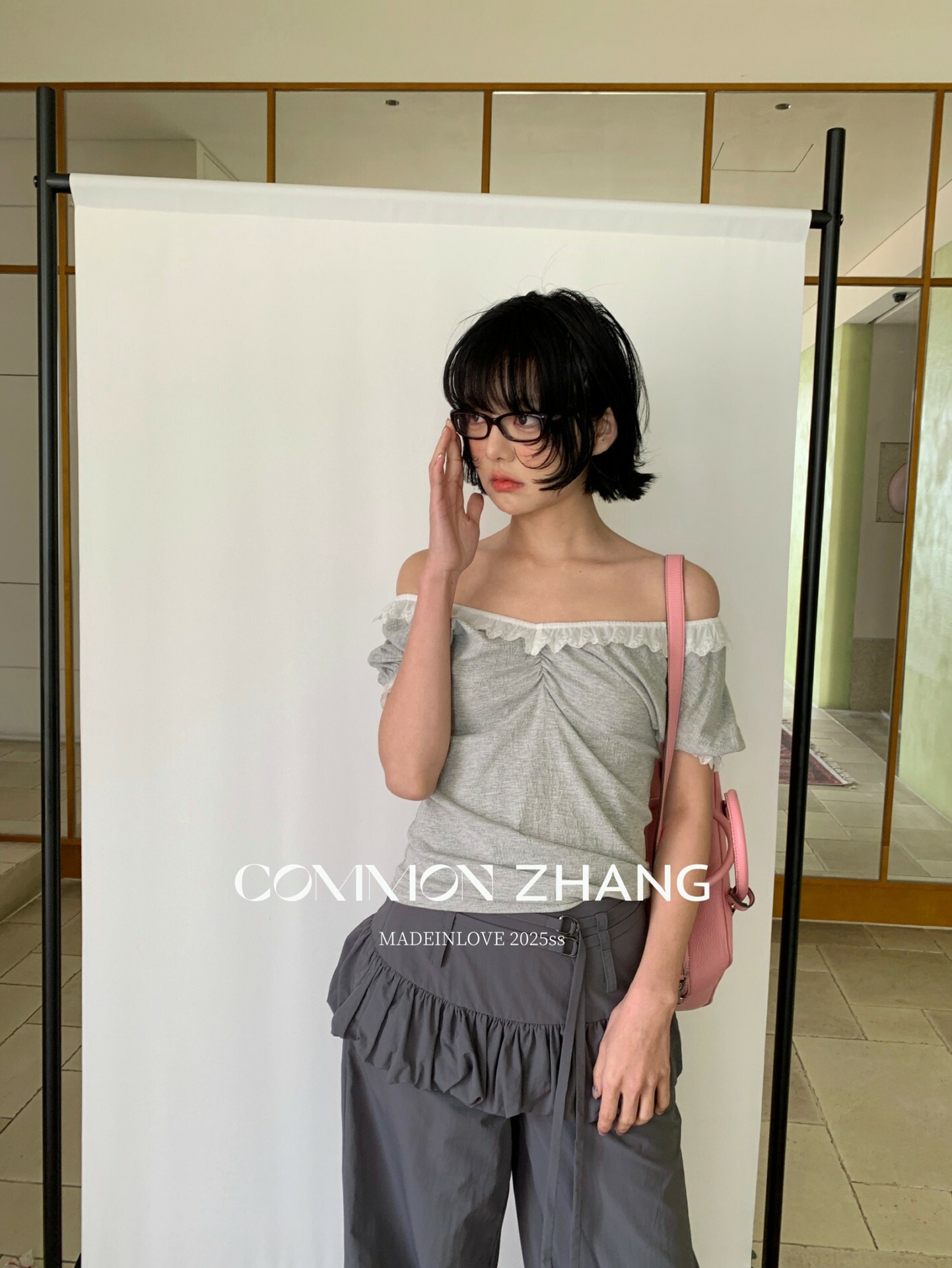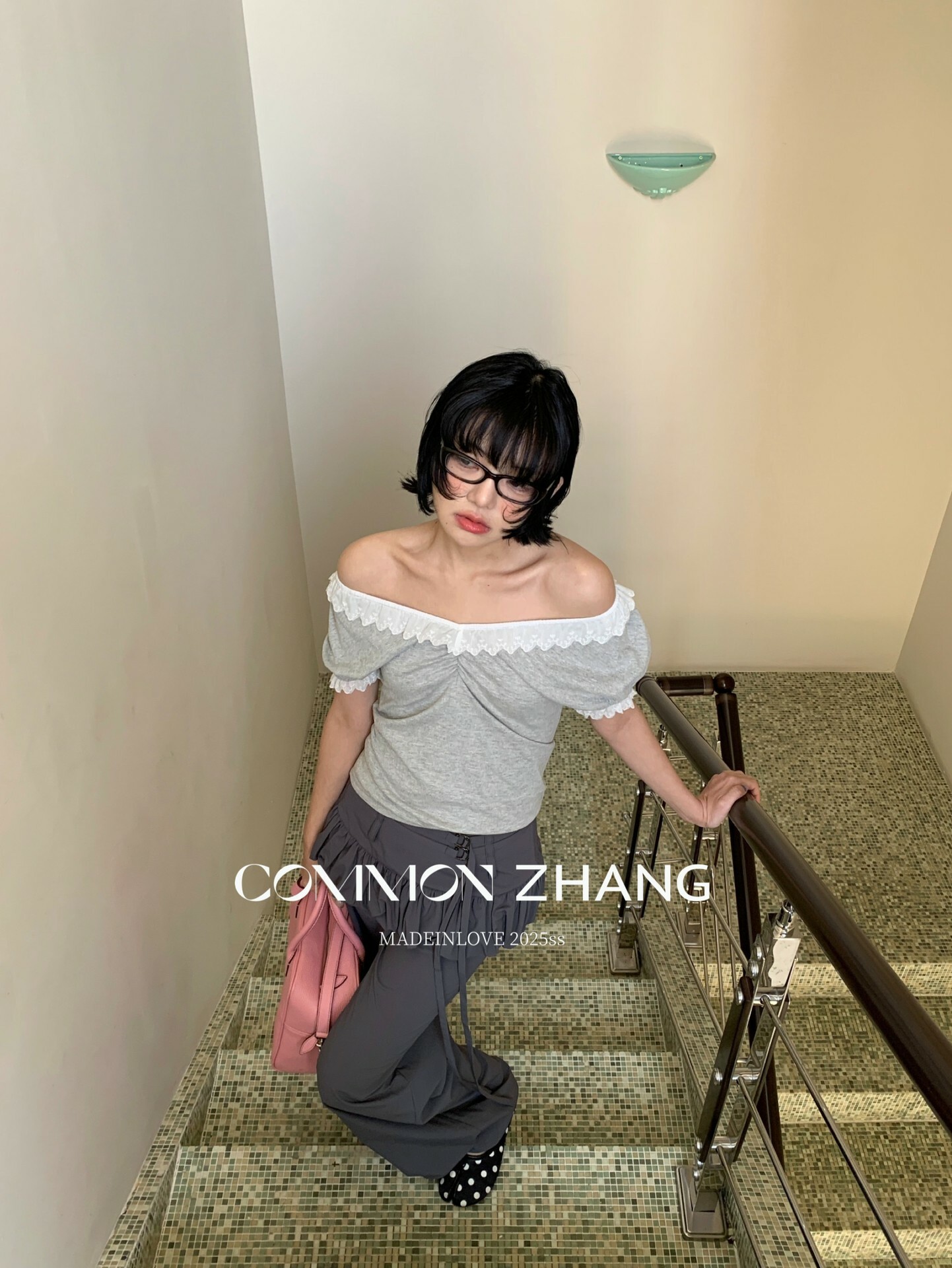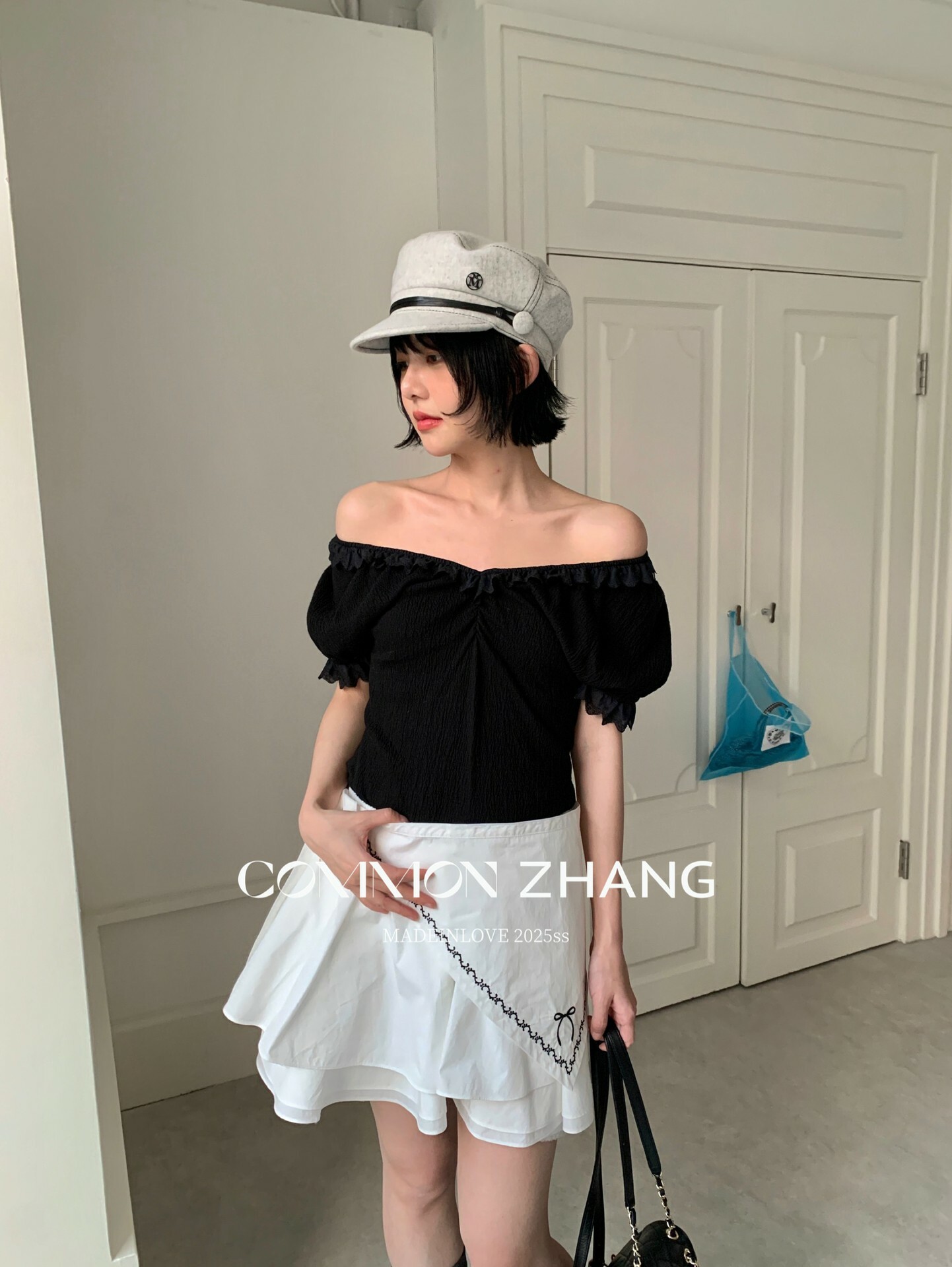 *o-ha-you*【FCZCB203759】夏季法式名媛質感一字領露肩純色百搭蕾絲拼接小衫-3色