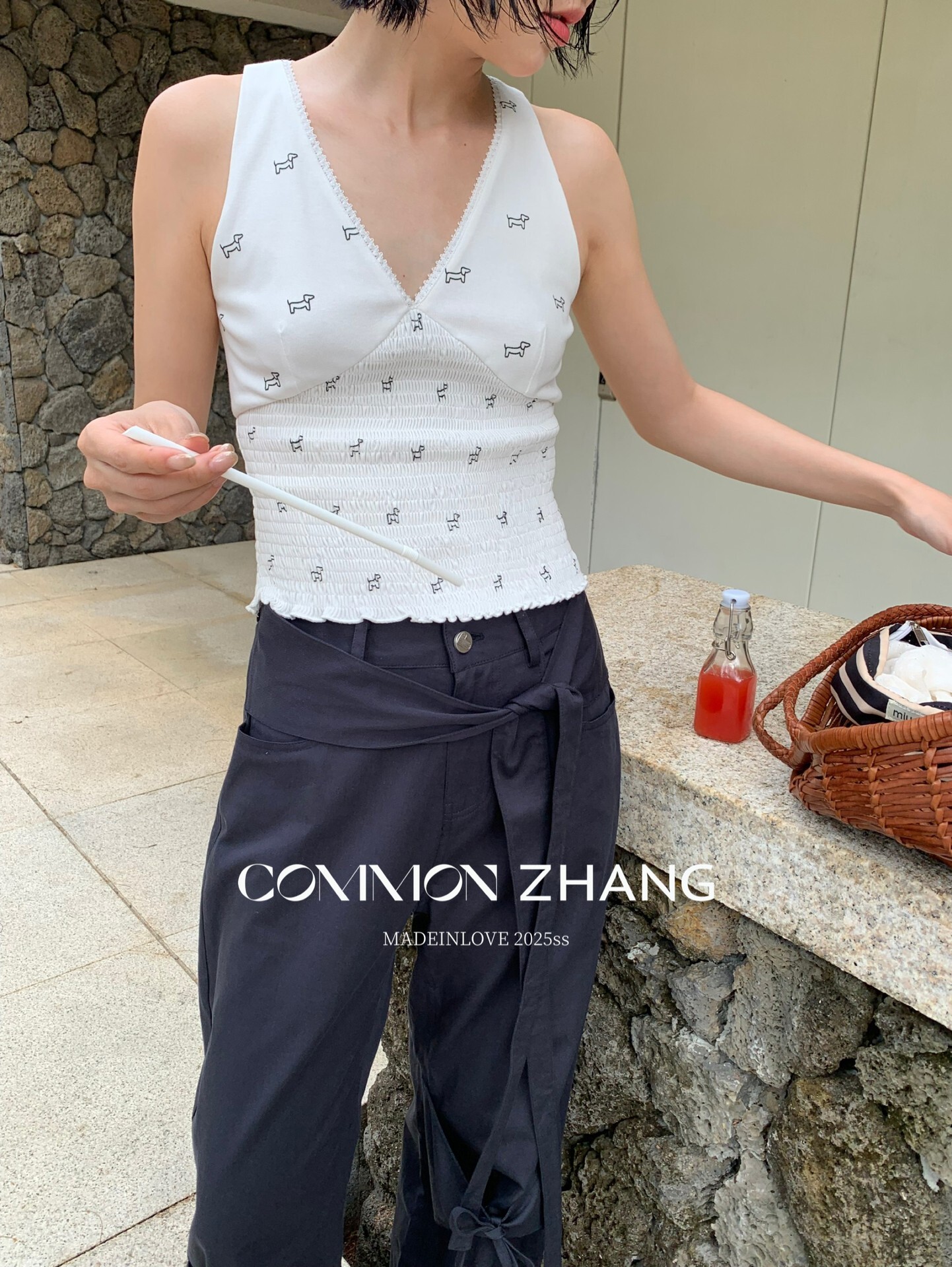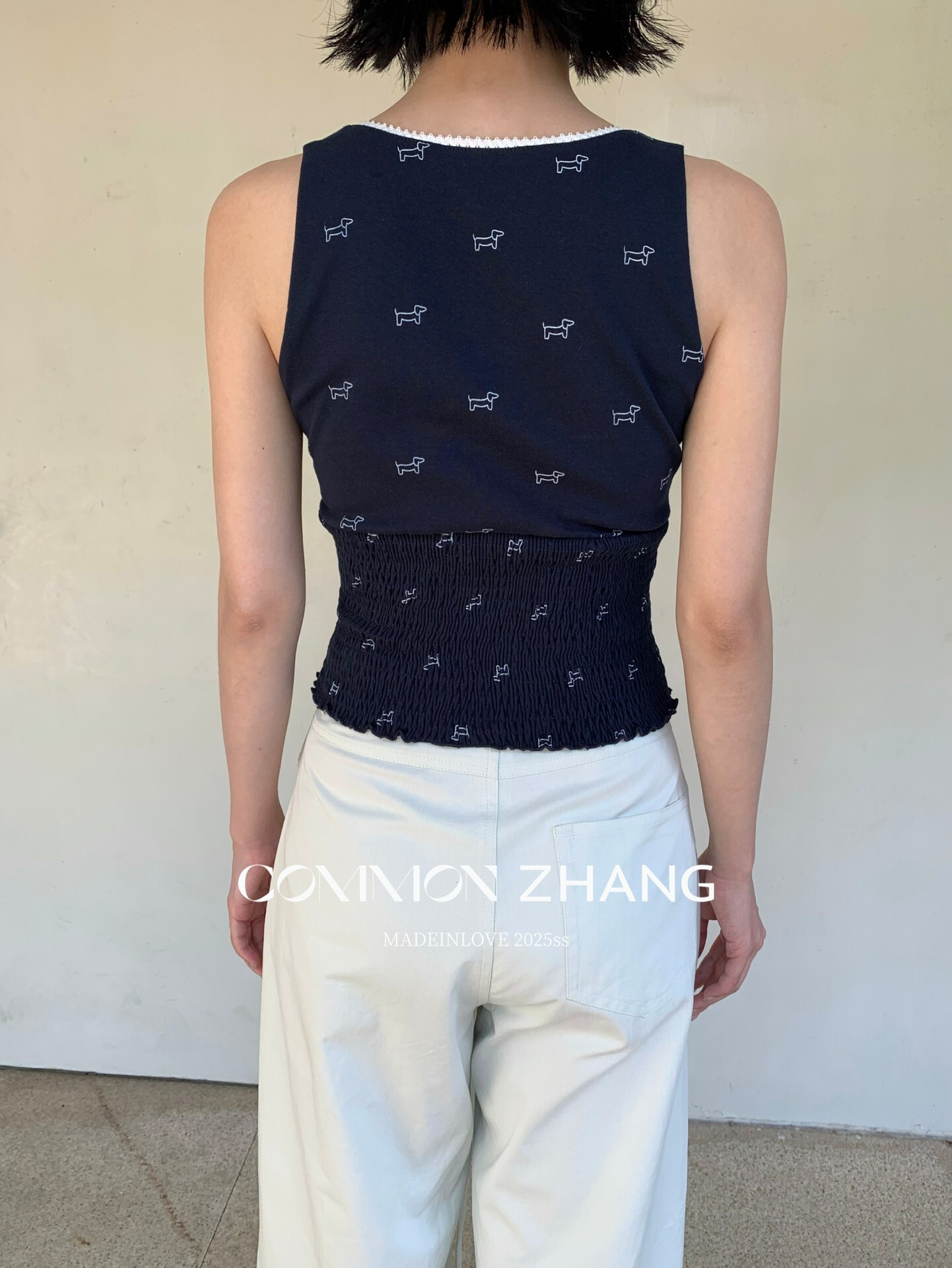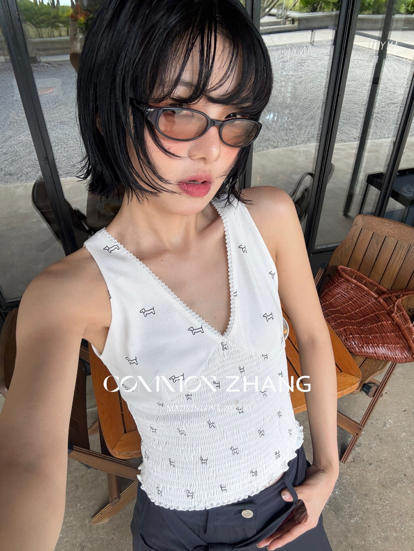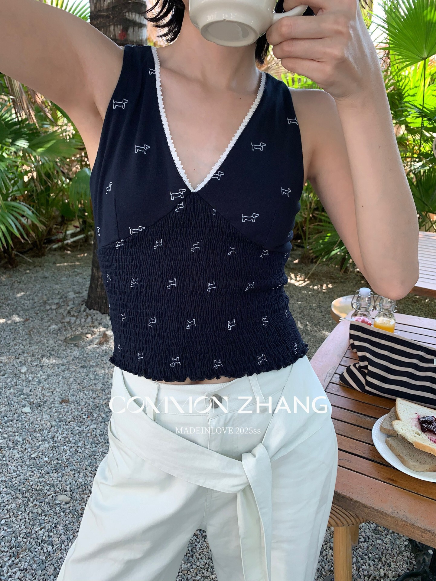 *o-ha-you*【FCZCB203945】度假旅遊韓版狗狗印花撞色邊V領百搭背心小衫-2色