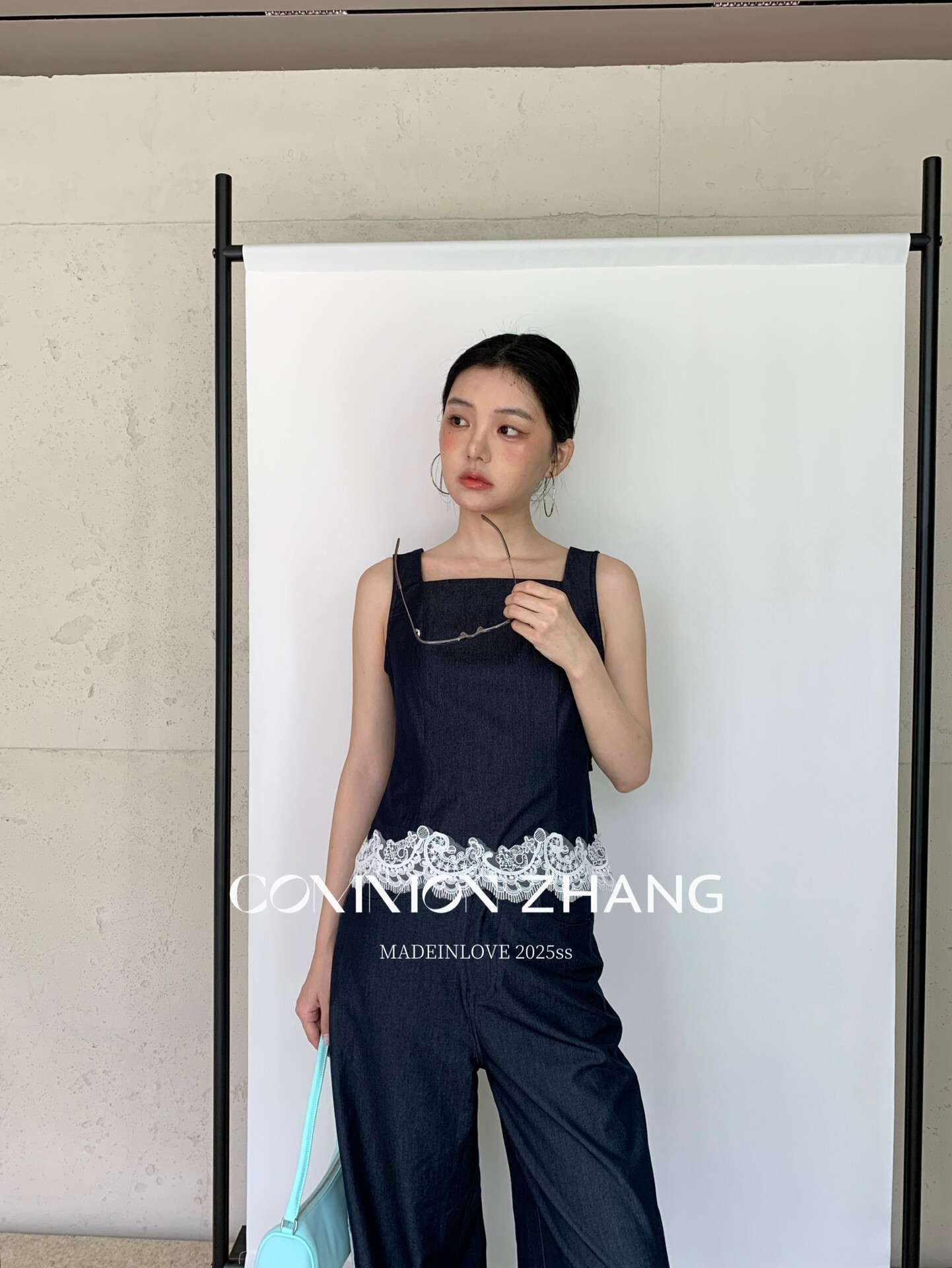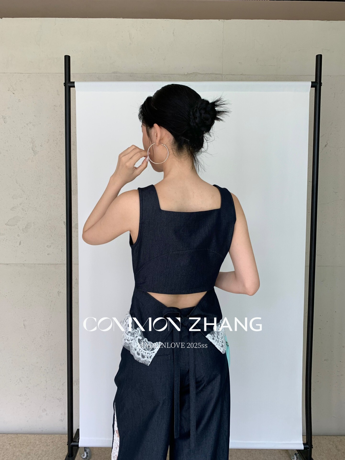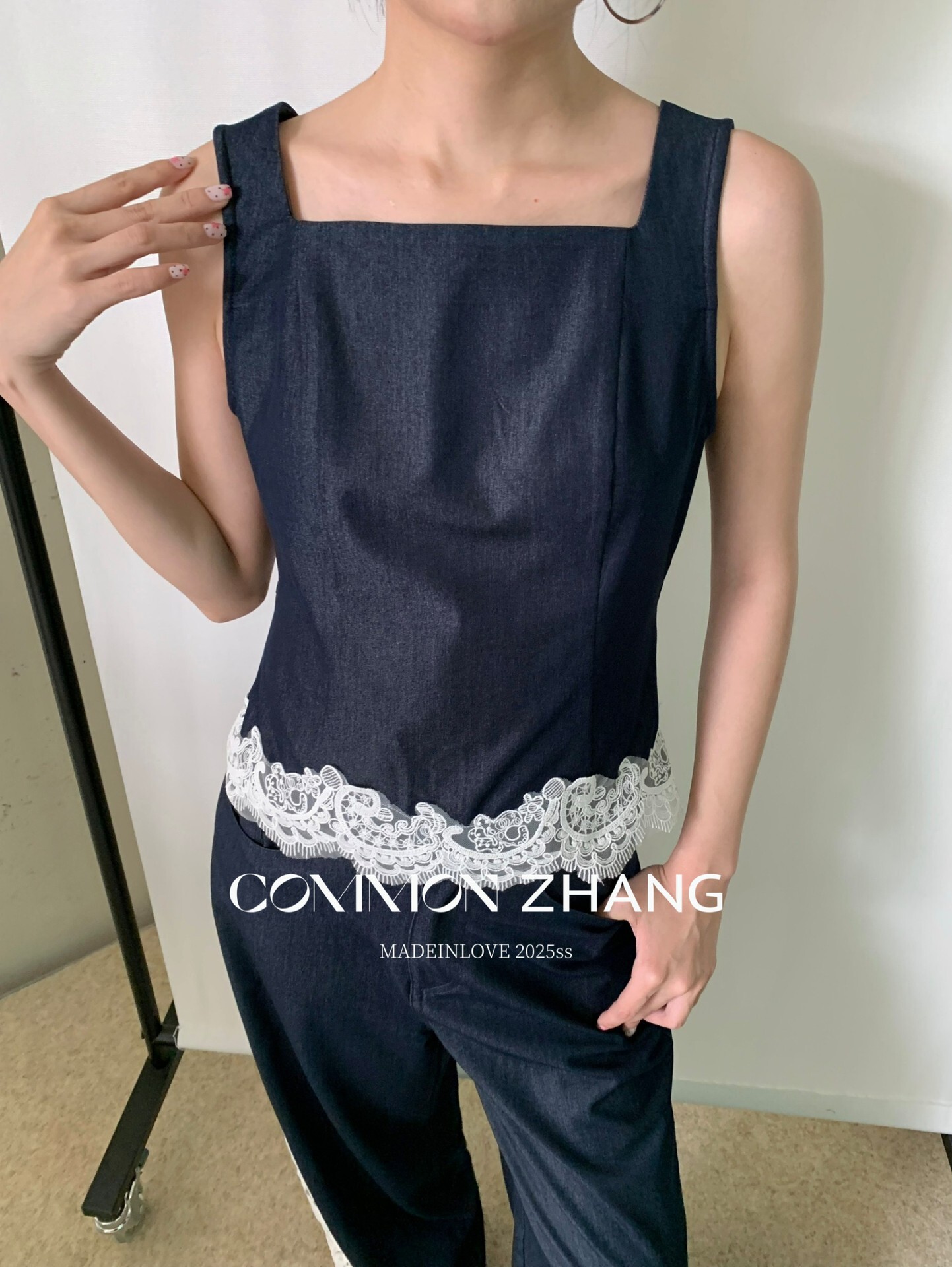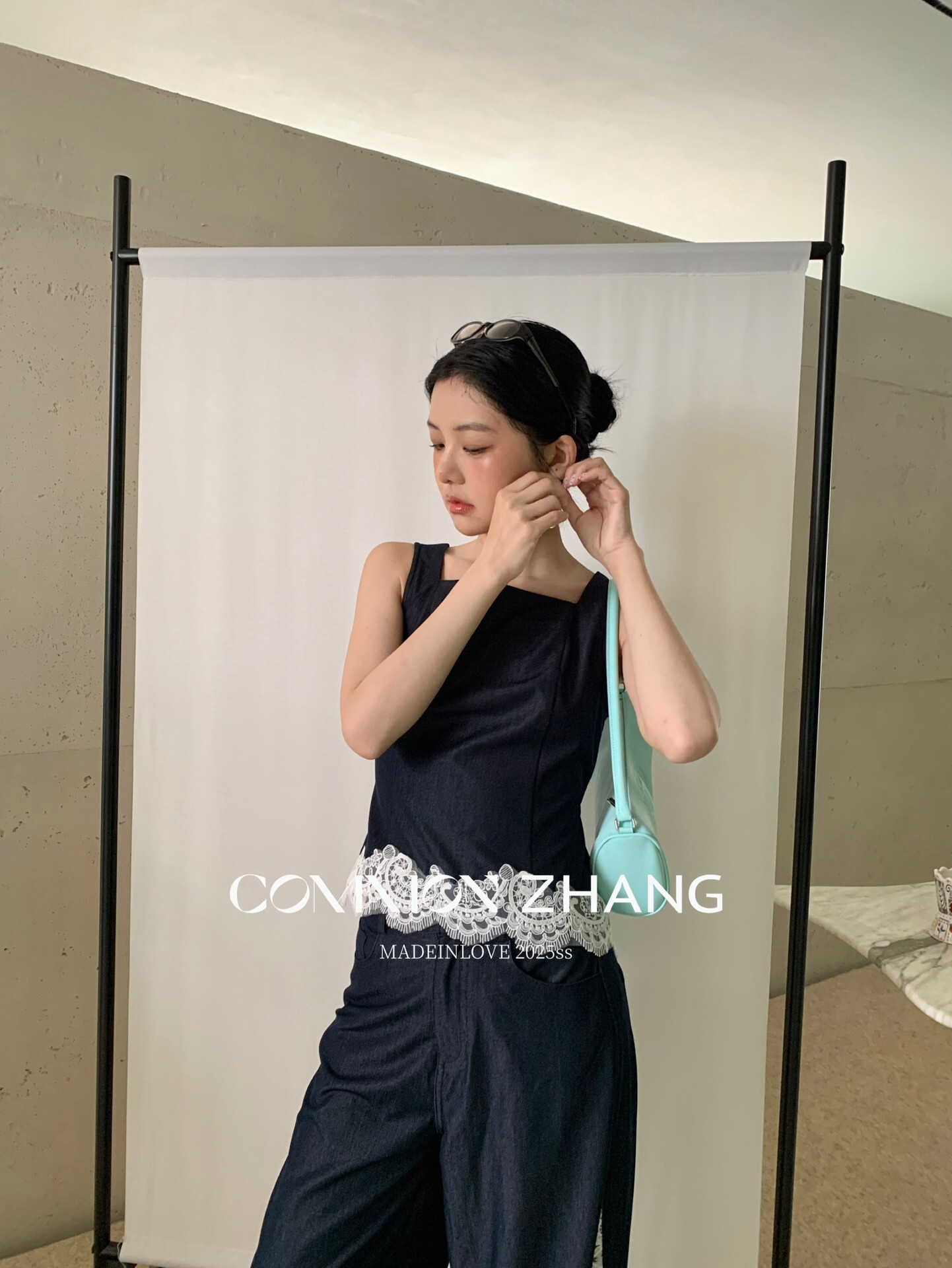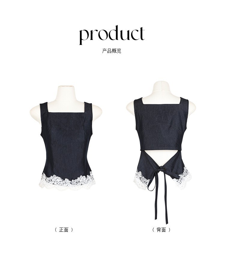 *o-ha-you*【FCZCB204031】夏季法式女孩俏皮深藍蕾絲邊拼接露背質感背心小衫