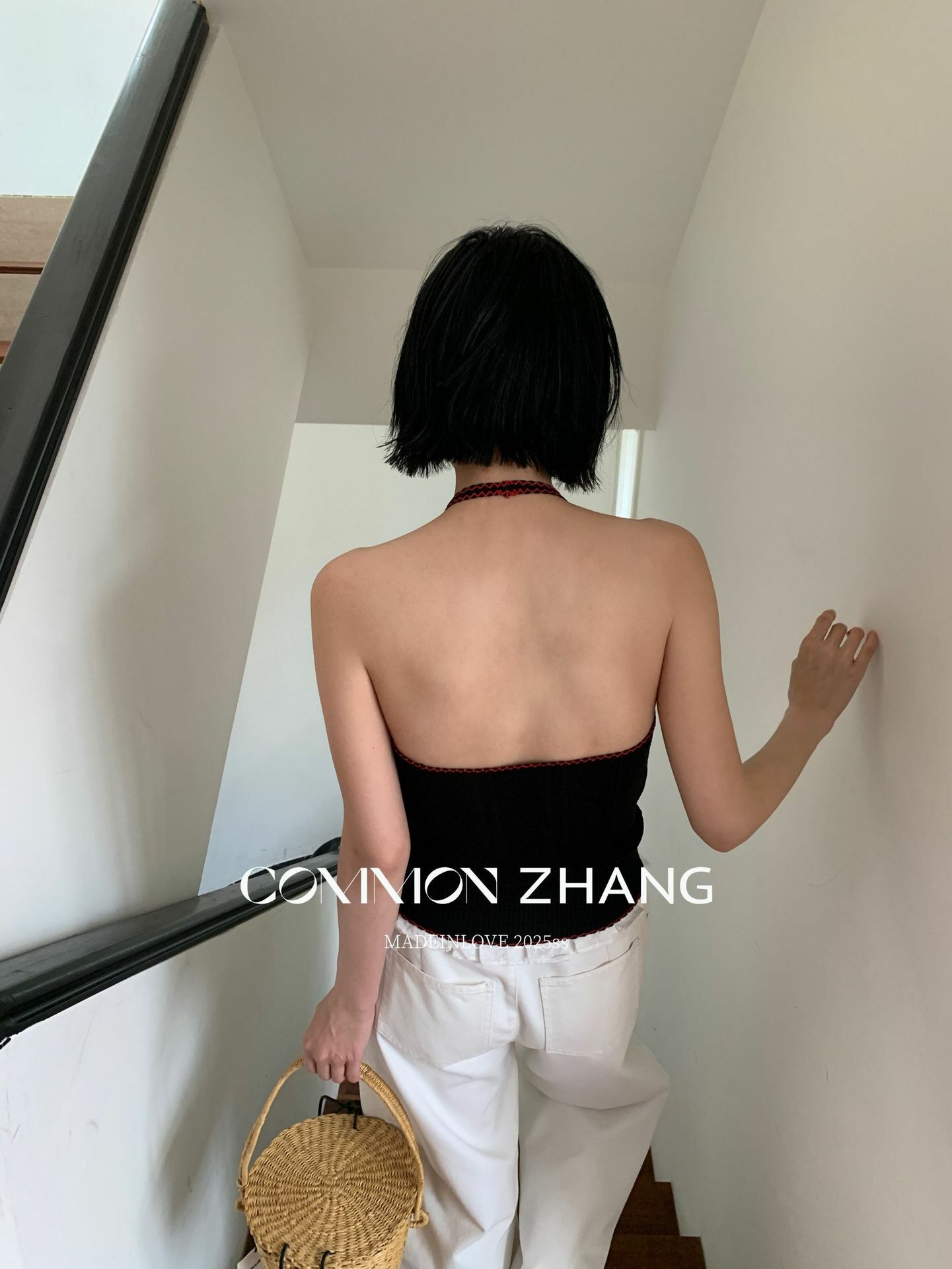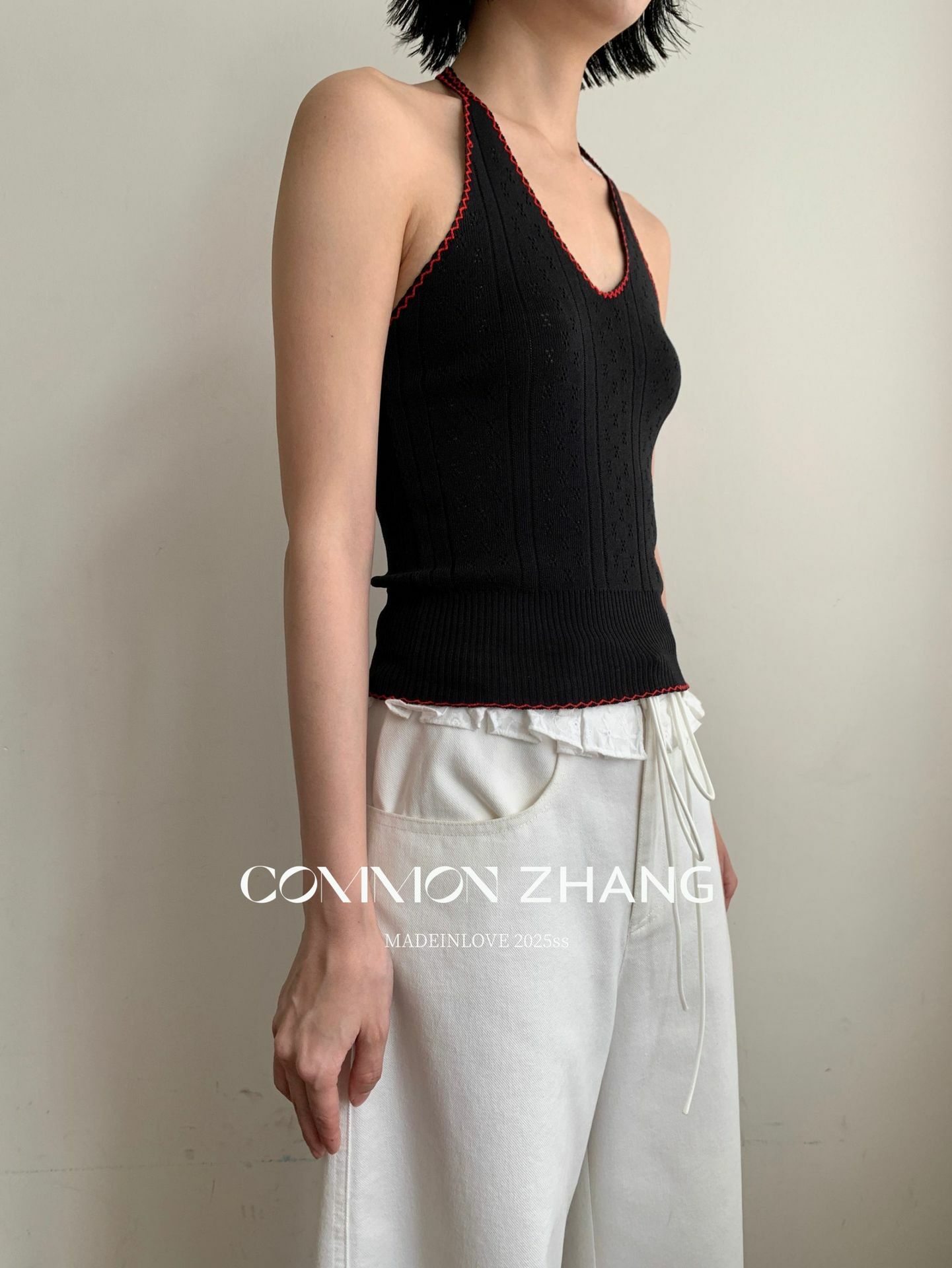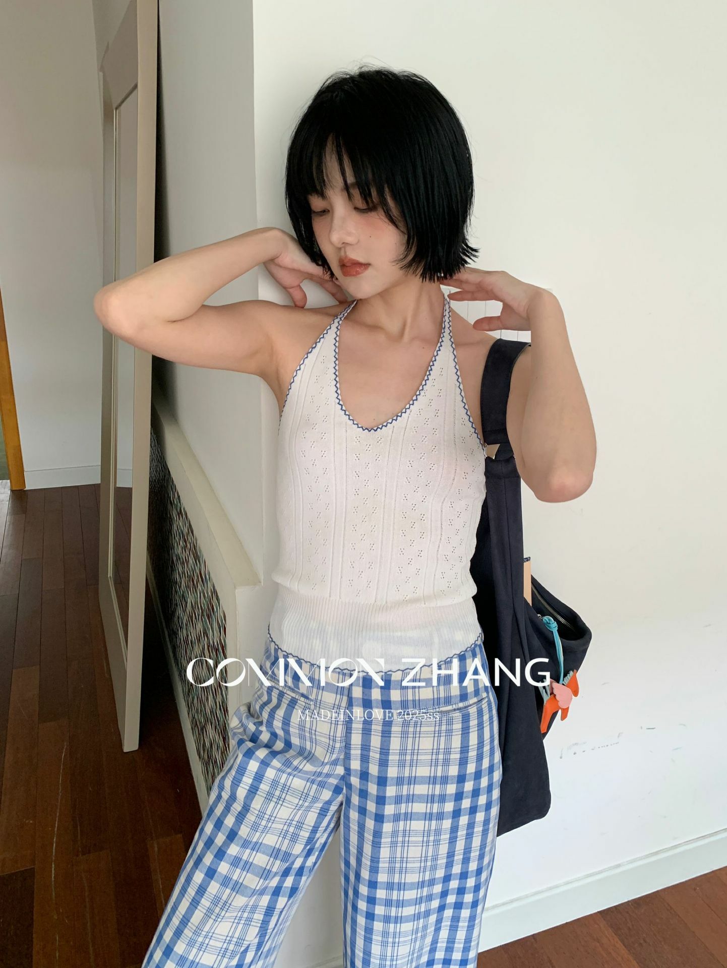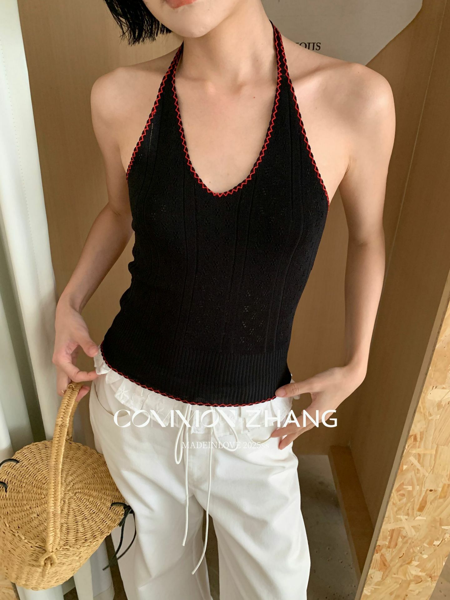*o-ha-you*【FCZCB205748】夏季韓版拼色邊鏤空掛脖露背性感小眾背心針織衫-3色-如有需要請先諮詢