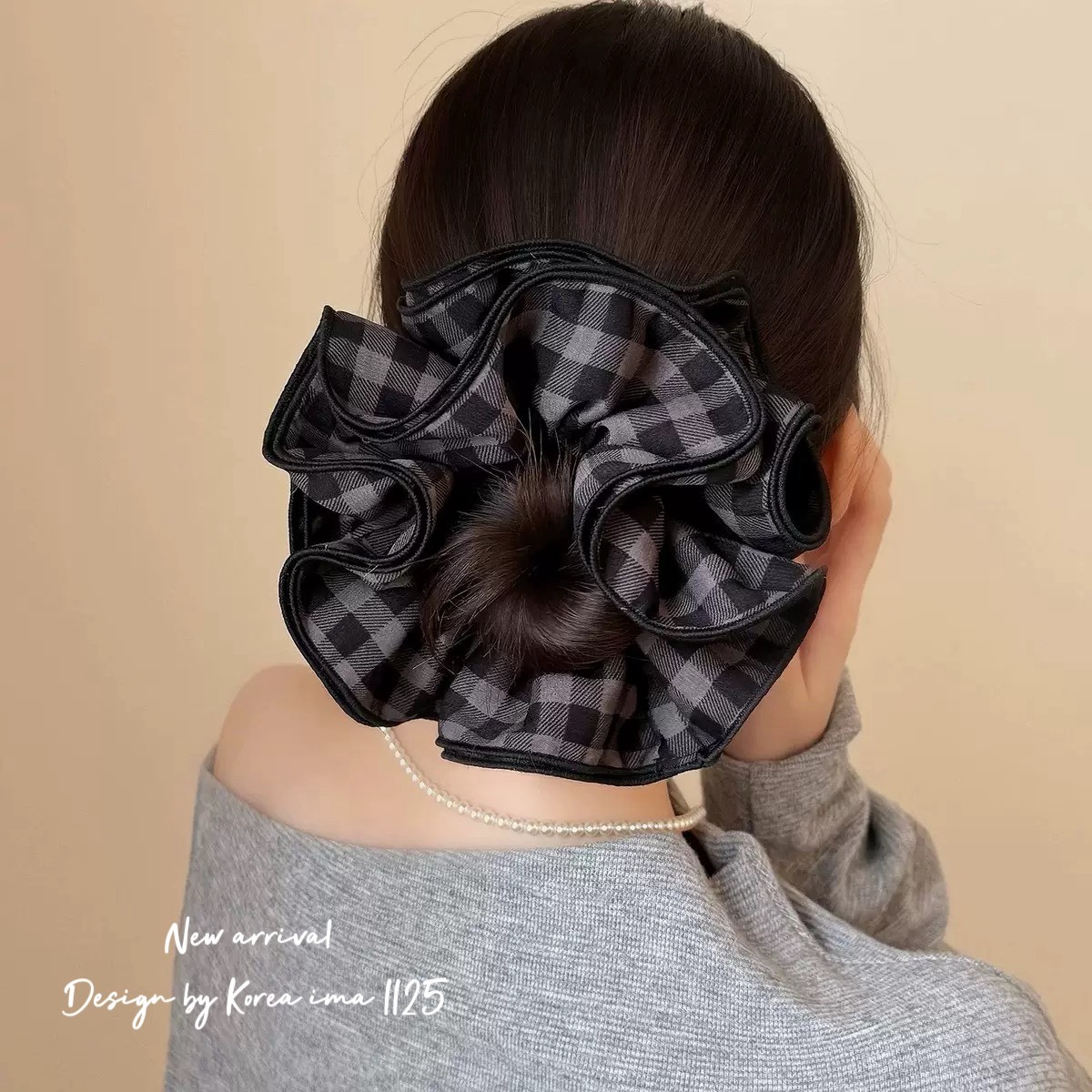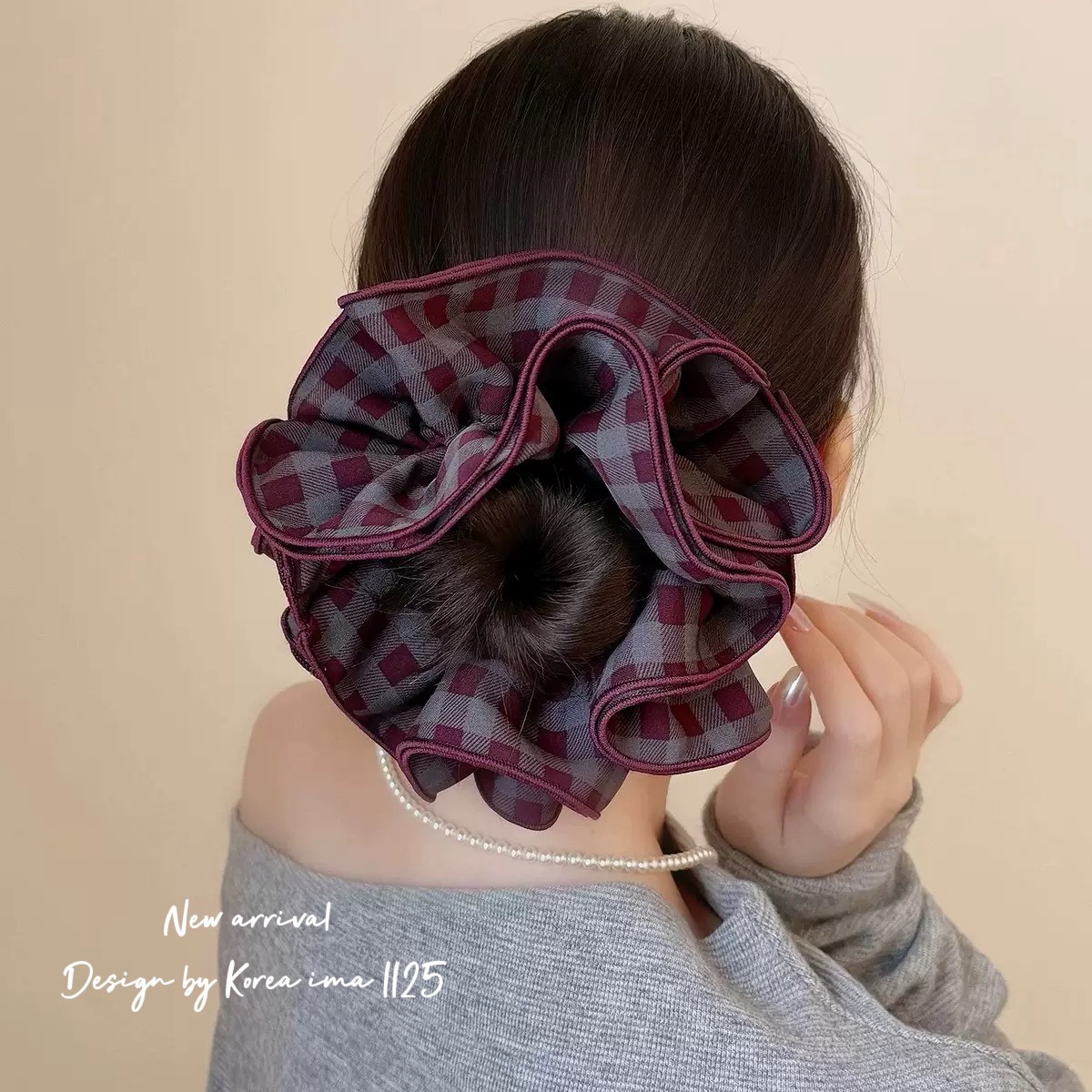 *o-ha-you*【FEM204998】趙露思同款超大荷葉格紋雙層大腸圈髮圈綁綁髮束-2色